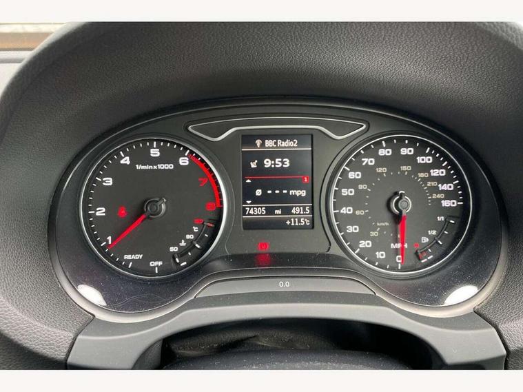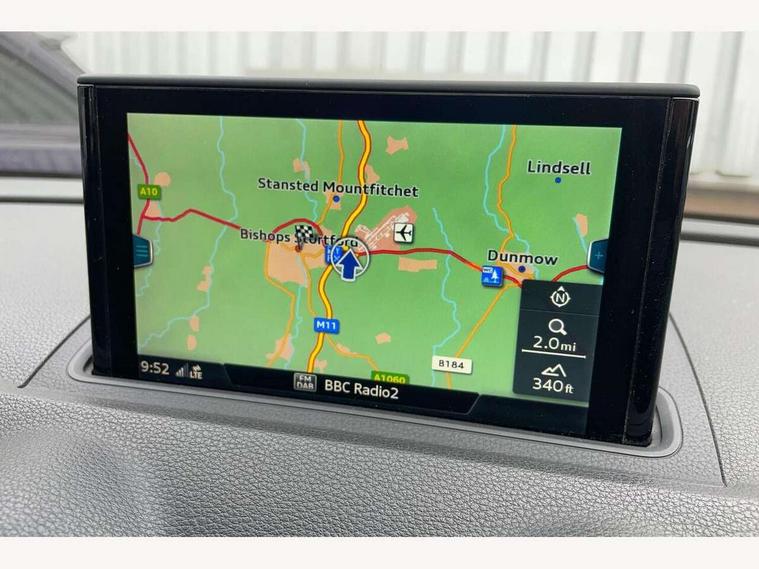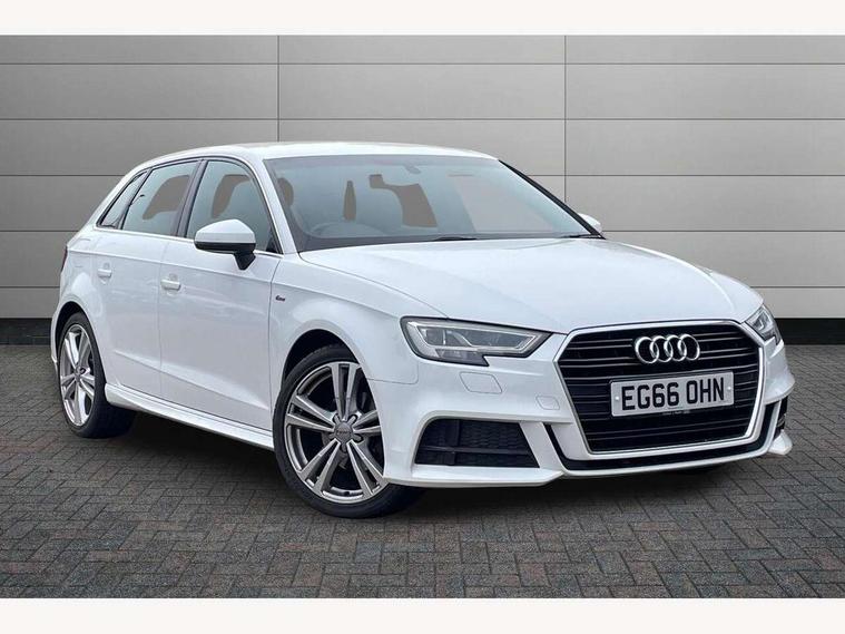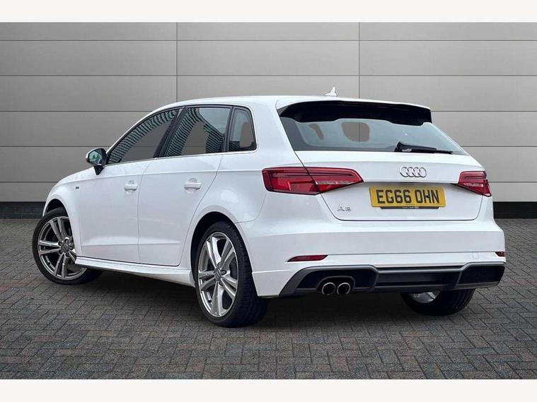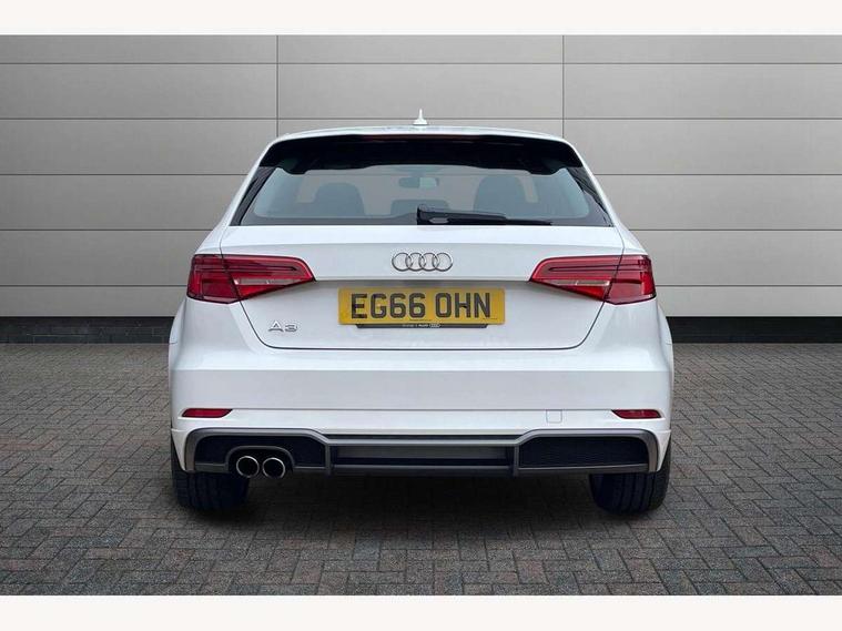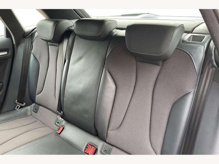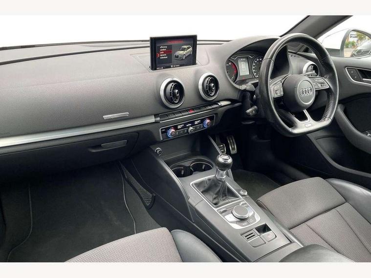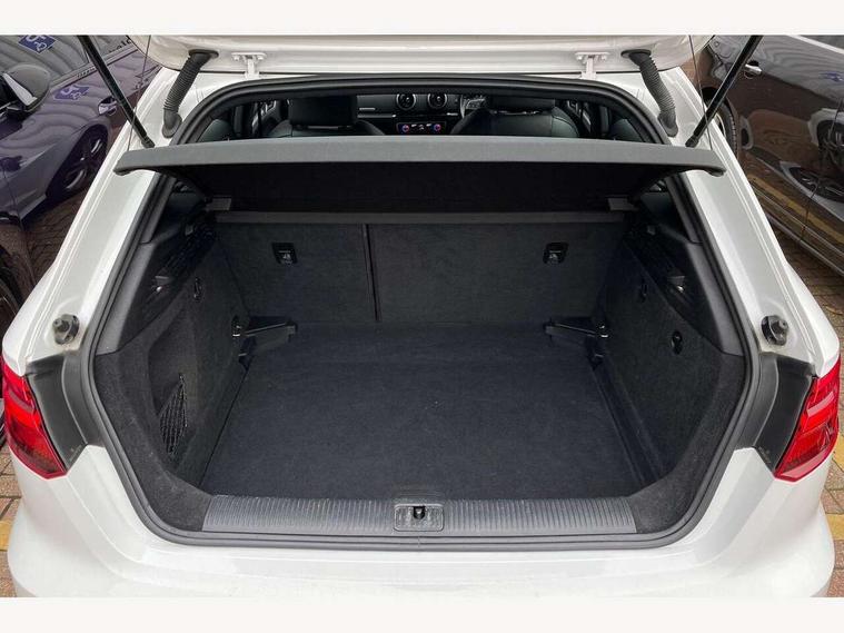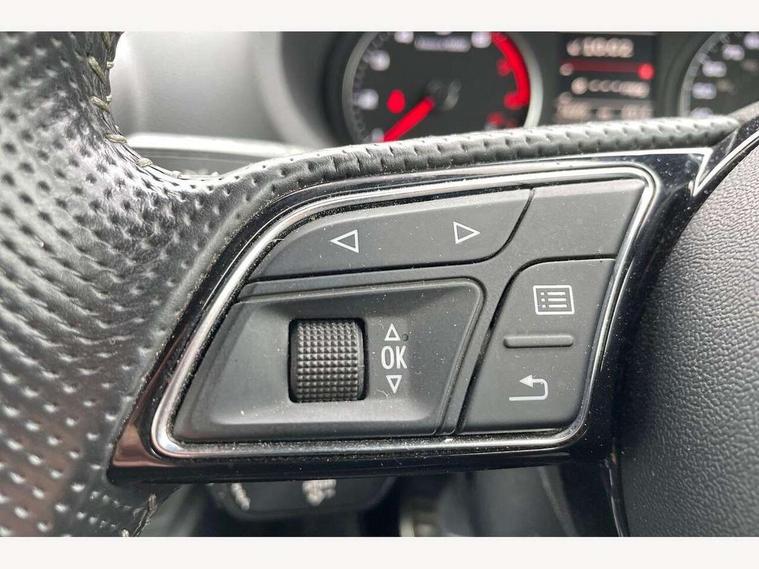 Audi connect, Audi drive select, Audi smartphone interface, Colour driver's information system display, Electro-mechanical PAS, Mobile telephone preparation - bluetooth interface, Service interval indicator, Speed limit display, Voice control system, 2 USB ports, Audi music interface, Auxiliary input socket, DAB Digital radio, Aluminium window trim, Body colour bumpers, Body colour door mirrors with integral indicators, Body colour roof spoiler, Chrome exhaust tailpipes, Electric front windows, Electric operated/heated door mirrors, Electric rear windows, Heated windscreen washer jets, Matt black radiator grille, Rear wiper, S Line body styling, Single exhaust tailpipe, Sport specific side air inlet grille and diffuser insert, 3 adjustable rear headrests, 3 spoke flat bottomed multi-function leather steering wheel, 4 lashing points to secure luggage, Adjustable front armrest, Black cloth headlining, Dual zone electronic climate control, Front and rear interior lights with delay, Front passenger seat isofix location point, Front/rear floor mats, Height/depth adjustable steering column, Illuminated door sills, Illuminated glovebox, Illuminated luggage compartment, ISOFIX child seat preparation+airbag deactivation, Jack and tool kit, Stainless steel pedals, Storage compartment in centre console, Storage compartment under front seats, Storage compartments in doors, LED interior light pack - A3/RS3, Light and rain sensor pack - A3 Hatchback/Sportback, Storage and luggage pack - A3/RS3, 3 point seatbelts on all seats, ABS/EBD, Active bonnet, Active front headrests, ASR, Curtain airbags, Driver and passenger side airbags, Driver/Front Passenger airbags, Drivers knee airbag, EDL, Electromechanical parking brake, ESC - Electronic Stability Control + traction control, Front passenger airbag deactivation, Manual rear child locks, Multi-Collision braking, Seatbelt warning, Tyre pressure monitor, Warning triangle and first aid kit, Anti-theft wheel bolts, Remote control central locking, Thatcham category 1 alarm + immobiliser, Aluminium air vent surrounds, Aluminium trim elements, Space saver spare wheel,