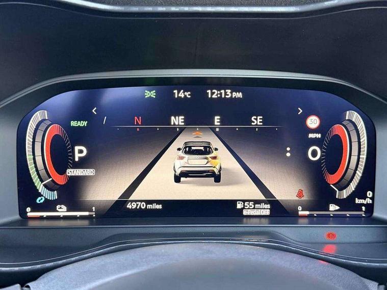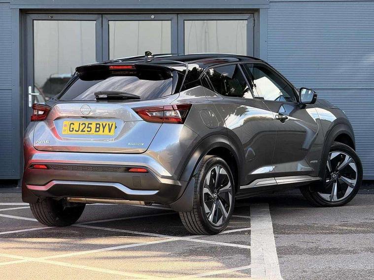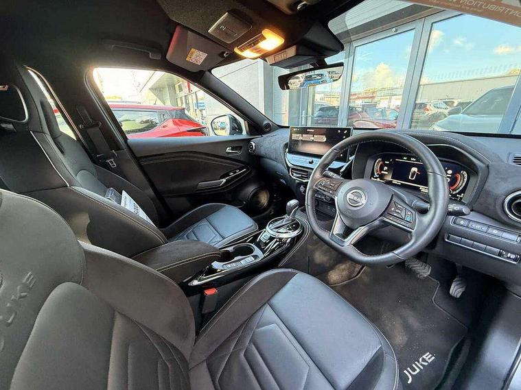 12.3" full colour TFT screen combimeter, Drive modes select (Eco, normal and sport), e-Pedal step, Emergency and breakdown call, EV mode switch, Front parking sensor, Intelligent driver alert system, Intelligent lane intervention, Lane departure warning system, Nissan connect 12.3" touch screen entertainment system, Nissan connect nav with TomTom traffic, Nissan connect services, Outside temperature sensor, Power Steering, Rear parking sensor, Stop/start button, Traffic sign recognition, Trip computer, Voice recognition, WiFi connectivity, Wireless Apple CarPlay and Google Android auto, Wireless Smartphone charger, 10 Bose speakers 6 speakers and 2 headrest speakers for driver/passenger seats, 2 X Rear console USB port, Bluetooth system, USB, Aux-in and 12V socket, Bose personal sound stage control, DAB Digital radio, Auto dimming frameless rear view mirror, Automatic hazard signal with emergency stop signal, Body colour door handles, Electrically adjustable door mirrors with integrated indicators, Follow me home headlights, Front and rear electric window with one touch driver window, Heated and auto folding door mirrors, High beam assist, LED 3rd brake light, LED daytime running lights, LED front fog lights, LED headlamps, LED rear fog lamp, LED rear lamps, One touch passenger window, Rain sensor windscreen wipers, Rear privacy glass, Rear side wing doors, Rear wiper, Roof spoiler, Shark fin roof antenna in solid Black, Three blink turn signal, 3 height adjustable rear headrests, 3 seat bench in 2nd row, 60/40 split folding rear seat, Automatic climate control, Card holder on driver sunvisor, Door ambient lighting, Driver seat back pocket, Driver side rear coat hanger, Driver/passenger sunvisors and vanity mirrors, Front and rear cabin lights, Front armrest, Front door pockets with bottle holders, Front head restraints, Front/rear passenger grab handles, Gear console ambient circle lighting, Height adjustable driver's seat, Internal chrome door handles, Leather gearshift knob, Luggage board, Luggage space lighting, Monoform sporty seats, Multifunction steering wheel, Passenger seat back pocket, Rear door bottle holders, Single front passenger seat, Smooth synthetic leather steering wheel, Synthetic leather kneepad, Telescopic steering wheel adjustment, Two cupholders in front centre console, Two rear isofix child seat anchorage points with top tether, Welcome light and console tray ambient lighting, Heat pack with height adjustable passenger seats - Juke, Interior personalisation pack - Juke, ProPilot pack - Juke Auto, Satin grey exterior personalisation pack - Juke, ABS with EBD and brake assist, Active ride control, Active Trace Control, Driver and passenger airbags, Driver and passenger side airbags, Electric handbrake with auto hold function, Electronic Stability Programme (ESP), Front and rear curtain airbags, Height adjustable seatbelts, Hill start assist, Intelligent emergency braking with pedestrian and cyclist recognition, Rear door child safety locks, Seatbelt reminder for driver/front passenger and rear seats, Three 3 point rear seatbelts, Traction control, Tyre pressure monitoring system, VDC Dynamic Vehicle Control, Alarm, Immobiliser, Intelligent key and start push button with walk away lock and approach unlock functions, Remote central locking, 19" Aero alloy wheels, Tyre puncture repair kit,