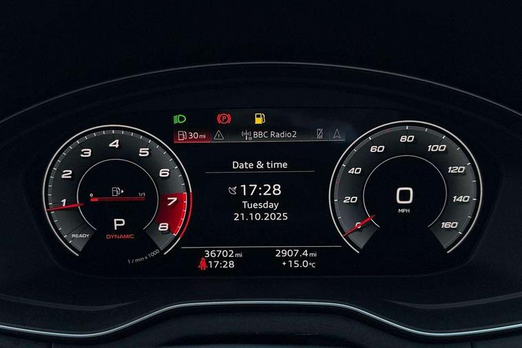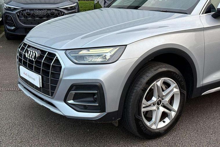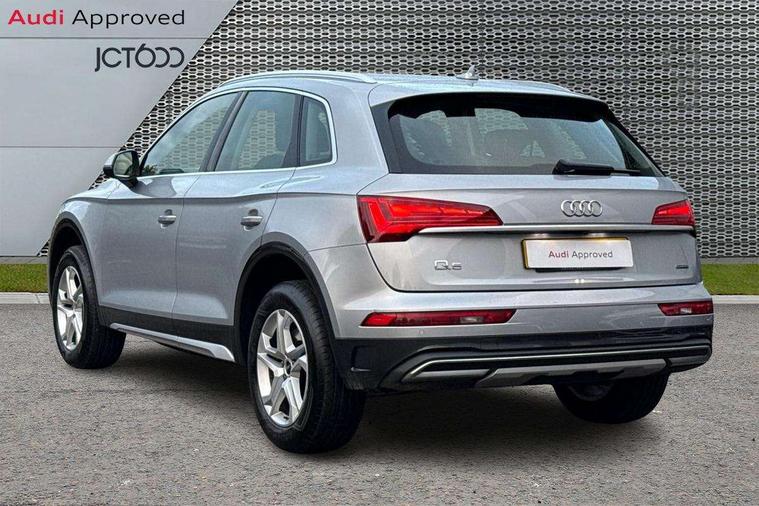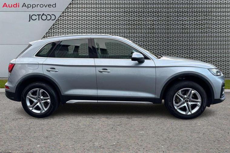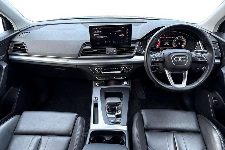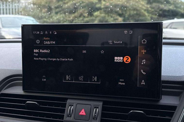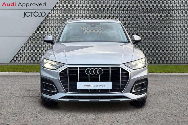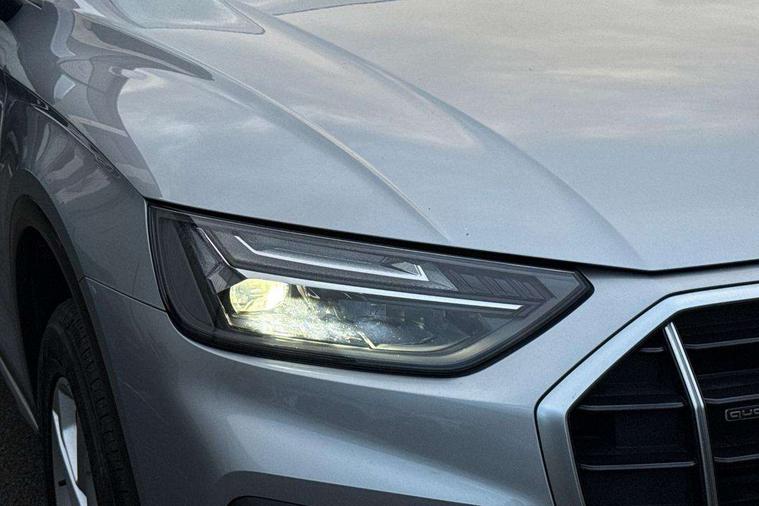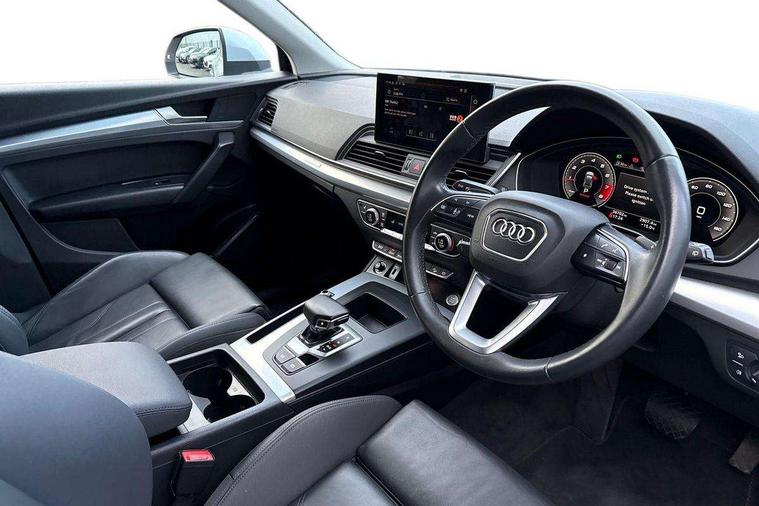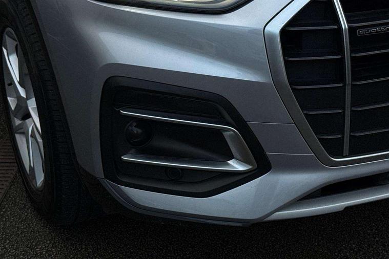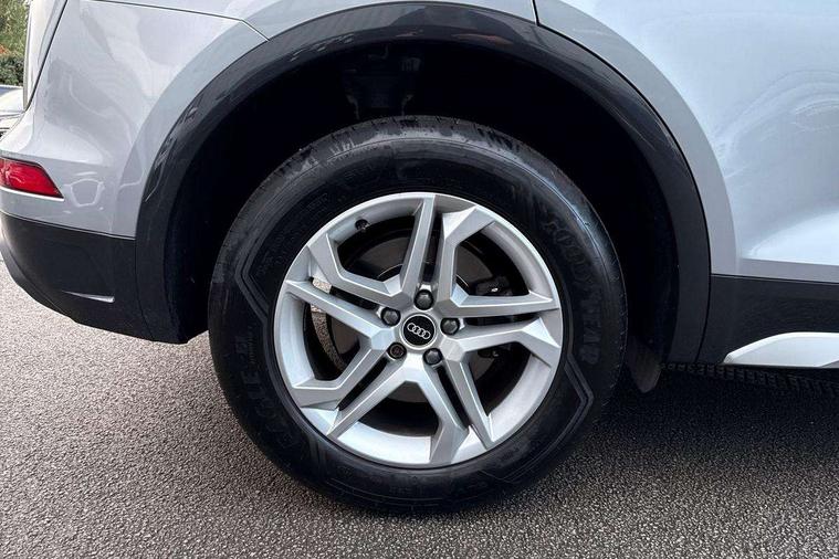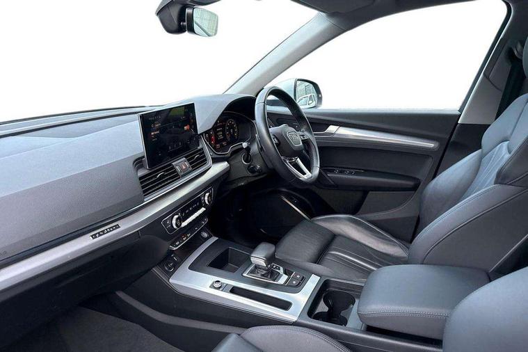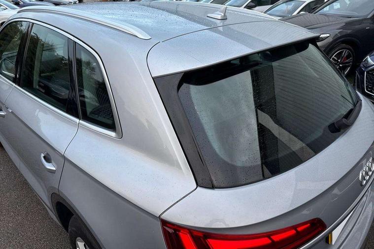 Acoustic front and rear parking sensor, Audi connect safety and service (e-call), Audi drive select, Audi virtual cockpit plus with 12.3" screen and three different layout designs, Audi wireless smartphone interface, Automatic start-stop system with coasting functionality and efficiency programme, Bluetooth interface, Cruise control + speed limiter, Electro - mechanical power assisted steering, MMI navigation plus with 10.1" touch screen, Power tailgate, Reversing camera, Service interval indicator, Voice control system with Audi hotword activation "Hey Audi", Dynamic suspension, Quattro on demand, DAB Digital radio, Acoustic windscreen, Air inlets in matt titanium black with blades in matt aluminium silver, Aluminium roof rails, Auto dimming rear view mirror, Automatic headlight adjustment, Automatic headlights and windscreen wipers, Body colour bumpers, Body colour door mirrors, Chrome plated exhaust trims, Door sills in Selenite silver, Electric adjustable/heated/folding door mirrors, Front and rear electric windows, LED headlights and LED tail lights, Lower bumpers painted in contrast Manhattan grey, Matt selenite silver underbody protection, Matt twilight grey radiator grille with chrome vertical struts, Rear chrome trim strip below lights, Rear diffuser strip in selenite silver, Rear spoiler, Rear wiper, Roof bars, 2 x USB charging port with aux input socket, 3 rear headrests, 3 spoke multifunction leather steering wheel with shift paddles, 40:20:40 split folding rear seat with rear centre armrest, Deluxe 3 zone electronic climate control, Door sills trims with aluminium inlays, Front centre armrest, Front/rear floor mats, Heated front seats, Height adjustable front head restraints, Height/reach adjustable steering column, ISOFIX child seat mounting and top tether, Luggage compartment cover, Manual seat adjustment with 4-way electric lumbar support, Removable luggage compartment floor, Silver cloth headlining, Sunvisors with vanity mirrors, Twin leather upholstery + front sports seats, High gloss pack - Q5, LED interior light pack - Q5, 3 point seatbelts on all seats, 6 airbags - Driver, front passenger, curtain and side airbags, Electrically operated child locks on rear doors, Electromechanical parking brake, Electronic stabilisation control including ABS, ASR and EDL, Front passenger airbag deactivation, Hill descent control, Hill hold assist, Multi collision brake assist, Pop-up bonnet for pedestrian protection, Pre sense city, Seat belt force limiter, Seatbelt monitoring, Tyre pressure warning, Warning triangle and first aid kit, Anti theft alarm, Anti-theft wheel bolts, Keyless Go access/ignition system, Aluminium rhombus inlay,