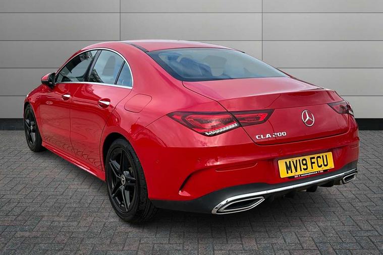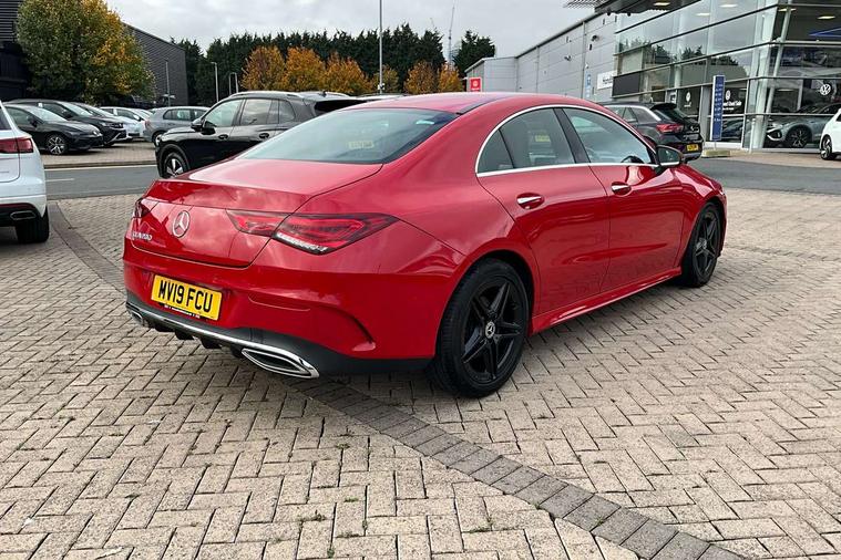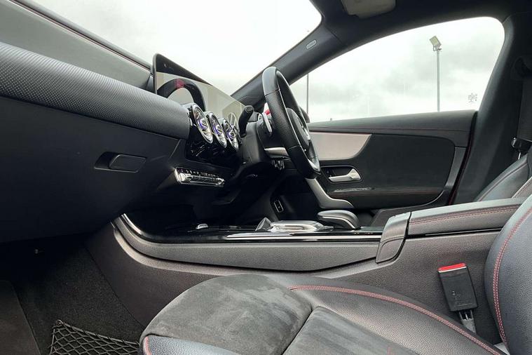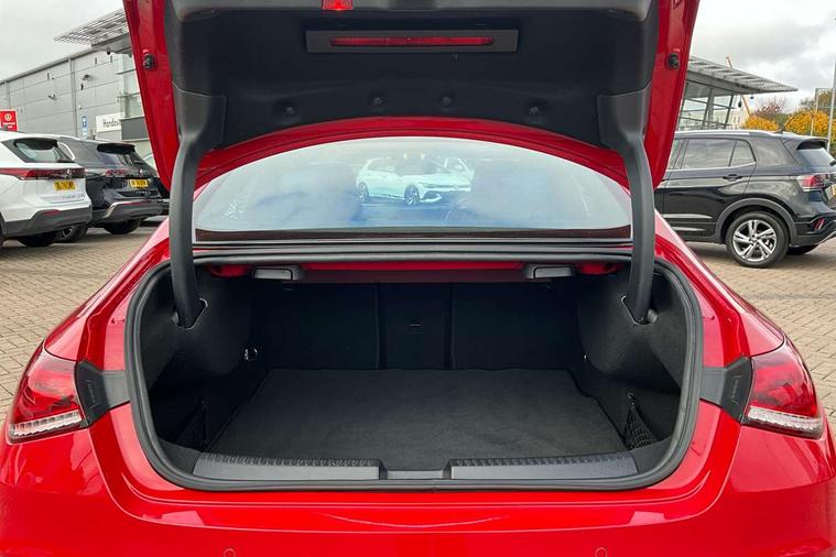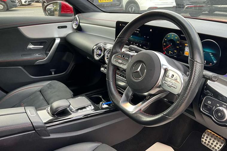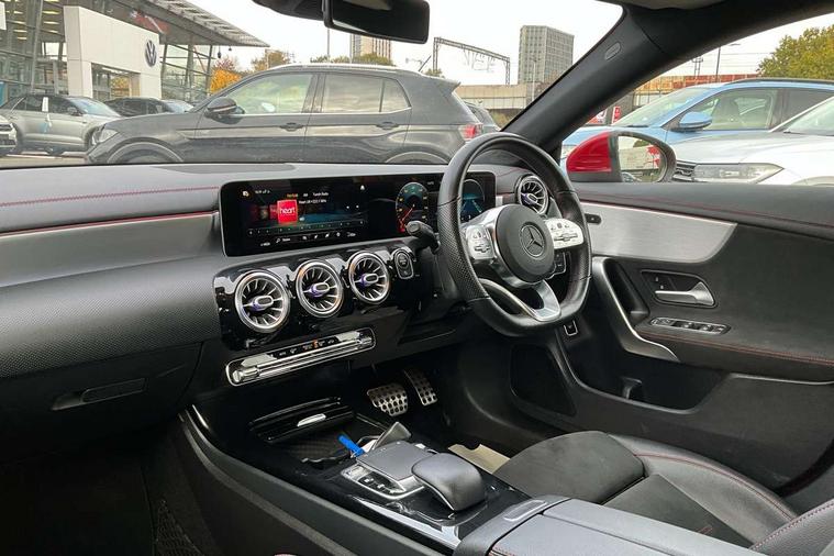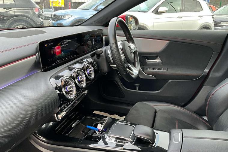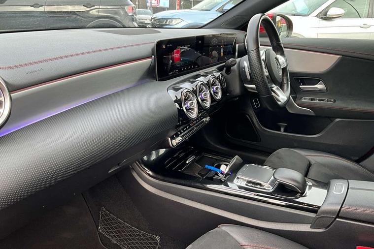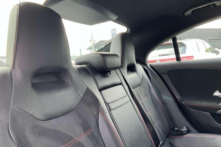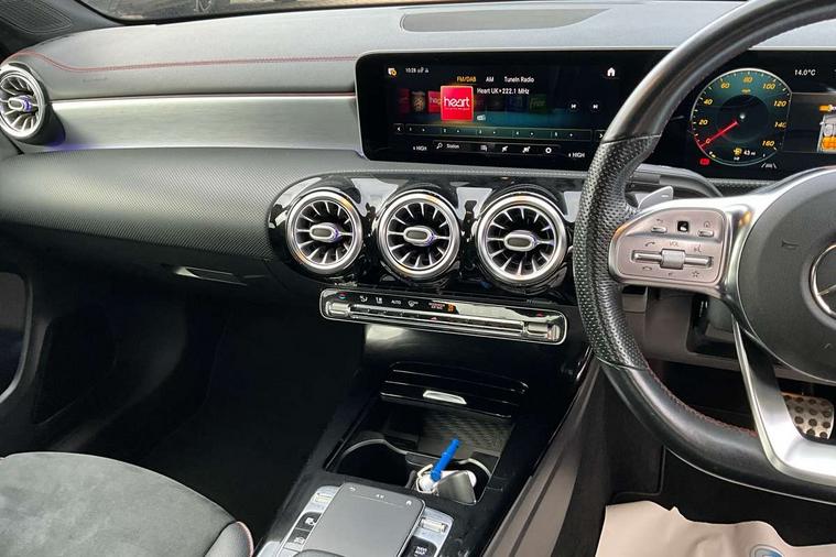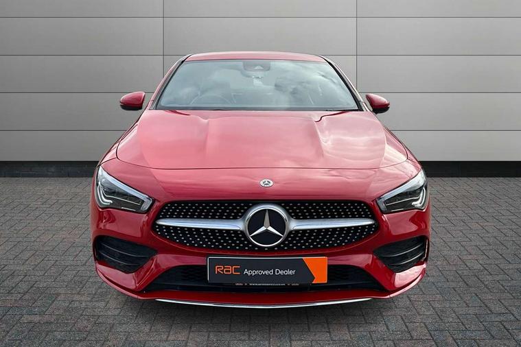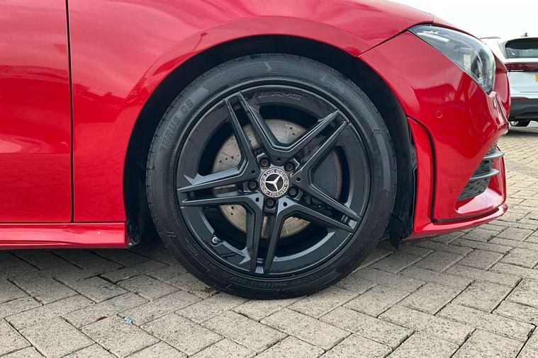 10.25 inch display instrument, 10.25" media display, 180 degree reversing camera, Active lane keeping assist, Active park assist with parktronic system, Attention assist - Monitors steering behaviour and long journey fatigue, Augmented Navigation, Cruise control + speed limiter, Direct steering, DYNAMIC SELECT with a choice of driving modes (ECO, Comfort, Sport, Sport+ and Individual), ECO start/stop function, Fluid level warning indicator for fuel, oil, coolant and washer fluid, Front and rear parking sensors, Hard-disk navigation, Hey Mercedes Voice activation, Lamp failure indicator, Outside temperature gauge, Pre-installation for private car sharing, Preinstallation for Mercedes Benz link, Radio aerial integrated into front and rear windshields, Service indicator (ASSYST), Smartphone integration, Trip computer in multifunction display with current consumption indicator, Wireless charging, Lowered comfort suspension, Rear axle multi-link, DAB digital radio tuner, Dash cam, MBUX multimedia system with DAB digital radio and touchpad including satellite navigation, Mercedes Benz sound system (225w) includes mid-range sound system, Rear stowage compartment with 1 front centre console, 2 x USB ports (type C), Active radiator shutters open for cooling air and close when not needed to improve aerodynamics and fuel efficiency, Adaptive brake lights, AMG body styling front apron, rear apron and side skirts, Beltline strips and weather strip in chrome, Body colour bumpers, Body colour door handles with chrome inserts, Diamond radiator grille pins in chrome with silver painted louvres and chrome insert, Electric windows, Electrically adjustable and heated door mirrors with integrated LED indicators, Exhaust system - Twin trapezoidal tailpipes in polished stainless steel, Headlamp assist automatic headlamp activation, Heated glass rear windscreen + timer control, High level LED third brake light, LED high performance headlamps with integrated LED daytime running lights, LED tail lamp, Privacy glass, Rain sensing windscreen wipers with two sensitivity settings, Rear fog lamp, 3 spoke flattened bottom nappa leather multifunction steering wheel with perforated leather in grip area, 40:20:40 split folding rear seat backrests, Air vents with surround in silver chrome, Automatic child seat recognition sensor, Black roof lining, Brown leather upholstery + Sports seats, Brushed stainless steel sports pedals with rubber studs, Floor mats with AMG lettering, Freight packaging with tie-down hooks, Front centre armrest with stowage, Front door sills with Mercedes Benz lettering, Galvanished gear shift paddles on steering wheel, Heated front seats, Illuminated glove compartment stowage, Illuminated Mercedes benz door sills, Interior lighting - 64 colour Ambient lighting, Luggage net on driver/front passenger seat backrest, Manually height and reach adjustable steering column, Rear armrest, Sport seats with fixed head restraints, Stowage compartment in centre console with retractable cover, Sunvisors with illuminated vanity mirrors, Touchpad on center console, Twin front cupholders, Two outer rear seat isofix and top tether child seat fixing points, Two zone automatic climate control with coloured inserts in air vents, Light and sight pack - CLA, Mirror pack - CLA, Seat comfort pack - CLA, Active bonnet pedestrain safety measure which detects an impact and raises bonnet by 65mm, Active brake assist includes forward collision warning system with autonomous braking, Adaptive brake assist with hold function and hill start assist, Anti-lock braking system (ABS) with brake assist, Brake pad wear warning indicator, Childproof locks manually operated for rear doors and electrically operated for rear power windows, Crash responsive emergency lighting, Driver and front passenger head and sidebags, Driver and front passenger windowbags, Drivers knee airbag, Dual stage driver and front passenger airbags, Electric parking brake, Electronic stability programme with acceleration skid control, ESP curve dynamic assist, Front and rear seatbelt reminder, Front brake callipers with Mercedes Benz lettering, Front passenger seat occupancy sensor, Three point rear seat belts, Tyre pressure monitoring system, Warning triangle and first aid kit, Alarm system with immobiliser and interior protection -Thatcham category 1, Keyless entry lock/unlock, Keyless Go starting function, Remote central locking and crash sensor with emergency opening function, Light aluminium with longitudinal grain interior trim, 18" 5 twin spoke design alloy wheels painted in titanium grey with high sheen finish, Summer tyres, Tirefit tyre sealant kit,