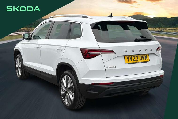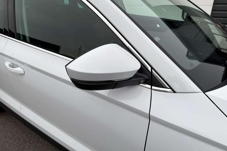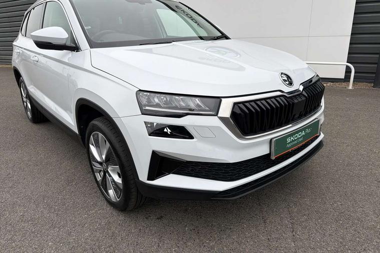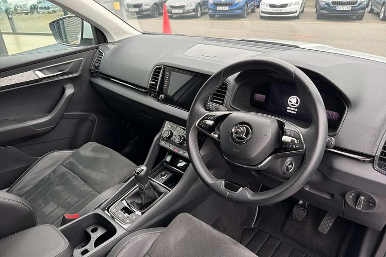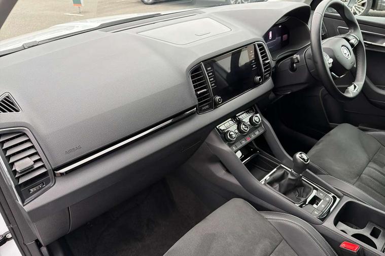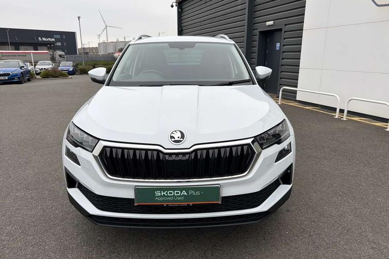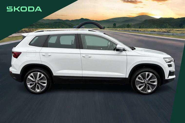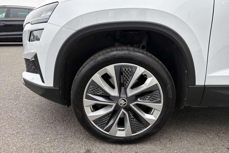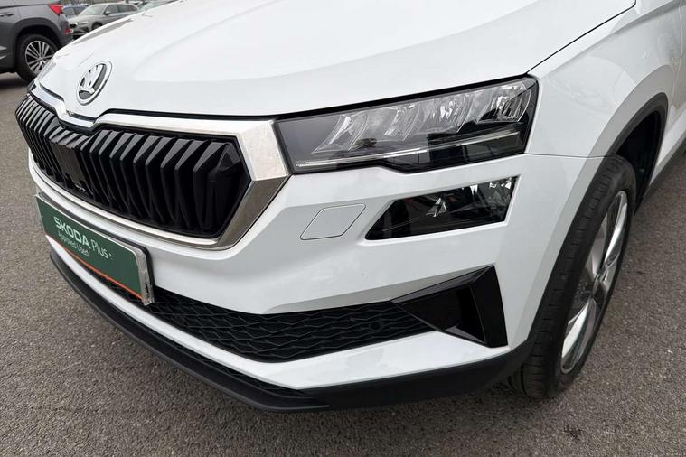8" Digital display, Care connect, Drive mode selector, Driver fatigue sensor, Electro-mechanical PAS, Emergency services call system, Outside temperature gauge, Service interval indicator, SmartLink wireless for Apple and wired for Android, Start/stop system with regenerative braking, USB C Port x 2 in front centre console, Diesel particulate filter, 8 Speakers, DAB radio with Bluetooth, USB connection, Acoustic glass, Aero front windscreen wipers with intermittent function, Auto dimming rear view mirror with light and rain sensors, Black electric window control buttons, Body colour door mirrors and handles, Dynamic headlight range control with cornering light function, Electric front and rear windows with child proof lock, Heated rear windscreen, LED daytime running lights, LED rear lights with high functionality welcome effect and dynamic indicators, Light assistant (coming/leaving home/tunnel light), Plastic scuff plates, Privacy glass, Rear side wing doors, Rear spoiler, Rear window wiper with washer system and intermittent control, Safety reflectors on front doors, Third brake light, 1.5 litre bottle holders in driver and front passenger door panels, 12V socket in boot, 12v socket in front centre armrest with storage compartment and rear air vents, 2 spoke leather heated multifunction steering wheel, 2 x Tablet holder, 3 rear height adjustable headrests, 3 seat bench in 2nd row, 4 foldable roof handles with rear coat hooks, Black floor carpet, Chrome inner door handles, Decorative door sills with KAROQ badging, Double sided boot floor, Foldable hooks in the boot, Front head restraints, Height adjustable front three point seats belts with tensioners, Height/reach adjust steering wheel, Ice scraper, Illuminated glovebox, Illuminated luggage compartment, Interior noise suppression, Isofix child seat preparation for front passenger seat, Isofix child seat preparation outer rear, Manual lumbar support for front seats, Pen holder, Pollen filter, Rear boot cover, Rear reading lights, Rubbish bin door, Safety vest holder, Single front passenger seat, Storage box in upper central dashboard closed, Sunvisors with illuminated vanity mirrors, Textile floor mats, Ticket holder, VarioFlex seats with standard rear seat release, Boot pack - Karoq, Chrome roof rails + chrome pack - Karoq, Parking pack - Karoq, Automatic door unlocking in case of crash, Automatic fuel cut off in case of crash, Child locks on rear doors, Driver airbag, Electronic parking brake with auto hold function, Emergency rear braking signal, ESC including ABS, MSR, ASR, EDS, HBA, DSR, RBS, MKB and traction control, Front side airbags, Hill hold control, Knee airbags, Passenger airbag with switch-off function, Pedestrian monitor, Seatbelt reminder signalisation and pretensioner for all seats, Three point seatbelts rear, Two tone horn, Tyre pressure display, Tyre pressure monitor, Alarm with interior monitoring, back up horn and tilt sensor with safe function, Electronic engine immobiliser, Keyless entry and start/stop, Remote central locking with 2 remote folding keys, Chrome framed air vents, 18" Miran alloy wheels in black, Anti-theft wheel bolts protection, Storage on wheel cover, Tool kit,