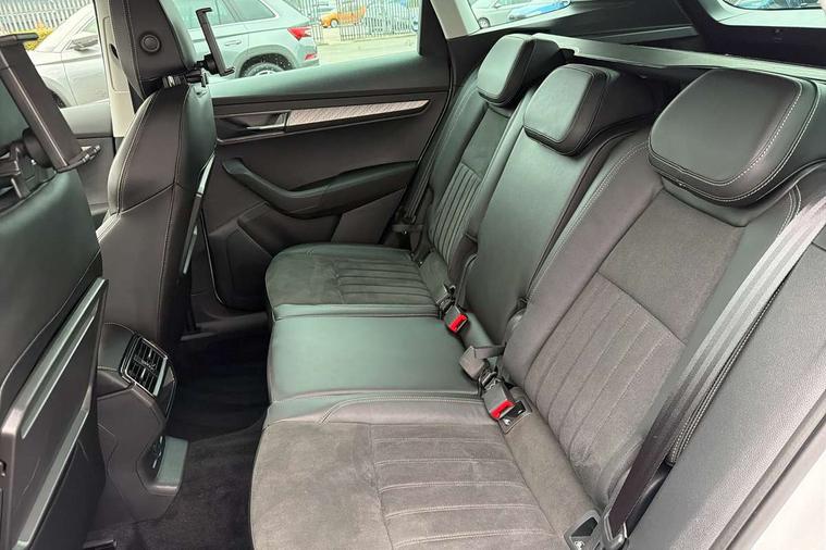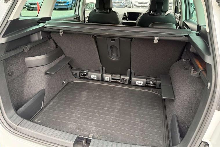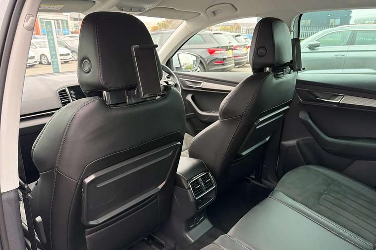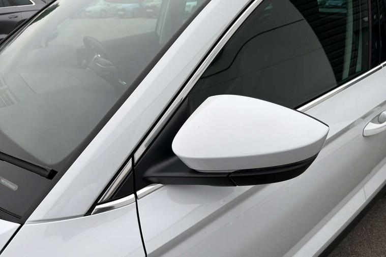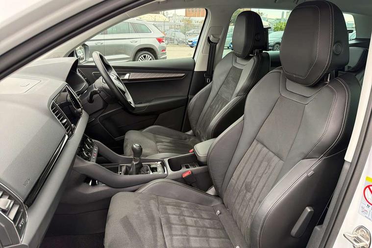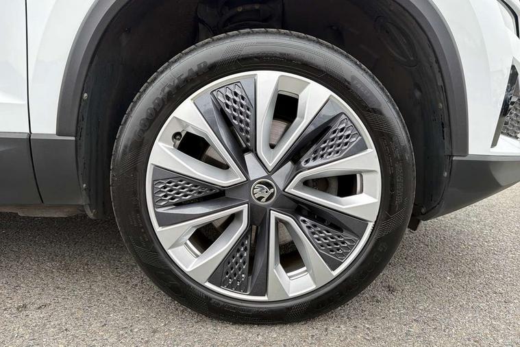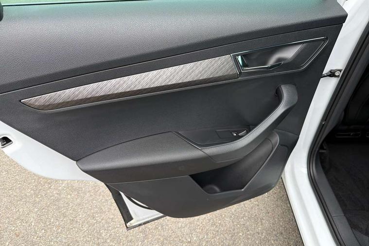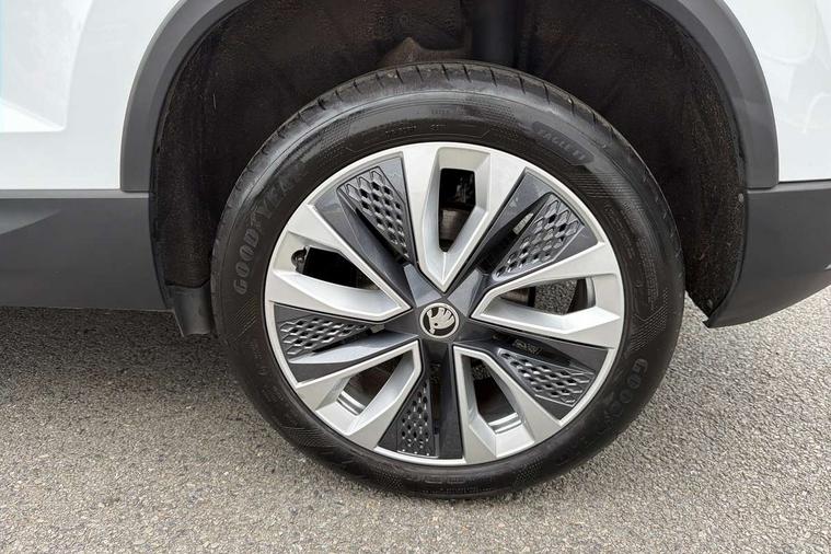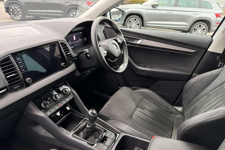 8" Digital display, Care connect, Drive mode selector, Driver fatigue sensor, Electro-mechanical PAS, Emergency services call system, Outside temperature gauge, Service interval indicator, SmartLink wireless for Apple and wired for Android, Start/stop system with regenerative braking, USB C Port x 2 in front centre console, Diesel particulate filter, 8 Speakers, DAB radio with Bluetooth, USB connection, Acoustic glass, Aero front windscreen wipers with intermittent function, Auto dimming rear view mirror with light and rain sensors, Black electric window control buttons, Body colour door mirrors and handles, Dynamic headlight range control with cornering light function, Electric front and rear windows with child proof lock, Heated rear windscreen, LED daytime running lights, LED rear lights with high functionality welcome effect and dynamic indicators, Light assistant (coming/leaving home/tunnel light), Plastic scuff plates, Privacy glass, Rear side wing doors, Rear spoiler, Rear window wiper with washer system and intermittent control, Safety reflectors on front doors, Third brake light, 1.5 litre bottle holders in driver and front passenger door panels, 12V socket in boot, 12v socket in front centre armrest with storage compartment and rear air vents, 2 spoke leather heated multifunction steering wheel, 2 x Tablet holder, 3 rear height adjustable headrests, 3 seat bench in 2nd row, 4 foldable roof handles with rear coat hooks, Black floor carpet, Chrome inner door handles, Decorative door sills with KAROQ badging, Double sided boot floor, Foldable hooks in the boot, Front head restraints, Height adjustable front three point seats belts with tensioners, Height/reach adjust steering wheel, Ice scraper, Illuminated glovebox, Illuminated luggage compartment, Interior noise suppression, Isofix child seat preparation for front passenger seat, Isofix child seat preparation outer rear, Manual lumbar support for front seats, Pen holder, Pollen filter, Rear boot cover, Rear reading lights, Rubbish bin door, Safety vest holder, Single front passenger seat, Storage box in upper central dashboard closed, Sunvisors with illuminated vanity mirrors, Textile floor mats, Ticket holder, VarioFlex seats with standard rear seat release, Boot pack - Karoq, Chrome roof rails + chrome pack - Karoq, Parking pack - Karoq, Automatic door unlocking in case of crash, Automatic fuel cut off in case of crash, Child locks on rear doors, Driver airbag, Electronic parking brake with auto hold function, Emergency rear braking signal, ESC including ABS, MSR, ASR, EDS, HBA, DSR, RBS, MKB and traction control, Front side airbags, Hill hold control, Knee airbags, Passenger airbag with switch-off function, Pedestrian monitor, Seatbelt reminder signalisation and pretensioner for all seats, Three point seatbelts rear, Two tone horn, Tyre pressure display, Tyre pressure monitor, Alarm with interior monitoring, back up horn and tilt sensor with safe function, Electronic engine immobiliser, Keyless entry and start/stop, Remote central locking with 2 remote folding keys, Chrome framed air vents, 18" Miran alloy wheels in black, Anti-theft wheel bolts protection, Storage on wheel cover, Tool kit,