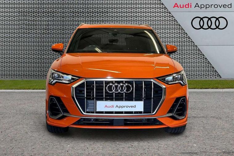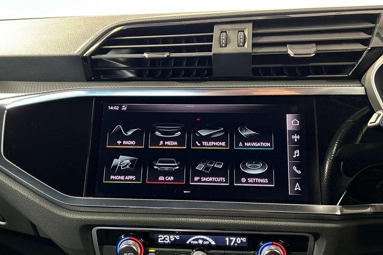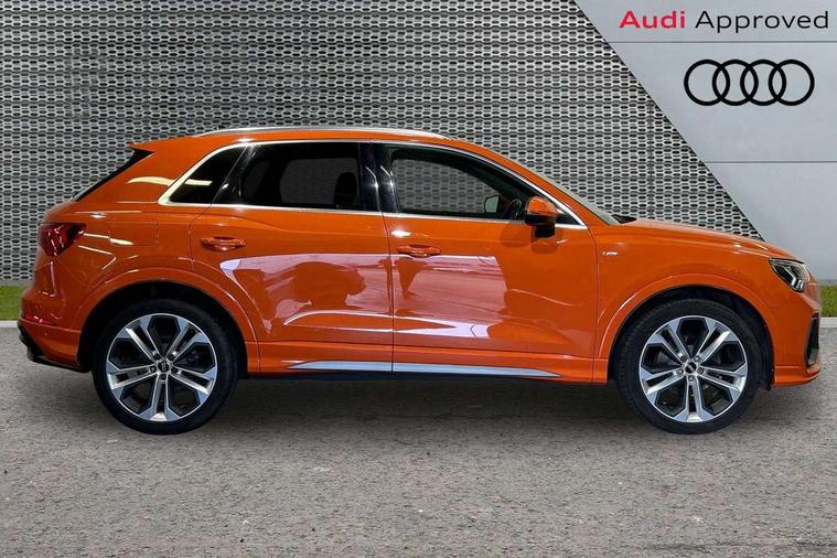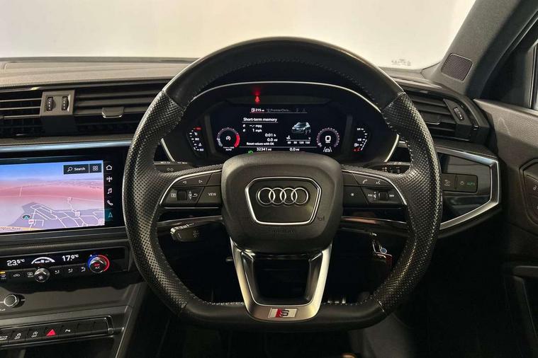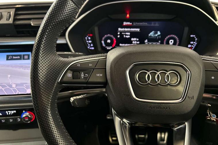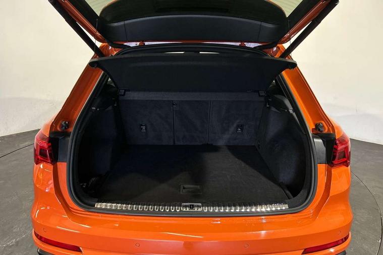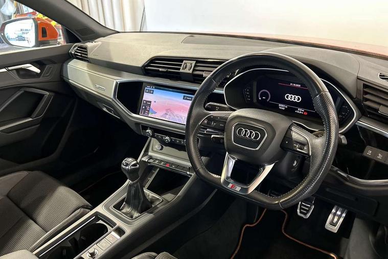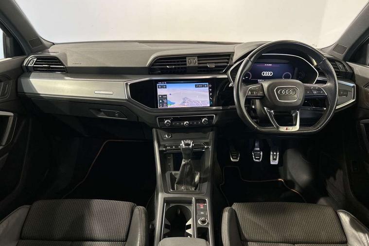 Audi connect safety and service (e-call), Audi drive select, Audi lane departure warning, Audi side assist, Audi smartphone interface, Audi Virtual Cockpit - 10.25" display, Bluetooth interface, MMI navigation plus with MMI touch, Power opening/closing tailgate, Progressive steering, Service interval indicator, Stop/start system, Voice control system, DAB digital radio module, Acoustic windscreen, Aluminium roof rails, Aluminium window trim, Auto dimming rear view mirror, Body colour door mirrors, Body coloured bumpers, Diffuser in matt Platinum grey, Electrically adjustable and heated door mirrors with integrated LED side indicators, Front and rear electric windows, Front fog lights, Front side air inlets in matt platinum grey, Front spoiler blade in matt platinum grey, Grille vertical bars in aluminium silver/Matt, High gloss black finish B and C pillars, Privacy glass, Rain and light sensors, Rear diffuser strip in selenite silver, S Line badge on wings, S Line front and rear bumpers, Side skirt insert in matt Platinium grey, Titanium black radiator grille, 12V socket in rear centre console, 40:20:40 split folding rear bench seat, Adjustable rear seat bench/backrest with centre armrest and cupholder, Aluminium door sill trims, Black cloth headlining, Dual zone climate control, Front and rear black floor mats with contrast stitching in rock grey, Front and rear headrests, Front centre armrest with storage compartment and angle adjustment, Illuminated door sill trims with S logo, ISOFIX child seat mounting and Top Tether with front passenger airbag deactivation, Perforated leather gearknob, Stainless steel luggage compartment sill finisher, Stainless steel pedals, Non smoking pack - Q3, 3x3 point rear seatbelts, 6 airbags - Driver, front passenger, curtain and side windows, Audi pre-sense front with pedestrain and cyclist recognition, Electronic stabilisation control including ABS, ASR and EDL, Hill hold assist, Pre sense basic, Seatbelt monitoring, Tyre pressure warning, Warning triangle and first aid kit, Anti theft alarm, Anti theft wheel bolts, Remote central locking, Dark matt brushed aluminium inlay, MMI touch colour display in gloss black with aluminium surround,