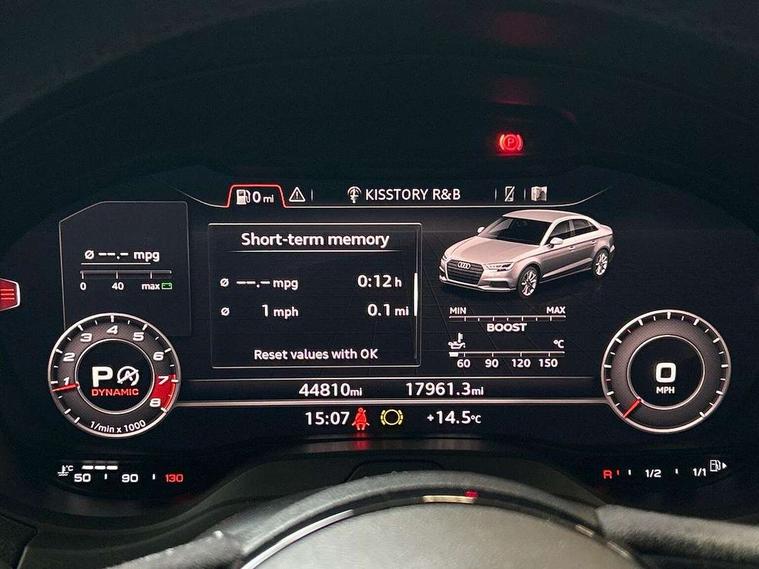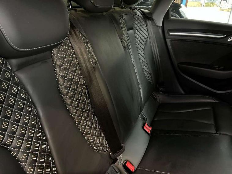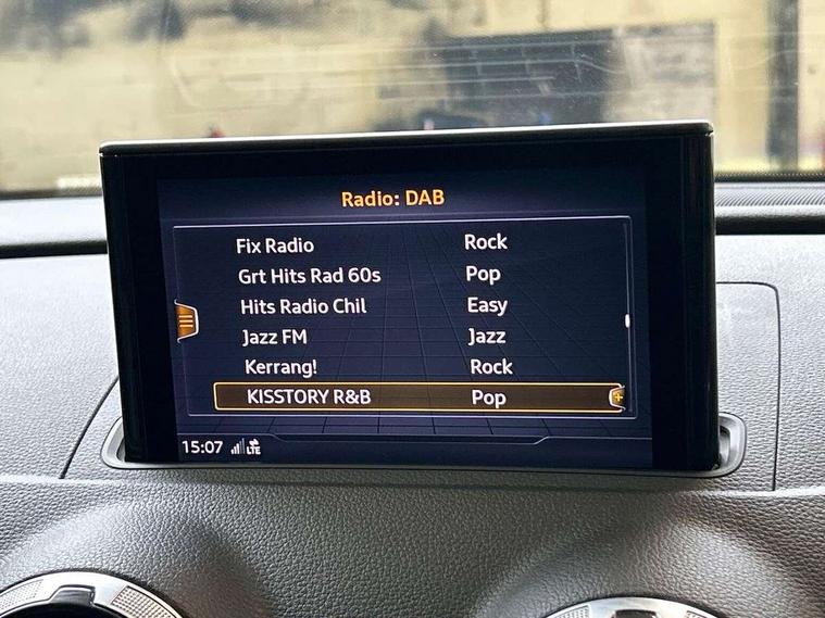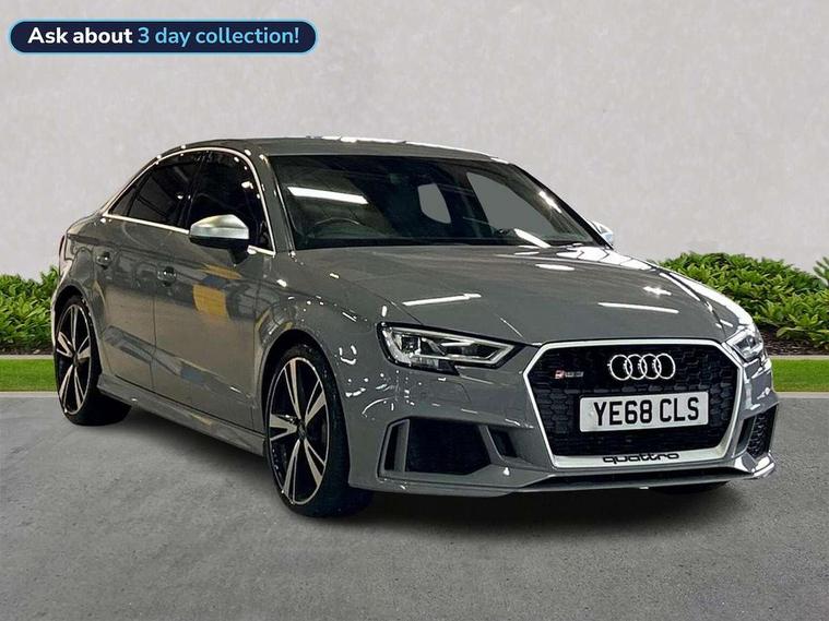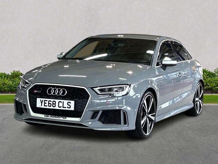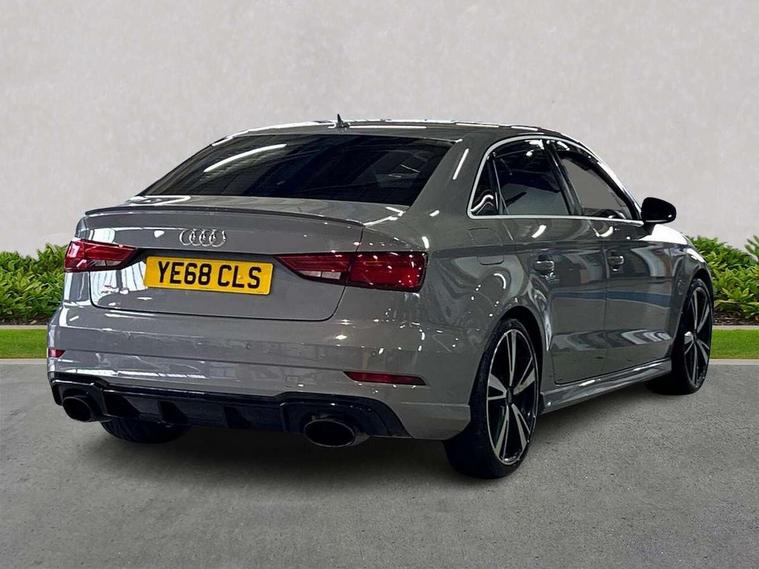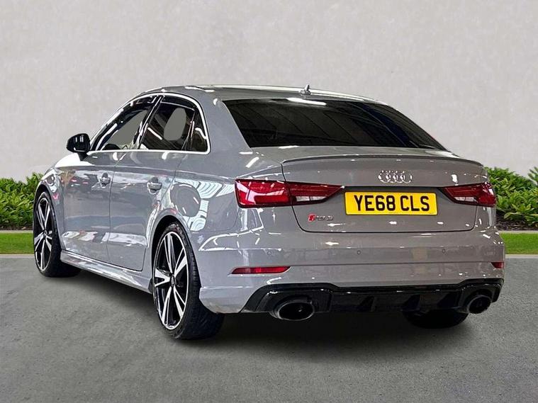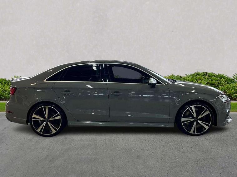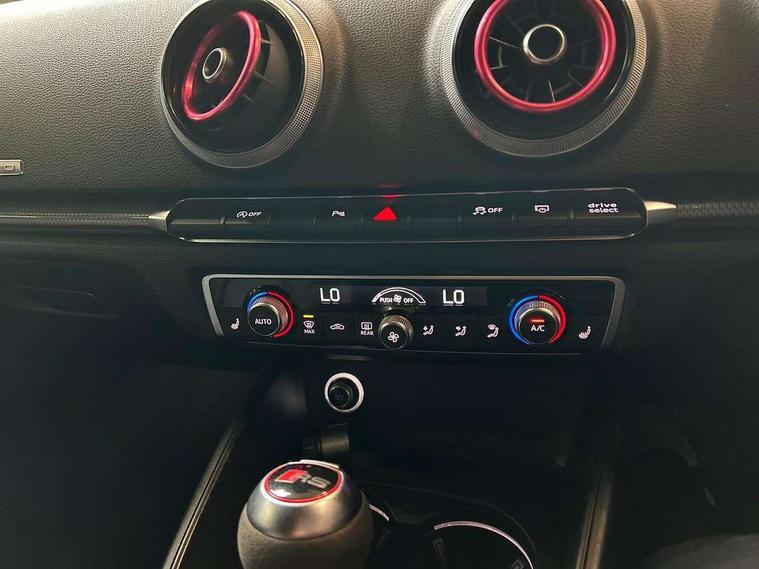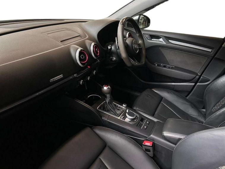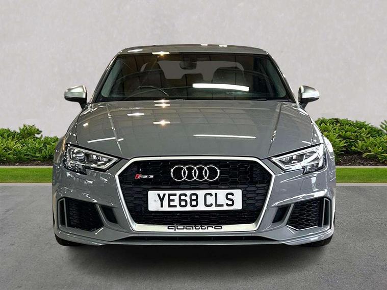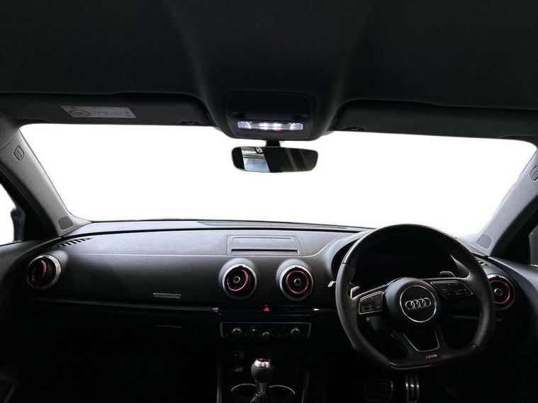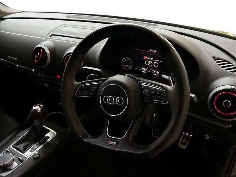 Audi connect, Audi drive select, Audi smartphone interface, Audi virtual cockpit - 12.3" high-resolution LCD display with fully customisable instrument cluster, Bluetooth interface, MMI navigation plus with MMI touch, Progressive power assisted steering, Service interval indicator, Trip computer, Voice control system, RS sports suspension, 10 GB hard disk, 2 USB ports, Audi music interface, Aux-in socket, CD player, DAB Digital radio, MMI radio plus with 7" colour MMI screen and MMI controller, Two SDXC card slots, Audi Beam uses LEDs to project the Audi Sport logo, Auto dimming rear view mirror with light and rain sensors, Automatic lights and wipers, Black high gloss front air inlet, Body coloured side sills, Electric operated/heated door mirrors, Front and rear electric windows, Headlight washers, Heated rear window, Heated windscreen washer jets, High gloss black rear diffuser, LED daytime running lights, RS design body styling, 3 adjustable rear headrests, 3 spoke flat bottomed sports multifunctional leather steering wheel with aluminium look gearshift paddles, 4 lashing points to secure luggage, 60/40 split folding rear seat, Adjustable front armrest, Alcantara gear knob gaiter, Cloth headlining, Dual zone electronic climate control, Front and rear interior lights with delay, Front head restraints, Heated front seats, Height/depth adjustable steering column, Illuminated door sills, Illuminated glovebox, ISOFIX child seat preparation+airbag deactivation, Jack and tool kit, Stainless steel pedals, Storage compartment in centre console, Storage compartments in doors, Storage under driver's seat, LED interior light pack - A3/RS3, Non smoking pack - RS3, Storage and luggage pack - A3/RS3, 3 point seatbelts on all seats, ABS/EBD, ASR, Curtain airbags, Driver and passenger side airbags, Driver/Front Passenger airbags, Drivers knee airbag, EDL, Electromechanical parking brake, ESC - Electronic Stability Control + traction control, Seatbelt warning, Tyre pressure warning, Warning triangle and first aid kit, Anti theft alarm, Anti-theft wheel bolts, Immobiliser, Remote control central locking, Aluminium trim elements, Tyre repair kit,