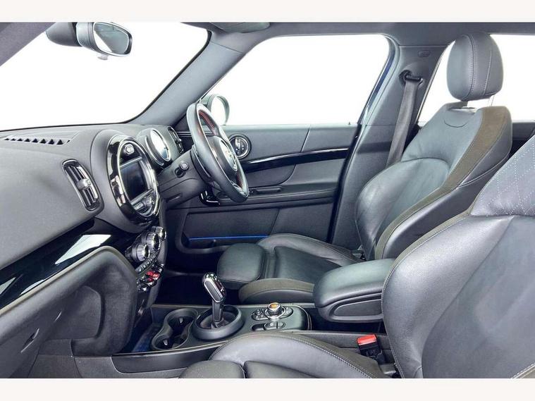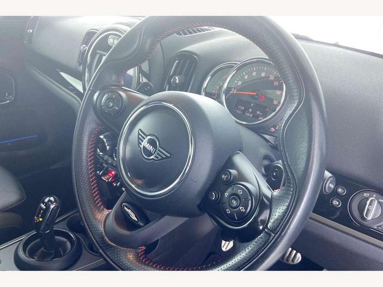 Active Guard incl speed limiting and lane departure functions with auto steering, and front collision warning with brake intervention, Automatic start/stop function with brake energy recuperation, Compatible mobile phone bluetooth with audio streaming, Electro-mechanical speed dependant steering assistance, Instrument cluster, MINI Driving Modes - centre toggle switch to control driving setting (sport, mid and green), Mini E-call, MINI TeleServices, On board computer, Rear parking distance control, Double Vanos system, Fully variable valve control, High precision injection, Performance Control, Sport automatic transmission with steering wheel paddles, FM tuner and DAB digital radio, Bonnet scoop, Chrome border honeycomb structure radiator grille with S badge, Chrome fuel filler cap, Day time driving lights, Dynamic brake lights, Electric windows, Heated rear window, Heated windscreen washer jets, John Cooper Works - aerodynamic kit (front and rear apron, spoiler), front and rear sport bumpers and part-painted side sills with door sill finishers, John Cooper Works Logo, John Cooper Works rear spoiler, Metal door sill strips with Cooper S imprint, Model logo, Model logo on Tailgate, Rain sensor with auto headlights, Rear fog lights, Rear window wiper, Side scuttle panel with integrated indicator, Split rear doors, Sun/heat protection glass, Twin exhaust tailpipe, White indicator lenses, 12V Accessory socket in centre console, 360L luggage compartment capacity, 4 lashing eyes in luggage compartment, 40:20:40 split folding rear seats, Anthracite headlining with grab handles and clothes hooks, Chrome interior highlights, Colour line - Carbon black, Cupholders, English handbook, Front headrests, Glove compartment, Height and length steering column adjustment, Interior lighting with 12 basic colours selectable via toggle switch in roof, Isofix rear child seat preparation, John Cooper Works perforated leather steering wheel with contrast stitching in chilli red and John Cooper Works logo, Leather gearshift lever and handbrake gaiters, LED reading lights, vanity mirror lights, front foot well light and spotlight on front seats, Manual air conditioning, Mechanical seat adjustment, driver seat height adjust, forward/back and front seats backrest, Multifunction steering wheel, Passenger seat height adjuster, Rear headrests, Storage compartments in doors, Sunvisors with vanity mirrors, Excitement pack - Countryman, Navigation pack - Countryman, 2 tone horn, 3 point seatbelts on all seats, 6 Airbags - front, side, head and seat belt tensioners, Anti-lock braking system (ABS), DSC - Dynamic Stability Control, Electronic handbrake, Front and rear disc brakes, Hill start assist, Tyre pressure monitoring system, Alarm system with tilt sensor, monitoring doors, bonnet interior and tailgate, Auto drive away locking, Deadlocking function, Electronic vehicle immobiliser, Locking wheel bolts, Start/stop toggle with keyless go, Tool kit,