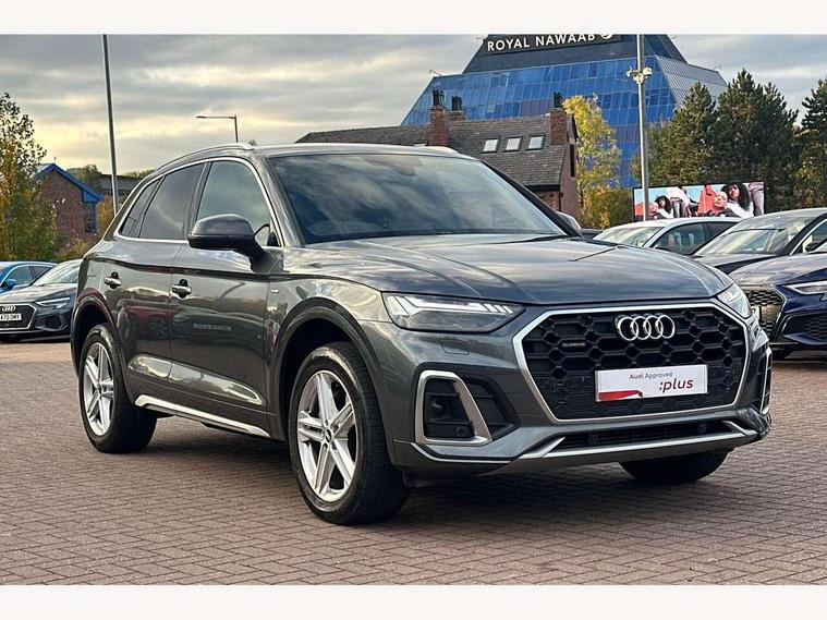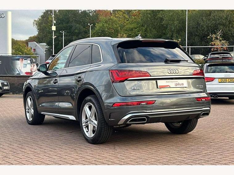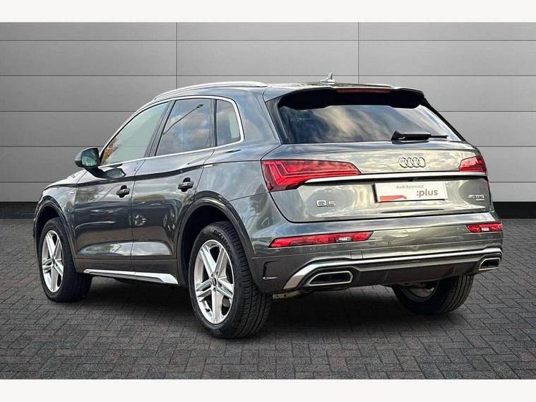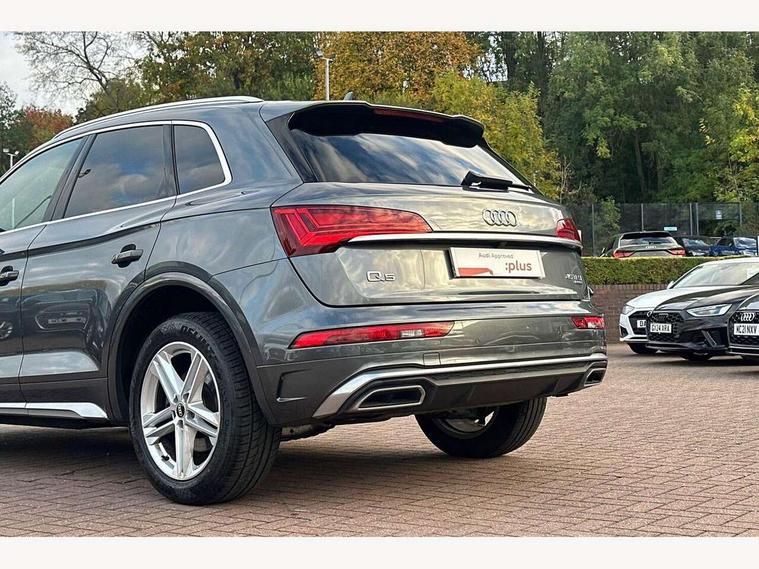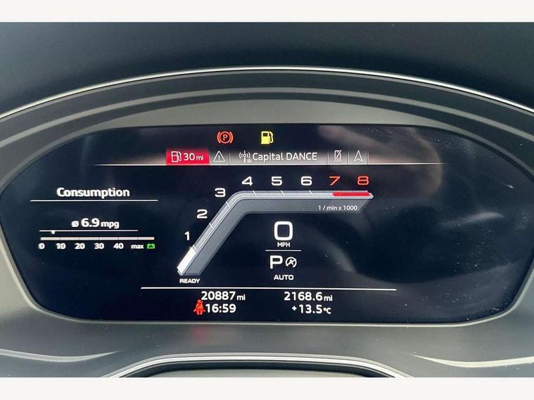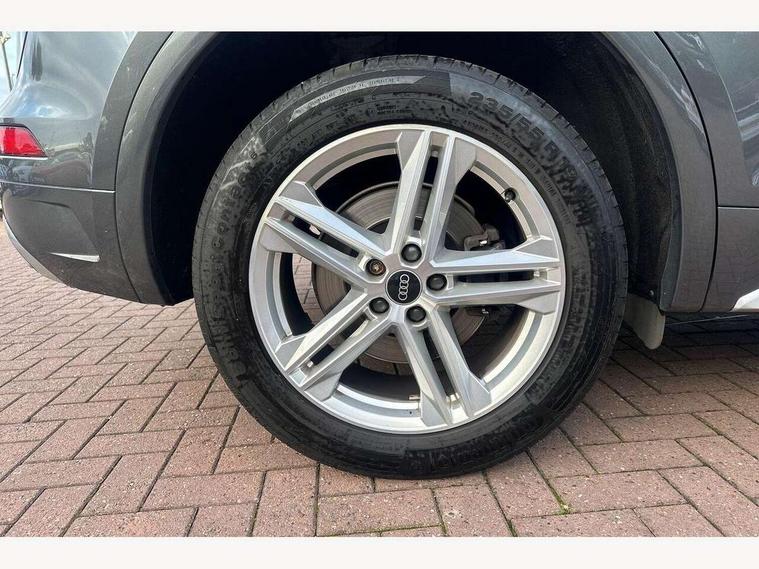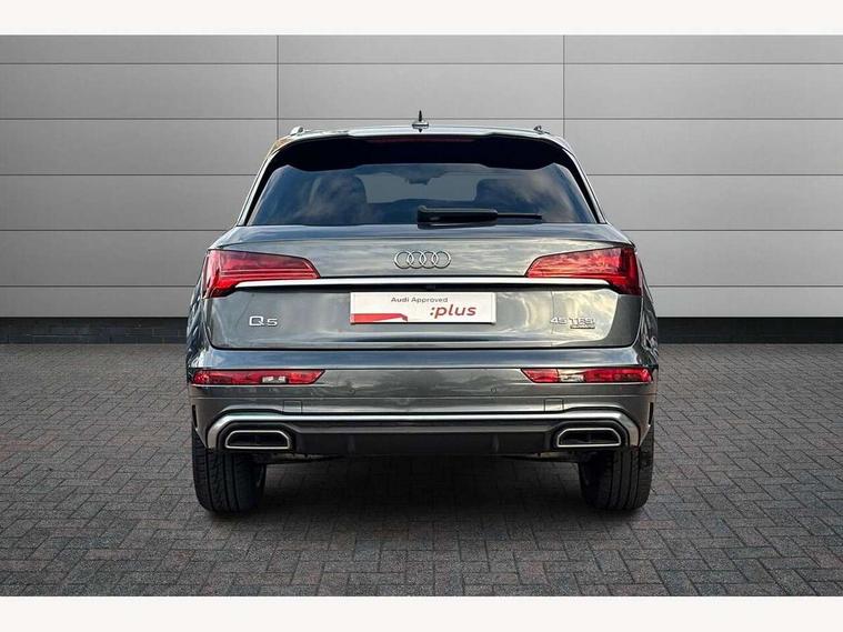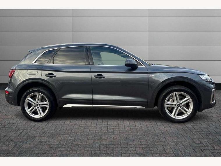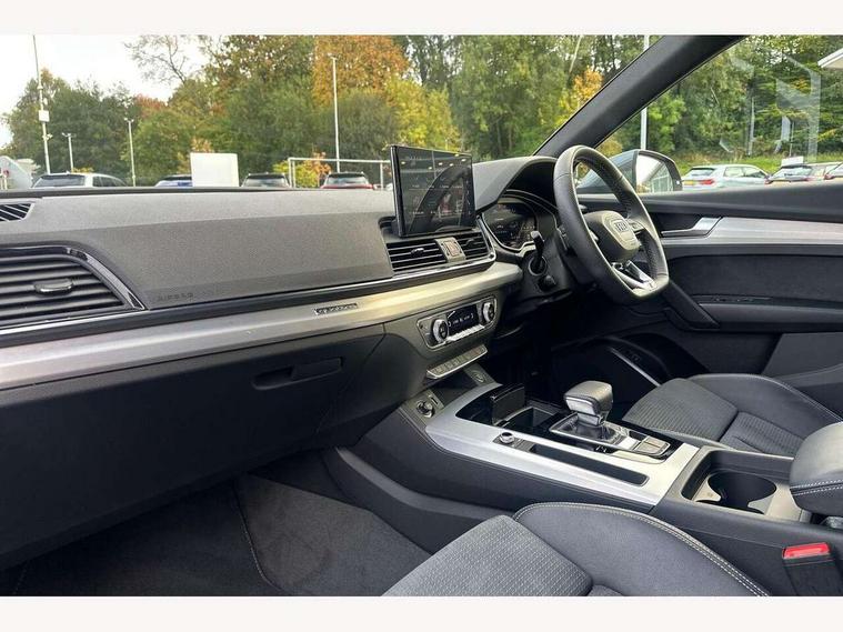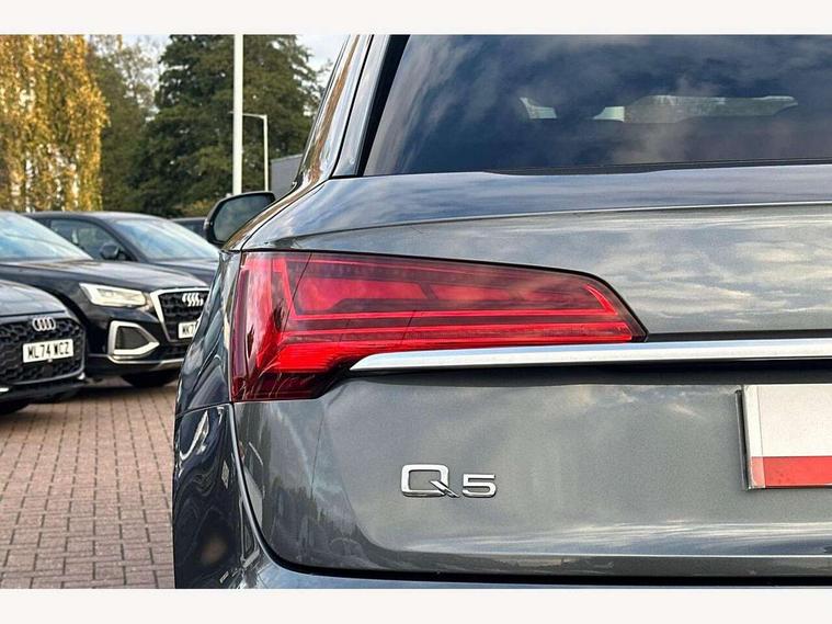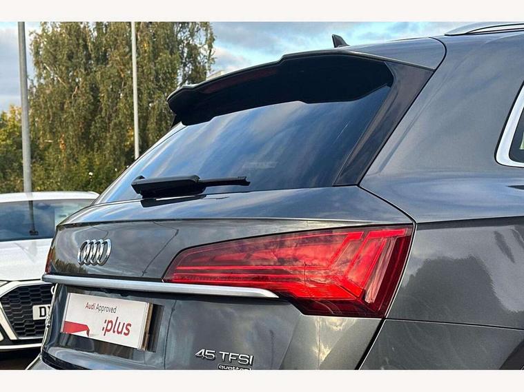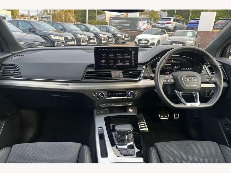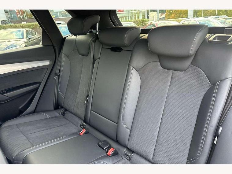 Audi connect safety and service (e-call), Audi connect with Amazon Alexa Integration, Audi drive select, Audi virtual cockpit plus with 12.3" screen and three different layout designs, Audi wireless smartphone interface, Automatic start-stop system with coasting functionality and efficiency programme, Bluetooth interface, Electro - mechanical power assisted steering, MMI navigation plus with 10.1" touch screen, Power tailgate, Reversing camera, Service interval indicator, Voice control system with Audi hotword activation "Hey Audi", Quattro on demand, S line sports suspension, 2 x USB charging port with aux input socket, DAB Digital radio, 3rd brake light, Acoustic windscreen, Aluminium roof rails, Audi matrix LED headlights with dynamic front and rear indicators, Auto dimming rear view mirror, Automatic headlights and windscreen wipers, Body colour bumpers, Body colour door mirrors, Body colour rear diffuser with matt aluminium silver surrounds, Body colour underbody protection, Chrome plated exhaust trims, Daytime running lights, Door sills in Selenite silver, Electric adjustable/heated/folding door mirrors, Front air inlet surrounds in aluminium, Front and rear electric windows, Front radiator grille in honeycomb design, Headlight washers, Lower bumpers painted in contrast Manhattan grey, Rear chrome trim strip below lights, Rear privacy glass and rear side windows, Rear side wing doors, Rear spoiler, Rear wiper, Roof bars, S Line badges on the front wings, S Line front and rear bumpers, S Line side skirts, 3 rear headrests, 40:20:40 split folding 3 rear bench seat in 2nd row with rear centre armrest, Black cloth headlining, Comfort front centre armrest, Contrast stitching on seats, steering wheel and gear lever gaiter, Deluxe 3 zone electronic climate control, Front/rear floor mats, Gear lever in black leather, Heated front seats, Height adjustable front head restraints, Height/reach adjustable steering column, Illuminated door sill trims with S logo, ISOFIX child seat mounting and top tether, Luggage compartment cover, Manual seat adjustment with 4-way electric lumbar support, Removable luggage compartment floor, Single front passenger seat, Stainless steel pedals, Sunvisors with vanity mirrors, High gloss pack - Q5, LED interior light pack - Q5, 3 point seatbelts on all seats, 6 airbags - Driver, front passenger, curtain and side airbags, Electrically operated child locks on rear doors, Electromechanical parking brake, Electronic stabilisation control including ABS, ASR and EDL, Front passenger airbag deactivation, Hill descent control, Hill hold assist, Multi collision brake assist, Pop-up bonnet for pedestrian protection, Pre sense city, Seat belt force limiter, Seatbelt monitoring, Tyre pressure warning, Warning triangle and first aid kit, Anti theft alarm, Anti-theft wheel bolts, Keyless Go access/ignition system, Matt brushed aluminium inlays,