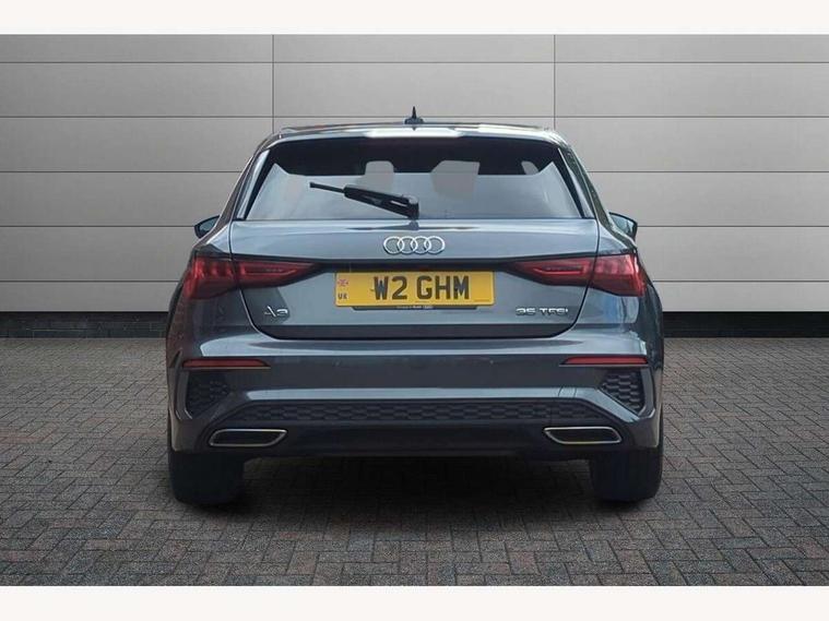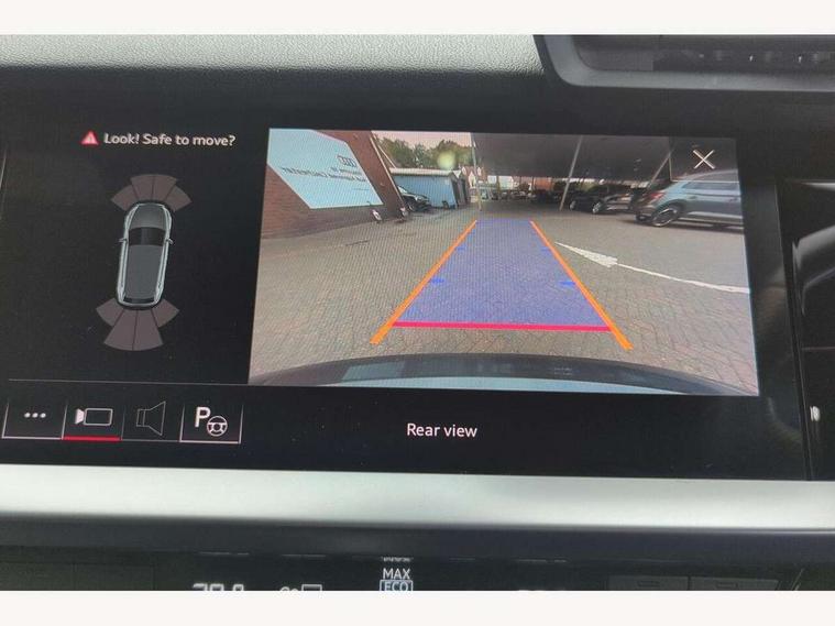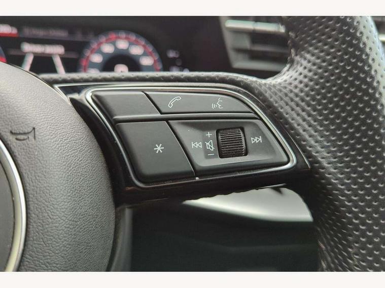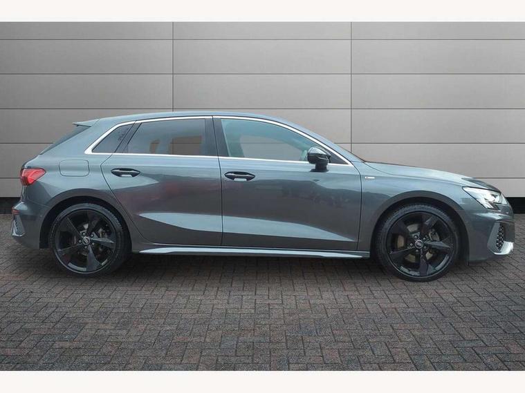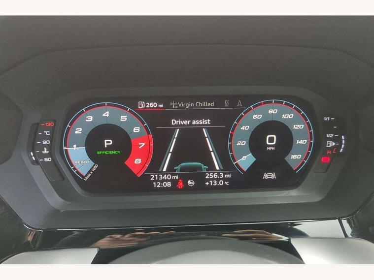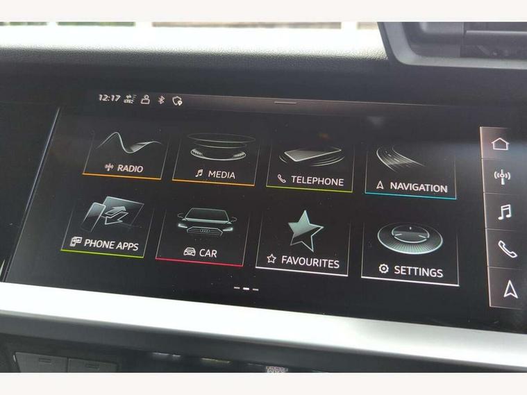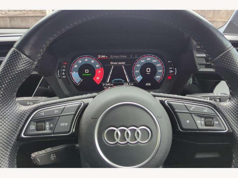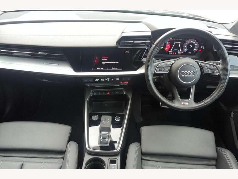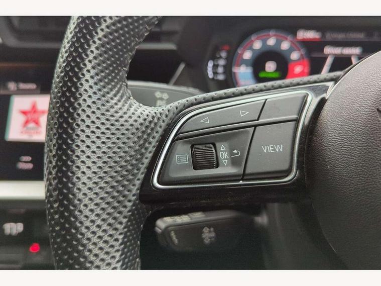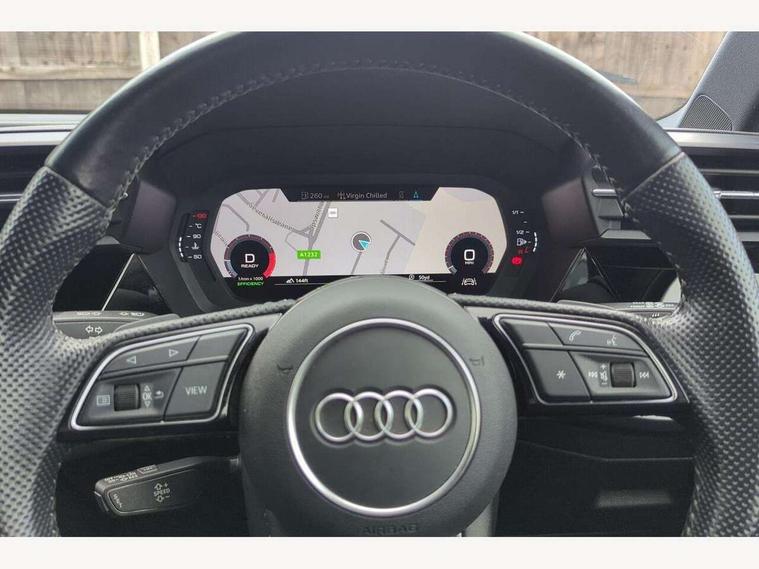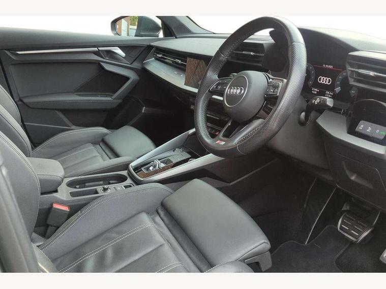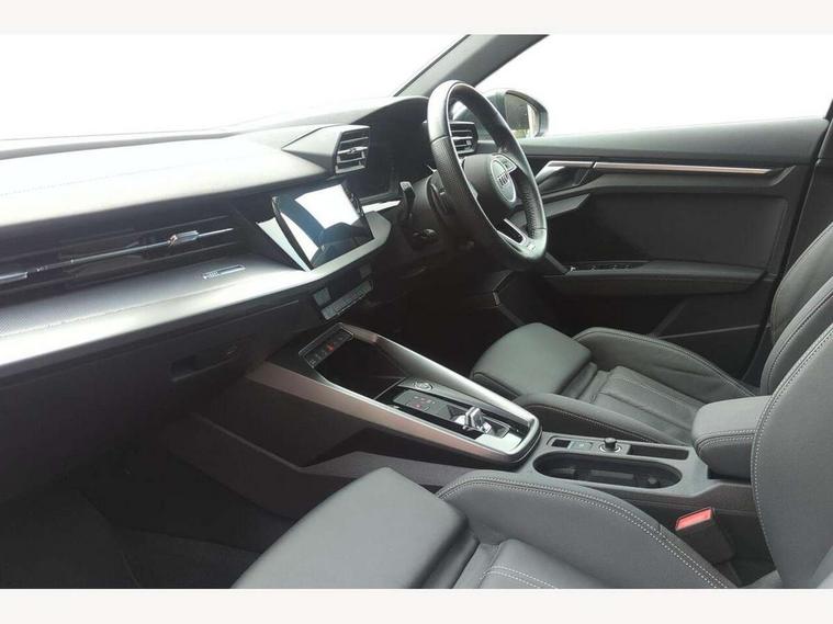 Audi connect emergency call and service, Audi drive select (Auto, Comfort, Dynamic, Efficiency and Individual), Audi smartphone interface, Audi Virtual Cockpit - 10.25" digital and colour instrument cluster, Automatic start/stop system with recuperation, Bluetooth interface, Collision avoidance assistant, Electromechanical power speed sensitive steering, Lane departure warning system, MMI Navigation Plus with high resolution 10.1" colour touch screen display, Service indicator, Trip computer, Voice control system with natural language interaction, 1xUSB-A and 1xUSB-C connection, 6 passive loudspeakers, DAB Digital radio, Acoustic glass windscreen, Aluminium window trim, Auto dimming frameless rear view mirror, Body colour exterior mirrors, Electrically adjustable/heated/folding/auto dimming door mirrors with integrated LED indications + kerb view function for passenger side, Front electric windows, Illuminated aluminium inserts front door sills with S logo, LED daytime running lights, Light and rain sensors, Privacy glass - dark tinted rear window, rear door and side windows, Rear electric windows, Rear side air outlets in grained matt black, Rear wiper, S line bumpers, S roof spoiler, 12V socket and storage compartment in front centre console, 40/20/40 split folding rear seat bench with cupholder, Black cloth headlining, Dual zone electronic climate control, Front and rear centre armrest in leather, Front and rear headrests, Front/rear floor mats, Height and reach adjustable steering wheel, Interior lighting - glove compartment light and right hand side, Luggage compartment floor covering, Manual boot compartment lid, Manually adjustable front seats, Seat side bolsters, Stainless steel pedals and front footrest, Twin leather upholstery with front sports seats S embossed logo, Aluminium interior elements pack - A3 Sportback, S line styling pack - A3 Sportback, 3x3 point rear seat belts, Driver and front passenger airbag with passenger airbag deactivation, Electronic Stabilisation Control (ESC) including ABS, ASR and EDL, First aid kit with warning triangle and 2 safety vests, Hill hold assist, Pre-sense front with pedestrian and cyclist detection, Seatbelt monitoring, Tyre pressure loss indicator, Anti theft alarm, Anti-theft wheel bolts, Electronically operated child lock, Immobiliser, Remote control central locking, Accent surfaces in the dashboard and centre console in platinum grey silk effect paint finish, Dark spectrum aluminium inlays,