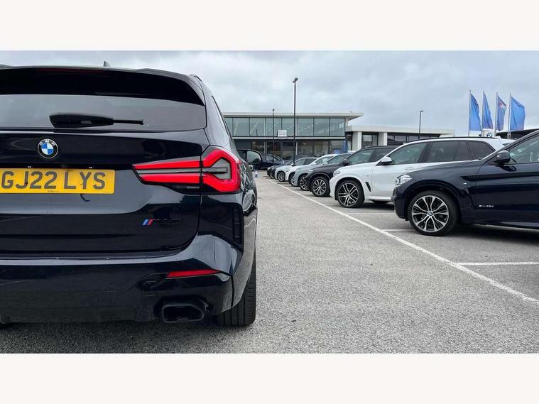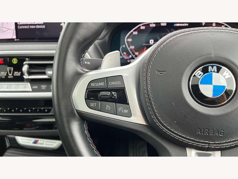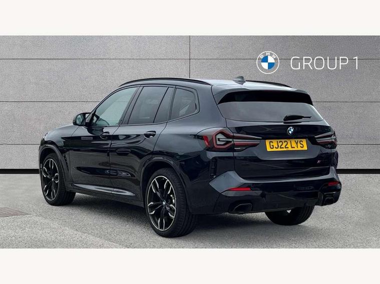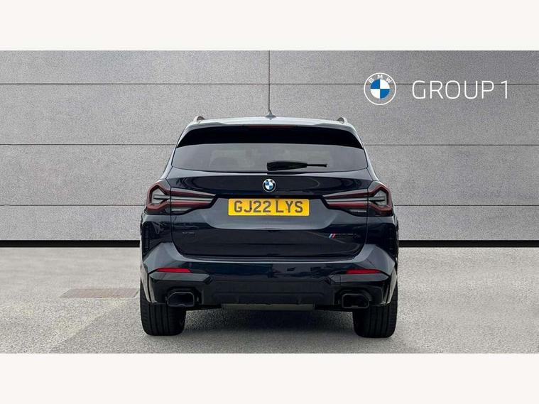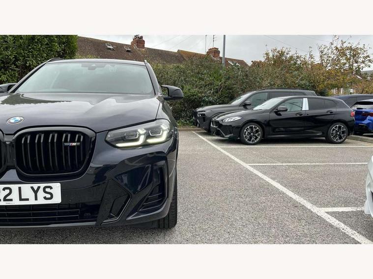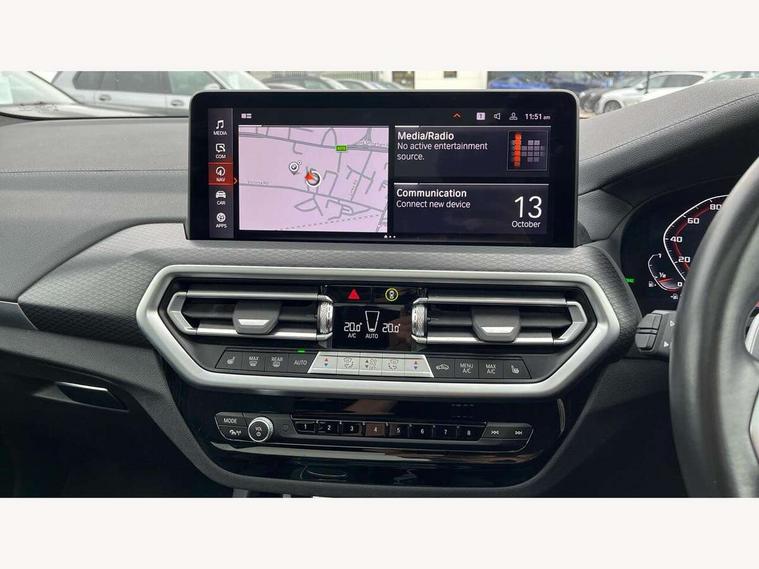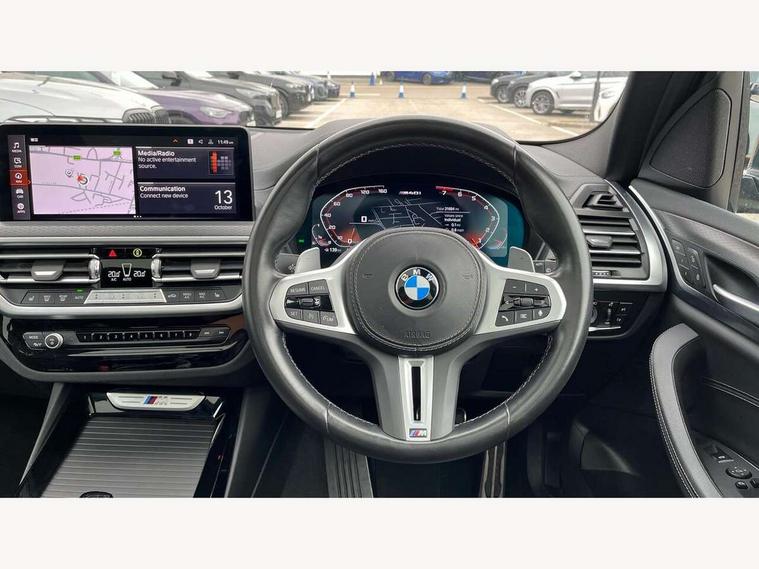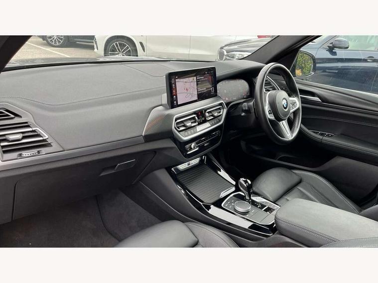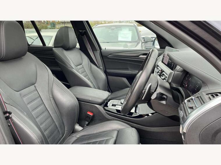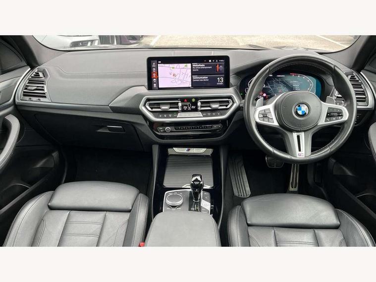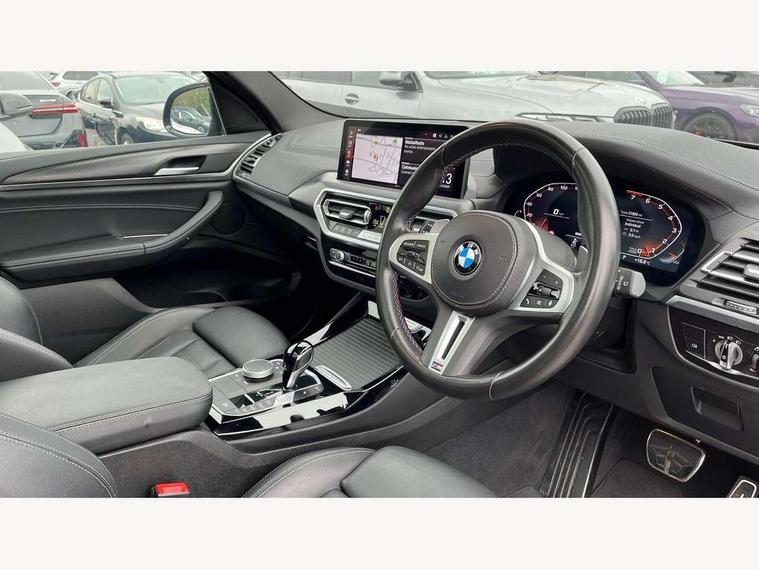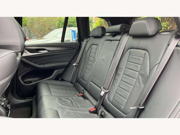 Active Guard, Attentiveness assist, BMW Live Cockpit Professional nav system including 12.3" instrument display + 12.3 high resolution control display, BMW Online services, BMW Teleservices, Brake pad wear indicator in front and rear, Check Control warning system for monitoring of lights and door/luggage compartment open warning, Condition based service - BMW service history, electronic service booklet, integrated owner's handbook, Connected drive services, Deletion of driving assistant professional, Electric boot lid, Front/rear Parking distance control, iDrive Controller with 8 favourite buttons, Instrument cluster with speedometer with mph readout, tachometer, fuel gauge and oil temperature gauge, Lights on warning by audio warning signal when ignition is switched off, Oil sensor for level and grade, warning by check control system, On board computer - average speed+fuel consumption, service interval, clock/date, odometer/trip meter, outside temperature display and ice warning, Optimum shift indicator, Personal Profile - automatic lock when driving away selectable, Stop/start system, Variable sports power steering, Drive performance control with ECO PRO comfort + sport mode, Incorrect fuelling protection, M Adaptive suspension, M Sport differential, Multi-link rear suspension, Performance Control, Sport automatic transmission with gearshift paddles, BMW professional radio/CD/MP3, DAB tuner, Acoustic glazing, Automatic windscreen wipers and automatic headlight, Black finish on B pillars, BMW individual high gloss shadow line with extended content, Body colour door handles, Body colour roof mouldings, Body coloured bumpers, Direction indicator, side repeaters, integrated in exterior mirrors, Dynamic brake lights, Electric adjust heated aspherical door mirrors, Exhaust tailpipes - dual, round, split left and right with chrome finisher, Fingertip control / anti-trap function on electric window, Folding wing mirrors with auto dimming, Follow me home headlights, Front and rear bumper system with replaceable deformation elements, Front and rear electric windows, Green tinted heat insulating glass, Heated windscreen washer jets, High beam assistant, High gloss black shadow line roof rails, High gloss shadowline exterior trim in decorative moulding side frame/recess cover/guide rail/B, C pillars/mirror frame and triangle with mirror base, High level 3rd brake light incorporating LED Technology, Interior rear view electrochromatic mirror with automatic anti dazzle function, Kidney frame and struts painted in high gloss black, LED tail lights, Lightweight engineering, M aerodynamic bodystyling, M black mirror caps, Model designation, Rear side wing doors, Rear wing door, Rear wiper, Shark fin antenna, Side exterior M designation badges, Sun protection glass, Visible VIN plate, Welcome lighting, Windscreen wipers with adjustable interval, 12V power socket in front centre console, 3 rear headrests, 3 zone automatic air conditioning, 4 lashing points to secure luggage, 40:20:40 split folding rear seat with loading system, 5 seats, Ambient lighting, Anthracite headlining, Automatic interior light when door is opened/ignition switched off or via remote key, Electric adjustable seats with memory function, Foldable storage floor with compartment, Four grab handles integrated in roof lining, Front and rear bottle holders integrated into door trim storage compartments, Front and rear side armrests integrated into door trim, Front centre armrest with storage compartment, Front footwell lights, Front head restraints, Front/rear courtesy lights with soft on/off dimming, Front/rear reading lights, Heated front seats, Isofix rear child seat preparation, Leather gear knob, Luggage area underfloor compartment, Luggage compartment lighting, M sport leather steering wheel, Multifunction steering wheel, Parcel shelf removeable and storable under boot floor, Reach and rake adjustable steering column, Rear centre armrest with 2 cupholders, Removable / retractable luggage cover, Slope adjustable rear seats, Storage compartment in rear centre console and front/rear door trims, Sun visors with vanity mirrors and ticket pocket, Toolkit located in luggage compartment, Two front cupholders with removable oddments tray/lid, Vernasca leather upholstery, Connected pro pack - X3, Active protection, ADB - Automatic Differential Brake, Anti-lock braking system (ABS) with brake assist, Automatic Stability Control (ASC), Battery safety cut-off, BMW emergency call, Brake drying, Brake energy regeneration, Braking pre-tensioning, Child locks on rear doors, Cornering brake control (CBC), Crash Sensor - activation of central locking release, hazard warning light and interior lighting, Deactivation of fuel pump in the event of a crash, Driver and front passenger front and side airbags with passenger deactivation and ITS front and rear head airbags, DSC+, Dynamic brake control, Dynamic Traction Control - DTC, Electromechanical parking brake, Hill descent control, Hill start assist, M sport seatbelt, Seatbelt security check for front seats, Side impact protection, Three point seatbelts to all seats with front and outer rear pyrotechnic belt tensioners and seat belt force limiters, Two tone horn, Tyre pressure sensor, Ventilated front and rear disc brakes, Warning triangle and first aid kit, Central locking switch for all doors, fuel filler cap and luggage compartment, Electronic engine immobiliser, Locking wheel nuts, Remote control including two integrated key - one button for open/close all lockable content, windows and separate button for open luggage compartment, Remote control Thatcham category 1 alarm, Start/stop button with Comfort Go keyless engine start and auto Start/stop deactivation button, Sensatec dashboard, Low rolling resistance tyres,