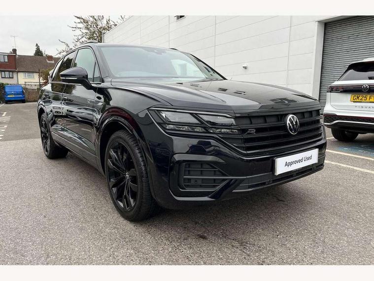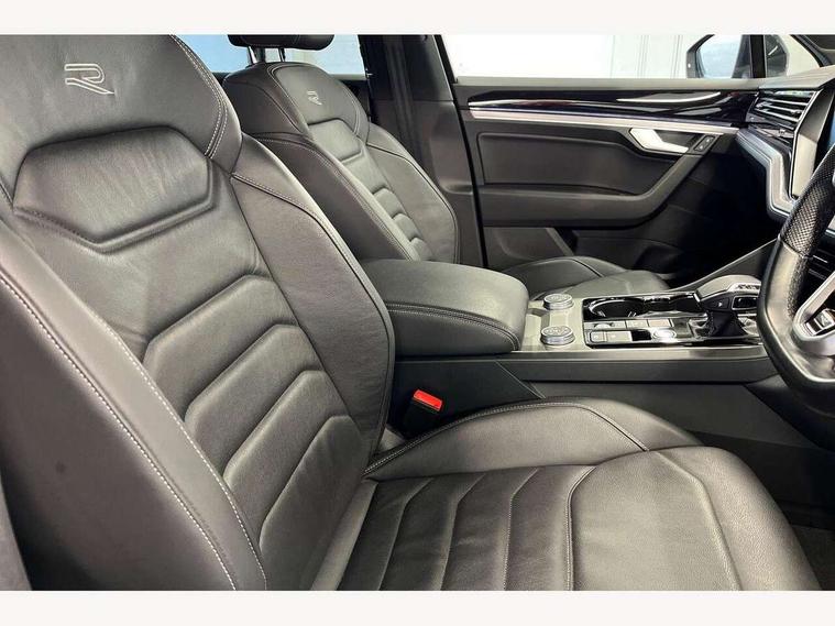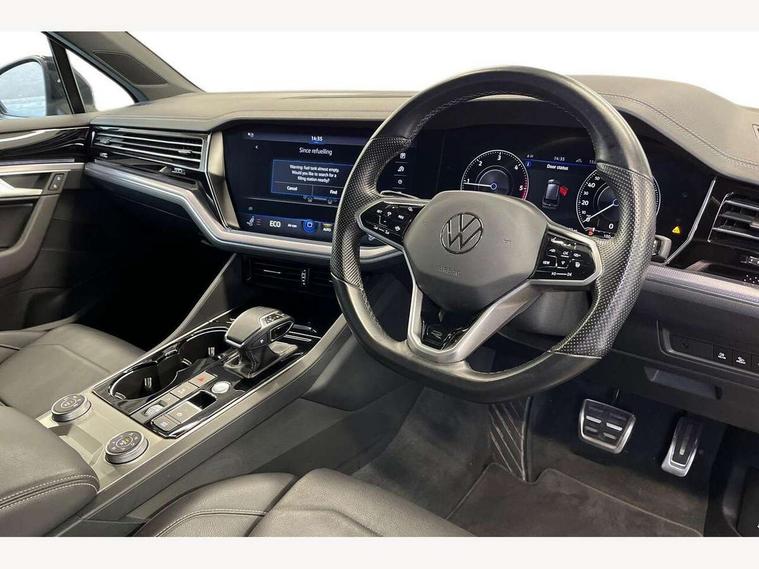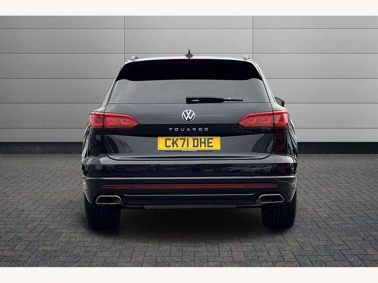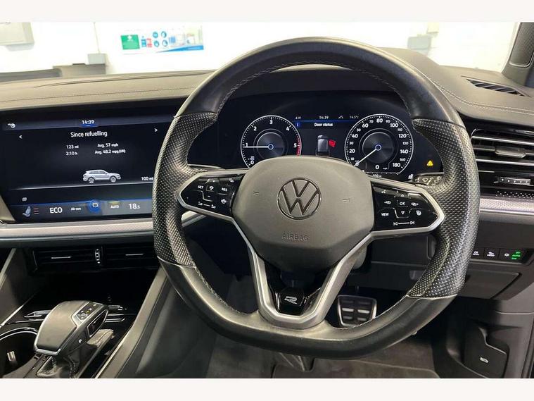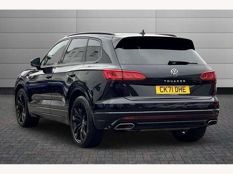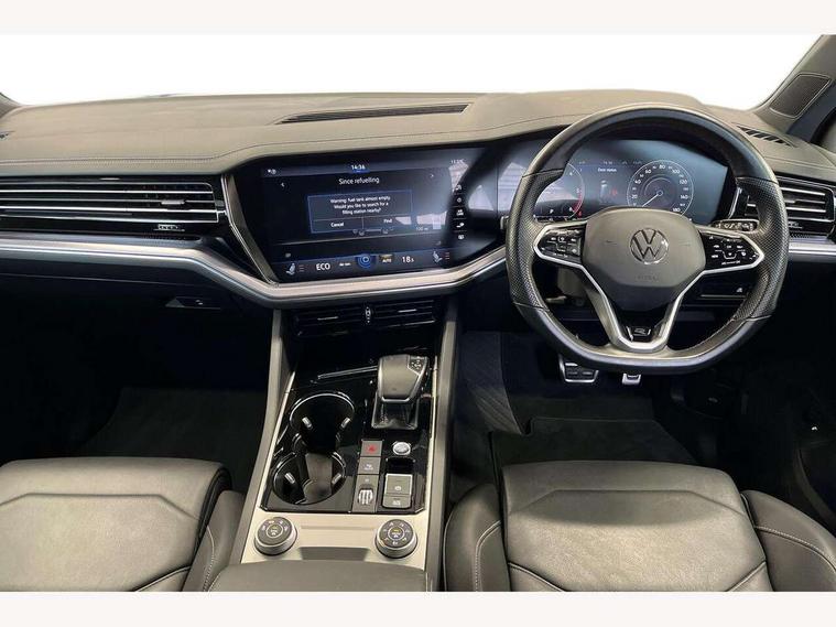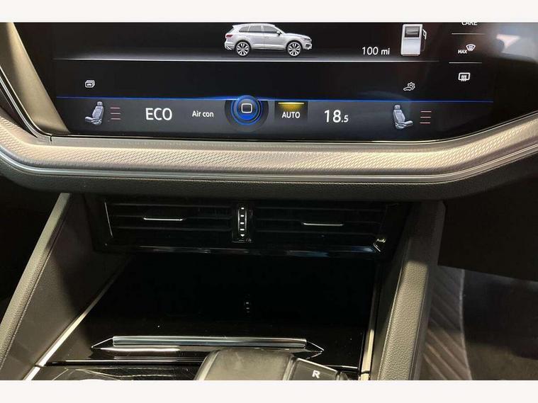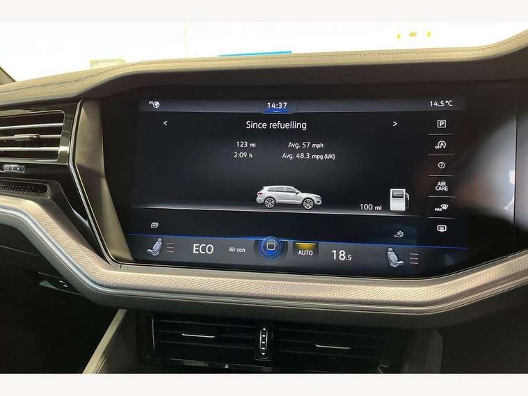 2D/3D map view, ACC - Adaptive cruise control with front assist, forward collision warning, distance monitoring, city emergency brake and speed limiter, Apple car play/Android Auto, Audible and visual fatigue detection system, Bluetooth hands free telephone connection, Car information display, Drive select with Damper control, Driver alert system, Dynamic road sign display camera controlled system with visual warning for traffic and road signs, eCall emergency system, Fully electric tailgate + keyless entry and start, Instrument cluster, MirrorLink, Multifunction camera with lane assist, Multifunction computer premium with 7" colour display, One touch indicators with repeat function, Service interval indicator, Speed sensitive power steering, Start/stop system with regenerative braking, Tailgate power latch, Think blue trainer driver tips and journey analysis, Traffic sign recognition, Voice control system, Wireless Smartphone charger, Torsen limited slip differential, DAB Digital radio, Dynamic navigation based on TMC+, Gesture control for infotainment system, Multi device interface (MDI) with illuminated USB-C connection, Music playback - MP3, WMA and AAC files, SD card slot, Simultaneous pairing of 2 compatible mobile devices, SMS functionality - read, compose and send SMS messages using touch-screen display, Title and cover art display, Volkswagen media control, Adaptive low beam for urban and motorway use, Auto dimming rear view mirror, Automatic coming/leaving home lighting function, Automatic headlights, Black anodised roof rails, Black door mirrors, Black rear diffuser, Black side window surrounds, Black upper and lower grille louvres extending into headlights and radiator grille, Body colour door handles, Body coloured wheel arches, C signature gloss black front air intake, Chromed tailpipe on the left and right integrated in the bumper with trapezoid design, Dusk sensor, Dynamic headlight range control, Electric front tilt/slide panoramic sunroof and fixed rear sunroof, Electrically power adjustable, heated, folding, auto dimming, front passenger exterior door mirror lowering function, Front and rear electric windows, Galvanised body, Gloss black finish B pillar, Gloss black rear diffuser, Headlight washers, Heat insulating darkened glass in side and rear windows, Heated windscreen washer jets, IQ.Light-LED matrix headlight, daytime running light with dynamic cornering light and indicator, LED rear fog light, LED rear number plate lights, Plastic scuff plates in door apertures, Poor weather light, Puddle lights, Rain sensor, Rear wiper, 12V socket in front and rear centre console and boot, 2 Coat hooks on B pillar, 3 rear head restraints, 3 spoke sport heated leather multi-function sports steering wheel with gear shift paddles - generation 2, 4 way adjustable front head restraints, 4 way electric lumbar support for driver and front passenger, 4 zone climate control, 40:20:40 split folding slide/recline rear seat, B pillar vents, Black lower edge of door extending sills, Branded points of interest, Double sun visor for drivier and passenger with LED illuminated vanity mirrors, Electric luggage compartment cover, Folding rear centre armrest with 2 cupholders, Front + rear carpet mats, Front centre armrest with storage box, Gear shift indicator, Height/reach adjust steering wheel, Illuminated air conditioned glovebox, Isofix preparation for 2 rear child seats, Jack and tool kit, Leather trimmed gear knob with gloss black inlay/aluminum trim, Leatherette door trim, LED luggage compartment lighting, Load through provision, Luggage compartment with load lashing rings, Plastic loading edge protection, Rear seat remote release levers, Soul black headlining, Stainless steel pedals, Innovision cockpit pack - Touareg, 3 point front seatbelts with pre-tensioners, ABS, Active bonnet, Automatic post collision braking system, Curtain airbags, Driver/Front Passenger airbags, EBD + Brake Assist, EDL, Electronic parking brake with auto hold, ESC with ASR, Front seat side impact airbags, Hill descent control, Hill start assist, Passenger airbag deactivate switch, Seatbelt warning lamp and buzzer, Three 3 point rear seatbelts, Two tone horn, Volkswagen roadside assistance, Warning triangle and first aid kit, Alarm with interior monitoring in cab, backup horn and towing protection, Child security locks for front and rear doors, Electronic engine immobiliser, Remote central locking, Black decorative trims on the side windows, High gloss black centre console,