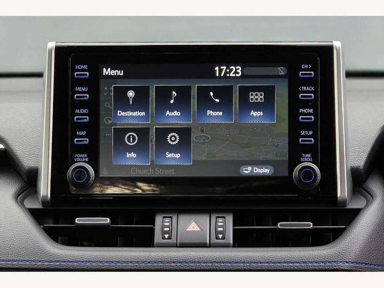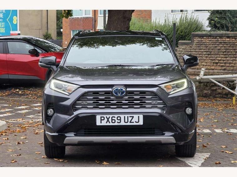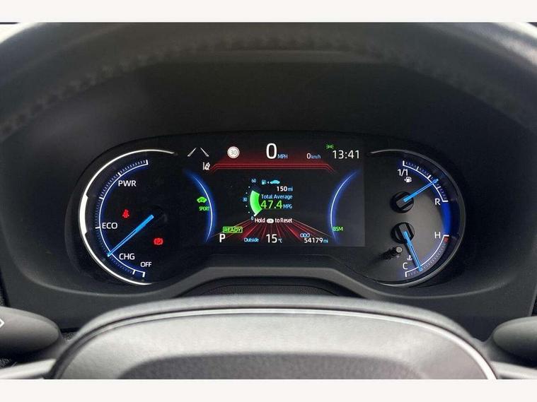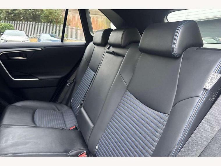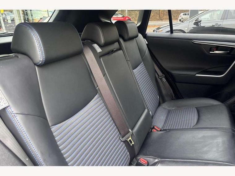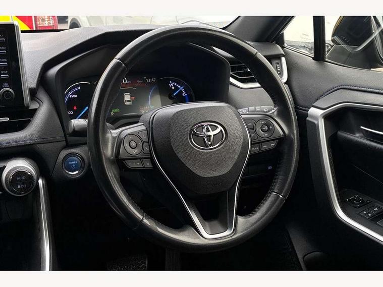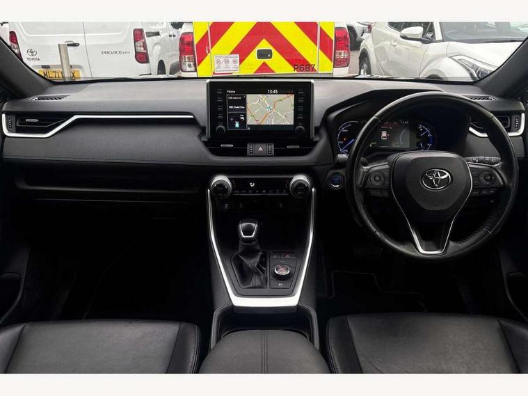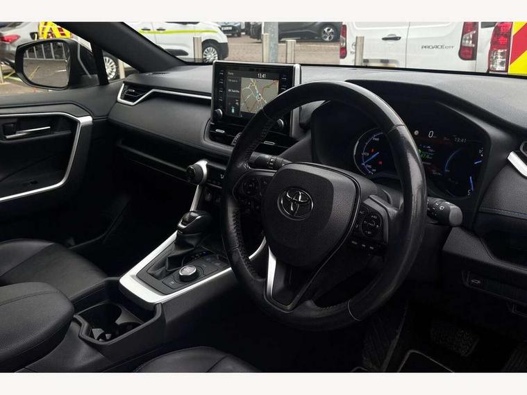 7" colour TFT display, Adaptive cruise control with lane trace assist, Adjustable speed limiter, Blind spot monitoring with rear cross traffic alert, Bluetooth system, Cyclist Detection, Drive mode selector, eCall emergency call system, ECO-driving indicator, Electric power steering, Hybrid system indicator, Lane departure warning system, Lights on warning, Night Time Pedestrian Detection, Pedestrial detection, Power boot opening and closing, Rear parking camera, Rear parking sensors, Remote boot door release in cabin, Tachometer, Touch 2 Go navigation system including 3D maps and voice control, Traffic sign recognition, Trip computer, Voice control system, Vehicle Stability Control (VSC), 6 speakers, 8" Multimedia display touch screen, Auxiliary socket for external MP3 player, DAB audio, Steering wheel mounted audio controls, Toyota touch media system, USB connection, Auto dimming interior mirror, Auto high beam, Automatic headlamp levelling, Automatic headlights, Automatically retractable door mirrors, Bi-tone black roof, Black door mirrors, Black rear spoiler, Black roof rails, Black Shark-fin antenna, Body colour door handles, Body coloured bumpers, Door mirror puddle lights, Electric adjustable door mirrors, Emergency brake-light signal (EBS), Follow me home headlights, Front fog lights, Gloss black front bumper insert, Gloss black rear bumper insert, Headlight cleaners, Heated door mirrors, LED daytime running lights, LED High mounted stop lamp, LED rear lights, Meshed upper front grille, Power front windows, Power rear windows, Privacy glass, Projector LED headlights, Rear screen wiper - intermittent, Rear windscreen defogger, Silver front under-run, Silver rear under-run, Trailer Sway Control, Turning signal integrated indicators in door mirrors, 3 rear headrests, 60/40 split fold rear seat back, Black roof lining, Boot light, Clean air filter, Driver and front passenger personal light, Driver and front passenger Whiplash Injury Lessening seats, Driver and passenger sunvisors with illuminated vanity mirrors, Dual sided deck board in boot, Dual zone automatic air conditioning, Floor mats, Folding rear centre armrest, Front and rear bottle holders, Front centre armrest, Front footwell lights, Front headrests, Front seat and rear pockets, Front sport seats, Front/rear roof mounted assist grips, Heated driver and front passenger seats, Isofix child seat preparation, Leather gear shift with chrome surround, Light blue ambient lighting on front cupholders and open tray, Manual telescopic and tilt 3-spoke leather steering wheel with Chrome insert, Manually reclining and sliding front passenger seat, Pollen filter, Power height-adjustable sliding reclining and lumbar support for driver seat, Rear coat hooks, Rear door armrests, Rear passenger air vents, Reclining rear seats, Satin chrome interior door handles, Sunglasses holder, Synthetic leather upholstery, Parking pack - Rav4, 3x3 point rear seatbelts, ABS/EBD, Adjustable front driver and passenger seat belt extender, Brake assist function, Child proof door locks, Collision mitigation braking system, Driver/Front Passenger airbags, Driver/front passenger side airbags, Drivers knee airbag, Electronic parking brake, Electronic Stability Programme (ESP), Emergency brake light system (EBS), Front and rear curtain airbags, Front and rear seatbelt reminder, Hill start assist, Passenger airbag cut-off device, Seatbelt pretensioners with load limiters, Traction control, Tyre pressure warning, Alarm/immobiliser, Glass-breaking alarm sensors, Light - on and Key in reminder, Remote central locking, Smart entry + Smart start, Speed sensitive auto door locking, Tilt detection sensors, Piano black centre console with silver insert, Soft-touch black lower dashboard, Soft-touch black upper dashboard with silver insert, Full size spare wheel,