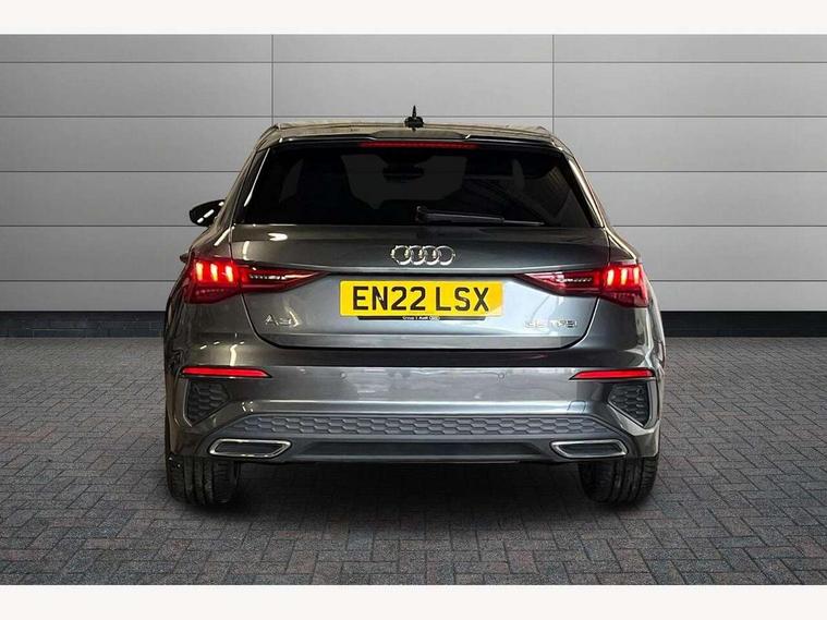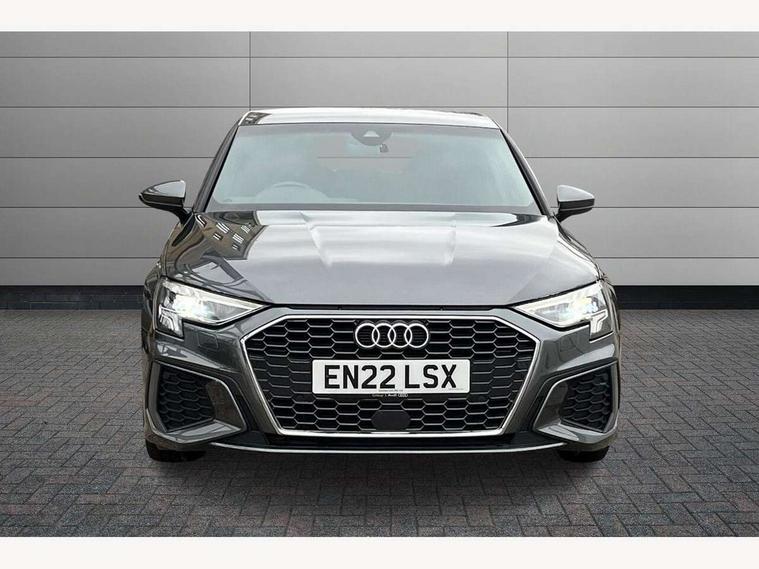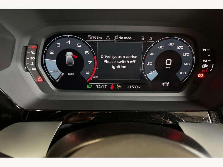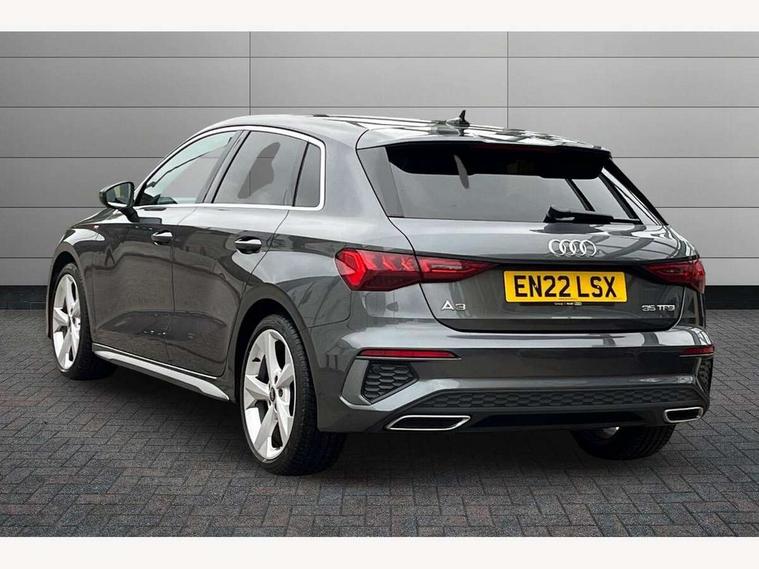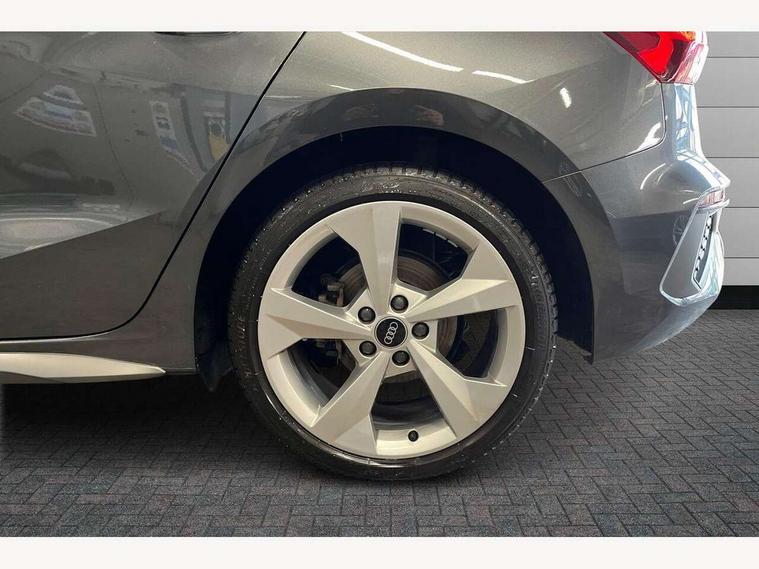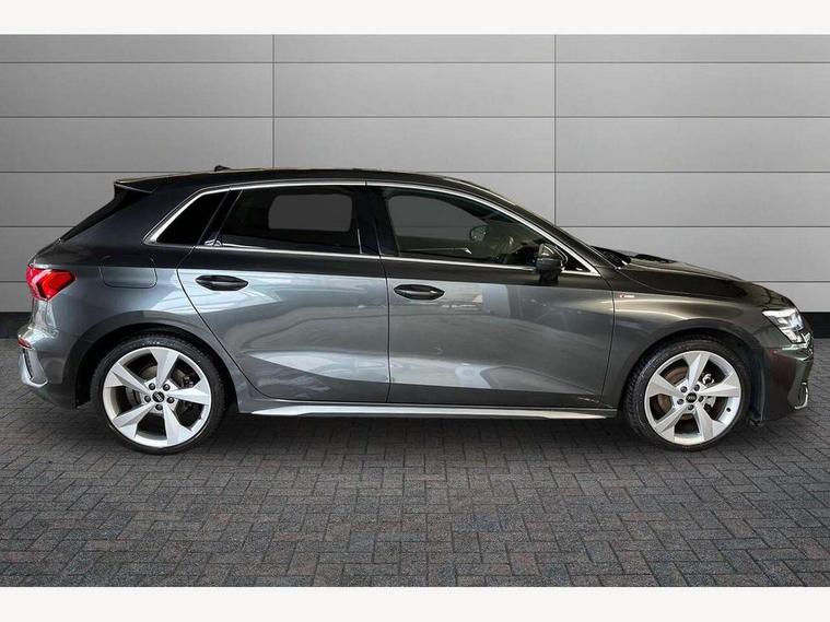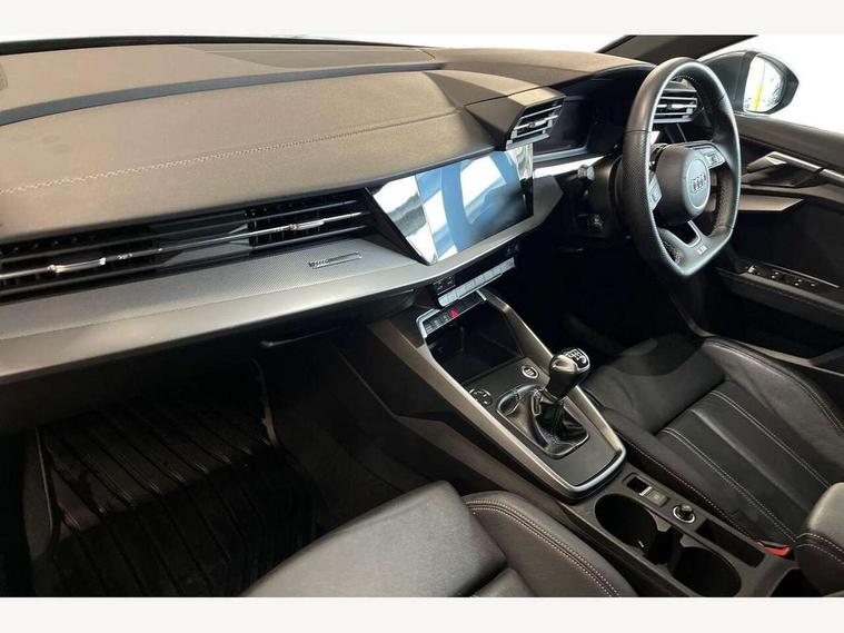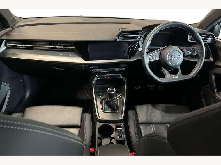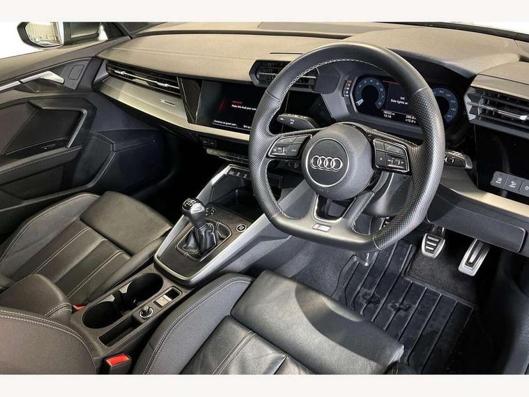 Audi drive select (Auto, Comfort, Dynamic, Efficiency and Individual), Audi smartphone interface, Audi Virtual Cockpit - 10.25" digital and colour instrument cluster, Automatic start/stop system with recuperation, Bluetooth interface, Collision avoidance assistant, Cruise control, e-Call (emergency call), Electromechanical power speed sensitive steering, Lane departure warning system, MMI Navigation Plus with high resolution 10.1" colour touch screen display, Rear parking sensors, Service indicator, Trip computer, Voice control system with natural language interaction, 2xUSB-C connection with data and charging functions, 6 passive loudspeakers, DAB Digital radio, 3rd brake light, Acoustic glass windscreen, Aluminium window trim, Auto dimming frameless rear view mirror, Electrically adjustable/heated/folding/auto dimming door mirrors with integrated LED indications + kerb view function for passenger side, Front electric windows, Illuminated aluminium inserts front door sills with S logo, LED daytime running lights, LED headlights with LED rear lights and dynamic rear indicators, Light and rain sensors, Privacy glass - dark tinted rear window, rear door and side windows, Rear electric windows, Rear side air outlets in grained matt black, Rear side wing doors, Rear wiper, S line bumpers, S roof spoiler, 12V socket and storage compartment in front centre console, 3 seat bench in 2nd row, 40/20/40 split folding rear seat bench with cupholder, Black cloth headlining, Dual zone electronic climate control, Front and rear centre armrest in leather, Front and rear headrests, Front/rear floor mats, Height and reach adjustable steering wheel, Illuminated vanity mirror, Interior lighting - glove compartment light and right hand side, Luggage compartment floor covering, Manual boot compartment lid, Manually adjustable front seats, Seat side bolsters, Single front passenger seat, Stainless steel pedals and front footrest in black, Twin leather upholstery with front sports seats S embossed logo, Aluminium interior elements pack - A3 Sportback, S line styling pack - A3 Sportback, 3x3 point rear seat belts, Audi pre sense front, Driver and front passenger airbag with passenger airbag deactivation, Electronic Stabilisation Control (ESC) including ABS, ASR and EDL, First aid kit with warning triangle and 2 safety vests, Front side airbags with head airbags and interaction airbag, Pre-sense front with pedestrian and cyclist detection, Seatbelt monitoring, Tyre pressure loss indicator, Anti theft alarm, Anti-theft wheel bolts, Immobiliser, Manual child locks, Remote control central locking, Accent surfaces in the dashboard and centre console in platinum grey silk effect paint finish, Dark spectrum aluminium inlays,