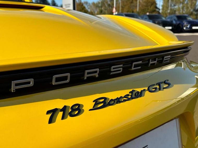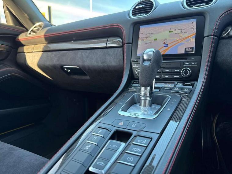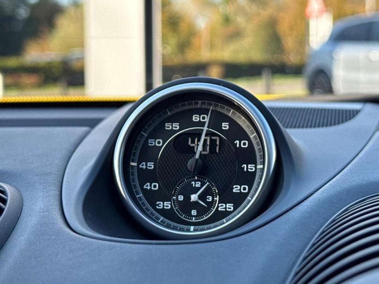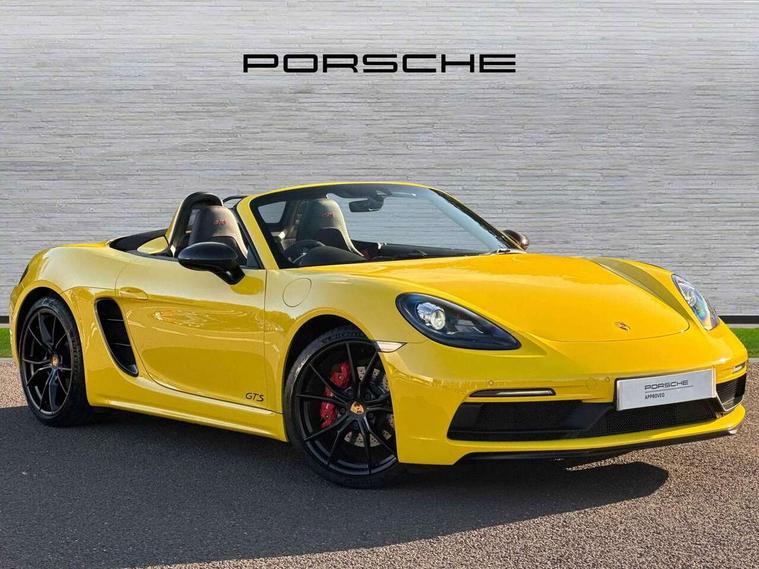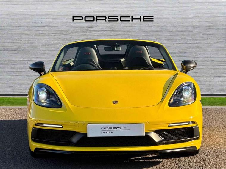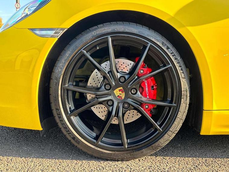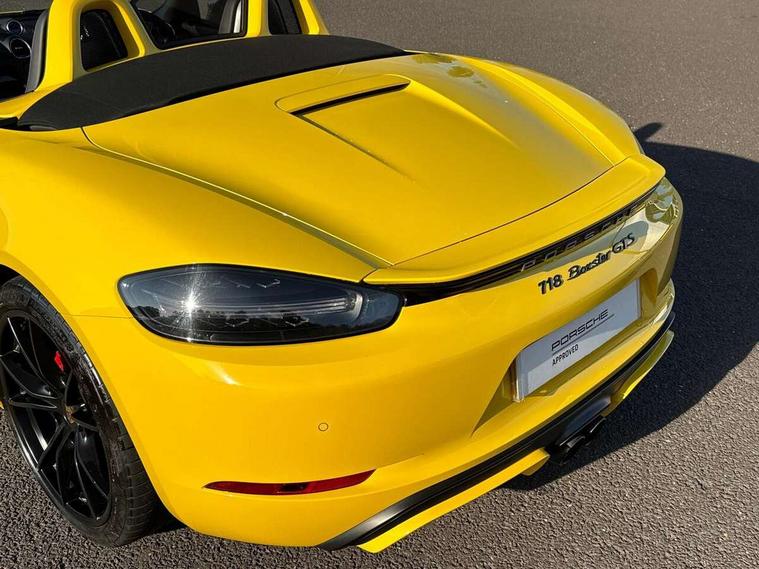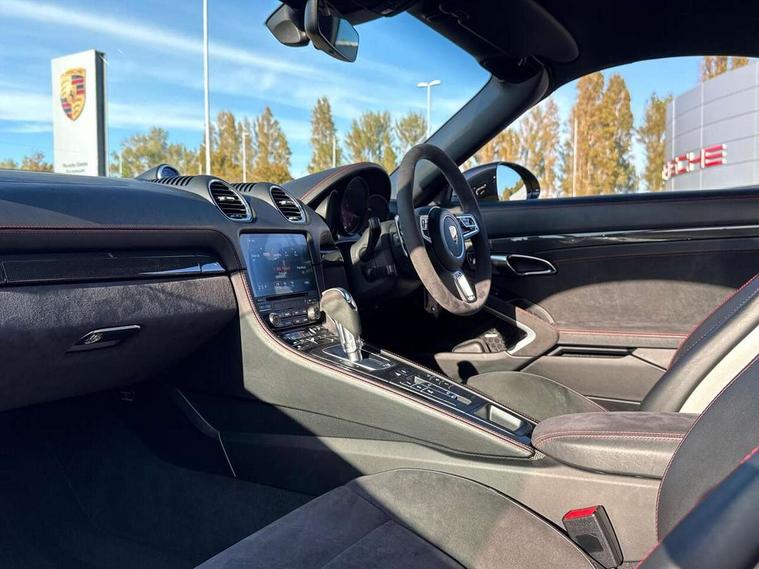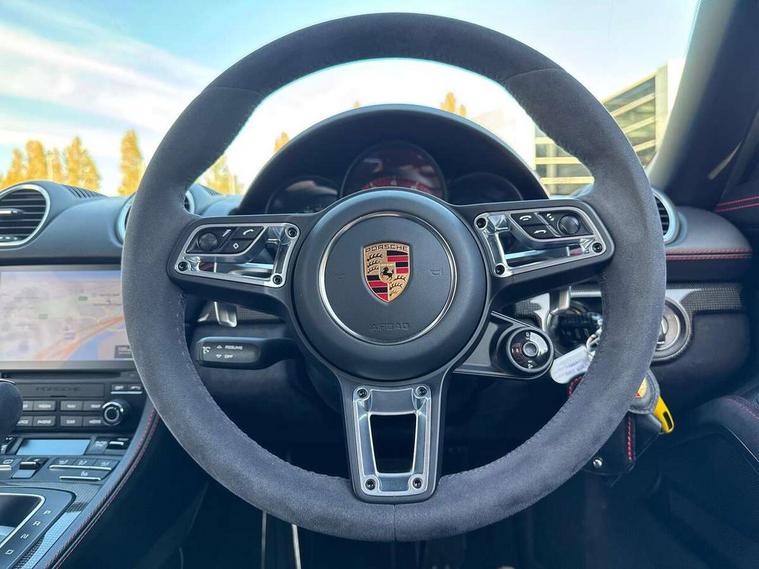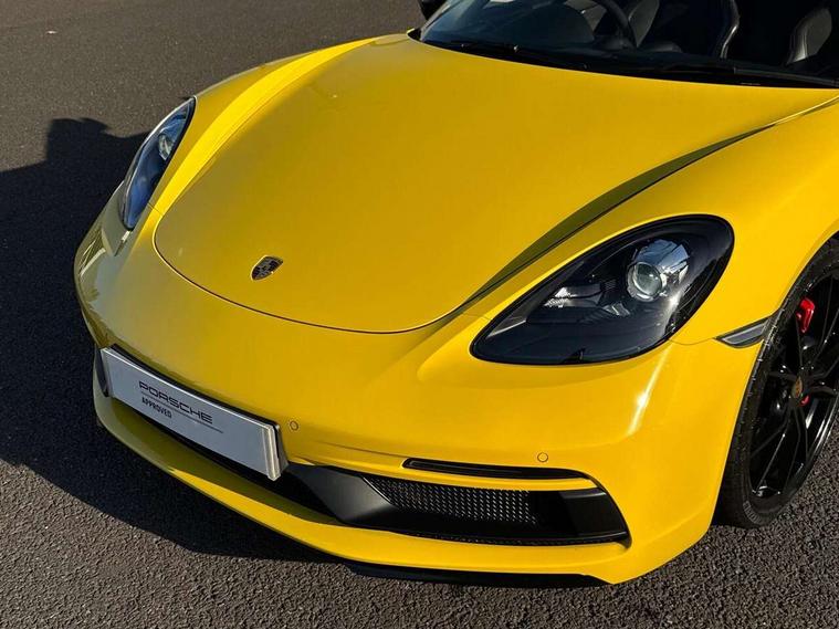 Black rev counter, Multi function display, On board computer, PCM navigation module, PCM voice control, Porsche communications management, Porsche Connect Plus, Sports button, Telephone module for PCM, 64 litre fuel tank, Porsche Active Suspension Management (PASM), Porsche stability management (PSM), Porsche TORQUE Vectoring (PTV), Connect Plus with Apple CarPlay, wireless internet access, Carfinder, Remote Vehicle Status and Remote Services, DAB Digital radio, 2 speed front wipers + intermittent wipe, Automatic headlights, Automatically extending rear boot spoiler, Black model designation on doors, Body colour bumpers, Coming home function, Door entry guards with logo, Electric heated rear glass window, Electric windows one touch open/close, Electrically operated hood with heated rear window, Green tinted glass, LED daytime running lights, LED rear lights, Painted Porsche logo and model designation, Painted rear apron, Sports exhaust system including sports tailpipes in black, Top tinted windscreen, Water repellent side windows, Wind deflector, Windscreen with grey top tint, 12V sockets in front centre console and passenger footwell, 2 cupholders, Active carbon filter, Air recirculation system, Clothes hooks on front seat backrests, Defrost switch, Door panel armrests and centre console main storage compartment lid in smooth finish leather, Electrically adjustable backrest, Footwell illumination, Front and rear luggage compartments, Front centre console storage box, Glovebox illumination, GT alcantara sports steering wheel and PDK gear selector, Height/reach adjust steering wheel, Ignition Lock illumination, Illumination of luggage compartment, Interior orientation lighting, Interior roof lining, LED reading lights, Lockable glovebox, Steering wheel, gear lever and door pulls in smooth finish leather, Storage compartments in doors, Sport Chrono Pack - Boxster (PDK), 3 point automatic seatbelts, ABS+ABD, ASR, Driver and passenger airbags, Electronic parking brake, Front seatbelt pretensioners + load limiters, Head airbags, Passenger airbag deactivate switch, POSIP, Red painted brake calipers, Side (thorax) airbags, Tyre pressure monitoring system, Alarm, Porsche vehicle tracking system (VTS), Remote control central locking, Transponder engine immobiliser, Tyre repair kit, including sealant foam,