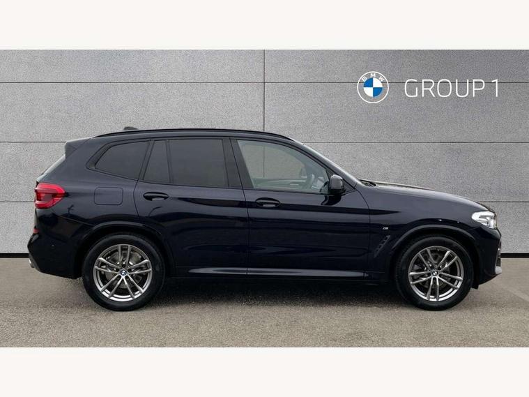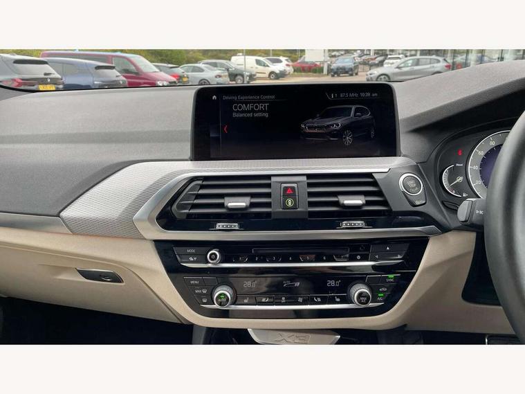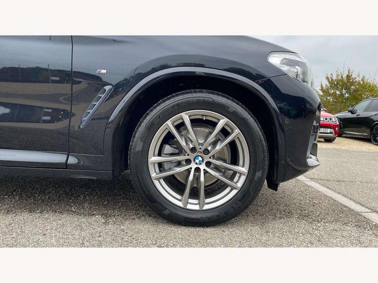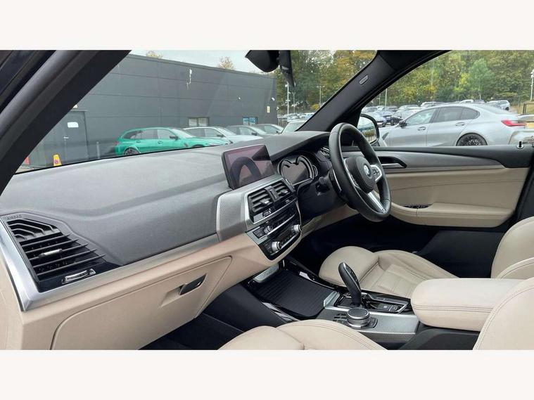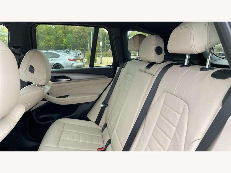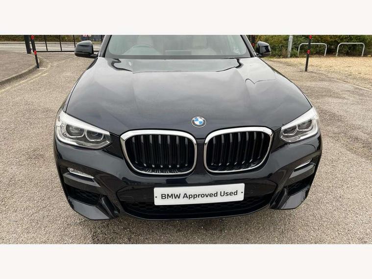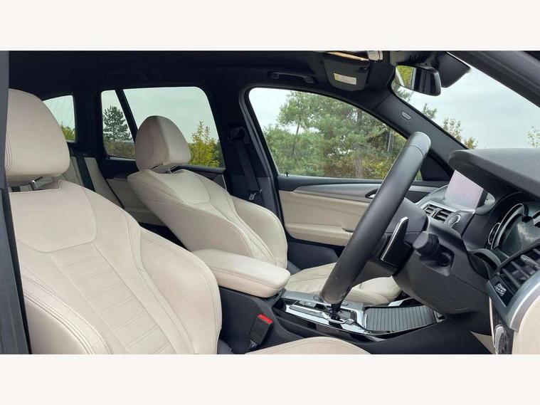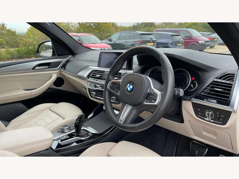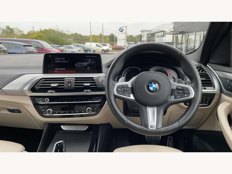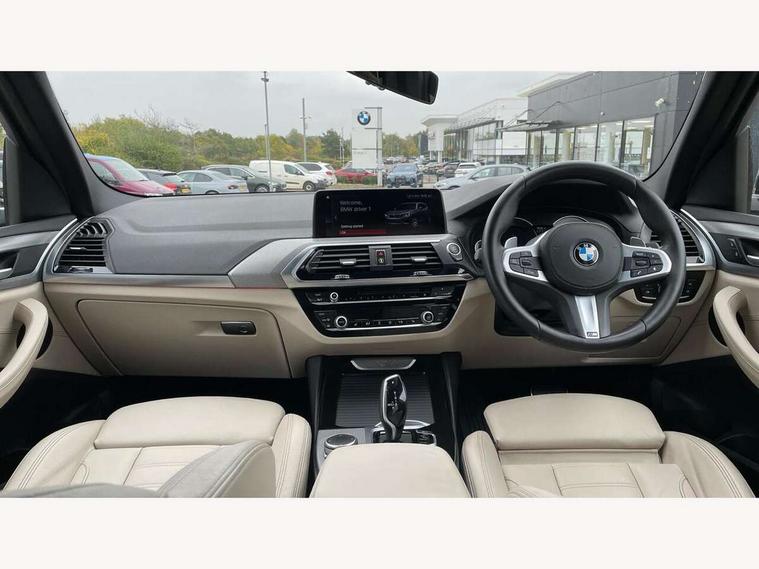 Active Guard incl speed limiting and lane departure functions with auto steering, and front collision warning with brake intervention, Attentiveness assist, Automatic tailgate operation, BMW Live Cockpit Professional sat nav system including 10.25" high resolution display and Intelligent Voice Assistant, BMW Online services, BMW Teleservices, Brake pad wear indicator in front and rear, Check Control warning system for monitoring of lights and door/luggage compartment open warning, Control display - 6.5" colour display screen, Electric Power Steering (EPS) with Servotronic, Front/rear Parking distance control, iDrive Controller with 8 favourite buttons, Lights on warning by audio warning signal when ignition is switched off, Navigation system - BMW Professional multimedia with Hard disc drive (HDD) and 10.25" touch display, Oil sensor for level and grade, warning by check control system, On board computer - average speed+fuel consumption, service interval, clock/date, odometer/trip meter, outside temperature display and ice warning, Optimum shift indicator, Personal Profile - automatic lock when driving away selectable, Real time traffic information, Semi digital instrument cluster, Stop/start system, Automatic transmission with gearshift paddles, Diesel particulate filter, Incorrect fuelling protection, Larger capacity fuel tank, Multi-link rear suspension, Performance Control, Auxiliary socket for external MP3 player, BMW professional radio/CD/MP3, DAB Digital radio, Acoustic glazing, Black finish on B pillars, Body colour door handles, Body colour electric adjust heated aspherical door mirrors, Body colour roof mouldings, Body coloured bumpers, Chrome kidney grille with high gloss black vertical slats, Direction indicator, side repeaters, integrated in exterior mirrors, Dual chrome exhaust, Dynamic brake lights, Exterior mirrors - electrically folding with anti-dazzle, Fingertip control / anti-trap function on electric window, Follow me home headlights, Front and rear bumper system with replaceable deformation elements, Front and rear electric windows, Green tinted heat insulating glass, Heated windscreen washer jets, Height adjustable headlamps, High gloss black door sill finishers, High gloss black shadow line roof rails, High gloss shadowline exterior trim in decorative moulding side frame/recess cover/guide rail/B, C pillars/mirror frame and triangle with mirror base, High level 3rd brake light incorporating LED Technology, Interior rear view electrochromatic mirror with automatic anti dazzle function, LED front fog lights, LED tail lights, Lightweight engineering, M aerodynamic bodystyling, Model designation, Rain sensor including auto headlights activation, Rear wiper, Shark fin antenna, Visible VIN plate, Welcome lighting, Windscreen wipers with adjustable interval, 12V socket in centre console and luggage area, 3 rear headrests, 3 zone automatic air conditioning, 4 lashing points to secure luggage, Ambient lighting, Anthracite headlining, Anthracite Velour floor mats, Driver/passenger sunvisors with ticket holders + illuminated vanity mirrors, Foldable boot floor with storage compartment, Four grab handles integrated in roof lining, Front and rear bottle holders integrated into door trim storage compartments, Front and rear side armrests integrated into door trim, Front centre armrest with storage compartment, Front footwell lights, Front sports seats, Front/rear courtesy lights with soft on/off dimming, Front/rear reading lights, Height adjustable front/rear head restraints, Isofix rear child seat preparation, Leather gear knob, Luggage area underfloor compartment, Luggage compartment lighting, M Sport multifunction leather steering wheel, Parcel shelf removeable and storable under boot floor, Reach and rake adjustable steering column, Rear centre armrest with 2 cupholders, Rear seat centre armrest with two cupholders, Removable / retractable luggage cover, Slope adjustable rear seats, Storage compartment in rear centre console and front/rear door trims, Through loading system with 40/20/40 split folding rear seat, Toolkit located in luggage compartment, Two front cupholders with removable oddments tray/lid, Vernasca leather upholstery, Connected pack professional - X3, ABS/EBD, ADB - Automatic Differential Brake, Automatic Stability Control (ASC), Battery safety cut-off, BMW emergency call, Brake assist, Brake assist function, Brake drying, Brake energy regeneration, Braking pre-tensioning, Child locks on rear doors, Cornering brake control (CBC), Crash Sensor - activation of central locking release, hazard warning light and interior lighting, Deactivation of fuel pump in the event of a crash, Driver and front passenger front and side airbags with passenger deactivation and ITS front and rear head airbags, DSC+, Dynamic brake control, Dynamic Traction Control - DTC, Electromechanical parking brake, Front seat belts warning, Hill descent control, Hill start assist, Seatbelt security check for front seats, Side impact protection, Three point seatbelts to all seats with front and outer rear pyrotechnic belt tensioners and seat belt force limiters, Two tone horn, Tyre pressure monitoring system, Ventilated front and rear disc brakes, Warning triangle and first aid kit, Central locking switch for all doors, fuel filler cap and luggage compartment, Electronic engine immobiliser, Locking wheel nuts, Remote control including two integrated key - one button for open/close all lockable content, windows and separate button for open luggage compartment, Remote control Thatcham category 1 alarm, Start/stop button with Comfort Go keyless engine start and auto Start/stop deactivation button, Low rolling resistance tyres,