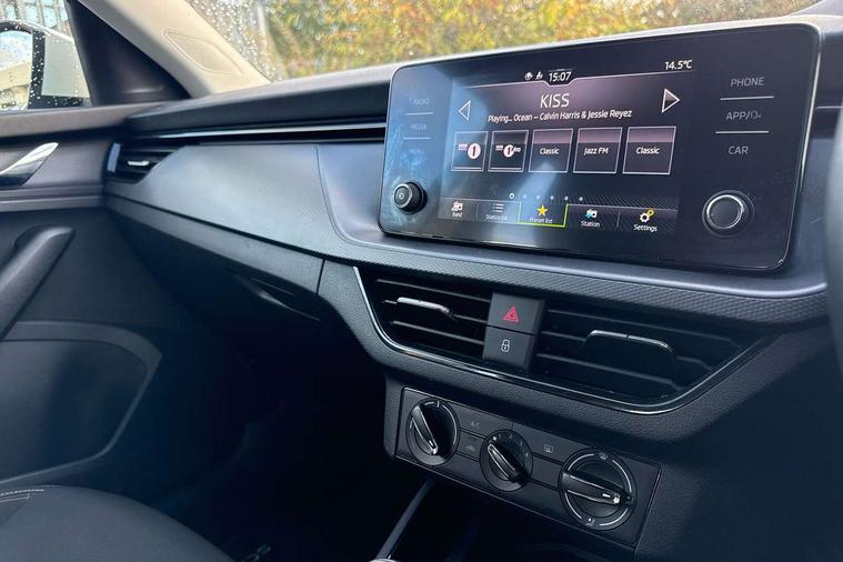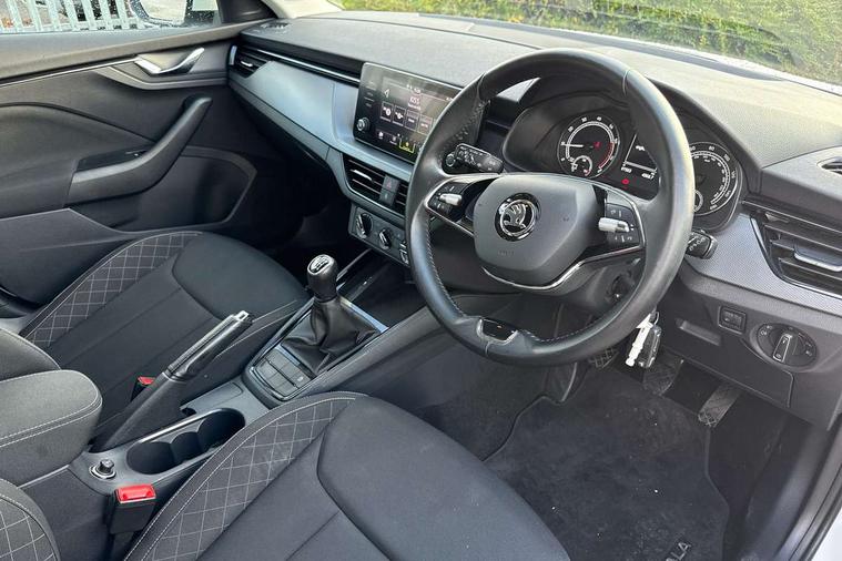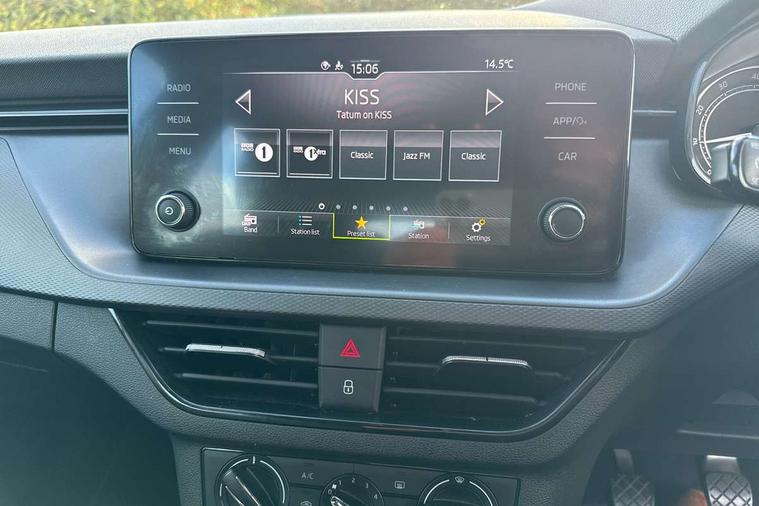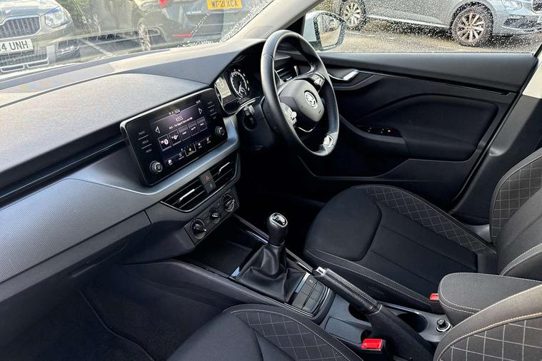 Temporary space saver wheel, Alarm, Anti-theft wheel bolts, Remote central locking with 2 remote folding keys, SAFE function for remote central locking, 2 USB - C ports, 8 loudspeakers, Bolero radio with 8" touchscreen display, DAB Digital radio, 3x3 point rear seatbelts, Curtain airbags, Emergency call and proactive services, Front head and side airbags, Hill hold control, One tone horn, Passenger airbag switch off function, Seat belt reminder for all seats, Automatic headlamp activation with Coming home and Leaving home feature, Body colour door mirrors and handles, Chrome grille surround, Electrically adjustable and heated door mirrors, Front and rear electric windows, Tinted windows, 12V Accessory socket in centre console, Chrome inner door handles, Cloth upholstery, Decor strip on dashboard and door panel, Front head restraints, Glasses storage in roof liner, Height adjustable passenger seat, Instrument cluster with chrome painted decor ring, ISOFIX for rear passenger seat, Leather gearknob and handbrake lever, Manual lumbar support for front seats, Reading lights for driver and front passenger, Sun visor with make up mirror for front passenger, Third rear headrest, Umbrella, Bluetooth system, Easy light assist, Front assist system, PAS, Rain and light assist with auto dimming rear view mirror, Speed limiter,