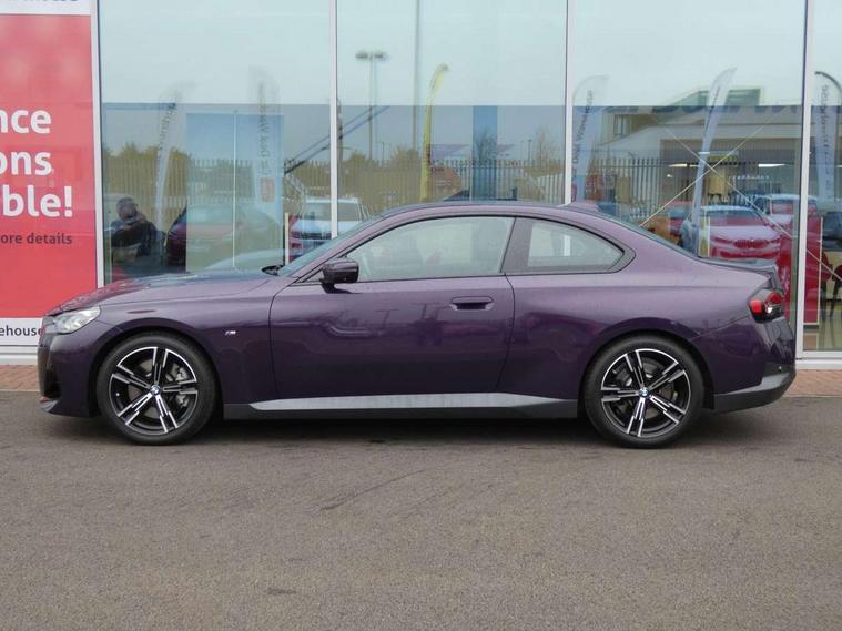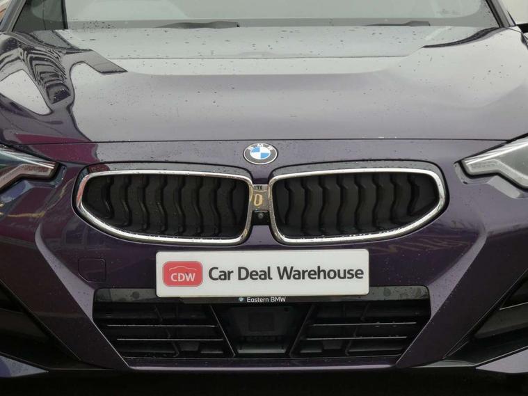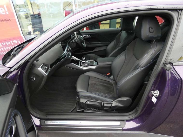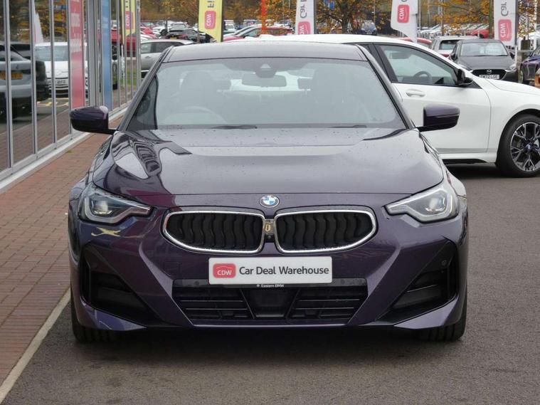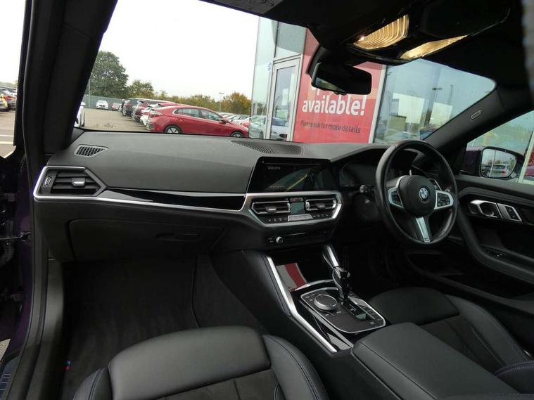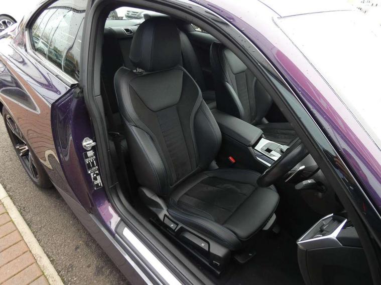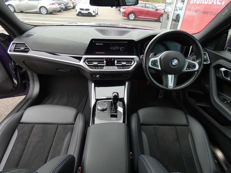 Attentiveness assist, Auto start-stop, Bluetooth, BMW ConnectedDrive online services, BMW Teleservices, Check Control warning system for monitoring of lights and door/luggage compartment open warning, Direct selection buttons, Drive off assistant, Eco pro mode, Electric power steering, Front/rear Parking distance control, iDrive controller with turn and press function, Integrated owners handbook, Intelligent functions, Live cockpit plus with nav function 12.3" instrument cluster and 14.9" centre display, Oil sensor for level and grade, Optimum shift indicator, Personal Profile, Touch operation on control display, Variable sport steering, Widescreen multi-media display, Aluminium lightweight construction, Balancer shaft, BMW TwinPower Turbo four-cylinder petrol engine, Double VANOS, Drive performance control with ECO PRO comfort + sport mode, Electronic differential lock, High precision injection, M sport suspension, Petrol Particulate Filter, Sport automatic steptronic transmission with gearshift paddles, manual gearshift time display, launch control, coasting idle ECO PRO/COMFORT modes, Twin scroll turbocharger with Valvetronic, DAB tuner, Acoustic windscreen wipers for reduced driving noise, Adaptive LED Headlights, Automatic windscreen wipers and automatic headlight, Automatically dimming rear view mirror, Body colour door handles flush with door surface, Body colour door mirrors, Body colour front and rear bumpers, Daytime running lights, Electric windows - front and rear, with open/close fingertip control and trap release, Exhaust tailpipes x2 - 90mm in left and right, Fading support, Front and rear bumper system with replaceable deformation elements, Front door sill finishers in black plastic with BMW designation, Front windscreen wipers with integrated washer jets, Green tinted heat protection glazing, High beam assistant, High gloss shadowline exterior trim in mirror triangle cover, mirror cover panel, mirror bezel and window border, High level third brake light, Indicators integrated int mirror housing, LED registration plate light, LED technology rear tail lights, brake lights and turn indicators, Lightweight engineering, Model designation on right side of tailgate, One piece kidney grille with hight gloss chrome surround, Rear boot, Rear fog lights, Reversing light in rear light cluster, Shark fin antenna, Single part LED rear lights with smoked glass components, Trailer stabilisation logic, Visible VIN plate, 12V power socket in front centre console with blanking plug, 2 cupholders in front centre console, 3 zone automatic air conditioning, Ambient lighting, Compartment in front of cupholder, Conditioned based service, Driver seat backrest width adjustment, Front and rear side armrests integrated into door trim, Front armrest, Front door pockets, Front head restraints, Front sport seats, Heated front seats, Illuminated glove compartment with separate small compartment, M headliner Anthracite, M sport leather steering wheel, Manually adjustment steering wheel column, Rear seat backrest with manual 40:20:40 split folding, Rear seat centre foldable armrest with integrated cup holder, Single front passenger seat, Storage compartment between rear seats, Storage tray and compartment with cover in centre console, Sun visors with vanity mirrors and insert tab, Through loading system with 40/20/40 split folding 2 rear seat in 2nd row, Two folding rear seat headrests, Velour floor mats, Additional storage compartment pack without USB - 2 Series Coupe, Connected pack professional - 2 Series Coupe, Interior and exterior mirror pack - 2 Series Coupe, M Sport exterior styling aerodynamics pack - 2 Series Coupe, 2 tone horn, Anti lock braking system (ABS) with cornering brake control, Automatic Stability Control (ASC), BMW emergency call, Brake drying, Child seat ISOFIX attachment for the two outer rear seats, Crash sensor activating of airbags, Unlocking doors, hazard warning lights, interior light, safety battery terminal, Deactivation of fuel pump in the event of a crash, Driver and front passenger airbags, Driver and front passenger side airbags, integrated in the door side seat backrest bolsters for all seat variants, Dynamic brake control, Dynamic stability control + (DSC+), Dynamic Traction Control - DTC, Electrically operated hand brake including automatic hold function and automatic release when driving off, Front and rear disc brakes, Front passenger airbag deactivation, Head airbags for all 4 outer seats, Manual deactivation of front passenger airbag, Seat belt security check for driver and front passenger, Seatbelt warning, Side impact protection, Three point seat belts on 4 seats including front belt stopper, pyrotechnic belt tensioners and belt force limiters, Tyre pressure sensor, Warning triangle and first aid kit, Alarm system (Thatcham 1) with remote control and electronic engine immobiliser, Central locking switch for all doors, fuel filler cap and luggage compartment, Deadlocking function system to all doors, Drive away locking system on all doors and luggage compartment, Locking wheel bolts, Start/Stop button (illuminated) in centre console with keyless engine start and Auto Start-Stop deactivation button, Two remote control key with integrated key - one button for open and close doors/fuel flap/tailgate and separate button for unlock luggage compartment, BMW mobility tyre sealing system, Electrically powered 12V compressor, Reduced rolling resistance tyres,