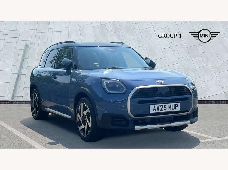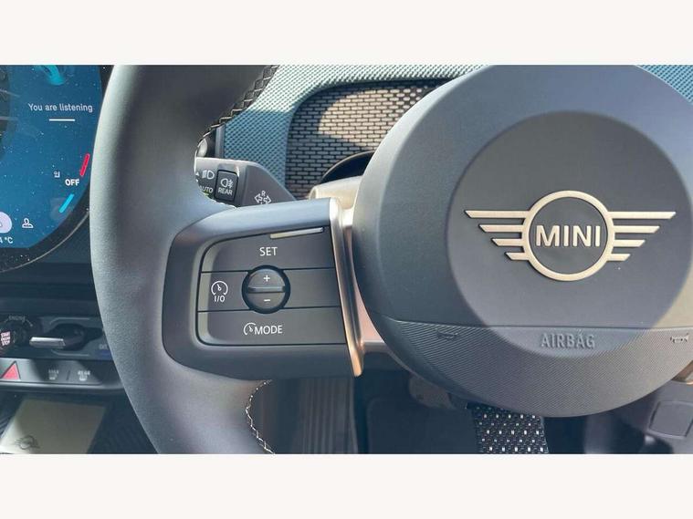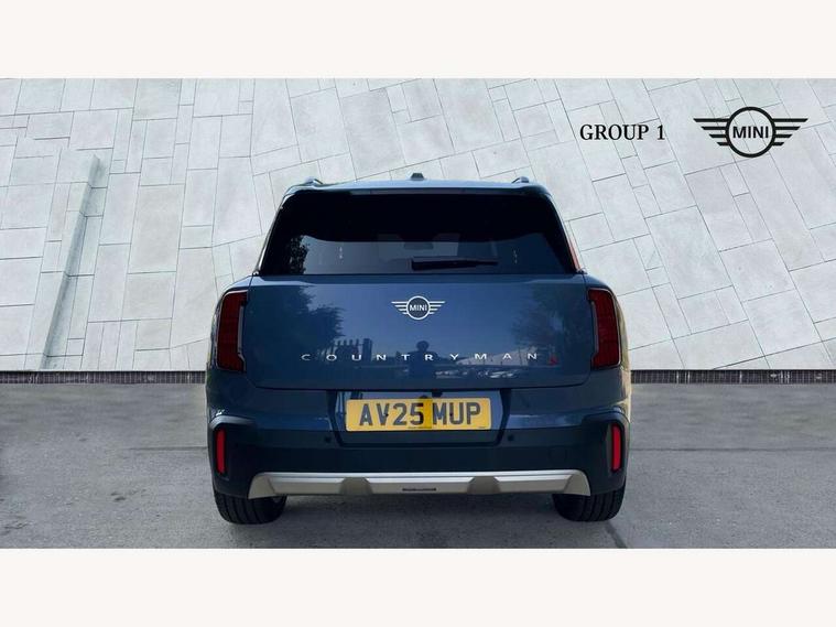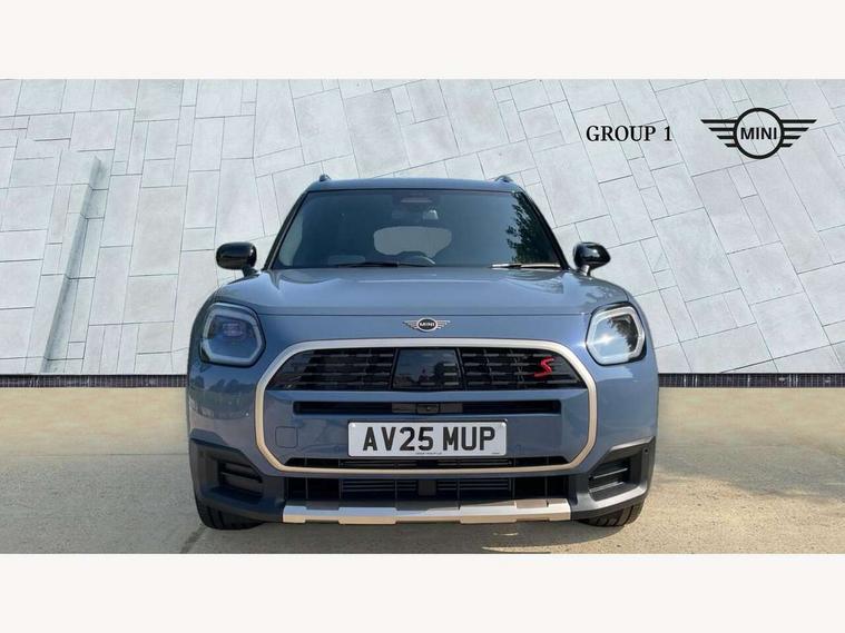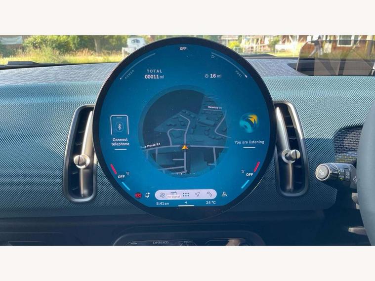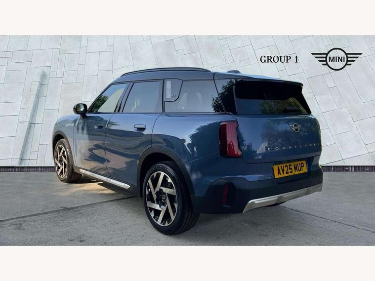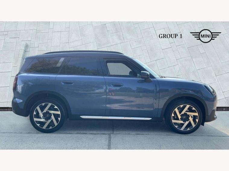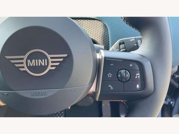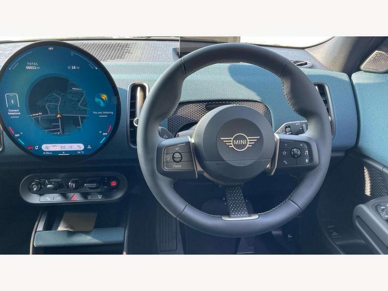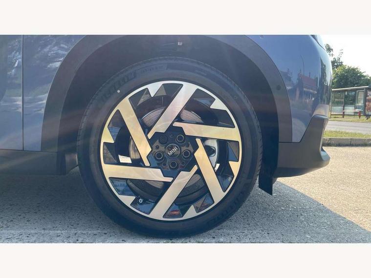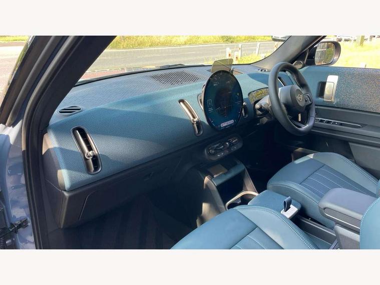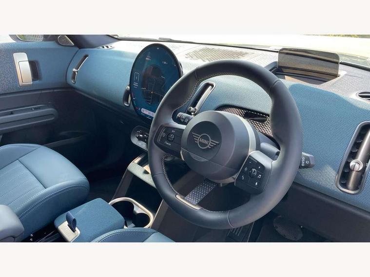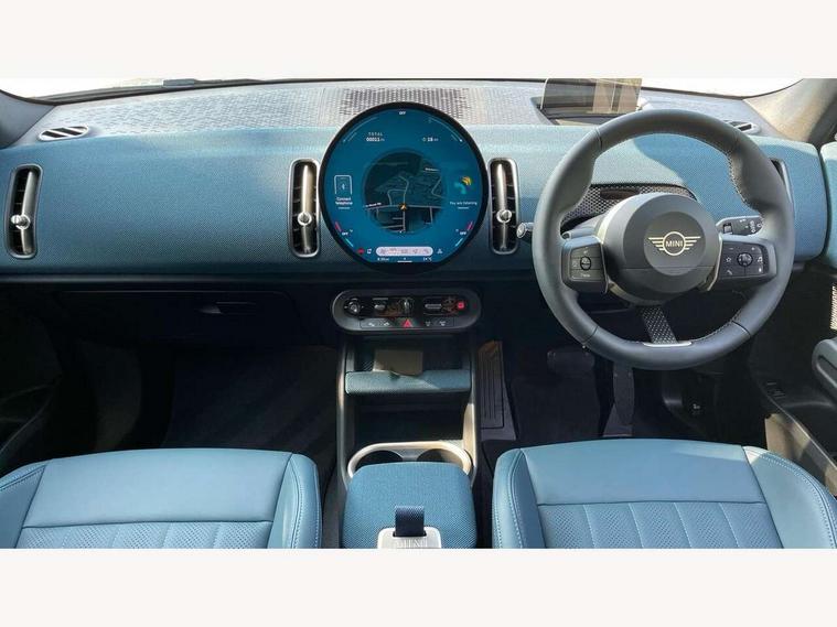 Bluetooth connection, Circular OLED Screen, Compatible mobile phone bluetooth with audio streaming, Cruise Control (DCC), Digital dashboard display, Driving assistant, Driving Assistant Plus Preparation, E-call, Electro-mechanical speed dependant steering assistance, MINI Experience Modes, MINI Head up display, Mini navigation system, MINI TeleServices, Parking assistant in camera and ultrasound based assistance system, rear view camera, parking aid and distance control, Auto transmission with Paddles, Larger capacity fuel tank, 6 speakers, DAB Digital radio, Personal eSim, Auto tailgate, Electric adjustable heated door mirrors, Front and rear electric windows, Heated rear window, High beam assistant, Interior rear-view mirror with automatic anti-dazzle function, LED daytime running lights, LED headlights with extended contents including Adaptable light signatures, LED rear lights, LED third brake light, Logos in Vibrant Silver, Rain sensor with auto headlights, Rear side wing doors, Rear window wiper, Roof rails, Vibrant silver grille surround, 3 Seat sliding rear bench in 2nd row, 60/40 split rear bench seat, Anthracite headliner, Auto air conditioning, Driver and front passenger seat heating, Floor mats, Front armrest, Front headrests, Front sport seats, Heated steering wheel, Height and length steering column adjustment, Lidded storage box in Petrol knit, Luggage compartment separating net, Rear headrests, Seat adjustment for rear seats, Single front passenger seat, Sport Vescin Steering Wheel, Sunvisors with vanity mirrors, Vescin synthetic leather upholstery, Vibrant Silver sill inlay, Wireless charging tray, Interior and exterior mirror package - Mini Countryman, 3x3 point rear seat belts, 6 Airbags - front, side, head and seat belt tensioners, ABS, DSC - Dynamic Stability Control, Electronic handbrake, Electronic Stability Programme (ESP), Front ISOFIX (iSize), Hill descent control, Hill hold assist, Hill start assist, Manual rear child locks, Traction control, Tyre pressure monitoring system, Warning triangle, Alarm system with tilt sensor, monitoring doors, bonnet interior and tailgate, Auto drive away locking, Comfort access system, Deadlocking function, Electronic vehicle immobiliser, Locking wheel bolts, Remote control locking, Start/stop toggle with keyless go, Petrol/Brown dashboard knit, MINI Mobility Kit,