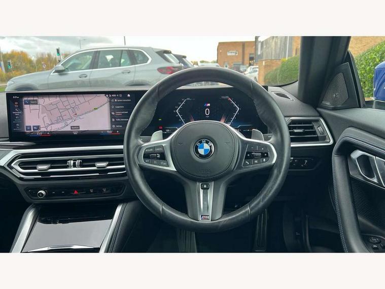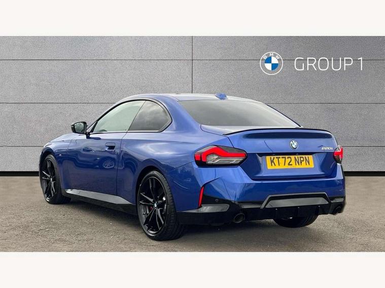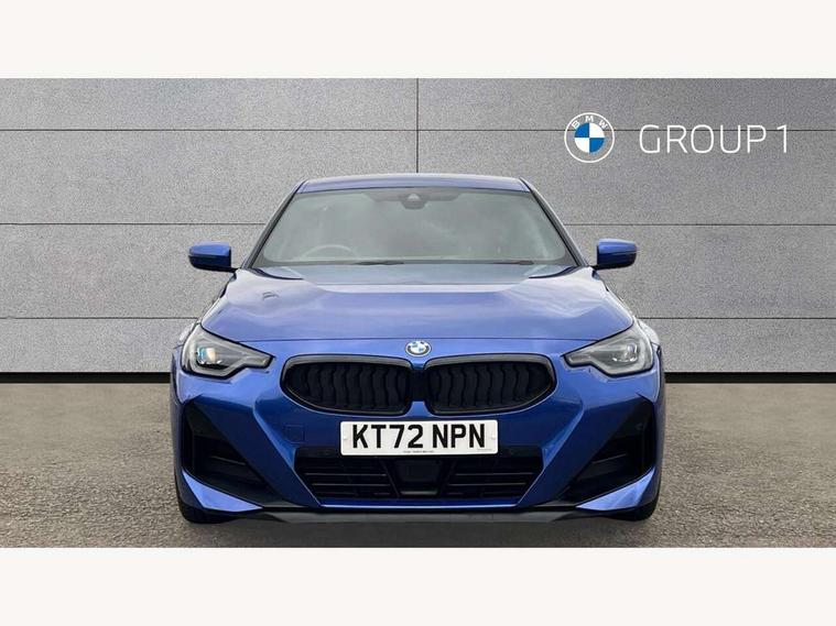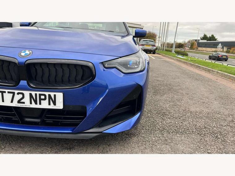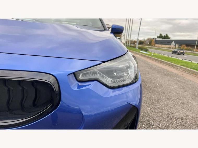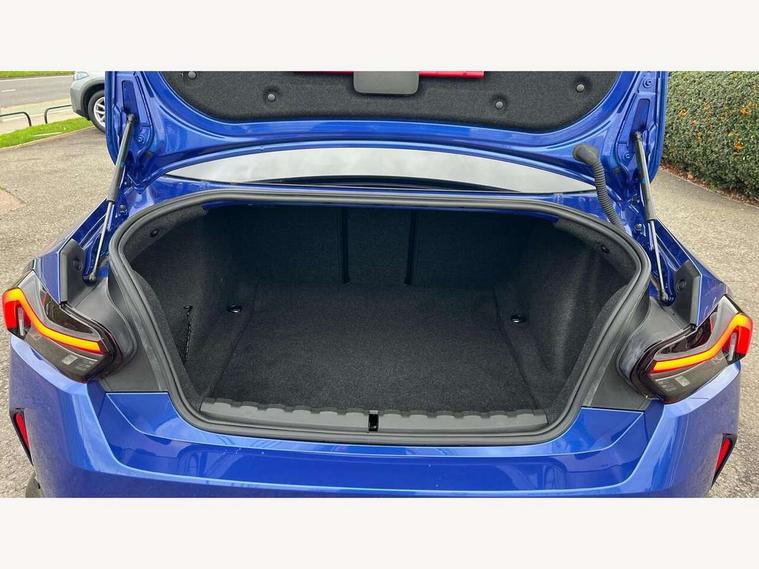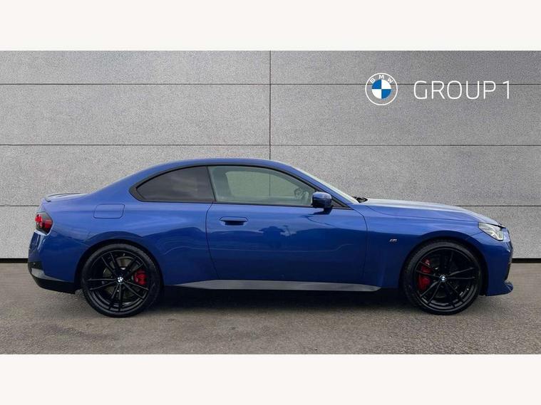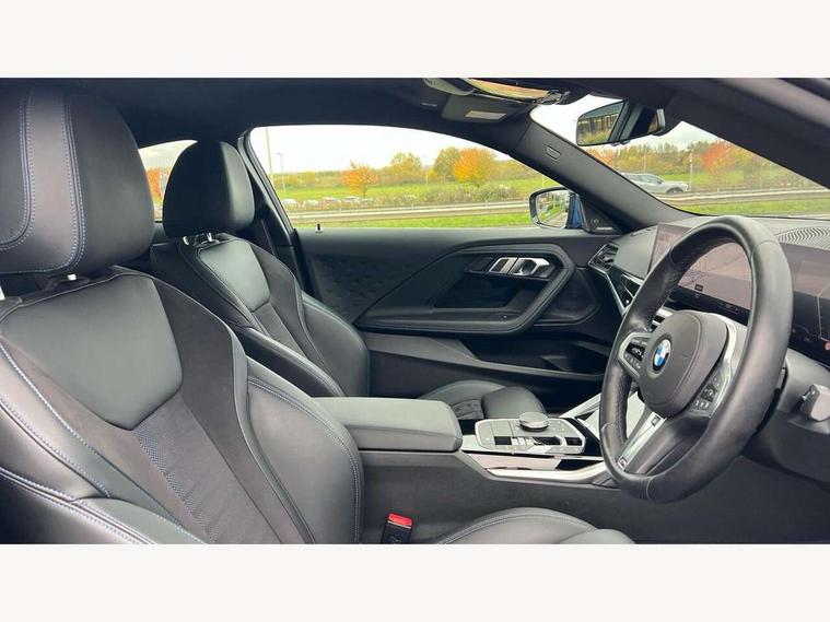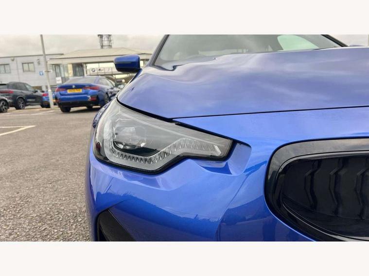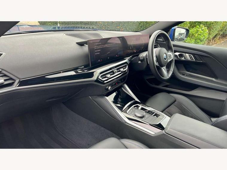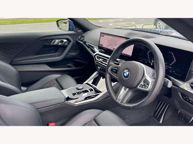 Attentiveness assist, Auto start-stop, Bluetooth, BMW ConnectedDrive online services, BMW Teleservices, Check Control warning system for monitoring of lights and door/luggage compartment open warning, Direct selection buttons, Drive off assistant, Eco pro mode, Electric power steering, Front and rear parking sensors, Front/rear Parking distance control, iDrive controller with turn and press function, Integrated owners handbook, Intelligent functions, Live cockpit plus with nav function 12.3" instrument cluster and 14.9" centre display, Oil sensor for level and grade, Optimum shift indicator, Personal Profile, Touch operation on control display, Variable sport steering, Widescreen multi-media display, Aluminium lightweight construction, Balancer shaft, BMW TwinPower Turbo four-cylinder petrol engine, Double VANOS, Drive performance control with ECO PRO comfort + sport mode, Electronic differential lock, High precision injection, M sport suspension, Petrol Particulate Filter, Sport automatic steptronic transmission with gearshift paddles, manual gearshift time display, launch control, coasting idle ECO PRO/COMFORT modes, Twin scroll turbocharger with Valvetronic, DAB tuner, Acoustic windscreen wipers for reduced driving noise, Adaptive LED Headlights, Automatic windscreen wipers and automatic headlight, Automatically dimming rear view mirror, Body colour door handles flush with door surface, Body colour door mirrors, Body colour front and rear bumpers, Daytime running lights, Electric windows - front and rear, with open/close fingertip control and trap release, Exhaust tailpipes x2 - 90mm in left and right, Fading support, Front and rear bumper system with replaceable deformation elements, Front door sill finishers in black plastic with BMW designation, Front windscreen wipers with integrated washer jets, Green tinted heat protection glazing, High beam assistant, High gloss shadowline exterior trim in mirror triangle cover, mirror cover panel, mirror bezel and window border, High level third brake light, Indicators integrated int mirror housing, LED registration plate light, LED technology rear tail lights, brake lights and turn indicators, Lightweight engineering, Model designation on right side of tailgate, One piece kidney grille with hight gloss chrome surround, Rear boot, Rear fog lights, Reversing light in rear light cluster, Shark fin antenna, Single part LED rear lights with smoked glass components, Trailer stabilisation logic, Visible VIN plate, 12V power socket in front centre console with blanking plug, 2 cupholders in front centre console, 3 zone automatic air conditioning, Ambient lighting, Compartment in front of cupholder, Conditioned based service, Driver seat backrest width adjustment, Front and rear side armrests integrated into door trim, Front armrest, Front door pockets, Front head restraints, Front sport seats, Heated front seats, Illuminated glove compartment with separate small compartment, M headliner Anthracite, M sport leather steering wheel, Manually adjustment steering wheel column, Rear seat backrest with manual 40:20:40 split folding, Rear seat centre foldable armrest with integrated cup holder, Single front passenger seat, Storage compartment between rear seats, Storage tray and compartment with cover in centre console, Sun visors with vanity mirrors and insert tab, Through loading system with 40/20/40 split folding 2 rear seat in 2nd row, Two folding rear seat headrests, Velour floor mats, Additional storage compartment pack without USB - 2 Series Coupe, Connected pack professional - 2 Series Coupe, Interior and exterior mirror pack - 2 Series Coupe, M Sport exterior styling aerodynamics pack - 2 Series Coupe, 2 tone horn, Anti lock braking system (ABS) with cornering brake control, Automatic Stability Control (ASC), BMW emergency call, Brake drying, Child seat ISOFIX attachment for the two outer rear seats, Crash sensor activating of airbags, Unlocking doors, hazard warning lights, interior light, safety battery terminal, Deactivation of fuel pump in the event of a crash, Driver and front passenger airbags, Driver and front passenger side airbags, integrated in the door side seat backrest bolsters for all seat variants, Dynamic brake control, Dynamic stability control + (DSC+), Dynamic Traction Control - DTC, Electrically operated hand brake including automatic hold function and automatic release when driving off, Front and rear disc brakes, Front passenger airbag deactivation, Head airbags for all 4 outer seats, Manual deactivation of front passenger airbag, Seat belt security check for driver and front passenger, Seatbelt warning, Side impact protection, Three point seat belts on 4 seats including front belt stopper, pyrotechnic belt tensioners and belt force limiters, Tyre pressure sensor, Warning triangle and first aid kit, Alarm system (Thatcham 1) with remote control and electronic engine immobiliser, Central locking switch for all doors, fuel filler cap and luggage compartment, Deadlocking function system to all doors, Drive away locking system on all doors and luggage compartment, Locking wheel bolts, Start/Stop button (illuminated) in centre console with keyless engine start and Auto Start-Stop deactivation button, Two remote control key with integrated key - one button for open and close doors/fuel flap/tailgate and separate button for unlock luggage compartment, BMW mobility tyre sealing system, Electrically powered 12V compressor, Reduced rolling resistance tyres,