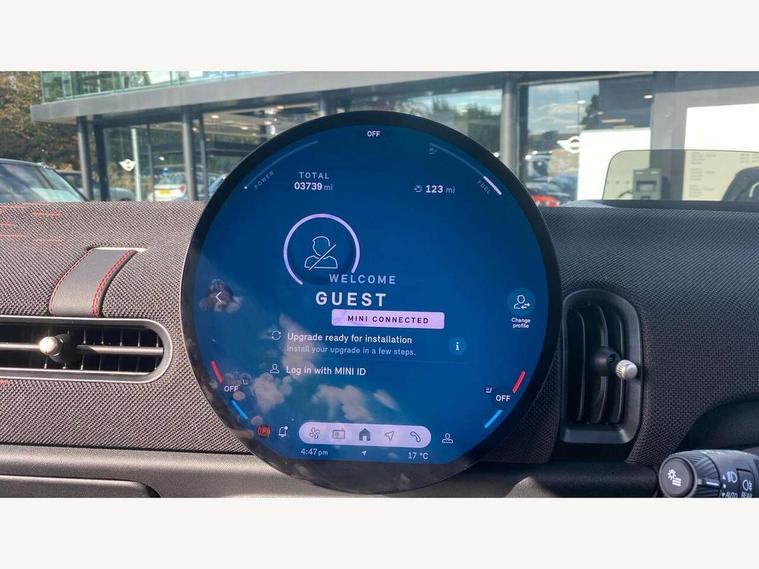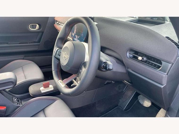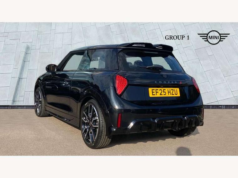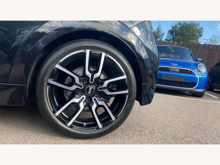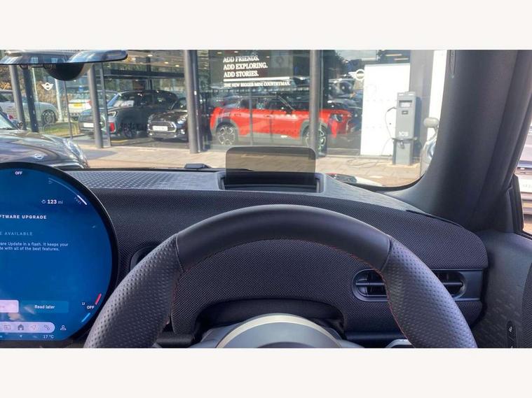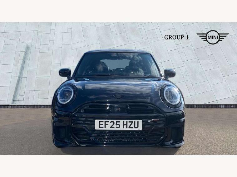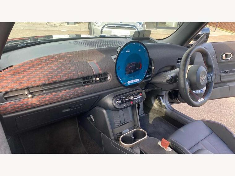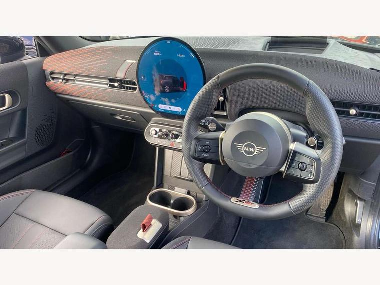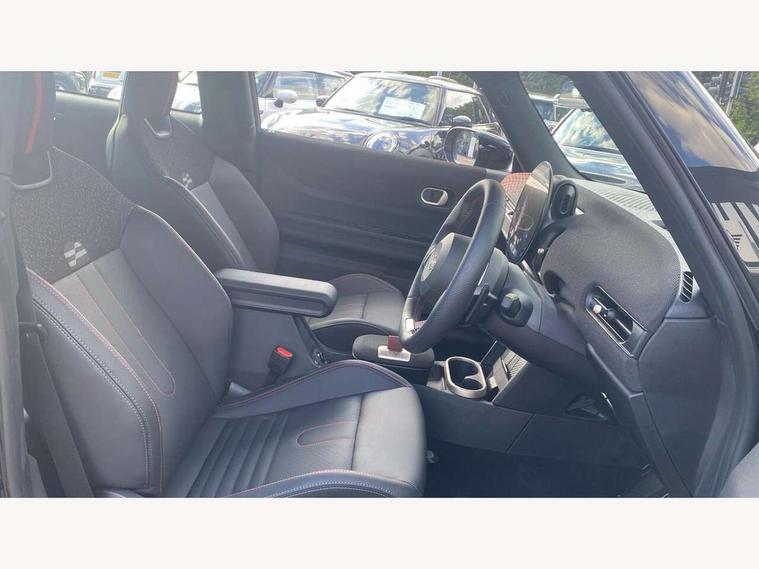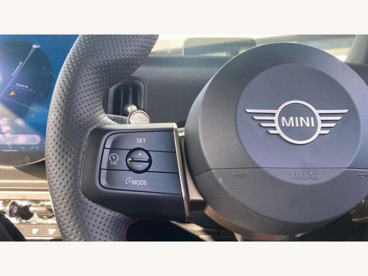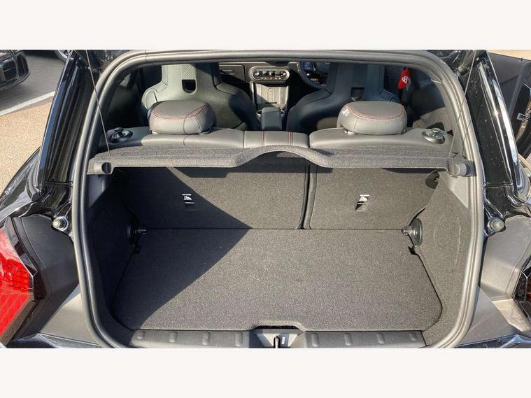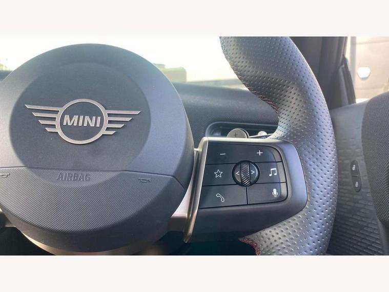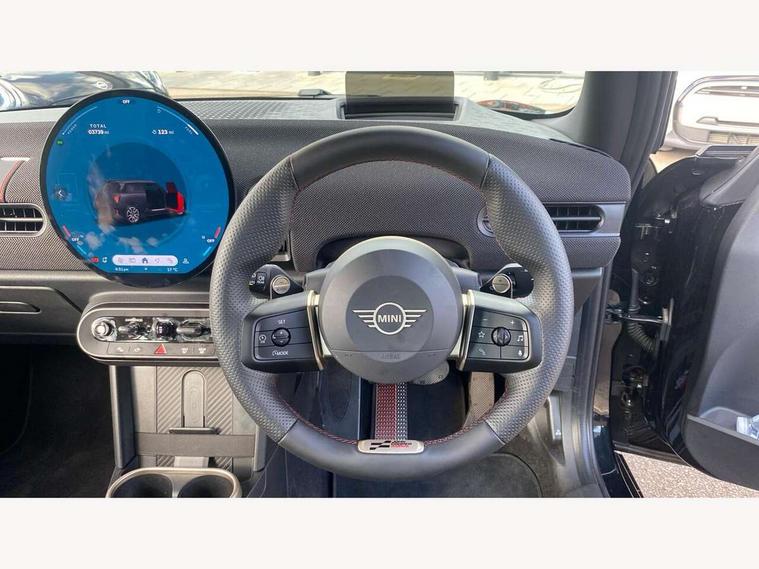 Central toggle bar, Circular OLED Screen, Compatible mobile phone bluetooth with audio streaming, Cruise control, Digital instrument cluster, Electro-mechanical speed dependant steering assistance, Emergency call service, MINI Experience Modes, Mini navigation system, On board computer, Service interval indicator, Tailgate, 7 speed steptronic transmission with double clutch, Adaptive suspension, DAB Digital radio, Personal eSim, Adaptable light signatures, Auto headlights, Electric adjustable heated door mirrors, Electric front windows, Front and rear apron, Heated rear window, Heated windscreen washer jets, High gloss black wheel arches, High gloss hexagonal patterned grille surround, JCW body kit, LED 3rd brake light, LED daytime running lights, LED indicator lights, LED rear lights, Rain sensor window wipers, Rear fog lights, Rear roof spoiler with airblades, Rear window wiper, 2 seat bench in second row, 2 zone automatic air conditioning, 60/40 rear seat bench, Ambient lighting, Black lower band in high gloss, Cupholders, Dark headliner, Front and rear head restraints, Front compact armrest, Front floor mats, Heated steering wheel, Height adjustable passenger seat, Lidded storage box in Black/Red knit, Luggage compartment lighting, Partially perforated vescin steering wheel with red accent, black/red decorative strap, Single front passenger seat, Steering wheel paddle shift, Sunvisors with vanity mirrors, Vescin/Cord combination JCW upholstery includes dash knit in black with red accents, Driving assistant pack - Cooper Hatchback, Level 1 pack - Mini Hatchback, Park assistant pack - Cooper Hatchback, 3 point seatbelts on all four seats, 6 Airbags - front, side, head and seat belt tensioners, Anti-lock braking system (ABS), Brake caliper in Black with JCW badge, DSC - Dynamic Stability Control, Electronic parking brake, Front and rear disc brakes, Front ISOFIX (iSize), Front passenger airbag deactivation, JCW Sport Brakes, Traction control, Tyre pressure monitoring system, Alarm, Immobiliser, Remote central locking, Black/Red decorative dash strap, Tyre repair kit,