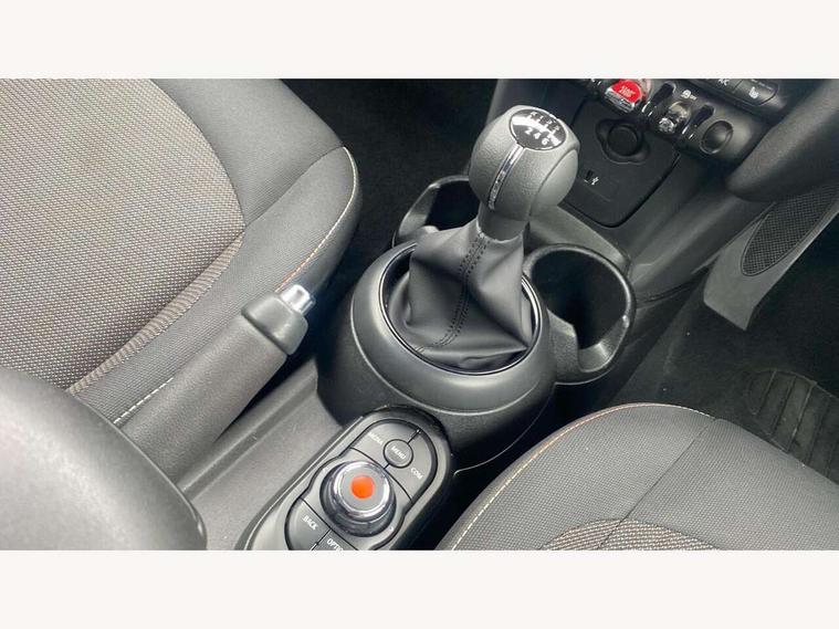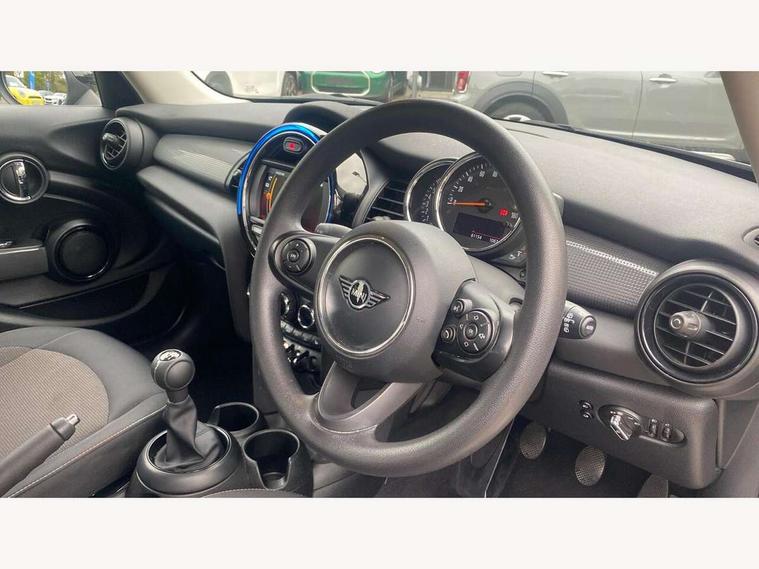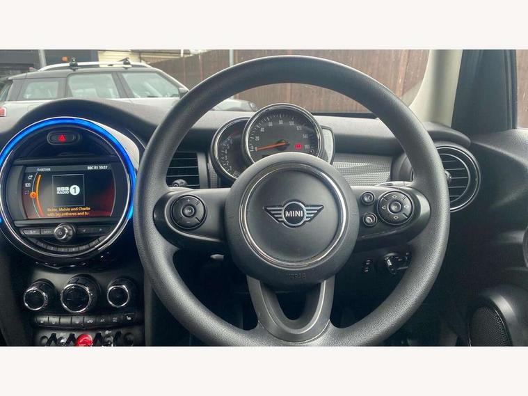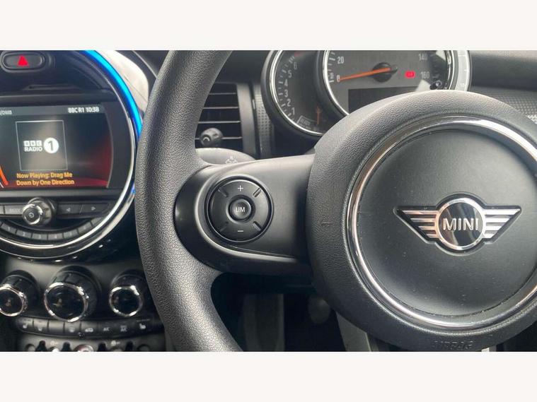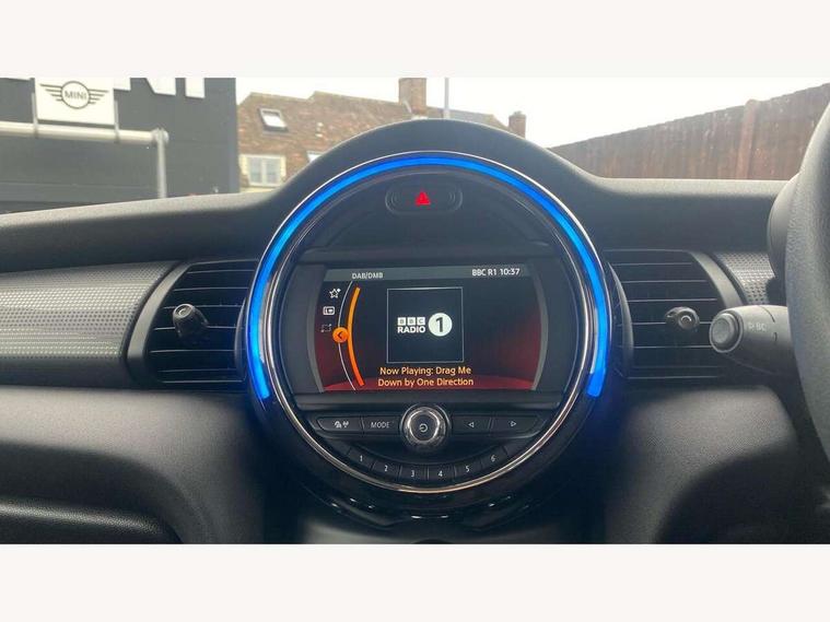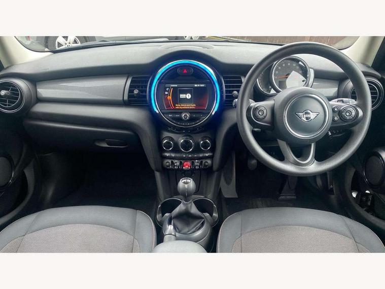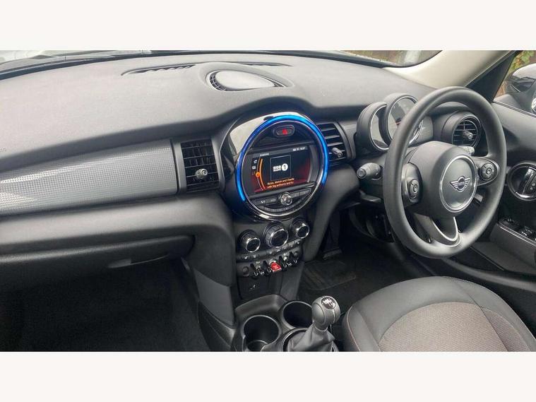 Compatible mobile phone bluetooth with audio streaming, Instrument cluster, Mini E-call, MINI TeleServices, On board computer, Service interval indicator, 6.5" touchscreen with LED ring, FM tuner and DAB digital radio, Automatic headlight activation switch, Body colour fuel filler cap, Chrome border high gloss black slats radiator grille, Dynamic brake lights, Electric front+rear windows, Heated rear window, Heated windscreen washer jets, LED headlight with closed ring and daytime driving lights, Left exhaust tailpipe with chrome finisher, Metal door sill strips with MINI imprint, Model logo Cooper on right of tailgate, Rain sensor window wipers, Rear fog lights, Rear LED lights with union jack design, Rear window wiper, Side scuttle panel with integrated indicator, Sun/heat protection glass, White indicator lenses, 12V Accessory socket in centre console, 4 lashing eyes in luggage compartment, 60/40 split folding rear seat, Chrome interior highlights, Colour line - Carbon black, Cupholders, Front and rear isofix with front passenger airbag deactivation, Glove compartment, Height and length steering column adjustment, Interior lighting with 12 basic colours selectable via toggle switch in roof, Leather gearshift lever and handbrake gaiters, Manual air conditioning, Mechanical seat adjustment, driver seat height adjust, forward/back and front seats backrest, Mini logo projection on floor from drivers exterior mirror, Multifunction steering wheel, Satellite grey headlining, Storage compartments in doors, Sunvisors with vanity mirrors, 3 point seatbelts on all five seats, 6 Airbags - front, side, head and seat belt tensioners, Anti-lock braking system (ABS), DSC - Dynamic Stability Control, Front and rear disc brakes, Hill start assist, Single tone fanfare horn, Tyre pressure monitoring system, Alarm system with tilt sensor, monitoring doors, bonnet interior and tailgate, Electronic vehicle immobiliser, Start/stop toggle with keyless go, Tool kit,