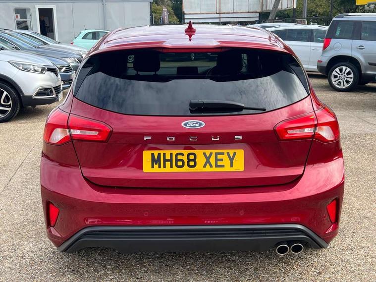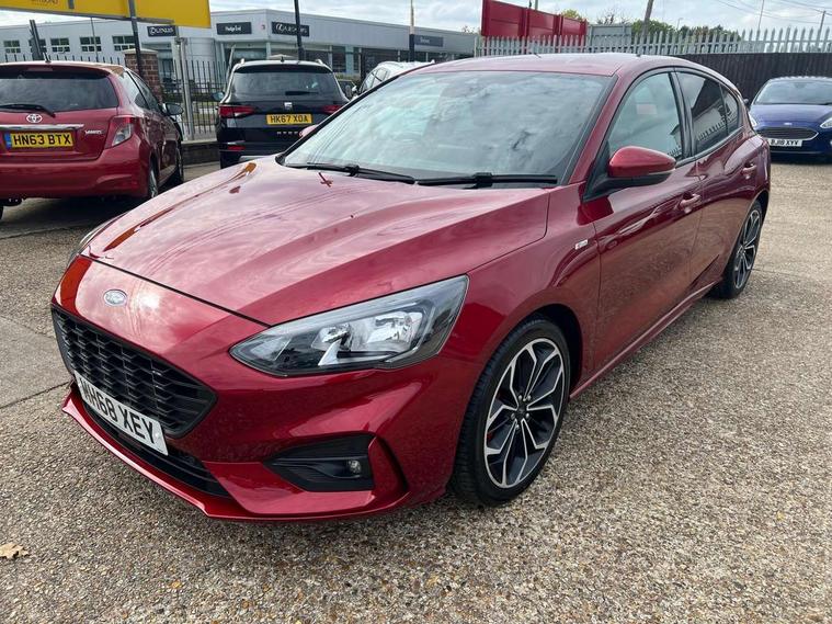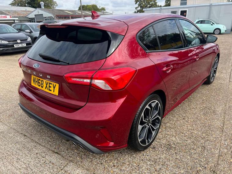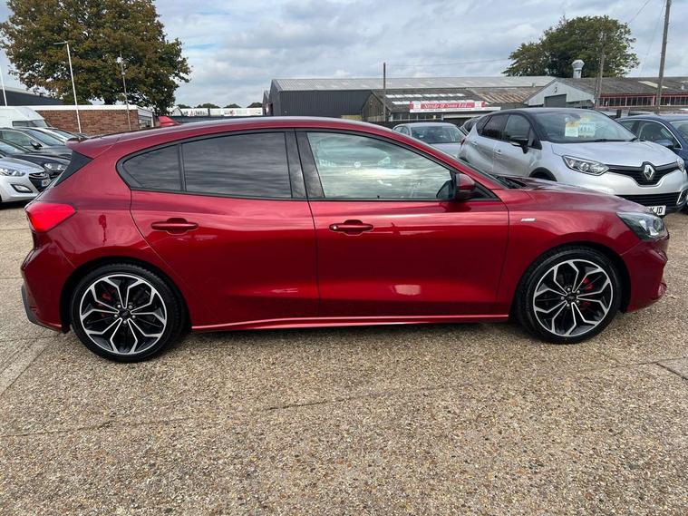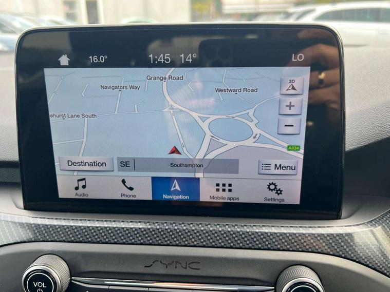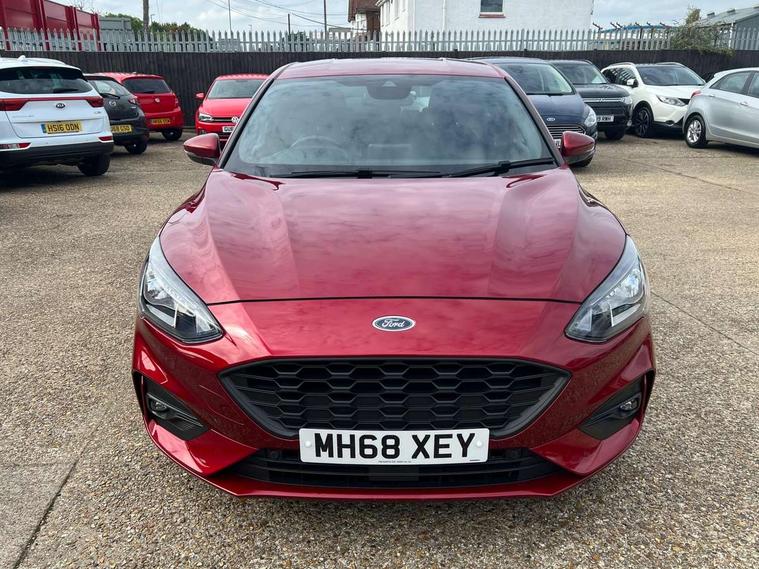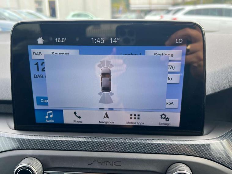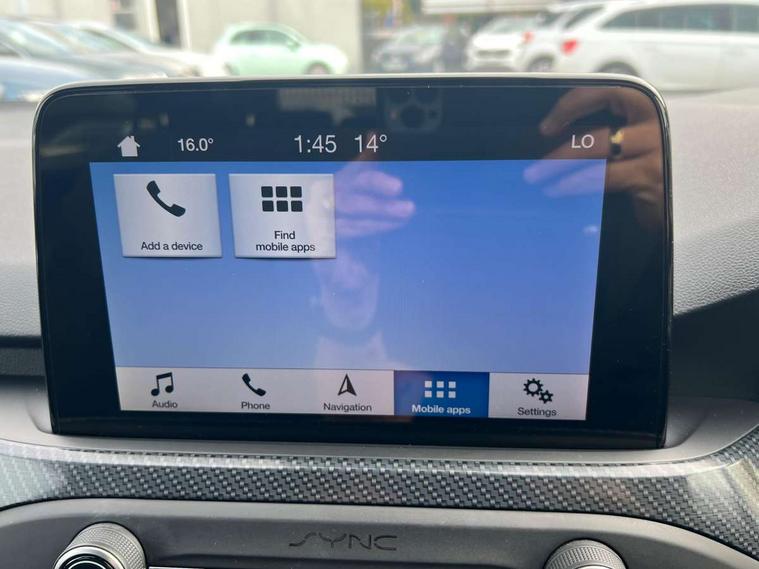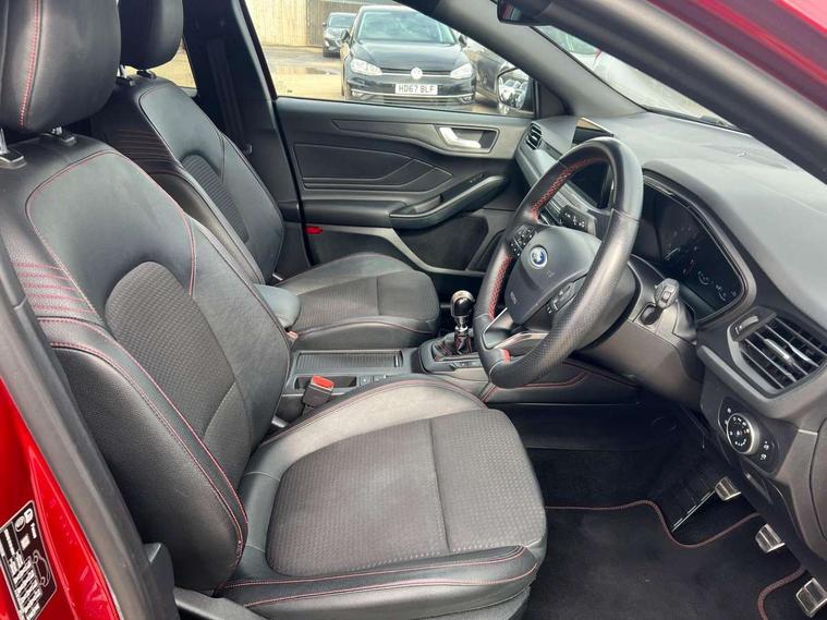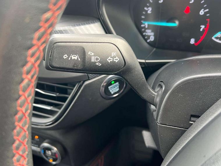4" TFT coloured cluster screen, Bluetooth system, Digital clock, Easy fuel capless refuelling system, Eco mode, Ford pass connect, Ford SYNC 3 nav system with DAB radio, 8" colour touch screen, voice control, app link, Apple car play/Android auto and 4.2" TFT coloured cluster, Lane keeping aid with lane departure warning, PAS, Trip computer, 2 USB ports, Aux input, 'Quickclear' heated windscreen/heated washer jets, Auto dimming rear view mirror, Auto headlamps (on/off), Automatic rain sensing wipers, Body colour large rear spoiler, Body colour side skirt, Body coloured bumpers, Body coloured door handles, Body coloured electrically operated and heated door mirrors with side indicators, Electrically operated front and rear windows with one touch opening and closing, Front variable intermittent wipers with electric wash, Heated rear window, LED daytime running lamp, LED front fog lamps with cornering function, Polished twin tailpipe, Power folding door mirrors with puddle lights, Rear privacy glass, ST-Line upper and lower grille with full body styling kit and wing badges, Tailgate wash/wipe, Unique door and instrument panel inserts, 3 spoke flat bottomed leather steering wheel with red stitching, 6 way power adjustable driver seat, 60/40 split back and cushion rear seats with 2 height adjustable headrests, Alloy finish pedals, Aluminium gear knob, Centre console with armrest, Dark headliner, Dual zone electronic air temperature control, Front and rear floor mats with red stitching, Front passenger seat manual height and lumbar adjust, Heated front seats, Height adjustable front headrests, Isofix child seat preparation, Part leather upholstery with red stitching, Reach + rake adjustable steering column, Rear centre headrest, Red stitching on steering wheel, Soft console knee pads with red stitching, ABS+Electronic Brake force Distribution, Auto hold function, Driver airbag, Electronic parking brake, Electronic stability control, Front and rear seatbelt reminder, Front inertia reel height adjustable seatbelts with pre-tensioners, Front passenger airbag, Front side airbags, Hill start assist, Passenger airbag deactivate switch, Post collision braking, Pre collision assist with autonomous emergency braking and pedestrian/cyclist detection, Red brake calipers, Side curtain airbags, Three rear inertia reel lap/diagonal seatbelts, Tyre pressure monitoring system, MyKey system, Remote central locking & engine immobiliser, Thatcham category 1 alarm, Contrast stitching - Red, 18" 5x2 spoke matt black machined finish alloy wheels, Mini steel spare wheel,