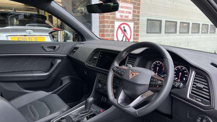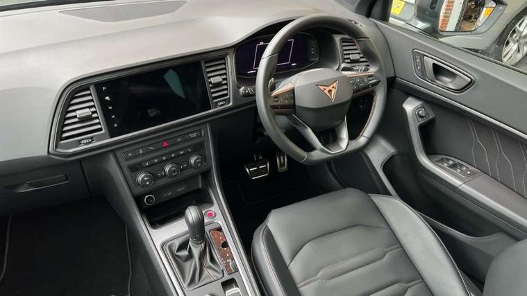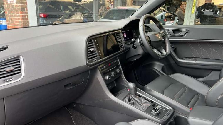 CUPRA drive profile - Normal, sport, CUPRA and individual modes and Hydraulic damper control (DCC), Digital cockpit, E-call, Electric tailgate with virtual pedal, Front and rear view camera, Outside temperature gauge, Progressive power assisted steering, Self parking functionality (includes front and rear parking sensors), Top view camera, Trip computer, wired and wireless full link smartphone integration, Wireless phone charger, CUPRA sport suspension, Steering wheel mounted audio/phone controls, Body colour bumpers with dark aluminium diffusor, Body coloured wheel arch surrounds, Dark tinted rear windows, Daytime running lights, Door mirrors with welcome CUPRA light silhouette, Dynamic headlight range control with self adjusting whilst driving, Electric adjustable/heated/folding door mirrors, Front and rear electric windows, Front grille frame in chrome, Full LED headlamps with lens and LED front fog lamps with cornering function, Gloss black door mirrors, Gloss black roof rails, Gloss black side mouldings, Gloss black side window trim, Illuminated aluminium front door sill, LED rear tail lights with dynamic indicators, Rear fog lights, Rear side wing doors, Rear spoiler, Rear wash/wipe, Specific CUPRA design front bumper, Third brake light, Visible twin black exhaust pipes in both sides, 12v socket in front, 3 seat bench in 2nd row, 60/40 split folding rear seat, Aluminium pedals, Black roof lining, Cupra steering wheel emblem, Dual zone climate control, Electric driver seat with memory function, Front and rear head restraints, Front centre armrest, Front seat back storage pockets, Heated front seats, Heated steering wheel, Height adjustable driver and passenger seat with lumbar adjustment, ISOFIX points in outer rear seats with top tether anchorage points, Leather sport bucket seats, Leather steering wheel and gear knob, Multicoloured ambient lighting with LED interior illumination, Pedal cluster, Rear armrest and easy back seat release mechanism from boot, Single front passenger seat, Sports steering wheel, Steering wheel mounted gearshift paddles, Storage compartment in roof console for sunglass, Storage compartment under driver's seat, Convenience pack - Ateca, Interior lighting pack - Ateca, Navigation system plus pack with DAB - Ateca, Safe and driving pack with High beam control - Ateca, 3x3 point rear seatbelts, ABS, Traction control system (TCS), Electronic stability control (ESC) and Electronic differential lock system (XDS), Airbags - Driver and front passenger airbag with deactivation, front side, two curtain and driver's knee airbags, Attention and drowsiness assist, Black brake callipers with CUPRA logo, Electric parking brake with auto hold function, Front and rear seatbelt reminder, Hill hold control, Manual rear child locks, Single tone horn, Tiredness recognition system, Tyre pressure monitoring system, Tyre pressure warning light, Alarm, Keyless entry, Locking wheel bolts,