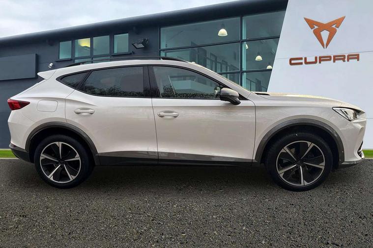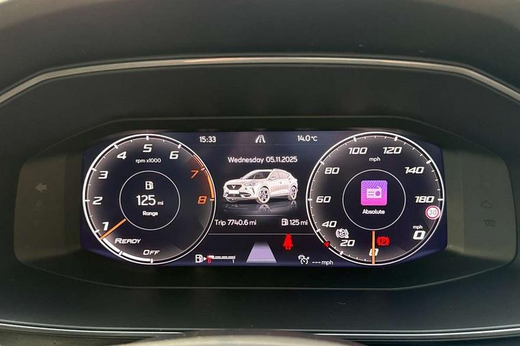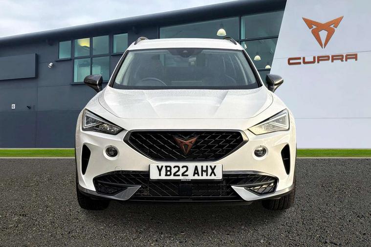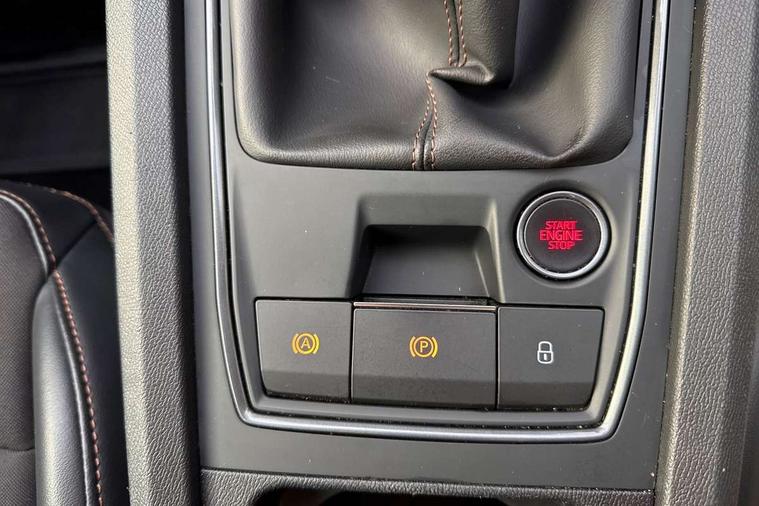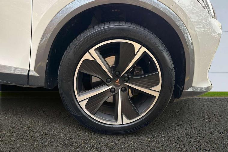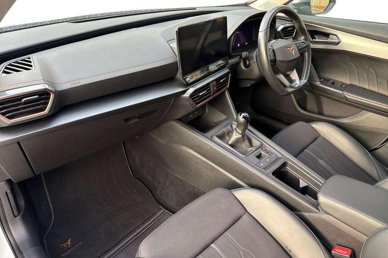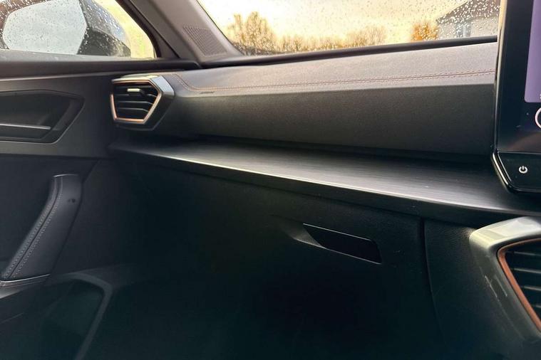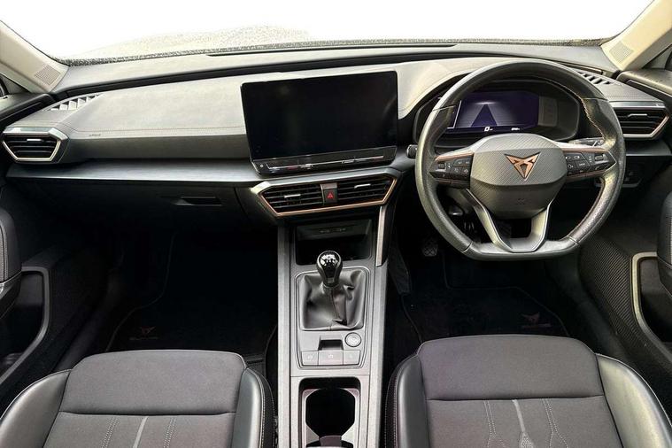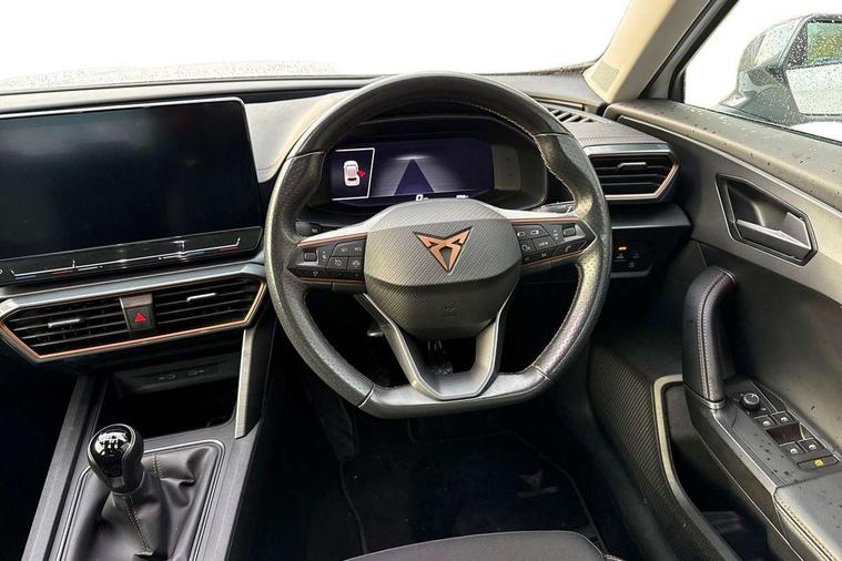 Digital cockpit and configurable dashboard, Driver alert system, Driving profile selection, E-call, Forward collision warning with automatic braking, Lane assist, Navigation system with 12'' Touchscreen Display, PAS, Predictive adaptive cruise control with speed limiter, Rear parking sensors, RPM, trip computer, outside temp gauge, instrument light brightness, low fuel warning light, lights on reminder, gearshift indicator, Service interval indicator, Start/stop system with regenerative braking, Voice control system, Wireless apple carplay, Wireless phone charger, Electronic locking differential and dynamic traction support, Standard suspension, 2 front and 2 rear USB type C sockets, Auxiliary input socket, DAB radio, Auto dimming rear view mirror, Body colour door handles, Body coloured bumpers, Dark grey wing mirror, Daytime running light with automatic headlight control and coming home feature, Dynamic headlight range control, Electric front/rear windows, Electrically adjustable, heated and folding door mirrors, Front fog lamps with cornering function, Gloss black roof rails and window surrounds, LED Headlights, LED Taillights with dynamic indicator, Rain sensing wipers, Rear diffuser with black simulated exhaust pipes, Rear side wing doors, Rear wash/wipe, Third brake light, Tinted rear windows, Welcome lights, 12v power supply in centre console, 12V socket, 12v socket in loadspace, 2 front and 2 rear reading lights, 230V socket, 3 seat bench in 2nd row, 60/40 split rear bench seat with armrest and mechanical seat release, Dust/pollen filter, Front and rear head restraints, Front centre armrest, Height/reach adjust steering wheel, Illuminated interior front door sills, Illuminated sunvisor with mirror, Interior ambient lighting, Isofix, Leather multi function steering wheel, Luggage tie-down hooks, Manually adjustable height and lumbar support for front seats, PVC/Cloth upholstery with copper stitching + Sport seats, Single front passenger seat, Three zone climate control with control panel in rear, Variable luggage/load compartment floor, Safety and driving pack (M) - Formentor, 3 point seatbelts on all rear seats, ABS, Brake control system - ESC and brake booster, Child proof door locks, Driver and front passenger airbags with front passenger airbag de-activation, Electronic parking brake, Front and rear disc brakes, Front side curtain airbags, Hill hold control, Seat belt reminder for front and rear seats, Tyre pressure monitoring system, Anti theft alarm system, Keyless entry and start system (KESSY), Locking wheel bolts, Copper and aluminium interior detailing,