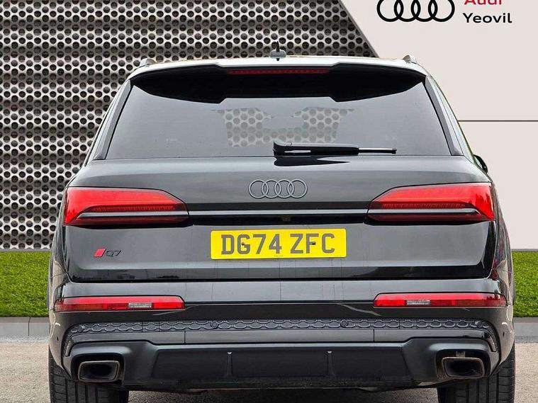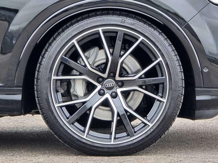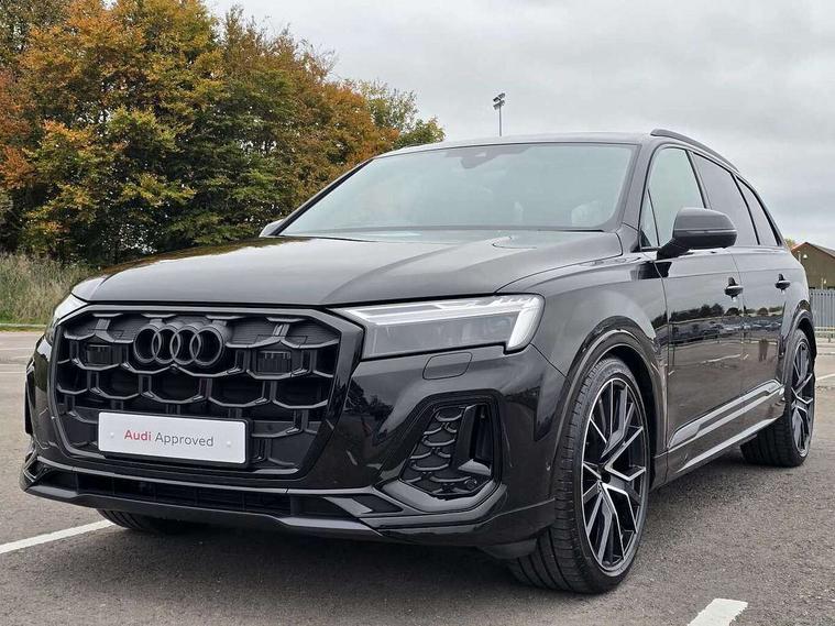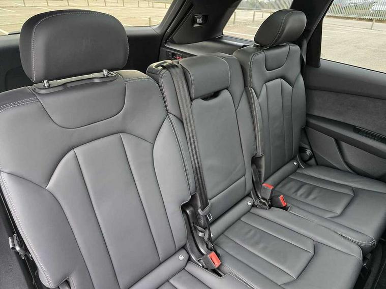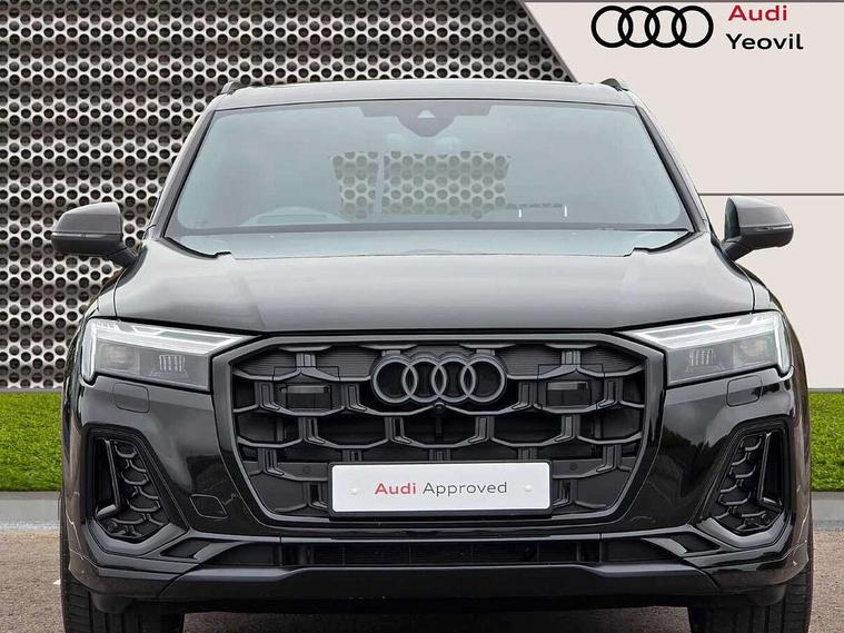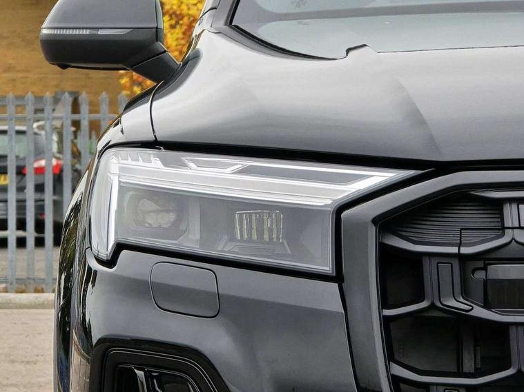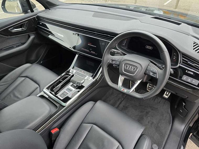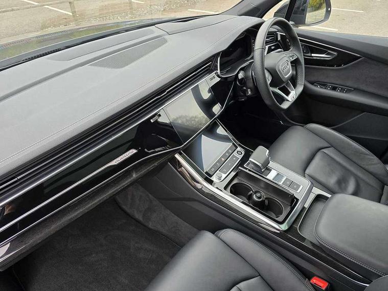 Audi connect safety and service (e-call), Audi connect with Amazon Alexa Integration, Audi drive select (Auto, Comfort, Dynamic, Efficiency, Individual, Off-road and All road), Audi phone box light with wireless charging, Audi virtual cockpit - 12.3" high-resolution LCD display with fully customisable instrument cluster, Bluetooth interface, Camera based traffic sign recognition, Electromechanical power steering, MMI navigation plus with MMI touch screens includes 10.1" and 8.6" screens with haptic feedback, Natural voice recognition, Operating buttons in Matte black, Parking system plus with 360 degree display (front, rear and side sensors) - acoustic and visual park assist system, Power operated tailgate, Rear view camera, Smartphone interface includes wireless Apple carplay/Android Auto, Start/stop system, 48V Mild hybrid technology, Adaptive air sports suspension, Quattro all wheel drive with self locking centre differential, Audi music interface - front 2 USB-C ports with charger and data functions, Audi sound system with 6 channel amplifier, 180 watt amplifying capacity and 10 loudspeakers including subwoofer, DAB digital radio module, Audi Beam uses LEDs to project S emblem with red rhombus onto the ground when opening the side doors (front/rear), Auto dimming frameless rear view mirror, Black exhausts, Black roof rails, Electrically adj heated/folding + automatically dimming exterior mirrors with memory + automatic kerb side function for passenger side exterior mirror, Heat insulating glass in windshield, Integrated LED indications in door mirrors, LED 3rd brake light, LED daytime running lights, LED rear tail lights, Loading edge protection in stainless steel, Matrix LED headlights with dynamic front and rear indicators, Privacy glass - dark tinted rear and rear side windows from B-pillar backwards, Rear side wing doors, Rear wiper, 2 seat bench in 3rd row, 2 zone automatic climate control, 3 seat bench in 2nd row, 7 seat layout with ISOFIX points for the front passenger seat and rear passenger seat, Black cloth headlining, Comfort front centre armrest, Electric adjustable front seat with 4 way lumbar support, driver memory functionality, Folding rear seats, Front head restraints, Front/rear floor mats, Heated front seats, Illuminated door sill trims with S logo, ISOFIX child seat mounting for front passenger seat and 2 outer rear seats with top tether child seat mounting for all 3 rear seats, LED interior ambient lighting, Luggage compartment cover, Luggage compartment sill protection in stainless steel, Rear head restraints, Single front passenger seat, Stainless steel pedals, Sunvisors with illuminated vanity mirrors, Black styling pack plus - Q7, 3 point seatbelts on all rear seats, Audi pre sense front, Child locks on rear doors, Convenience key with safelock and gesture tailgate, Driver and front passenger, front side and curtain airbags, Electromechanical parking brake, Electronic Stabilisation Control (ESC) including ABS, ASR and EDL, Extended pedestrian protection measures, Hill hold assist, Seatbelt reminder, Tyre pressure loss indicator, Warning triangle and first aid kit, Anti theft alarm with tow away protection, Anti-theft wheel bolts and wheel loosening detection, Keyless Go, Remote central locking, Polished oak trim with grey finish inlay, Tool kit, Tyre repair kit,