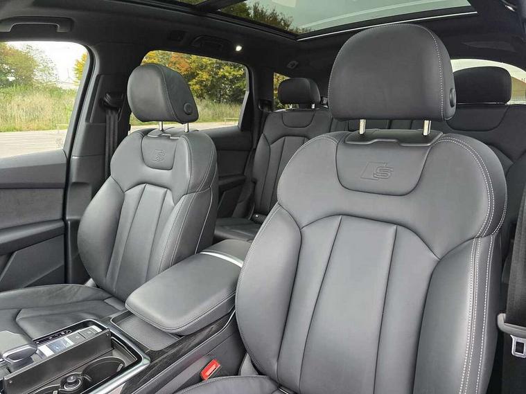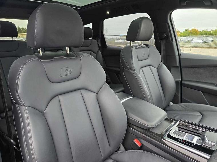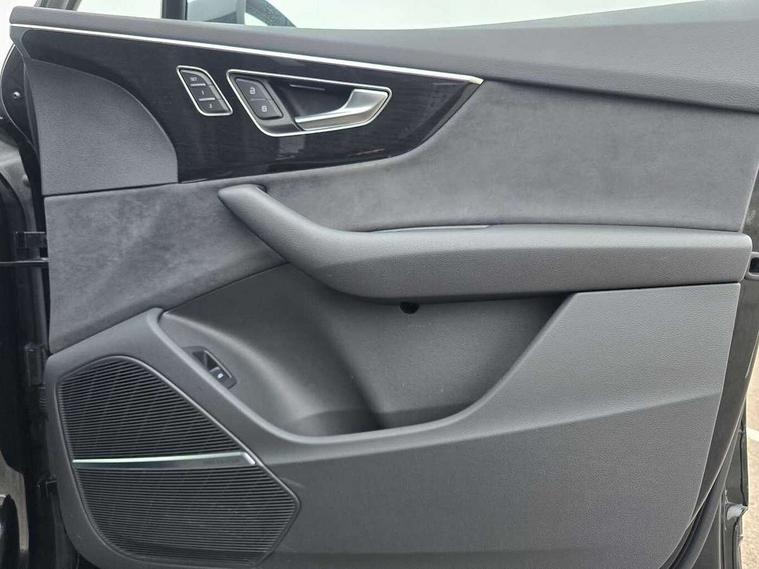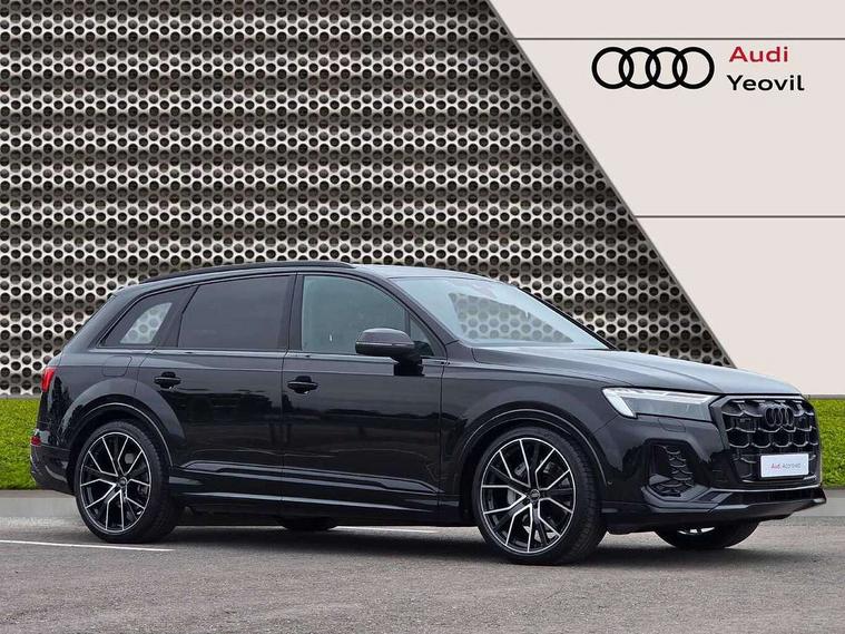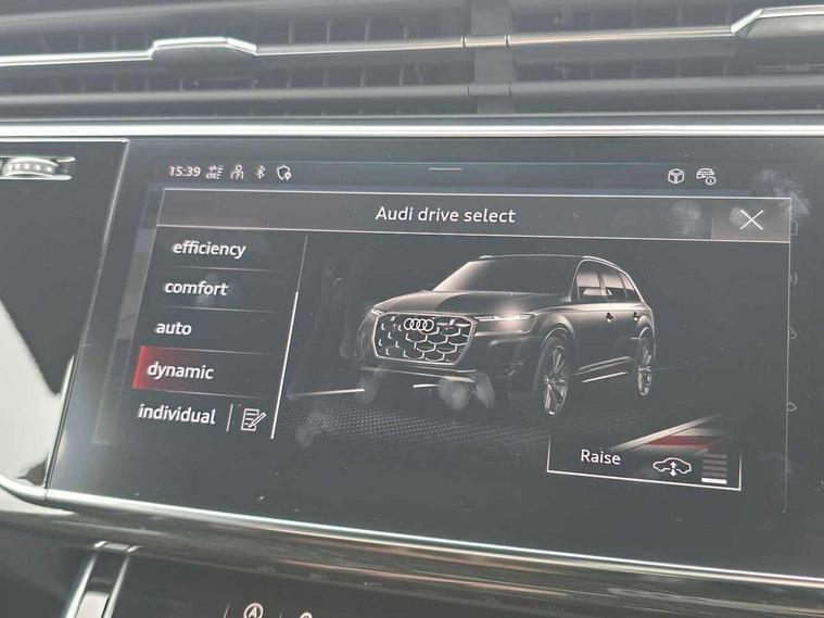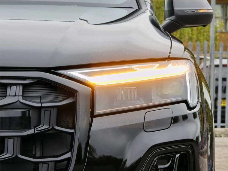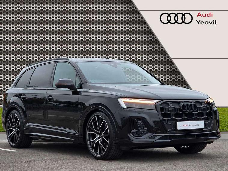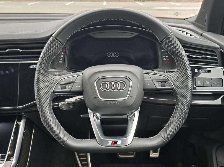 Audi connect safety and service (e-call), Audi connect with Amazon Alexa Integration, Audi drive select (Auto, Comfort, Dynamic, Efficiency, Individual, Off-road and All road), Audi phone box light with wireless charging, Audi virtual cockpit - 12.3" high-resolution LCD display with fully customisable instrument cluster, Bluetooth interface, Camera based traffic sign recognition, Electromechanical power steering, MMI navigation plus with MMI touch screens includes 10.1" and 8.6" screens with haptic feedback, Natural voice recognition, Operating buttons in Matte black, Parking system plus with 360 degree display (front, rear and side sensors) - acoustic and visual park assist system, Power operated tailgate, Rear view camera, Smartphone interface includes wireless Apple carplay/Android Auto, Start/stop system, 48V Mild hybrid technology, Adaptive air sports suspension, Quattro all wheel drive with self locking centre differential, Audi music interface - front 2 USB-C ports with charger and data functions, Audi sound system with 6 channel amplifier, 180 watt amplifying capacity and 10 loudspeakers including subwoofer, DAB digital radio module, Audi Beam uses LEDs to project S emblem with red rhombus onto the ground when opening the side doors (front/rear), Auto dimming frameless rear view mirror, Black exhausts, Black roof rails, Electrically adj heated/folding + automatically dimming exterior mirrors with memory + automatic kerb side function for passenger side exterior mirror, Heat insulating glass in windshield, Integrated LED indications in door mirrors, LED 3rd brake light, LED daytime running lights, LED rear tail lights, Loading edge protection in stainless steel, Matrix LED headlights with dynamic front and rear indicators, Privacy glass - dark tinted rear and rear side windows from B-pillar backwards, Rear side wing doors, Rear wiper, 2 seat bench in 3rd row, 2 zone automatic climate control, 3 seat bench in 2nd row, 7 seat layout with ISOFIX points for the front passenger seat and rear passenger seat, Black cloth headlining, Comfort front centre armrest, Electric adjustable front seat with 4 way lumbar support, driver memory functionality, Folding rear seats, Front head restraints, Front/rear floor mats, Heated front seats, Illuminated door sill trims with S logo, ISOFIX child seat mounting for front passenger seat and 2 outer rear seats with top tether child seat mounting for all 3 rear seats, LED interior ambient lighting, Luggage compartment cover, Luggage compartment sill protection in stainless steel, Rear head restraints, Single front passenger seat, Stainless steel pedals, Sunvisors with illuminated vanity mirrors, Black styling pack plus - Q7, 3 point seatbelts on all rear seats, Audi pre sense front, Child locks on rear doors, Convenience key with safelock and gesture tailgate, Driver and front passenger, front side and curtain airbags, Electromechanical parking brake, Electronic Stabilisation Control (ESC) including ABS, ASR and EDL, Extended pedestrian protection measures, Hill hold assist, Seatbelt reminder, Tyre pressure loss indicator, Warning triangle and first aid kit, Anti theft alarm with tow away protection, Anti-theft wheel bolts and wheel loosening detection, Keyless Go, Remote central locking, Polished oak trim with grey finish inlay, Tool kit, Tyre repair kit,