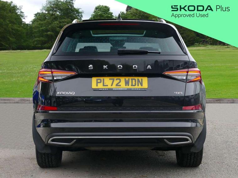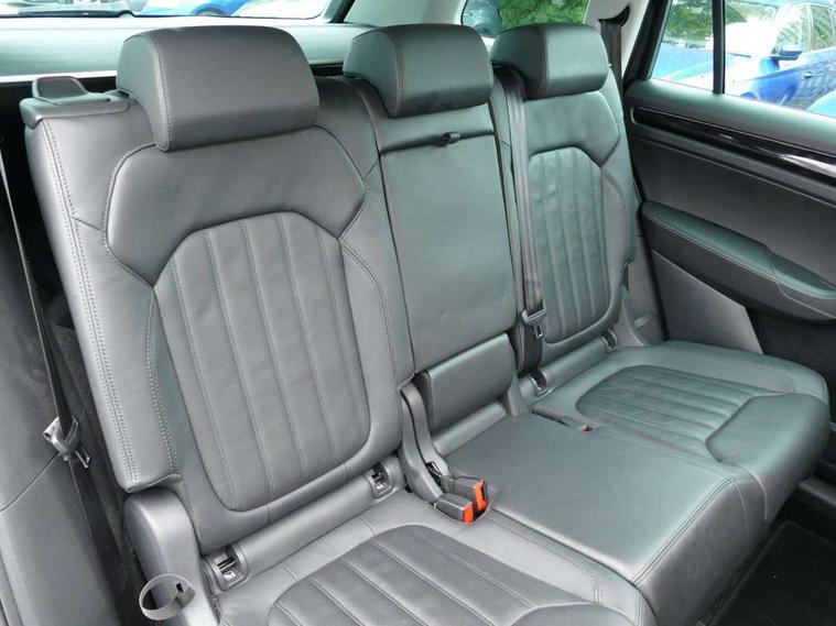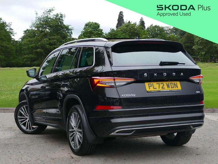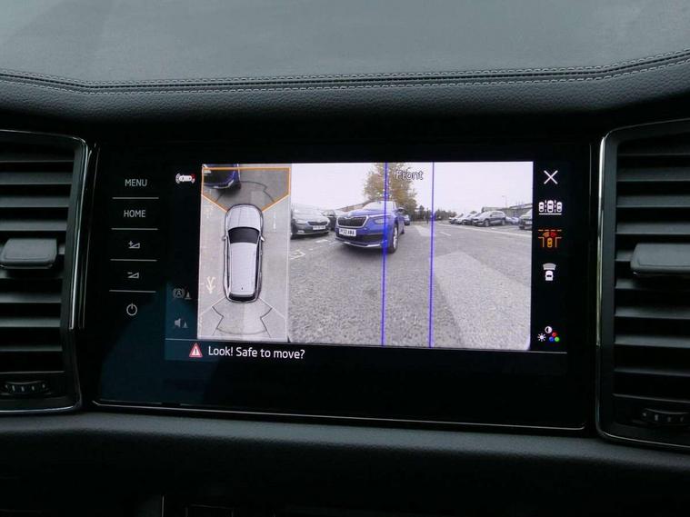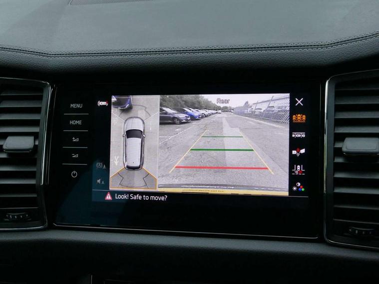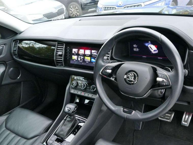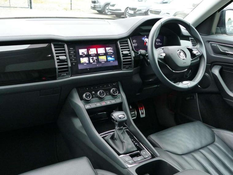 Area view, Blind spot detection system, Bluetooth system, Columbus satellite navigation with 9.2" touchscreen, integrated Wi-Fi, web radio, Digital voice enhancement, e call+, ECO Stop/start function, Exterior temperature indicator, Progressive steering, Smartlink wireless for apple carplay and wired for android auto, Speed limiter, Tailgate unlocking from outside, USB C Port x 2 in front centre console, Virtual Cockpit - 10.25" digital display, Wireless charging, Canton sound system, DAB Digital radio, Aero front windscreen wipers with intermittent function, Aero rear window wiper, Auto dimming rear view mirror, Black wheel arch surrounds, Body colour bumpers, Body colour door mirrors and handles, Body colour door panels, Chrome front grille, Chrome roof rails with chrome window surround, Electric adjustable/heated/folding door mirrors, driver side auto dimming with boarding sports and memory function, Electric front and rear windows, Extended rear spoiler with finlets in gloss black, Front fog lights, Full LED matrix headlights with AFS (adaptive front light system), cornering function and AWL (all weather lighting system), Headlight washers, Heated rear window, Invisible tailpipe, L&K front and rear bumpers including lower rear chrome strip, LED daytime running lights, LED rear fog light, LED third brake light in rear spoiler, Light assistant (coming/leaving home/tunnel light), Off-road style lower front bumper element, Panoramic sunroof, Privacy glass, Rain and light sensors, Rear LED lights (high functionality) with welcome effect and dynamic indicators, Rear side wing doors, Safety reflectors on front and rear doors, Window control switches with black trim, Without engine designation, 12V socket in boot, 2 rails with 2 hooks, 2 seat bench in 3rd row, 3 seat bench in 2nd row, 4 foldable roof handles with rear coat hooks, 60:40 foldable rear seat with sliding adjustment and backrest angle adjustment, Aluminium pedals, Bottle holders in door panel in the 1.5 litre front and 1 litre rear, Cargo storage compartments, Chrome headlight control button, Chrome interior door handles, Coat hooks on B pillar, Covered storage compartment on driver side, Decorative door sill covers, Front centre armrest with storage compartment, cup holder and 12V socket, Front courtesy lights, Gear shift lever with chrome frame and black gloss insert, Grey stitching in front and rear armrests and door armrests + door inserts, Height adjustable front headrests, Illuminated and cooled glovebox, Illuminated luggage compartment, Isofix child seat fittings in outer rear seats with top tether, Manually adjustable steering column, Net programme in boot (1x horizontal Net, 2x vertical Nets), Overhead glasses storage compartment, Pollen filter, Rear centre armrest with cupholders, Single front passenger seat, Sliding trunk cover, Small Bags on the inner sides of the front backrests, Sunvisors with illuminated vanity mirrors, Three rear height adjustable headrests, Ticket holder on A Pillar, Umbrella in door panel, Variable boot floor, LED Interior light pack - Kodiaq, Auto door release and activation of warning lights in the event of an accident, Child locks on rear doors, Driver and front passenger airbag with knee airbag and front passenger airbag deactivation, Electronic parking brake with hill start assist, Emergency rear braking signal, ESC (incl. ABS+MSR+ASR+EDS+HBA+DSR+RBS+MKB), Front assist with autonomous emergency braking, Front side airbags with curtain airbags, Fuel cut off safety device, Height adjustable front 3 point seatbelts + pretensioners, Hill hold control, Rear disc brakes, Safety vest holder in door, Seat belt reminder for all seats, Three point rear seat belts, Two tone horn, Tyre pressure monitor, Alarm with interior monitoring and tilt sensor with safe function, Anti-theft wheel bolts, Immobiliser, Keyless entry and start system (KESSY), Remote central locking with 2 keys, Grey stitching in dashboard, Piano black decorative inserts, Plaquette L&K front fenders, Temporary spare wheel (space saver),