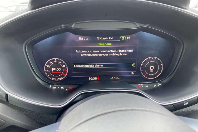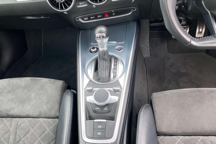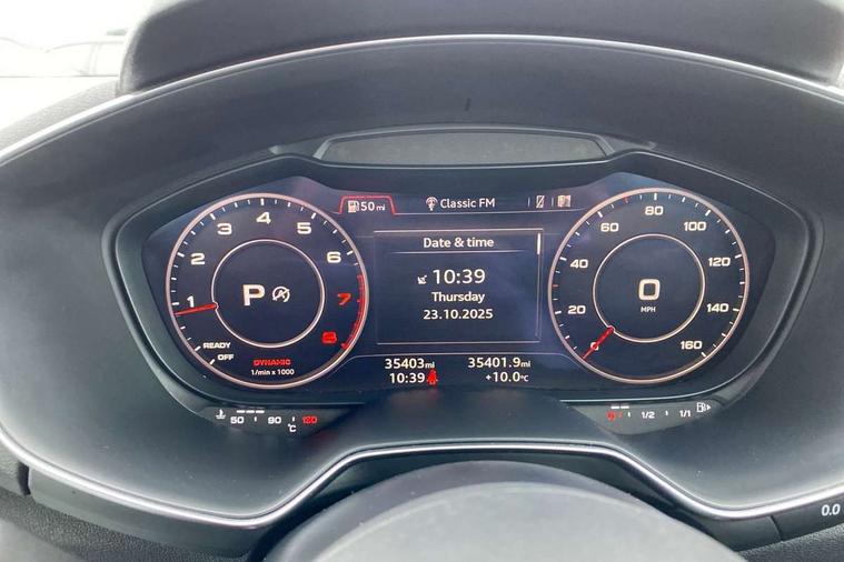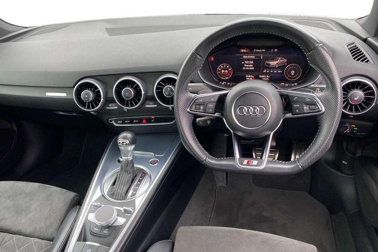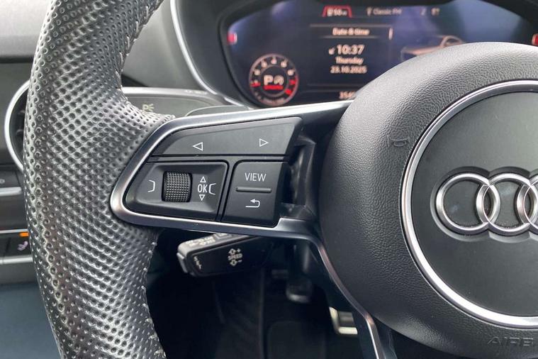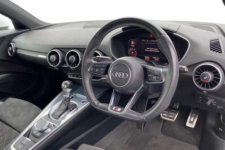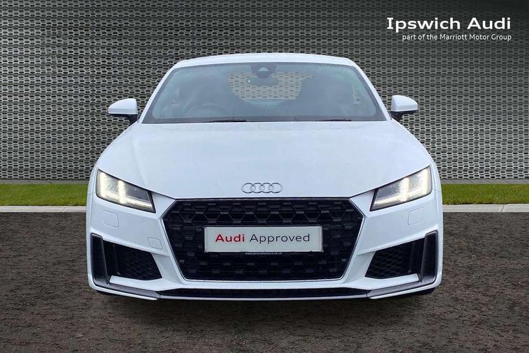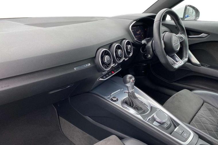 Audi drive select with 4 Pre configured modes, Audi smartphone interface, Audi virtual cockpit - 12.3" high-resolution LCD display with fully customisable instrument cluster, Cruise control + speed limiter, MMI touch panel, Mobile phone preparation with bluetooth interface, Progressive power assisted steering, Service interval indicator, Start/Stop system with energy recuperation, TP memo, S line sports suspension, AM/FM radio, Bluetooth audio streaming, DAB Digital radio, MMI Radio with CD player and SD/XC card slot, Auto dimming rear view mirror, Auto headlight range control, Body colour bumpers, Body colour electrically adjustable and heated door mirrors with built in LED side indicators, Electric folding door mirrors, Electric front windows, Front fog lights, Green tinted heat insulating glass, High gloss black radiator grille, LED daytime running lights, LED headlights with LED rear lights + dynamic rear indicators, Light and rain sensors, Retractable rear boot spoiler, S line badges on front wings, S Line front and rear bumpers, S line rear diffuser with platinum grey insert, S line side sills, Sunband for windscreen, 12V socket, 3 spoke flat bottomed high multi-function leather sport steering wheel with gearshift paddles, 4 way electric lumbar support for driver and front passenger, Black headlining, Door sill trims with S line logo, Extended aluminium look with stainless steel pedals, Front centre armrest, Front super sports seats, Heated front seats, Height adjustable driver's seat, Height adjustable front head restraints, Height/reach adjust steering wheel, ISOFIX child seat mounting for front passenger seat with airbag deactivation, Perforated leather gearknob in black, Rear head restraints, Rear top tether child seat ISOFIX attachment, S Line badge on steering wheel, Split folding rear seat, Non smoking pack - TT/TT RS, 3 point front seat belts, ABS, ASR traction control, Brake energy regeneration, Curtain airbags, Driver and front passenger airbag with front passenger airbag deactivation, EDL traction control, Electromechanical parking brake, ESP, First aid kit, Front side airbags, Head airbags, Hill hold assist, Seatbelt warning, Tyre pressure warning, Warning triangle, Anti theft alarm, Anti theft wheel bolts, Immobiliser, Keyless Go, Remote central locking, Matt brushed aluminium inlays, Tool kit, Tyre repair kit,