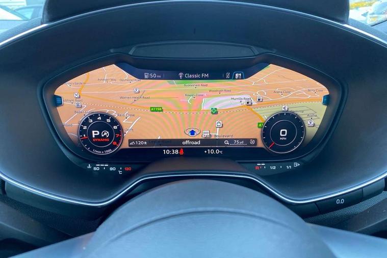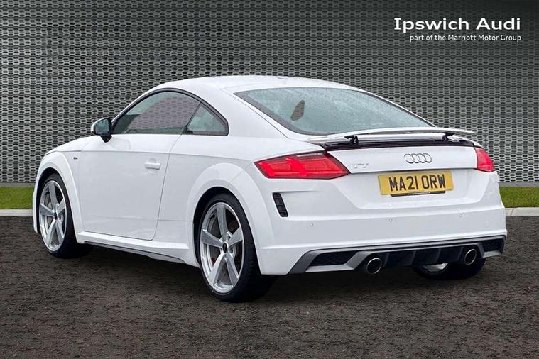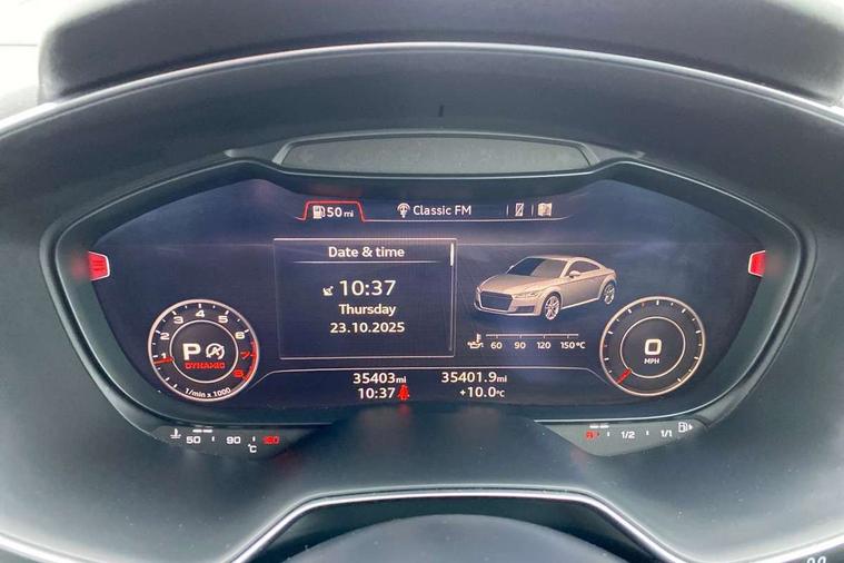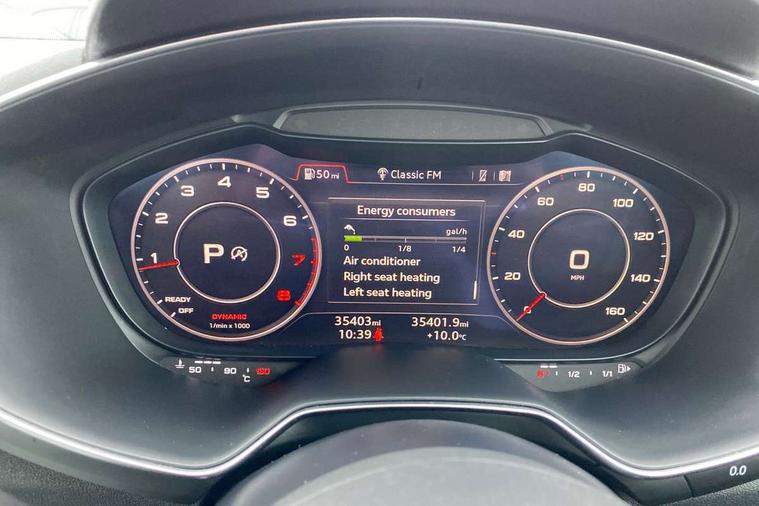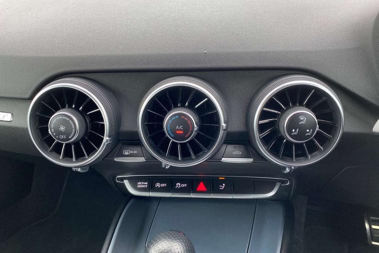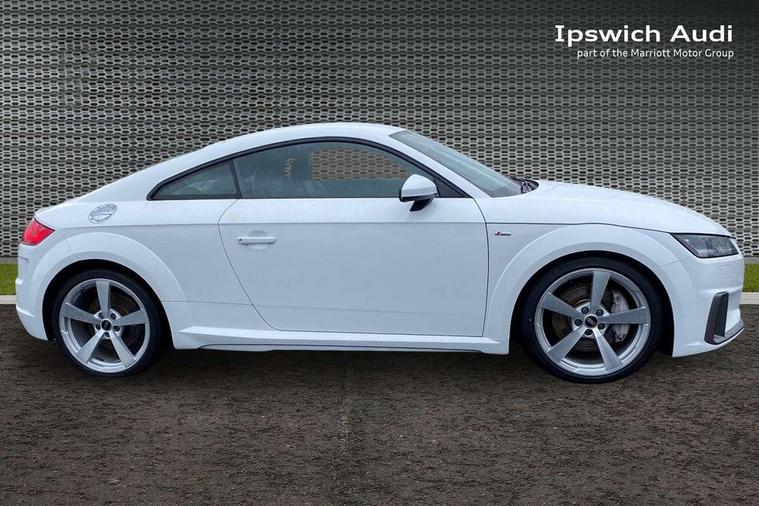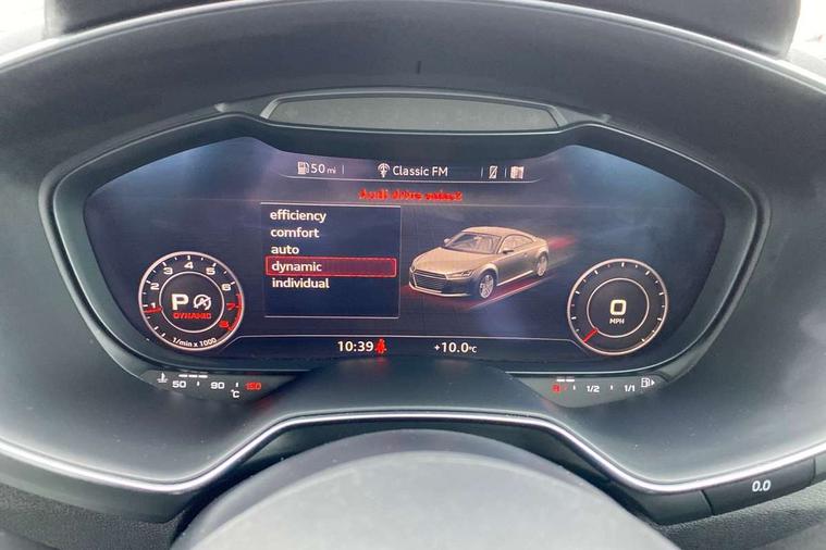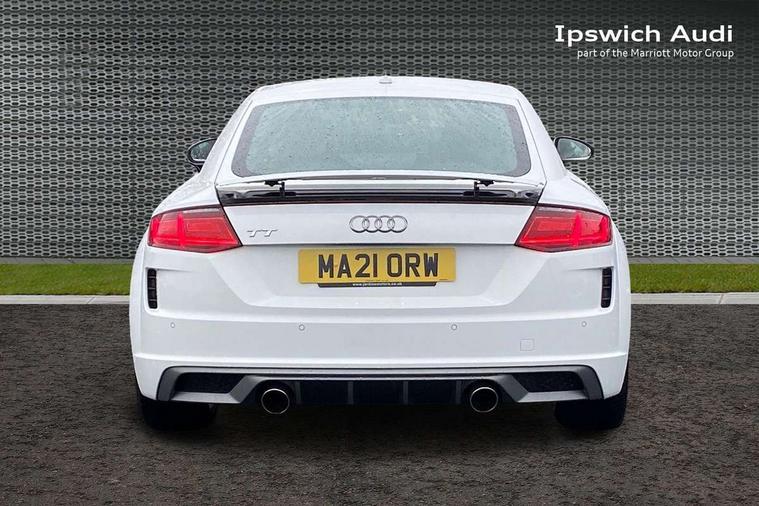 Audi drive select with 4 Pre configured modes, Audi smartphone interface, Audi virtual cockpit - 12.3" high-resolution LCD display with fully customisable instrument cluster, Cruise control + speed limiter, MMI touch panel, Mobile phone preparation with bluetooth interface, Progressive power assisted steering, Service interval indicator, Start/Stop system with energy recuperation, TP memo, S line sports suspension, AM/FM radio, Bluetooth audio streaming, DAB Digital radio, MMI Radio with CD player and SD/XC card slot, Auto dimming rear view mirror, Auto headlight range control, Body colour bumpers, Body colour electrically adjustable and heated door mirrors with built in LED side indicators, Electric folding door mirrors, Electric front windows, Front fog lights, Green tinted heat insulating glass, High gloss black radiator grille, LED daytime running lights, LED headlights with LED rear lights + dynamic rear indicators, Light and rain sensors, Retractable rear boot spoiler, S line badges on front wings, S Line front and rear bumpers, S line rear diffuser with platinum grey insert, S line side sills, Sunband for windscreen, 12V socket, 3 spoke flat bottomed high multi-function leather sport steering wheel with gearshift paddles, 4 way electric lumbar support for driver and front passenger, Black headlining, Door sill trims with S line logo, Extended aluminium look with stainless steel pedals, Front centre armrest, Front super sports seats, Heated front seats, Height adjustable driver's seat, Height adjustable front head restraints, Height/reach adjust steering wheel, ISOFIX child seat mounting for front passenger seat with airbag deactivation, Perforated leather gearknob in black, Rear head restraints, Rear top tether child seat ISOFIX attachment, S Line badge on steering wheel, Split folding rear seat, Non smoking pack - TT/TT RS, 3 point front seat belts, ABS, ASR traction control, Brake energy regeneration, Curtain airbags, Driver and front passenger airbag with front passenger airbag deactivation, EDL traction control, Electromechanical parking brake, ESP, First aid kit, Front side airbags, Head airbags, Hill hold assist, Seatbelt warning, Tyre pressure warning, Warning triangle, Anti theft alarm, Anti theft wheel bolts, Immobiliser, Keyless Go, Remote central locking, Matt brushed aluminium inlays, Tool kit, Tyre repair kit,