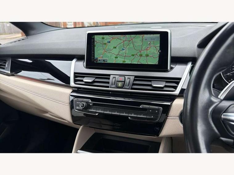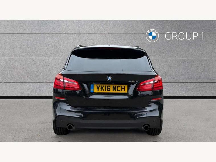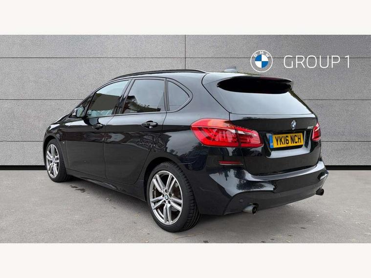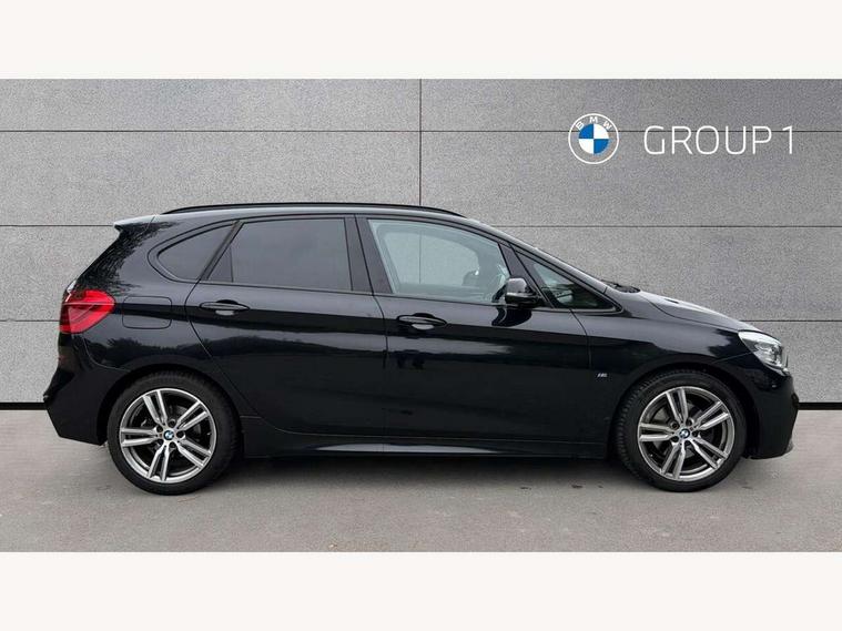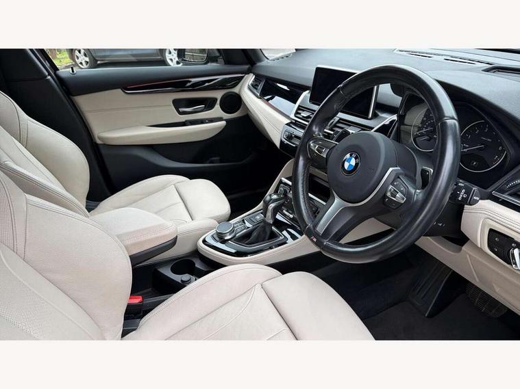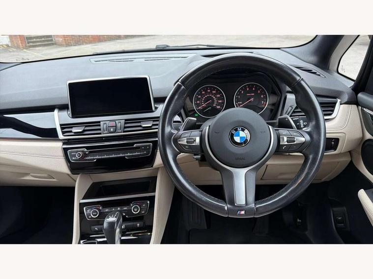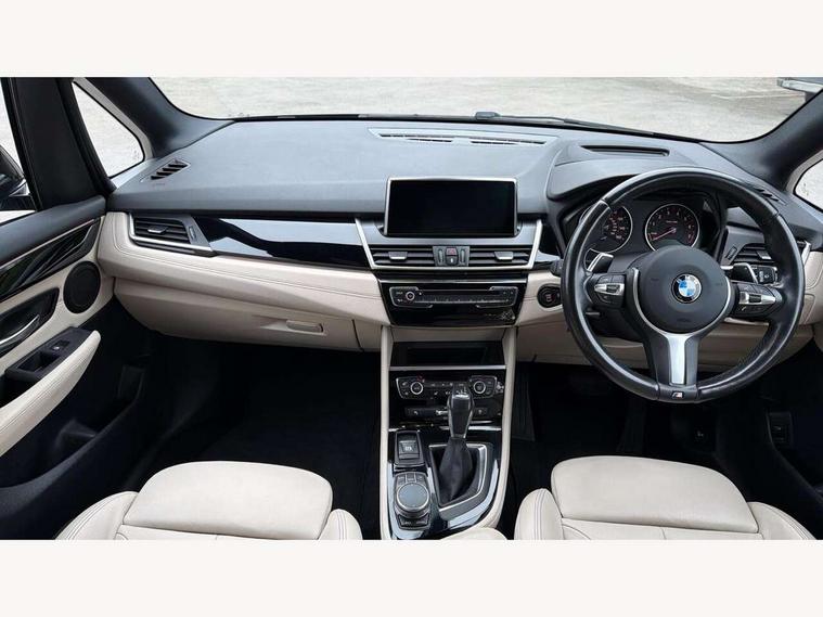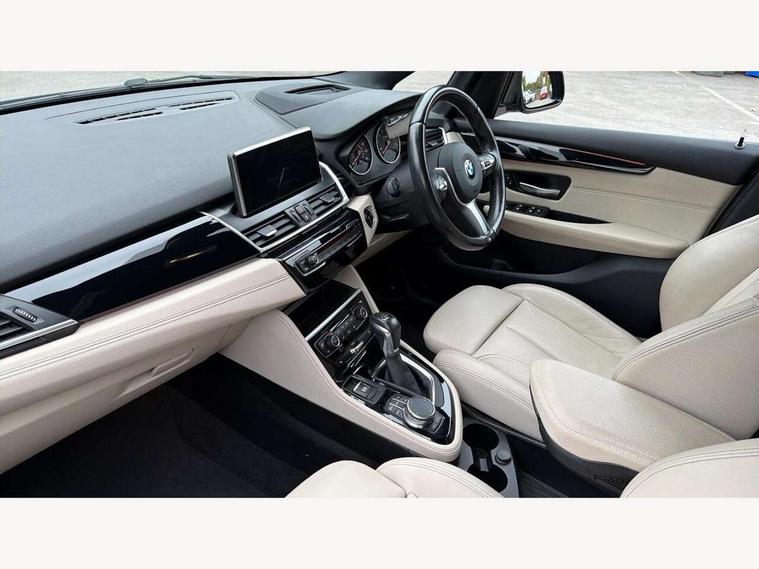 Automatic tailgate operation, BMW Teleservices, Check control system, Forward collision warning, Lights on warning, Oil temperature gauge, On board computer, Outside temperature display, Personal Profile, Rear parking distance control, Service interval indicator, Speed limiter, Stop/start button, Drive Performance Control, Electronic differential lock, Auxiliary point for auxiliary devices, Bluetooth audio streaming, BMW professional radio/CD/MP3, DAB Digital radio, Body colour bumpers, Body colour door handles, Body colour door mirrors, Body colour roof mouldings, Chrome exhaust tailpipe, Chrome kidney grille with black vertical slats, Door mirror integrated indicators, Door sill finishers, Electric adjustable heated door mirrors, Electric front windows/one touch facility, Follow me home headlights, Front fog lights, Heat insulating tinted glass, Heated windscreen washer jets, High beam assistant, LED daytime running lights, M aerodynamic body styling, Rain sensor including auto headlights activation, Rear wiper, Welcome lighting, 12V sockets in front centre console and passenger footwell, 3 rear headrests, 3 spoke leather M sport multifunction sports steering wheel, 4 grab handles, 40:20:40 split folding rear bench seat, Anthracite headlining, Anthracite Velour floor mats, Dakota leather upholstery, Dual zone automatic air conditioning, Front armrest, Front cupholders x 2, Front head restraints, Front sports seats with electric side bolster adjustment, Front/rear armrests within door panels, Glovebox with lid, Isofix front passenger and rear seat preparation, Luggage compartment lighting, Reach + rake adjustable steering column, Rear centre armrest, Sliding rear seats, Sunvisors, Sunvisors with vanity mirrors, Extended storage pack - 2 Series Active Tourer, 3 point seatbelts on all seats, ABS, BMW emergency call, Brake assist function, Childproof rear door locks, Collision mitigation braking system, Crash Sensor - activates hazard/interior lighting + unlocks doors, Driver/Front Passenger airbags, DSC+, Dynamic Traction Control - DTC, Front and rear curtain airbags, Front passenger airbag deactivation, Front seatbelt force limiters, Front seatbelt pretensioner, Front side airbags, Hill start assist, Seatbelt warning, Side impact protection, Tyre pressure monitoring system, Warning triangle and first aid kit, Electronic immobiliser, Key integrated remote control central locking, Locking wheel bolts, Remote control Thatcham category 1 alarm, 18" M sport light alloy wheels - style 486, Low rolling resistance tyres,