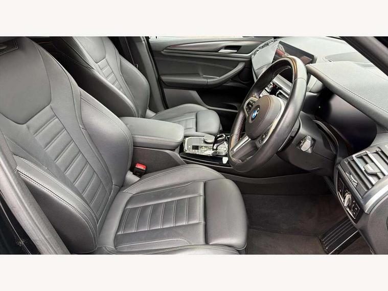 Active Guard, Attentiveness assist, BMW Live Cockpit Professional nav system including 12.3" instrument display + 12.3 high resolution control display, BMW Online services, BMW Teleservices, Brake pad wear indicator in front and rear, Check Control warning system for monitoring of lights and door/luggage compartment open warning, Condition based service - BMW service history, electronic service booklet, integrated owner's handbook, Connected drive services, Deletion of driving assistant professional, Electric boot lid, Front/rear Parking distance control, iDrive touch controller with 8 favourite buttons, Instrument cluster with speedometer with mph readout, tachometer, fuel gauge and oil temperature gauge, Lights on warning by audio warning signal when ignition is switched off, Oil sensor for level and grade, warning by check control system, On board computer - average speed+fuel consumption, service interval, clock/date, odometer/trip meter, outside temperature display and ice warning, Optimum shift indicator, Personal Profile - automatic lock when driving away selectable, Run flat indicator, Stop/start system, Variable sports power steering with drive performance control Sport+ mode, Diesel particulate filter, Incorrect fuelling protection, Larger capacity fuel tank, M Adaptive suspension, M Sport differential, Multi-link rear suspension, Performance Control, Sport automatic transmission with gearshift paddles, BMW professional radio/CD/MP3, DAB tuner, Acoustic glazing, Automatic windscreen wipers and automatic headlight, Black finish on B pillars, BMW individual high gloss shadow line with extended content, Body colour door handles, Body colour roof mouldings, Body coloured bumpers, Direction indicator, side repeaters, integrated in exterior mirrors, Dynamic brake lights, Electric adjust heated aspherical door mirrors, Exhaust tailpipes - dual, round, split left and right with chrome finisher, Fingertip control / anti-trap function on electric window, Folding wing mirrors with auto dimming, Follow me home headlights, Front and rear bumper system with replaceable deformation elements, Front and rear electric windows, Green tinted heat insulating glass, Heated windscreen washer jets, High beam assistant, High gloss black shadow line roof rails, High gloss shadowline exterior trim in decorative moulding side frame/recess cover/guide rail/B, C pillars/mirror frame and triangle with mirror base, High level 3rd brake light incorporating LED Technology, Interior rear view electrochromatic mirror with automatic anti dazzle function, Kidney frame and struts painted in high gloss black, LED tail lights, Lightweight engineering, M aerodynamic bodystyling, M black mirror caps, M Sport entry door sill strips, Model designation, Rain sensor, Rear side wing doors, Rear wing door, Rear wiper, Shark fin antenna, Side exterior M designation badges, Sun protection glass, Visible VIN plate, Welcome lighting, Windscreen wipers with adjustable interval, 12V power point in luggage area, 12V power socket in front centre console, 2 x USB Type C ports for charging and data transmission (front centre console) and 2 x USB Type C ports for charging (rear centre console), 3 rear headrests, 3 seat bench in 2nd row, 3 zone automatic air conditioning, 4 lashing points to secure luggage, 40:20:40 split folding rear seat with loading system, Ambient lighting, Anthracite headlining, Automatic interior light when door is opened/ignition switched off or via remote key, Electric adjustable seats with memory function, Floor mats in velour, Foldable storage floor with compartment, Four grab handles integrated in roof lining, Front and rear bottle holders integrated into door trim storage compartments, Front and rear side armrests integrated into door trim, Front centre armrest with storage compartment, Front footwell lights, Front head restraints, Front passenger seat, Front/rear courtesy lights with soft on/off dimming, Front/rear reading lights, Heated front seats, Isofix rear child seat preparation, Leather gear knob, Lockable glove compartment, Luggage area underfloor compartment, Luggage compartment lighting, M sport leather steering wheel, Multifunction steering wheel, Parcel shelf removeable and storable under boot floor, Reach and rake adjustable steering column, Rear centre armrest with 2 cupholders, Removable / retractable luggage cover, Slope adjustable rear seats, Storage compartment in rear centre console and front/rear door trims, Sun visors with vanity mirrors and ticket pocket, Toolkit located in luggage compartment, Two front cupholders with removable oddments tray/lid, Vernasca leather upholstery, Connected pro pack - X3, Active protection, ADB - Automatic Differential Brake, Anti-lock braking system (ABS) with brake assist, Automatic Stability Control (ASC), Battery safety cut-off, BMW emergency call, Brake drying, Brake energy regeneration, Braking pre-tensioning, Child locks on rear doors, Cornering brake control (CBC), Crash Sensor - activation of central locking release, hazard warning light and interior lighting, Deactivation of fuel pump in the event of a crash, Driver and front passenger front and side airbags with passenger deactivation and ITS front and rear head airbags, Driver and front passenger knee airbag, DSC+, Dynamic brake control, Dynamic Traction Control - DTC, Electromechanical parking brake, Hill descent control, Hill start assist, M sport seatbelt, Seatbelt security check for front seats, Side impact protection, Three point seatbelts to all seats with front and outer rear pyrotechnic belt tensioners and seat belt force limiters, Two tone horn, Tyre pressure sensor, Ventilated front and rear disc brakes, Warning triangle and first aid kit, Central locking switch for all doors, fuel filler cap and luggage compartment, Electronic engine immobiliser, Locking wheel nuts, Remote control including two integrated key - one button for open/close all lockable content, windows and separate butto