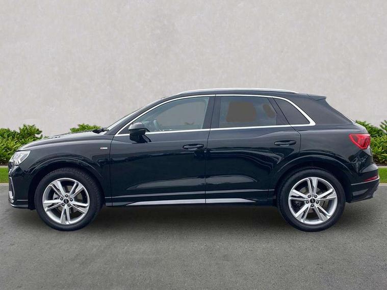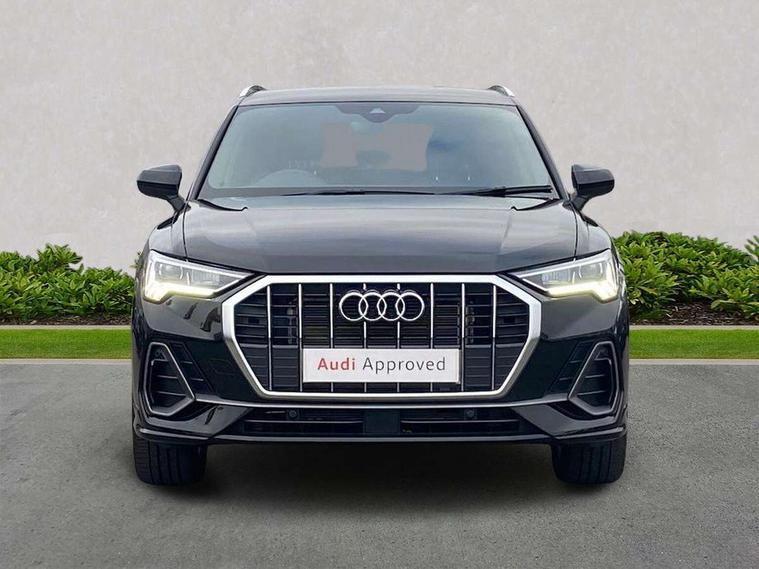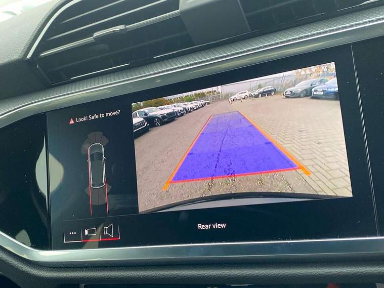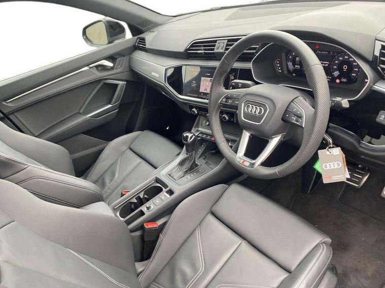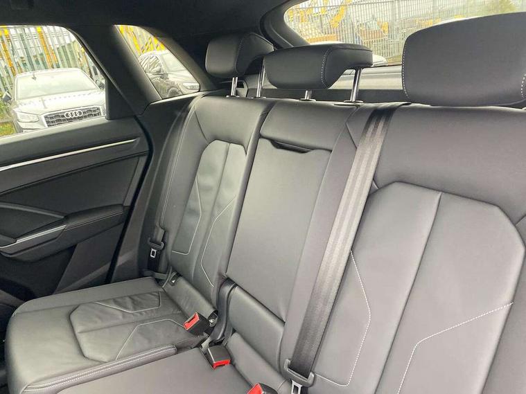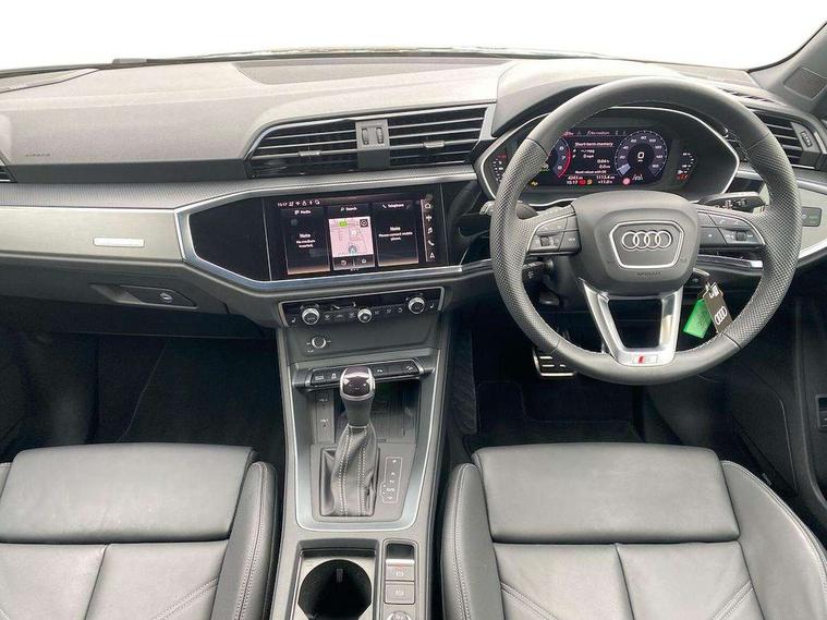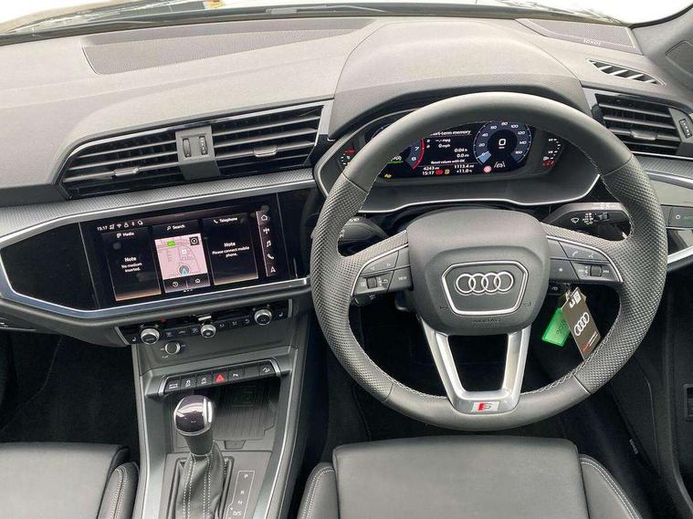 Amazon alexa Integration, Audi connect safety and service, Audi drive select, Audi lane departure warning, Audi Virtual Cockpit - 10.25" display, Bluetooth interface, Camera based traffic sign recognition, Distraction and Fatigue warning, Legal emergency call, MMI Navigation Plus with high resolution 10.1 inch touchscreen colour display, Power operated tailgate, Progressive steering, Service interval indicator, Smartphone interface includes wireless Apple carplay/Android Auto, Start stop system with recuperation, Voice control system with natural language interaction, Sports suspension, 2 USB-C ports with charge and data functions, 6 passive loudspeakers, DAB digital radio module, Acoustic windscreen, Aluminium roof rails, Aluminium window trim, Anthracite black radiator grille, Auto dimming door mirrors, Auto dimming frameless rear view mirror, Body colour front spoiler blade, Electrically folding, adjustable and heated door mirrors with integrated LED side indicators and kerb view function for passenger side, Front and rear electric windows, Front fog lights, Front side air inlets in matt platinum grey, Grille vertical bars in aluminium silver/Matt, High gloss black finish B and C pillars, LED Dynamic rear indicators, LED headlights with LED daytime running lights, LED rear lights, LED third brake light, Privacy glass dark tinted rear and rear-side windows (from B-pillar backwards), Rain and light sensors, Rear diffuser grille in grained matt black, Rear diffuser strip in matt anthracite black, Rear side wing doors, Rear wiper, S line badges on front wings, S line front and rear bumpers and side skirts in contrasting Manhattan grey paint finish, Side skirt insert in matt Platinium grey, Variable front intermittent wipers, 12V socket in rear centre console, 3 seat bench in 2nd row, 3 spoke leather multifunction steering wheel features S badging and grips in perforated leather with contrast stitching, 40:20:40 folding with manual adjustment for 60:40 forwards/backwards position and backrest angle, Adjustable rear seat bench/backrest with centre armrest and cupholder, Black cloth headlining, Dual zone electronic climate control, Electric lumbar support, Front and rear black floor mats with contrast stitching in rock grey, Front and rear headrests, Front centre armrest, Height and reach adjustable steering wheel, Illuminated door sill trims with S logo, ISOFIX child seat mounting for front passenger with airbag deactivation and outer rear seat including top tether attachment point for outer rear seats, Manual front seats with height adjustment, Perforated leather gearknob, Single front passenger seat, Stainless steel luggage compartment sill finisher, Stainless steel pedals, Twin leather upholstery with front sport seats + S embossing, Non smoking pack - Q3, 3x3 point rear seatbelts, 6 airbags - Driver, front passenger, curtain and side windows, Audi pre-sense front with pedestrain and cyclist recognition, Electrically operated child locks on rear doors, Electromechanical parking brake, Electronic stabilisation control including ABS, ASR and EDL, Front seatbelt reminder, Hill descent control, Hill hold assist, Pre sense basic, Seatbelt monitoring, Tyre pressure warning, Warning triangle and first aid kit, Anti theft wheel bolts, Immobiliser, Remote central locking, Thatcham approved category 1 anti theft alarm, Aluminium look interior elements, Dark matt brushed aluminium inlay, Detail dashboard around MMI touch colour display in glass look, black with surround in aluminium look, Leatherette door armrest,