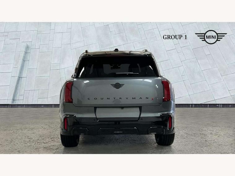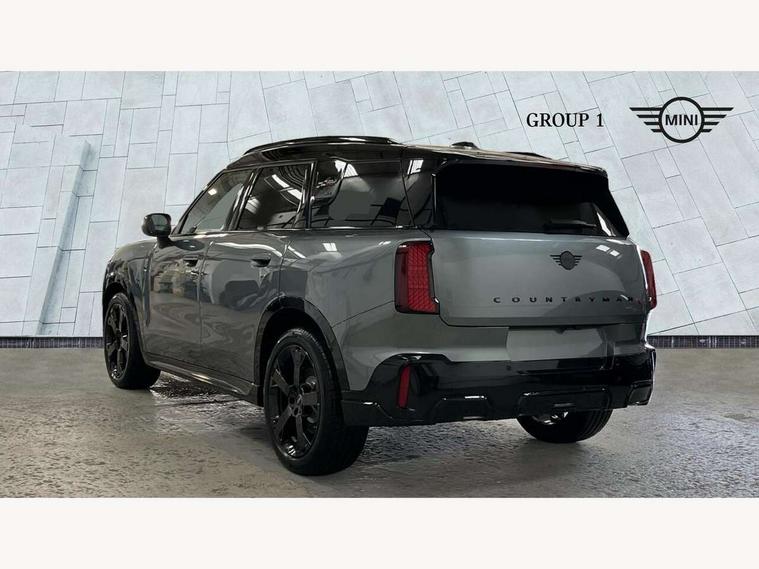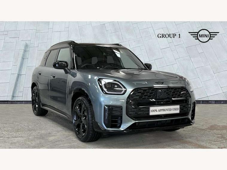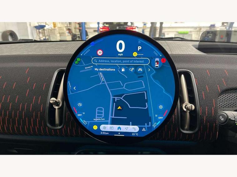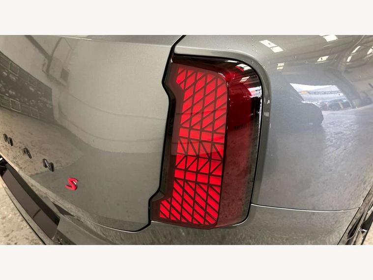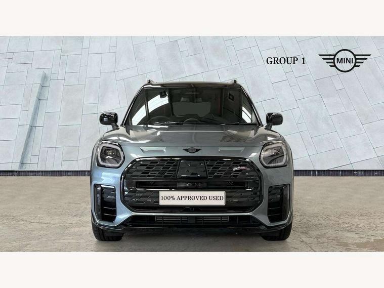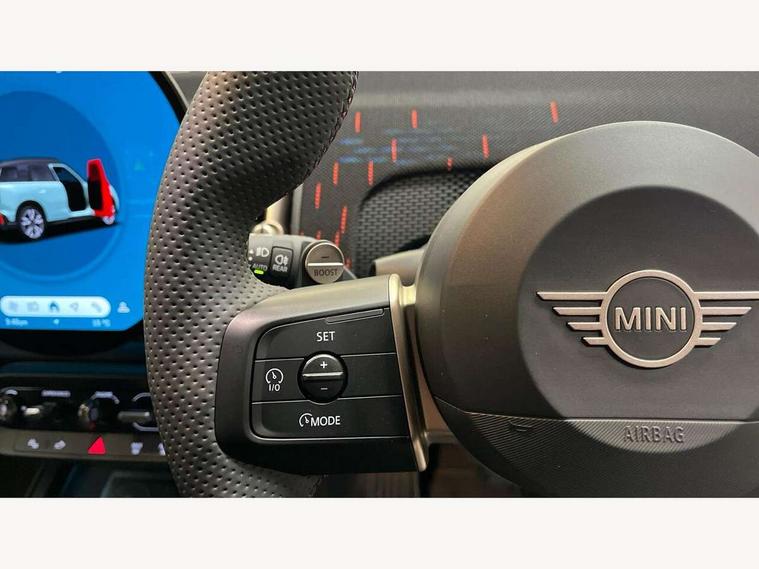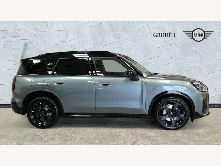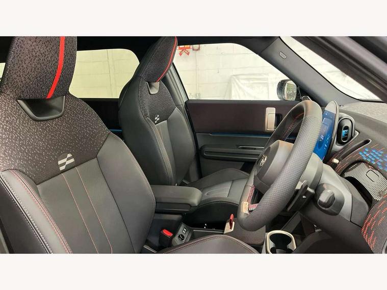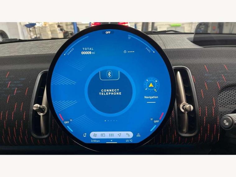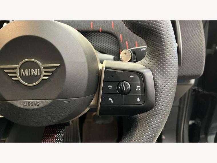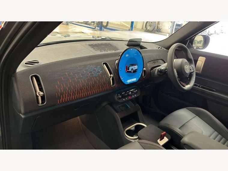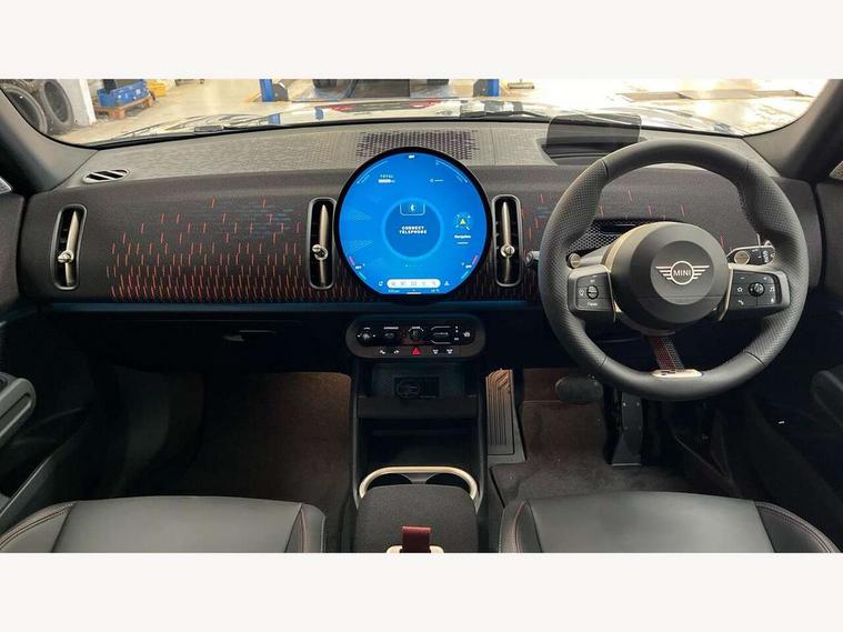 Bluetooth connection, Circular OLED Screen, Compatible mobile phone bluetooth with audio streaming, Cruise Control (DCC), Digital dashboard display, Driving assistant, Driving Assistant Plus Preparation, E-call, Electro-mechanical speed dependant steering assistance, MINI Experience Modes, MINI Head up display, Mini navigation system, MINI TeleServices, Parking assistant in camera and ultrasound based assistance system, rear view camera, parking aid and distance control, Adaptive suspension, Double clutch sports transmission, Larger capacity fuel tank, 6 speakers, DAB Digital radio, Personal eSim, Auto tailgate, Electric adjustable heated door mirrors, Front and rear apron, Front and rear electric windows, Heated rear window, High beam assistant, High gloss hexagonal patterned grille surround, Interior rear-view mirror with automatic anti-dazzle function, LED daytime running lights, LED headlights with extended contents including Adaptable light signatures, LED rear lights, LED third brake light, Rain sensor with auto headlights, Rear roof spoiler with airblades, Rear side wing doors, Rear window wiper, Roof rails, 3 Seat sliding rear bench in 2nd row, 60/40 split rear bench seat, Anthracite headliner, Auto air conditioning, Driver and front passenger seat heating, Floor mats, Front armrest, Front headrests, Heated steering wheel, Height and length steering column adjustment, JCW Front sports seats, Lidded storage box in Black/Red knit, Luggage compartment separating net, Perforated Vescin steering wheel, Rear headrests, Seat adjustment for rear seats, Single front passenger seat, Sunvisors with vanity mirrors, Vescin/Cloth upholstery, Wireless charging tray, Interior and exterior mirror package - Mini Countryman, 3x3 point rear seat belts, 6 Airbags - front, side, head and seat belt tensioners, ABS, Brake calipers in Black with JCW badge, DSC - Dynamic Stability Control, Electronic handbrake, Electronic Stability Programme (ESP), Front ISOFIX (iSize), Hill descent control, Hill hold assist, Hill start assist, JCW Sport Brakes, Manual rear child locks, Traction control, Tyre pressure monitoring system, Warning triangle, Alarm system with tilt sensor, monitoring doors, bonnet interior and tailgate, Auto drive away locking, Comfort access system, Deadlocking function, Electronic vehicle immobiliser, Locking wheel bolts, Remote control locking, Start/stop toggle with keyless go, JCW Black/Red dashboard knit, MINI Mobility Kit,
