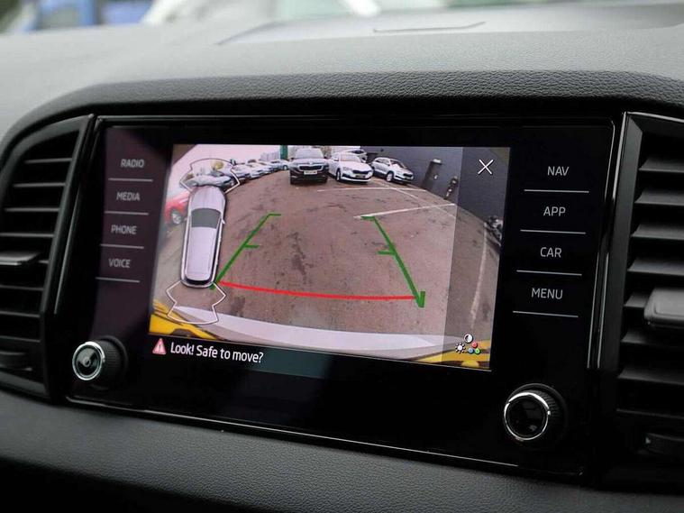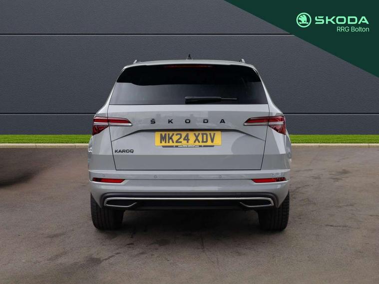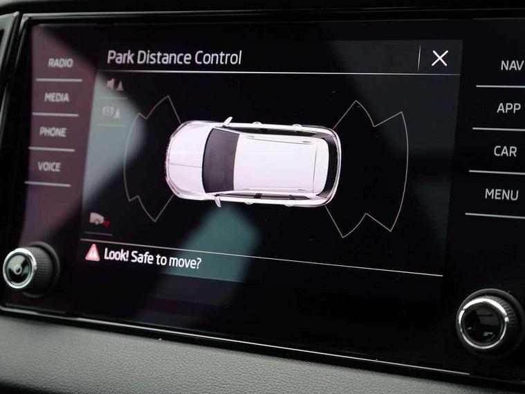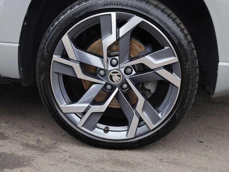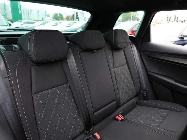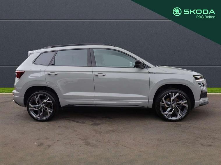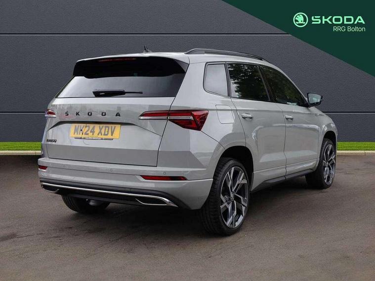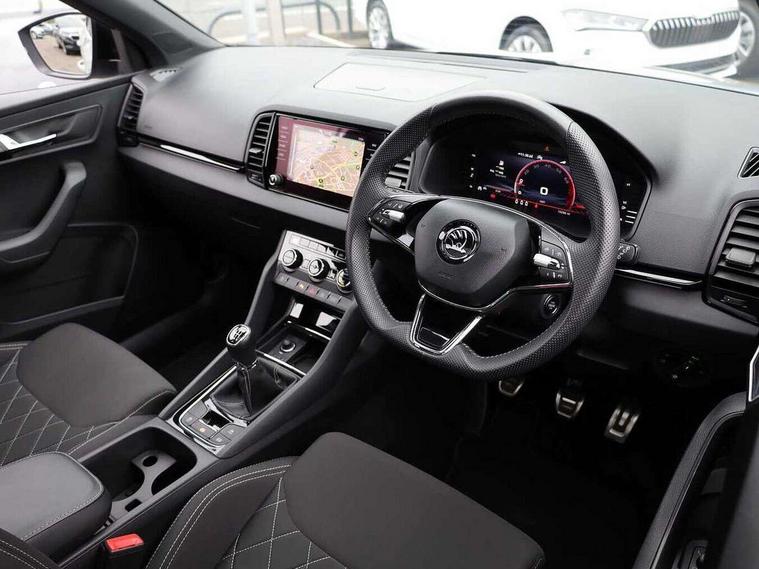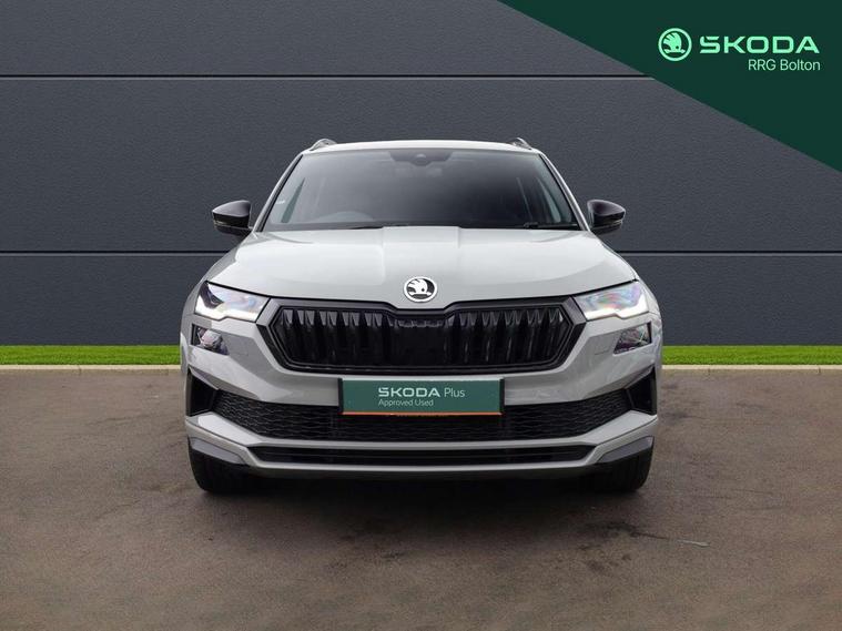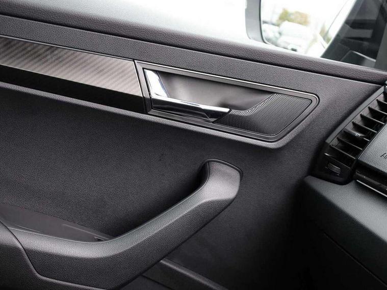 8" Digital display, Advanced driver attention and drowsiness monitor, Emergency services call system, Outside temperature gauge, Sensor for driver assistance systems, Service interval indicator, SmartLink wireless for Apple and wired for Android, Start/stop system with regenerative braking, USB C Port x 2 in front centre console, Virtual Cockpit - 10.25" digital display, Virtual pedal with electrically operated boot door, Wireless smartphone charging, Canton sound system, DAB radio with Bluetooth, USB connection, Acoustic glass, Aero front windscreen wipers with intermittent function, Auto dimming rear view mirror with light and rain sensors, Black door mirrors, Black electric window control buttons, Black radiator grille, Black roof rails, Body colour door handles, Electric front and rear windows with child proof lock, Front door steps with SportLine logo, Heated rear windscreen, LED 3rd brake light, LED daytime running lights, LED rear lights with high functionality welcome effect and dynamic indicators, Light assistant (coming/leaving home/tunnel light), Panoramic sliding sunroof, Plastic scuff plates in door apertures, Privacy glass, Protective door side sills in body colour, Rear diffuser, Rear side wing doors, Rear spoiler, Rear window wiper with washer system and intermittent control, Safety reflectors on front doors, Skoda lettering on tailgate in black, Sportline badge on front fender, Sportline decorative inserts with badging, Sports front and rear bumpers, 1.5 litre bottle holders in driver and front passenger door panels, 12V socket in boot, 12v socket in front centre armrest with storage compartment and rear air vents, 2 x Tablet holder, 3 rear height adjustable headrests, 3 seat bench in 2nd row, 3 spoke leather sports multifunction steering wheel and silver stitching, 4 foldable roof handles with rear coat hooks, Black floor carpet, Chrome inner door handles, Double sided boot floor, Foldable hooks in the boot, Front head restraints, Height adjustable front three point seats belts with tensioners, Height/reach adjust steering wheel, Ice scraper, Illuminated glovebox, Illuminated luggage compartment, Isofix child seat preparation for front passenger seat, Isofix child seat preparation outer rear, Manual lumbar support for front seats, Pen holder, Pollen filter, Rear boot cover, Rear reading lights, Rear seats fixed folding and divided 60:40, Rubbish bin door, Safety vest holder, Single front passenger seat, Storage box in upper central dashboard closed, Sunvisors with illuminated vanity mirrors, Textile floor mats, Ticket holder, Titan black interior ceiling, Umbrella under passenger seat, Under passenger seat storage compartment, Welcome animation with sportline logo, Light Pack - Karoq, Non Smokers pack, Automatic door unlocking in case of crash, Automatic fuel cut off in case of crash, Driver airbag, Electronic parking brake with auto hold function, Emergency rear braking signal, ESC including ABS, MSR, ASR, EDS, HBA, DSR, RBS, MKB and traction control, Front side airbags, Head airbags, Hill hold control, Knee airbags, Passenger airbag with switch-off function, Pedestrian monitor, Seatbelt reminder signalisation and pretensioner for all seats, Three point seatbelts rear, Two tone horn, Tyre pressure monitor, Alarm with interior monitoring, back up horn and tilt sensor with safe function, Electronic engine immobiliser, Keyless entry and start/stop, Remote central locking with 2 remote folding keys, Black air vent surround, Black centre console, carbon door decor, Satin black dashboard, Satin black door trim, 19" Sagittarius anthracite alloy wheels, Anti-theft wheel bolts protection, Breakdown and tool kit,
