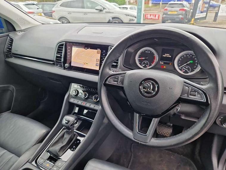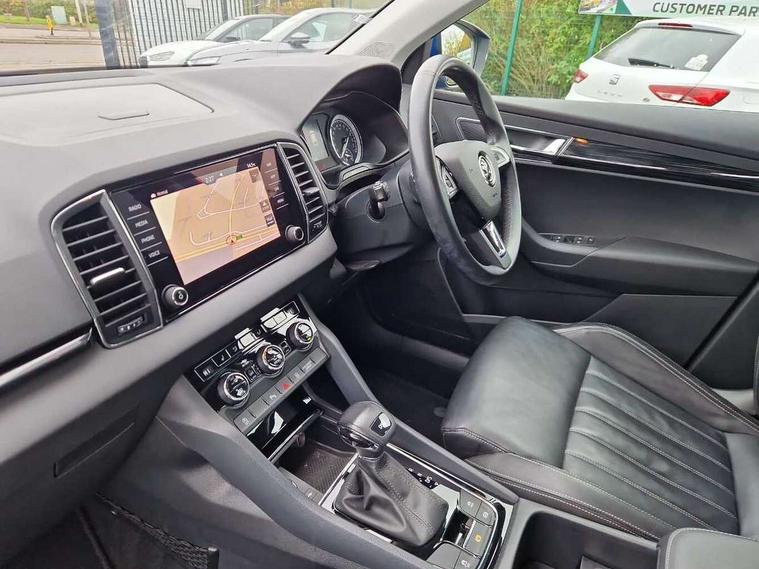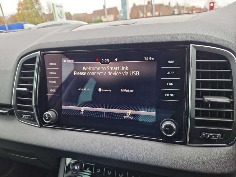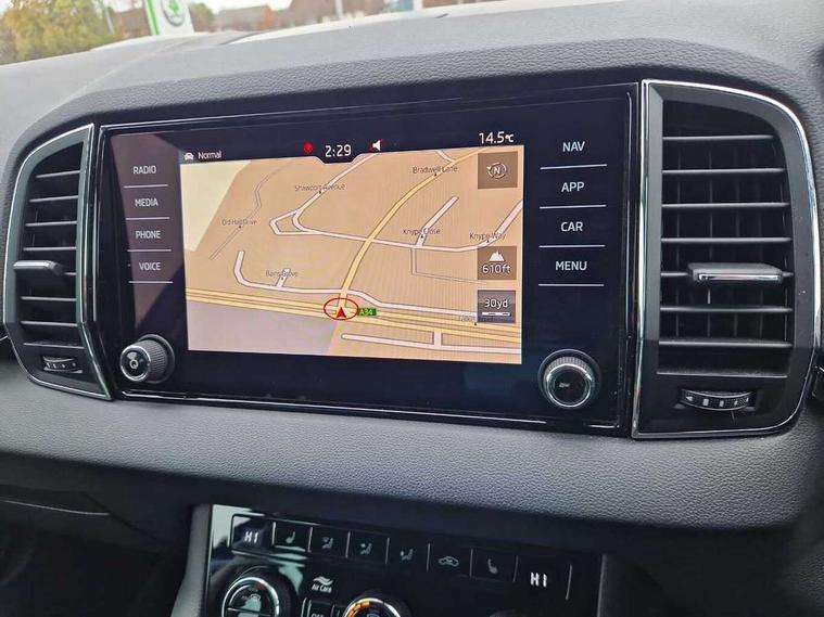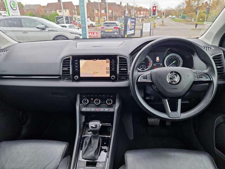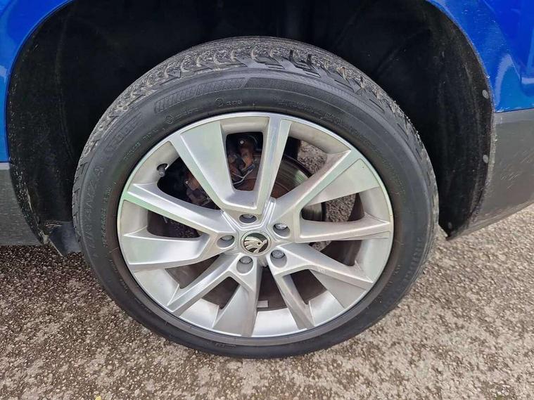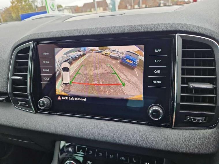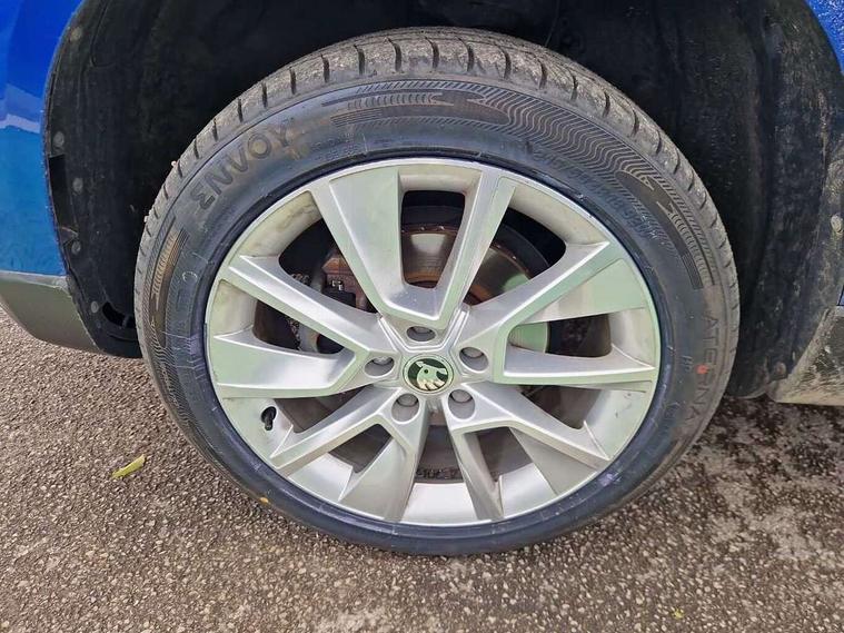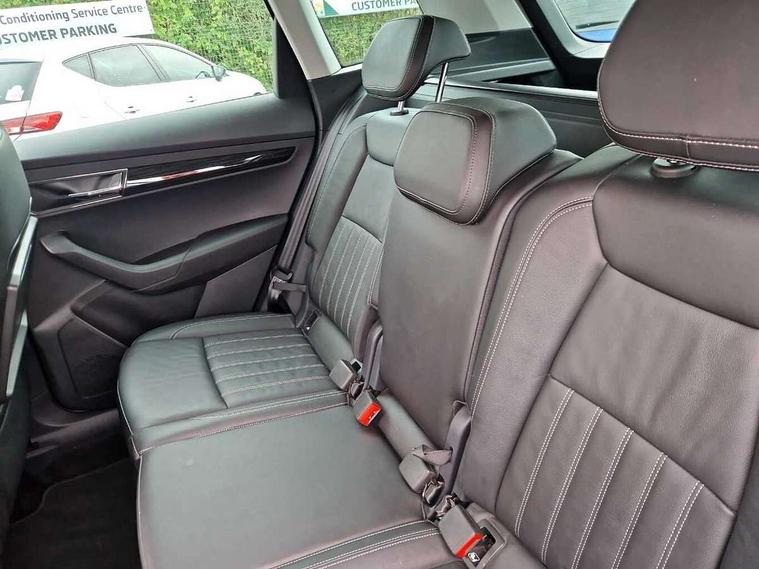 Drive mode selector, Driver alert system, Driver fatigue sensor, Driver profile selection, Multifunction colour trip computer, Outside temperature gauge, Rear view camera, Service interval indicator, Start/stop system with regenerative braking, DAB radio with Bluetooth, SD card slot, USB connection, Acoustic glass, Aero front windscreen wipers with intermittent function, Automatic headlight control system, Black electric window control buttons, Body colour door mirrors and handles, Body coloured bumpers, Electric front and rear windows with child proof lock, Full LED headlights + adaptive front light system + LED daytime running lights and front cornering fog lights, Headlight washers, Heated rear windscreen, LED rear lights with high functionality, Light assistant (coming/leaving home/tunnel light), Privacy glass, Safety reflectors on front doors, Third brake light, 1.5 litre bottle holders in driver and front passenger door panels, 12V socket in boot, 12v socket in front centre armrest with storage compartment and rear air vents, 2 Folding hooks and nets in boot, 2 Front readings lights for driver and passenger, 3 rear height adjustable headrests, 4 foldable roof handles with rear coat hooks, 4 lashing points on luggage floor, Backrest release, Cargo elements in boot, Chrome inner door handles, Dual zone climate control, Folding tables on the front seat backrests, Front seat and rear pockets, Height adjustable front three point seats belts with tensioners, Height adjustable passenger seat, Height/reach adjust steering wheel, Ice scraper, Illuminated and cooled glovebox, Illuminated luggage compartment, Isofix child seat preparation outer rear, Net programme in boot, Pen holder, Pollen filter, Rear boot cover, Rear reading lights, Rear seats fixed folding and divided 60:40, Removable LED torch in the boot, Retractable parcel shelf attachable to tailgate, Safety vest holder, Storage box in upper central dashboard closed, Storage compartment below the passenger seat, Sunvisors with illuminated vanity mirrors, Textile floor mats, Umbrella under passenger seat, VarioFlex seats with retractable parcel shelf, Chrome roof rails + chrome pack - Kodiaq, Airbags - Front side, head, knee and curtain, Automatic door unlocking in case of crash, Automatic fuel cut off in case of crash, Driver airbag, Electronic parking brake with auto hold function, Emergency rear braking signal, ESC including ABS, MSR, ASR, EDS, HBA, DSR, RBS, MKB and traction control, Front assist radar scanning of the space in front of the car with automatic braking, Hill hold control, Passenger airbag with switch-off function, Pedestrian monitor, Seatbelt reminder signalisation and pretensioner for all seats, Three point seatbelts rear, Two tone horn, Tyre pressure display, Tyre pressure monitor, Alarm with interior monitoring, back up horn and tilt sensor with safe function, Electronic engine immobiliser, Keyless entry and keyless start with safe system, Remote central locking with 2 remote folding keys, Chrome framed air vents, Storage on wheel cover,