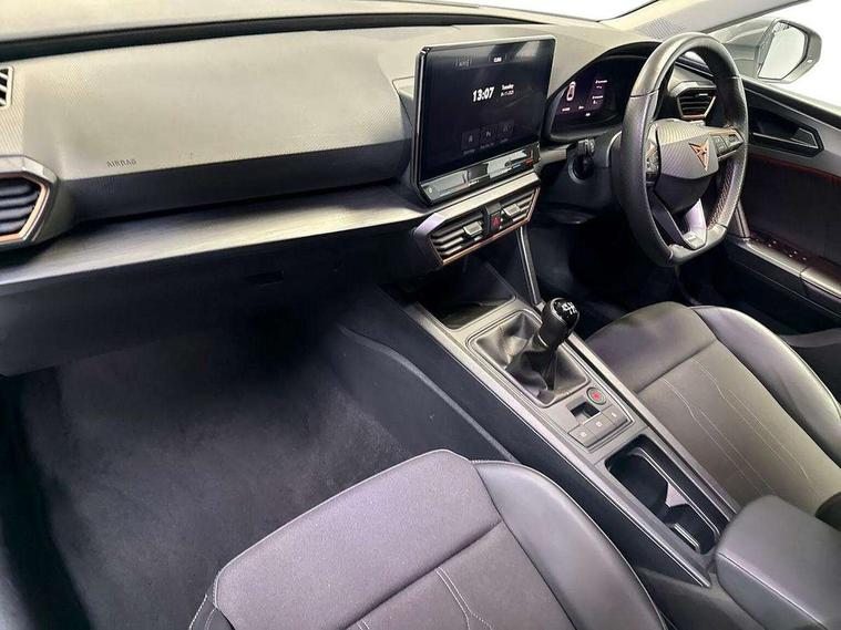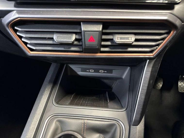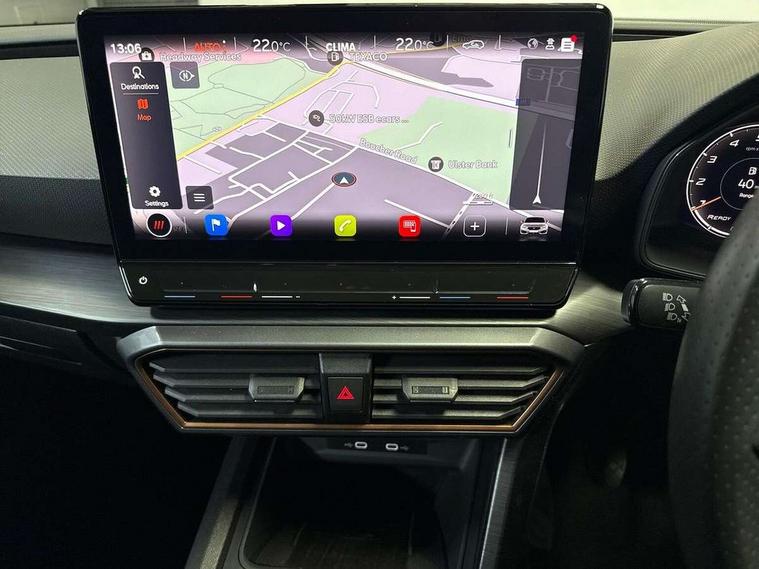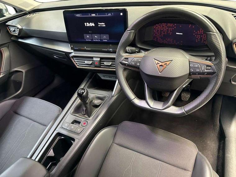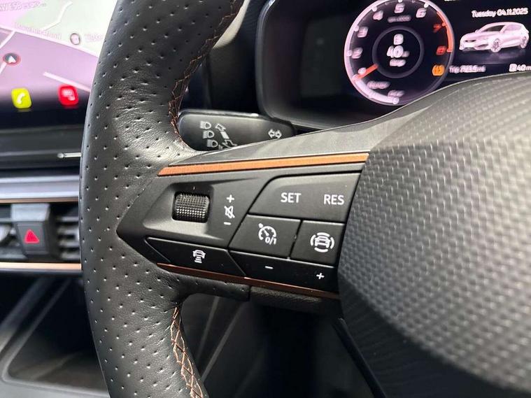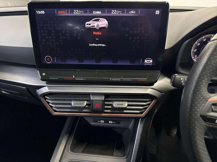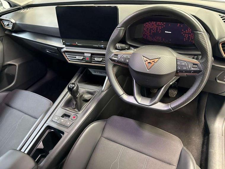 CUPRA drive profile selection with (Comfort/Sport/Individual), throttle response and gearshift mode, Digital cockpit, E-call, Electro mechanical speed sensitive power steering, Four x USB Type C ports (2 in front and 2 in rear), Front assist with forward collision warning braking reaction to vehicles, pedestrians and cyclists, Full link smartphone integration with Mirror Link, wireless Apple CarPlay and wired Google Android Auto, Lane assist, Lockable tailgate, Park assist (inc front/rear parking sensors), Rear view camera, RPM, trip computer, outside temp gauge, instrument light brightness, low fuel warning light, lights on reminder, gearshift indicator, Service interval indicator, Start/stop system with regenerative braking, Wireless phone charger, Sports suspension, Auxiliary input socket, Auto dimming rear view mirror, Body colour door handles, Body coloured bumpers, Cupra sports bumpers, Dark tinted rear windows, Electric front/rear windows, Electrically adjustable, heated and folding door mirrors, LED front fog lamps with cornering function, LED headlights with dynamic turn signals, tail lights, rear fog lights with rear coast to coast lighting, Rain sensing wipers, Rear diffuser with twin exhaust pipe on each side, Rear side wing doors, Rear wash/wipe, Separate daytime running light with automatic headlight control and coming home feature, Third brake light, 12v power supply in centre console, 3 seat bench in 2nd row, 5 headrests, 60/40 split rear bench seat with armrest, Ambient lighting with glovebox, footwell and single monocolour, Cupra Leather flat bottomed, perforated steering wheel, Driver/passenger manual seat height adjustment, Folding boot cover, Front and rear reading lights X 4, Front centre armrest, Front seats manual lumbar adjustment, Grey headlining, Height/reach adjust steering wheel, Illuminated interior front door sills, ISOFIX points in outer rear seats with top tether anchorage points, Jack and tool kit, PVC/Cloth upholstery with copper stitching, Single front passenger seat, Sports seats, Sunvisors with illuminated mirror, Three zone climate control, Media system plus with navigation pack - Leon Cupra, Safety and driving pack (M) - Cupra leon, 3 point seatbelts on all rear seats, ABS, Brake control system - ESC and brake booster, Child proof door locks, Cupra black brake calipers, Driver and front passenger airbags with front passenger airbag de-activation, front side and curtain airbags, Electronic parking brake, Extended safety system - seat belt tensioner, window closure and hazard lights, Hill hold control, Rear disc brakes, Seat belt reminder for front and rear seats, Tiredness recognition system, Tyre pressure monitoring system, Anti theft alarm system with interior monitoring in cab, backup horn and towing protection, KESSY Advanced - Keyless start, keyless entry, Locking wheel bolts, Chrome and copper interior detailing, 18" Machined sport black and silver alloy wheels with 92Y tyres,