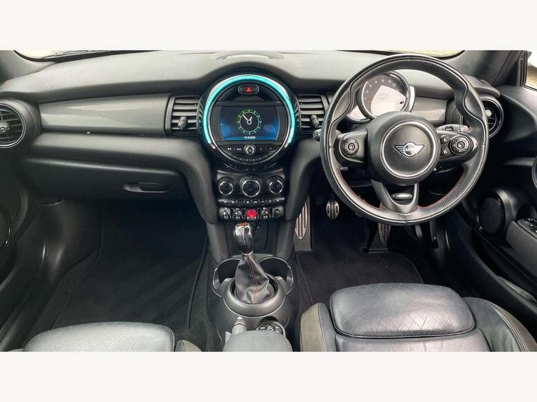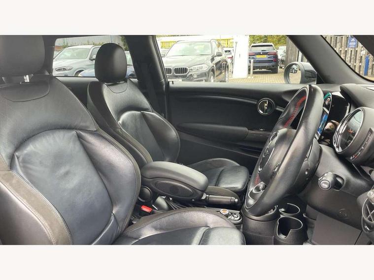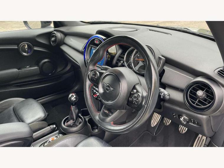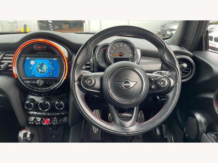 Automatic start/stop function with brake energy recuperation, Compatible mobile phone bluetooth with audio streaming, Electro-mechanical speed dependant steering assistance, Instrument cluster, Mini E-call, MINI TeleServices, On board computer, Service interval indicator, Double Vanos system, Fully variable valve control, High precision injection, Performance Control, 6.5" touchscreen with LED ring, FM tuner and DAB digital radio, Automatic headlight activation switch, Body colour fuel filler cap, Chrome border high gloss black slats radiator grille, Dynamic brake lights, Electric front+rear windows, Heated rear window, Heated windscreen washer jets, John Cooper Works - aerodynamic kit (front and rear apron, spoiler), front and rear sport bumpers and part-painted side sills with door sill finishers, John Cooper Works rear spoiler, LED headlight with closed ring and daytime driving lights, Left exhaust tailpipe with chrome finisher, Metal door sill strips with MINI imprint, Model logo Cooper on right of tailgate, Rain sensor window wipers, Rear fog lights, Rear LED lights with union jack design, Rear window wiper, Side scuttle panel with integrated indicator, Sun/heat protection glass, White indicator lenses, 12V Accessory socket in centre console, 4 lashing eyes in luggage compartment, 60/40 split folding rear seat, Anthracite headlining, Chrome interior highlights, Cupholders, Front and rear head restraints, Front and rear isofix with front passenger airbag deactivation, Glove compartment, Height and length steering column adjustment, Interior lighting with 12 basic colours selectable via toggle switch in roof, John Cooper Works leather steering wheel with contrasting stitching in Chilli Red with John Cooper Works logo, John Cooper Works Logo in seat, Leather gearshift lever and handbrake gaiters, LED reading lights, vanity mirror lights, front foot well light and spotlight on front seats, Manual air conditioning, Mechanical seat adjustment, driver seat height adjust, forward/back and front seats backrest, Mini logo projection on floor from drivers exterior mirror, Multifunction steering wheel, Storage compartments in doors, Sunvisors with vanity mirrors, 3 point seatbelts on all four seats, 6 Airbags - front, side, head and seat belt tensioners, Anti-lock braking system (ABS), DSC - Dynamic Stability Control, Front and rear disc brakes, Hill start assist, Single tone fanfare horn, Tyre pressure monitoring system, Alarm system with tilt sensor, monitoring doors, bonnet interior and tailgate, Electronic vehicle immobiliser, Start/stop toggle with keyless go, Tool kit,