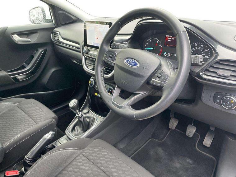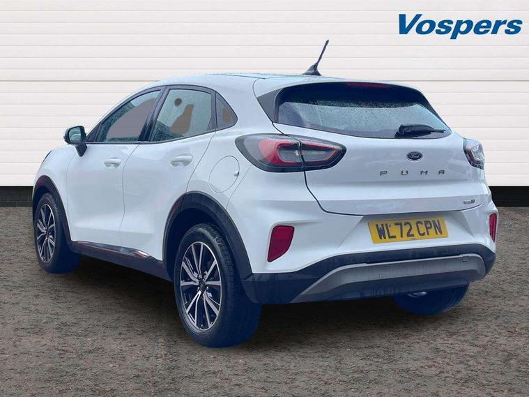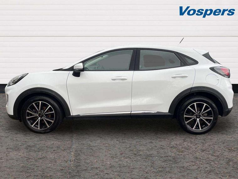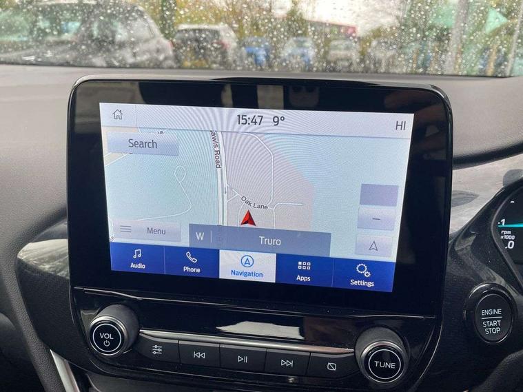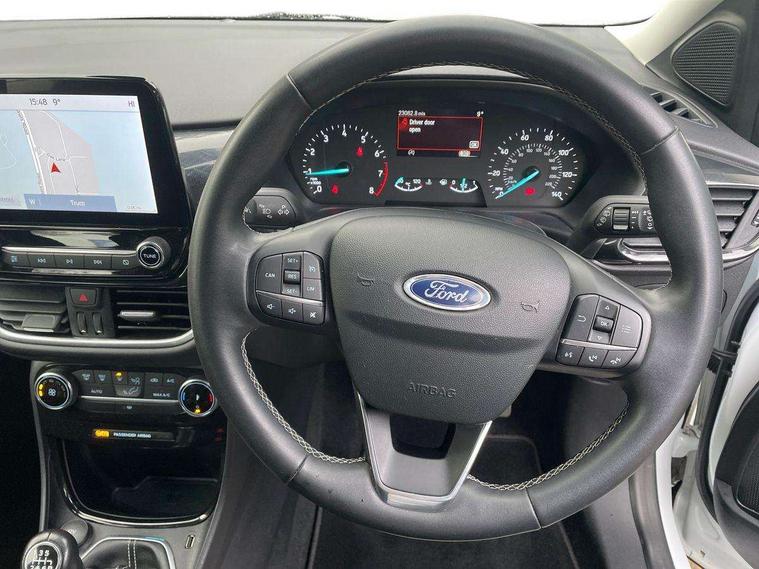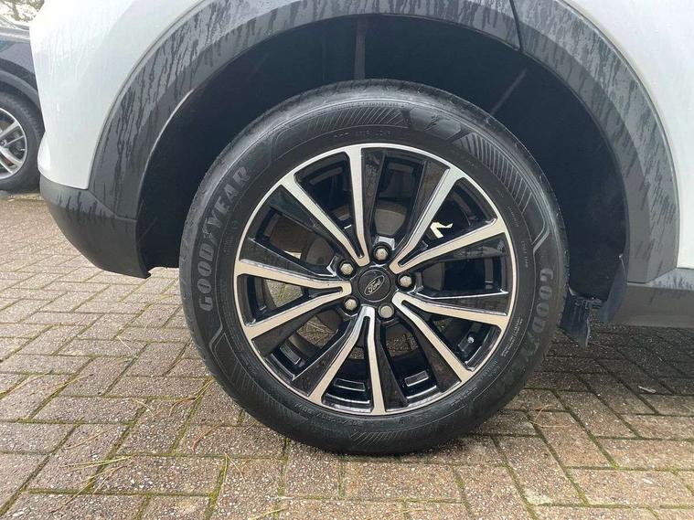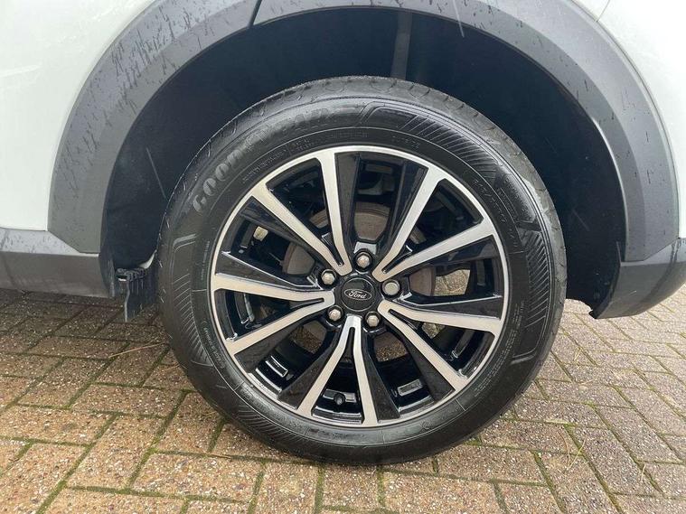 Driver impairment monitor, Emergency call service, Ford easy fuel, Lane keeping aid with lane departure warning, Power assist steering, Power start button, Rear parking sensor, Selectable drive modes(Normal, sport, Eco, trail, slippery), Speed sign recognition, Standard suspension, Automatic headlights with auto high beam, Automatic rain sensing wipers, Body colour rear spoiler, LED rear lamps, Power foldable heated door mirrors with puddle lamps, Projector headlamps with LED day time running lights and front fog lamps, Quickclear heated windscreen, Rear side wing doors, Rear wiper, Third brake light, 3 seat bench in 2nd row, Centre console with armrest and stowage, Electronic automatic temperature control (EATC), Ford megabox extended bootspace, Front and rear head restraints, Front floor mats, Manual 2 way passenger seat adjustment, Manual 4 way driver seat adjust with lumbar adjustment, Sensico leather steering wheel/gear knob/handbrake, Single front passenger seat, Titanium cloth upholstery, Ford SYNC 3 navigation pack - Puma, 3 rear seatbelts, Child safety lock, Electronic stability control (ESC) and hill start assist, Pedestrian/cyclist detection & post-collision braking, Pre collision assist system, Tyre pressure monitoring system (TPMS), Thatcham alarm, 17" 10 spoke absolute black machined finish alloy wheel,
