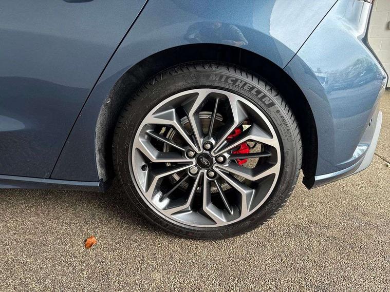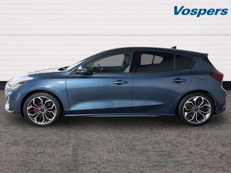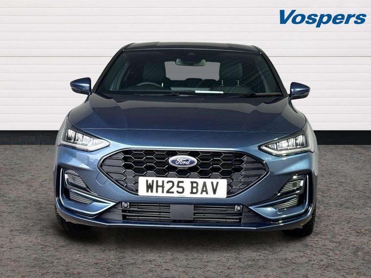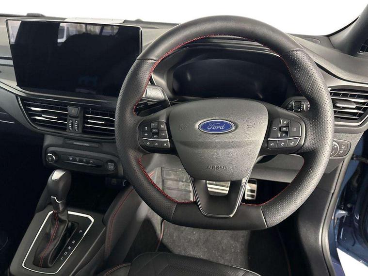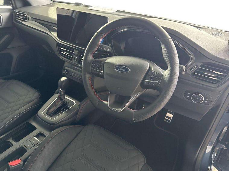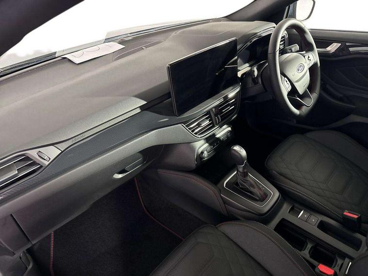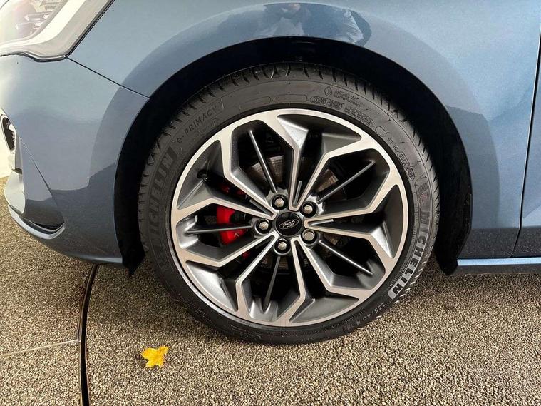 12.3" Digital instrument cluster, Bluetooth system, Digital clock, Easy fuel capless refuelling system, Eco mode, Ford SYNC4 Nav with 13.2'' touchscreen, DAB, Emergency Assistance, Apple Carplay & Android Auto, B&O Premium Audio with 10 speakers, FordPass Connect, Lane keeping system - lane keeping alert and lane keeping aid, PAS, Rev counter, Selectable drive mode, Service interval indicator, Trip computer, Wireless charging pad, Sports tuned suspension, 2 USB ports, Auto headlamps (on/off), Body coloured door handles, Electrically operated front and rear windows with one touch opening and closing, Electrically operated heated power fold door mirrors with puddle lamp with side indicators, Front variable intermittent wipers with electric wash, Heated rear window, LED daytime running lamp, LED rear lamps, LED third brake light, Polished twin tailpipe, Privacy glass, Quickclear heated windscreen, Rain sensor, Rear side wing doors, Tailgate wash/wipe, Unique ST-Line grille, full bodystyling kit, and large body coloured rear roof spoiler, 3 rear headrests, 3 seat bench in 2nd row, Dual zone electronic air temperature control, Full sensico premium upholstery, Height adjustable front headrests, Isofix child seat preparation, Load through ski hatch, Manual 2-way passenger seat adjust, Power 4-way driver seat adjust, with power lumbar adjust, Reach + rake adjustable steering column, Single front passenger seat, ST-Line Design pack - Focus, Winter pack - Focus, 3x3 point rear seatbelts, ABS+Electronic Brake force Distribution, Auto hold function, Driver airbag, EDL traction control, Electronic parking brake, Electronic stability control, Front and rear seatbelt reminder, Front inertia reel height adjustable seatbelts with pre-tensioners, Front passenger airbag, Front side airbags, Passenger airbag deactivate switch, Post collision braking, Pre collision assist with autonomous emergency braking and pedestrian/cyclist detection, Remote/power child rear door locks, Side curtain airbags, Three rear inertia reel lap/diagonal seatbelts, Tyre pressure monitoring system, Keyless entry and keyless start, MyKey system, Remote central locking & engine immobiliser, Thatcham alarm with power door dead locks, 18" 5x3 spoke pearl grey high gloss machined finish alloy wheels with mini spare wheel,