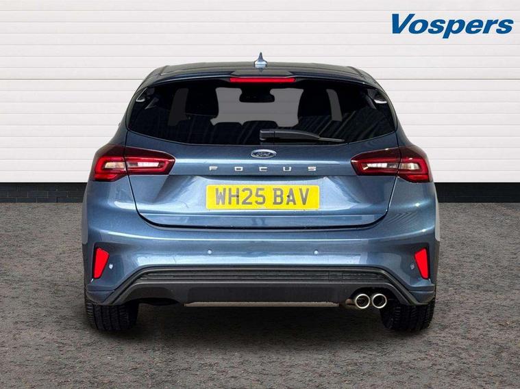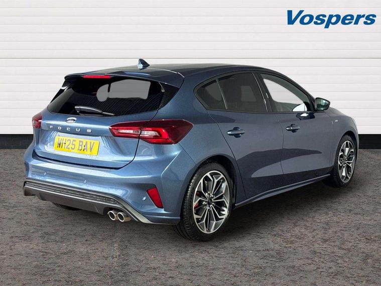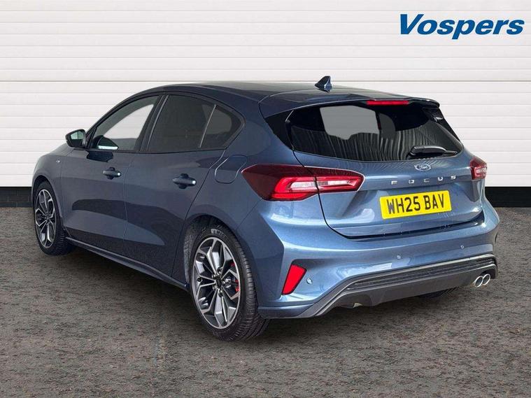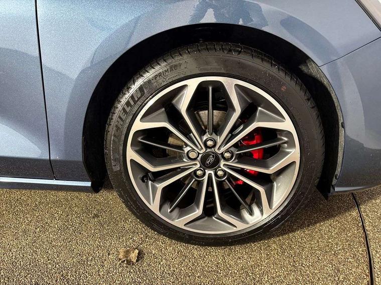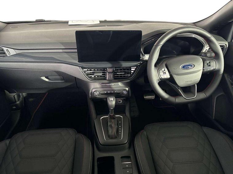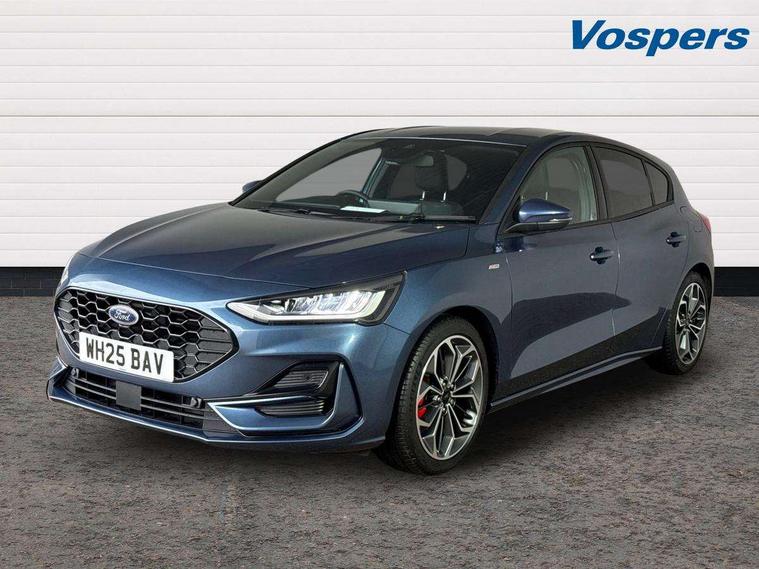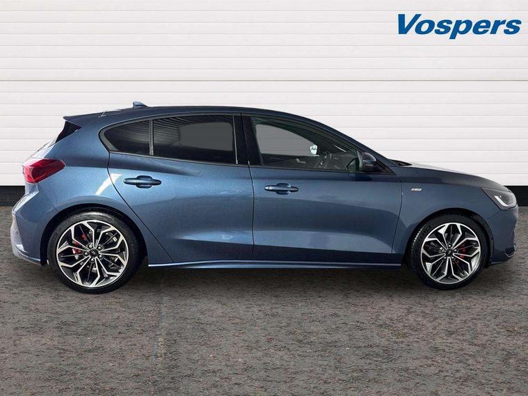 12.3" Digital instrument cluster, Bluetooth system, Digital clock, Easy fuel capless refuelling system, Eco mode, Ford SYNC4 Nav with 13.2'' touchscreen, DAB, Emergency Assistance, Apple Carplay & Android Auto, B&O Premium Audio with 10 speakers, FordPass Connect, Lane keeping system - lane keeping alert and lane keeping aid, PAS, Rev counter, Selectable drive mode, Service interval indicator, Trip computer, Wireless charging pad, Sports tuned suspension, 2 USB ports, Auto headlamps (on/off), Body coloured door handles, Electrically operated front and rear windows with one touch opening and closing, Electrically operated heated power fold door mirrors with puddle lamp with side indicators, Front variable intermittent wipers with electric wash, Heated rear window, LED daytime running lamp, LED rear lamps, LED third brake light, Polished twin tailpipe, Privacy glass, Quickclear heated windscreen, Rain sensor, Rear side wing doors, Tailgate wash/wipe, Unique ST-Line grille, full bodystyling kit, and large body coloured rear roof spoiler, 3 rear headrests, 3 seat bench in 2nd row, Dual zone electronic air temperature control, Full sensico premium upholstery, Height adjustable front headrests, Isofix child seat preparation, Load through ski hatch, Manual 2-way passenger seat adjust, Power 4-way driver seat adjust, with power lumbar adjust, Reach + rake adjustable steering column, Single front passenger seat, ST-Line Design pack - Focus, Winter pack - Focus, 3x3 point rear seatbelts, ABS+Electronic Brake force Distribution, Auto hold function, Driver airbag, EDL traction control, Electronic parking brake, Electronic stability control, Front and rear seatbelt reminder, Front inertia reel height adjustable seatbelts with pre-tensioners, Front passenger airbag, Front side airbags, Passenger airbag deactivate switch, Post collision braking, Pre collision assist with autonomous emergency braking and pedestrian/cyclist detection, Remote/power child rear door locks, Side curtain airbags, Three rear inertia reel lap/diagonal seatbelts, Tyre pressure monitoring system, Keyless entry and keyless start, MyKey system, Remote central locking & engine immobiliser, Thatcham alarm with power door dead locks, 18" 5x3 spoke pearl grey high gloss machined finish alloy wheels with mini spare wheel,