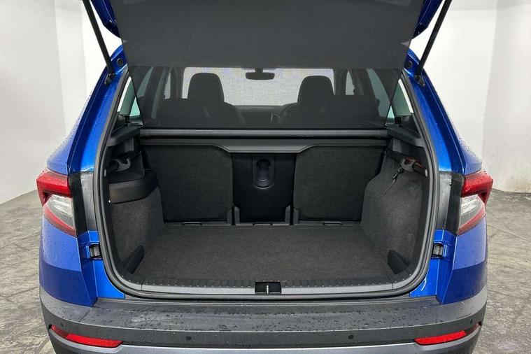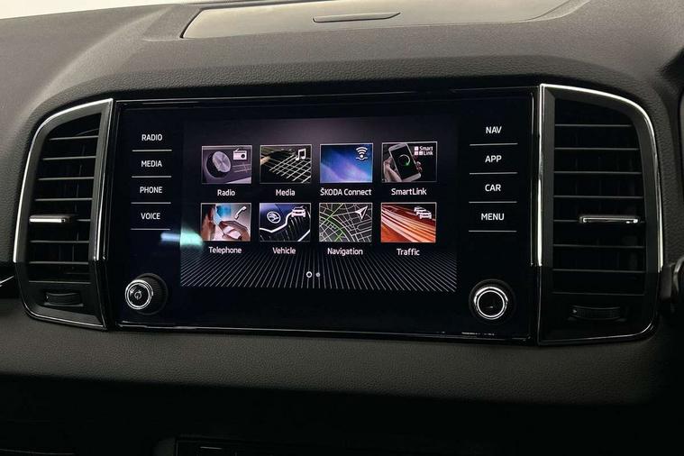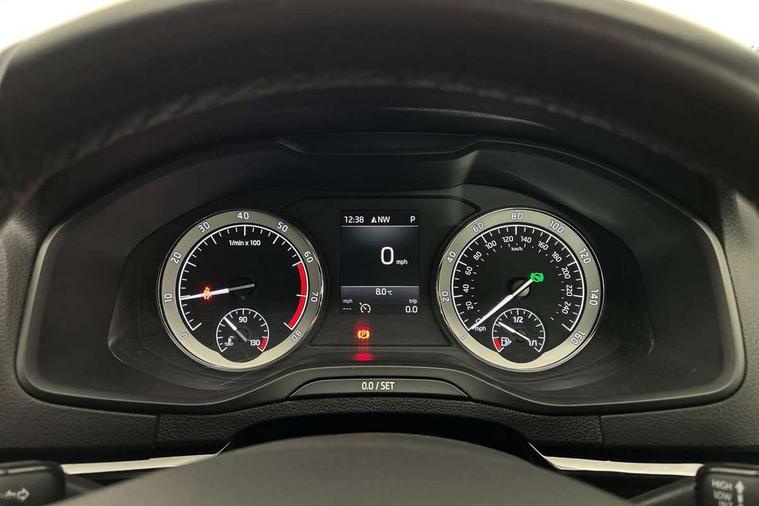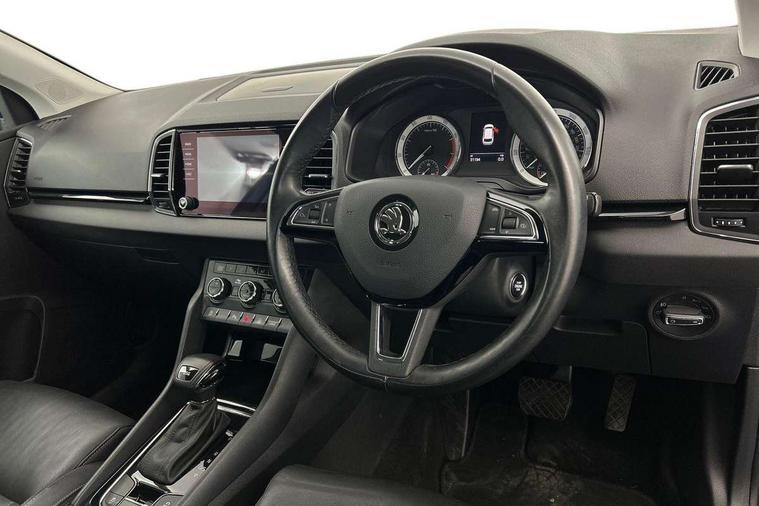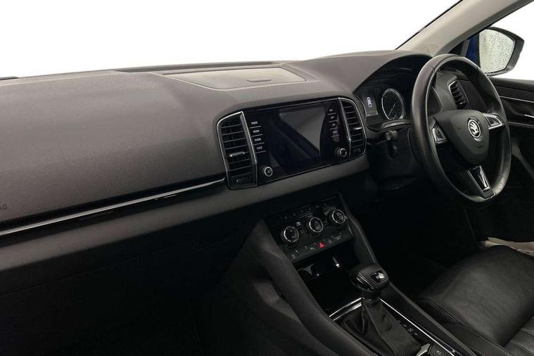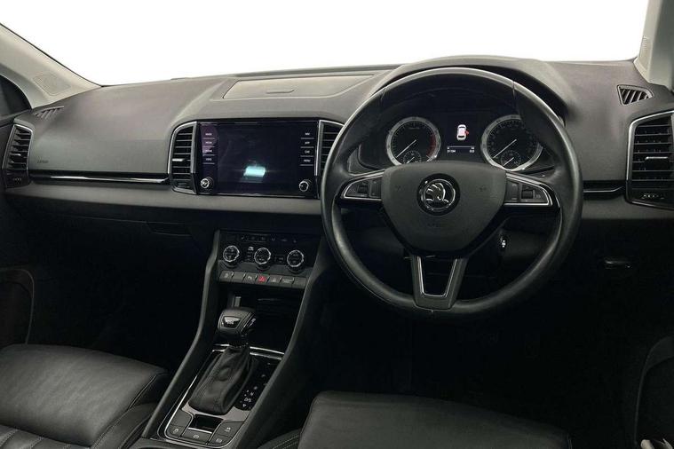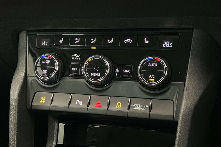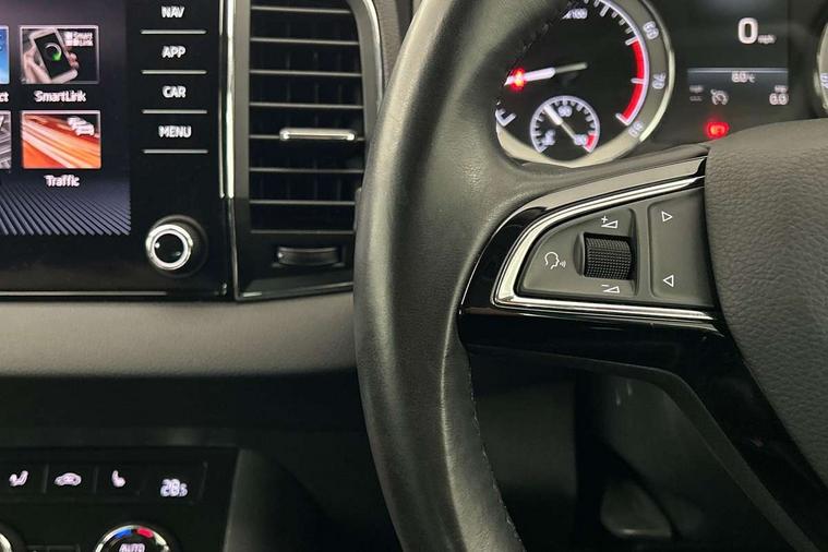 Drive mode selector, Driver alert system, Driver fatigue sensor, Driver profile selection, Multifunction colour trip computer, Outside temperature gauge, Rear view camera, Service interval indicator, Start/stop system with regenerative braking, DAB radio with Bluetooth, SD card slot, USB connection, Acoustic glass, Aero front windscreen wipers with intermittent function, Automatic headlight control system, Black electric window control buttons, Body colour door mirrors and handles, Body coloured bumpers, Electric front and rear windows with child proof lock, Full LED headlights + adaptive front light system + LED daytime running lights and front cornering fog lights, Headlight washers, Heated rear windscreen, LED rear lights with high functionality, Light assistant (coming/leaving home/tunnel light), Privacy glass, Safety reflectors on front doors, Third brake light, 1.5 litre bottle holders in driver and front passenger door panels, 12V socket in boot, 12v socket in front centre armrest with storage compartment and rear air vents, 2 Folding hooks and nets in boot, 2 Front readings lights for driver and passenger, 3 rear height adjustable headrests, 4 foldable roof handles with rear coat hooks, 4 lashing points on luggage floor, Backrest release, Cargo elements in boot, Chrome inner door handles, Dual zone climate control, Folding tables on the front seat backrests, Front head restraints, Front seat and rear pockets, Height adjustable front three point seats belts with tensioners, Height adjustable passenger seat, Height/reach adjust steering wheel, Ice scraper, Illuminated and cooled glovebox, Illuminated luggage compartment, Isofix child seat preparation outer rear, Net programme in boot, Pen holder, Pollen filter, Rear boot cover, Rear reading lights, Rear seats fixed folding and divided 60:40, Removable LED torch in the boot, Retractable parcel shelf attachable to tailgate, Safety vest holder, Seatbelt reminder signalisation and pretensioner for all seats, Storage box in upper central dashboard closed, Storage compartment below the passenger seat, Sunvisors with illuminated vanity mirrors, Textile floor mats, Umbrella under passenger seat, VarioFlex seats with retractable parcel shelf, Chrome roof rails + chrome pack - Kodiaq, Airbags - Front side, head, knee and curtain, Automatic door unlocking in case of crash, Automatic fuel cut off in case of crash, Driver airbag, Electronic parking brake with auto hold function, Emergency rear braking signal, ESC including ABS, MSR, ASR, EDS, HBA, DSR, RBS, MKB and traction control, Front assist radar scanning of the space in front of the car with automatic braking, Hill hold control, Passenger airbag with switch-off function, Pedestrian monitor, Three point seatbelts rear, Two tone horn, Tyre pressure display, Tyre pressure monitor, Alarm with interior monitoring, back up horn and tilt sensor with safe function, Electronic engine immobiliser, Keyless entry and keyless start with safe system, Remote central locking with 2 remote folding keys, Chrome framed air vents, Storage on wheel cover,