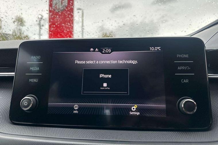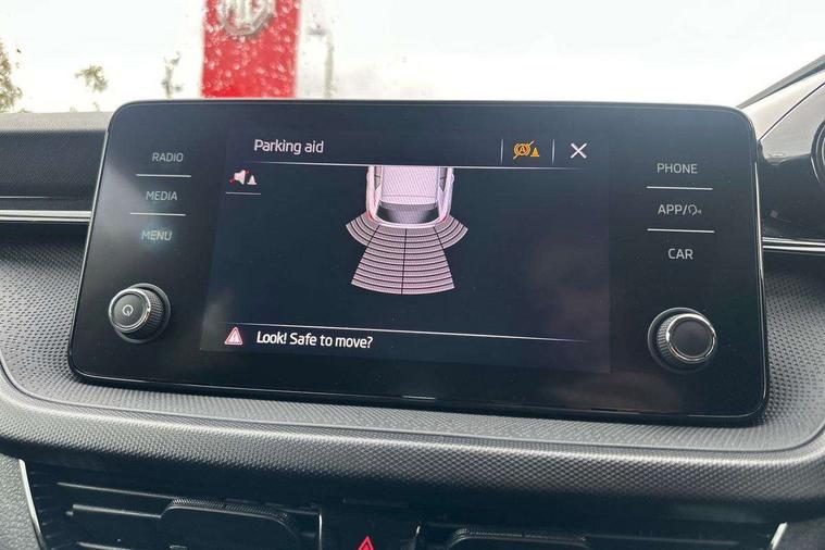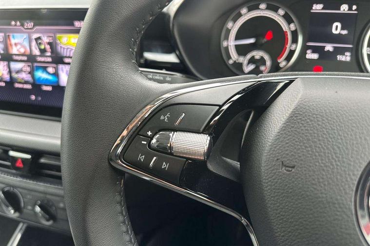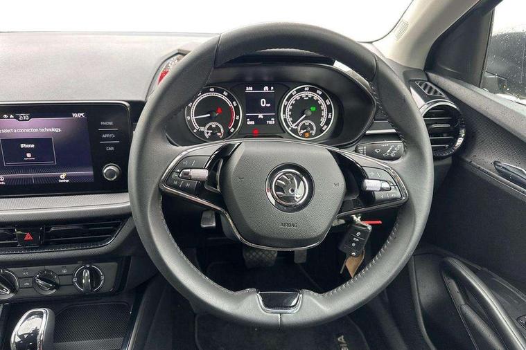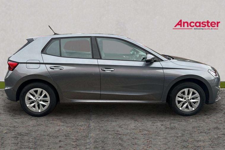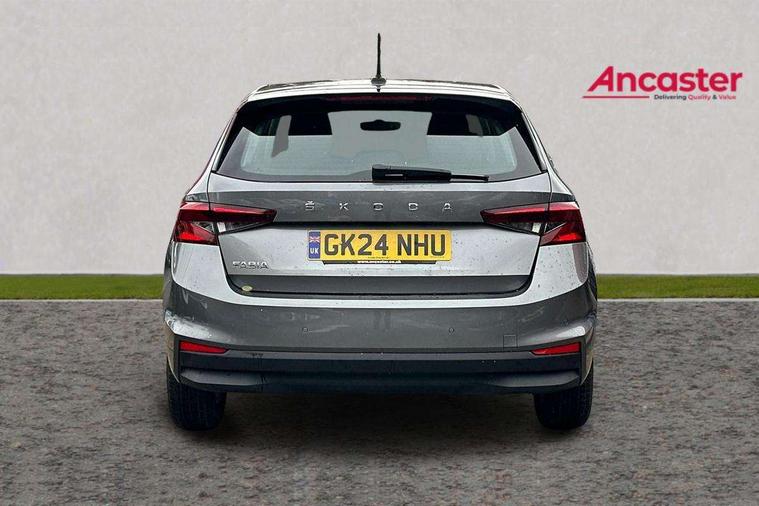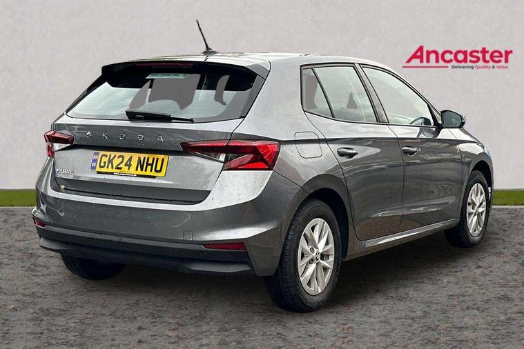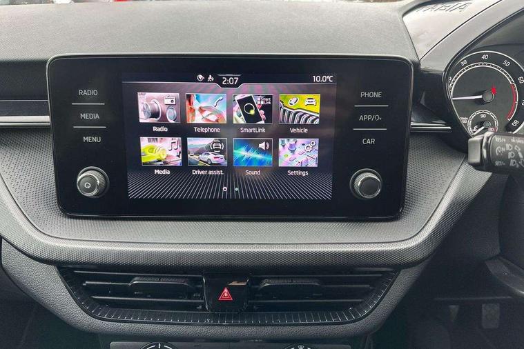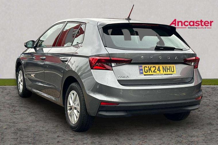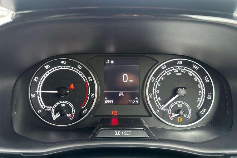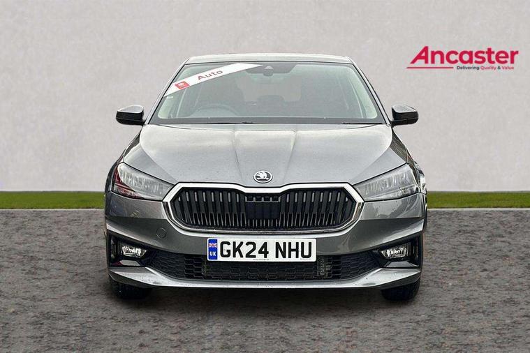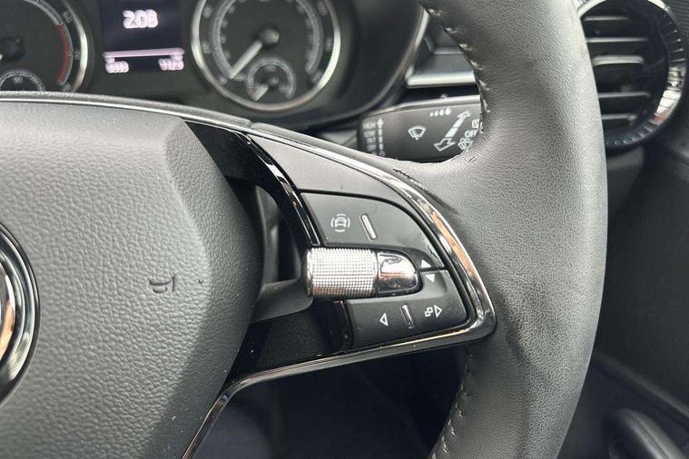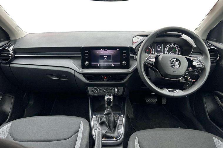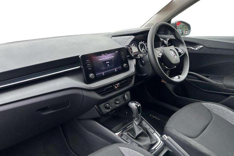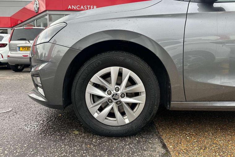 Bluetooth connection, Driver alert system - DAS, Electromechanical power steering, Exterior temperature gauge, Lane assist including road edge detection, Multifunction trip computer in black and white, Rear parking sensors, Service interval indicator, Speed limiter, 2x USB-C in the front (for data transmission and charging), 4 speakers in front, Auxiliary socket for external MP3 player, DAB digital radio reception, Radio Swing with 6.5" colour display, Basic LED Headlights, Basic rear lights, Body colour door mirrors, Body coloured bumpers, Dimming rear view mirror with black frame, Door mirror integrated indicators, Electrically adjustable and heated door mirrors, Electrically adjustable front windows with function auto up/down, Front fog lights, Front window wiper intermittent control, Headlight range control - Automatic, Ice scraper in fuel cap, LED daytime running lights with coming and leaving home feature, Mechanical adjustable rear windows, Rain sensor, Rear LED fog light, Rear side wing doors, Rear window wiper with washing nozzles, Roof mounted spoiler, SKODA tailgate lettering in chrome, Third brake light, 2 reading lights in front and 2 reading lights in rear, 2 spoke leather multifunction steering wheel, 3 rear headrests, Backrest split and folding, Central console with fixed cup holder and storage box, Chrome handbrake release button, Fabric upholstery, Gearshift knob/handle in leather, Grain satin black interior door handles, Hand brake lever handle in leather, Height adjustable front headrests, Height adjustable front seats, Height adjustable steering wheel, ISOFIX and TopTether anchorage points to the outer rear seats, ISOFIX and TopTether on the front passenger seat, Luggage compartment lighting, Manual air conditioning, Manually adjustable lumbar support in front seats, Pollen filter, Rear seat bench unsplit, Single front passenger seat, Storm grey headlining, Sun visors with mirror and airbag label on passenger side, Ticket holder, 3-point height adjustable front seats belts with pretensioner and force limiter, Automatic warning lights in case of crash, Driver and passengers airbag with switch off function, e-Call+, ESC including ABS, MSR, ASR, EDS, HBA and XDS, Front and rear seat belt warning, FRONT ASSIST (AEB City and AEB Inter Urban), Front side airbags, Head airbags, Hill hold assist, One tone horn, Pedestrian protection, Three rear 3-points safety seat belts with pretensioner and force limiter including stop function for outer rear seat belts, Tyre pressure monitoring system, Anti-theft alarm system including immobiliser, interior monitoring, backup horn, and towing protection, Central locking with radio remote control, interior controls, SAFE function and 2 foldable keys, Black painted air vents, Glossy black decorative trim, Grain satin black central console cover, Grain satin black lower decorative trim, Satin black door and side trim panel in front, Anti-theft wheel bolts protection, Super-low rolling resistance tyres,