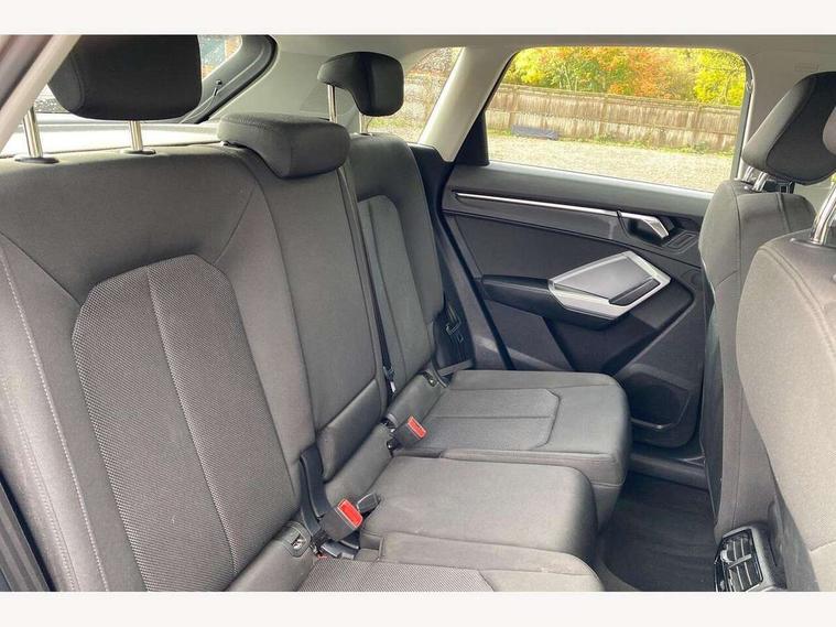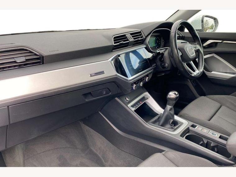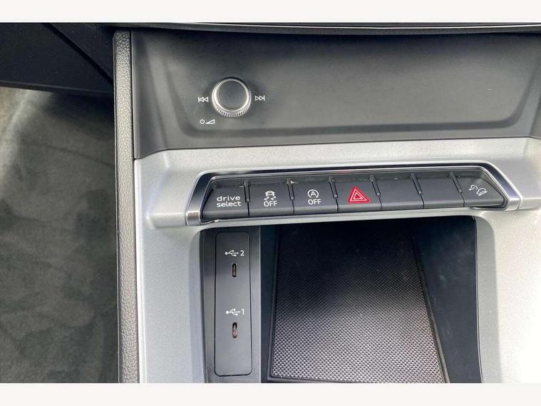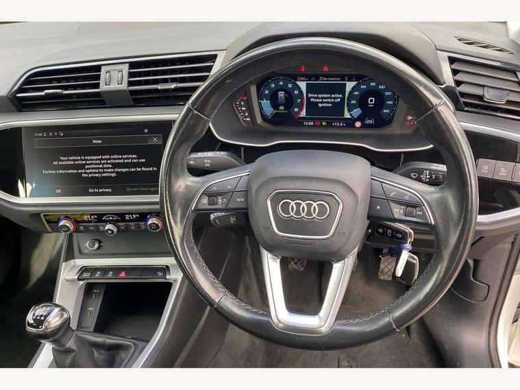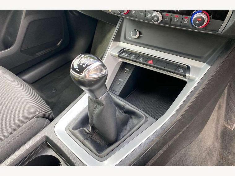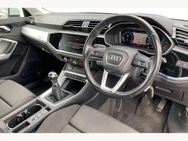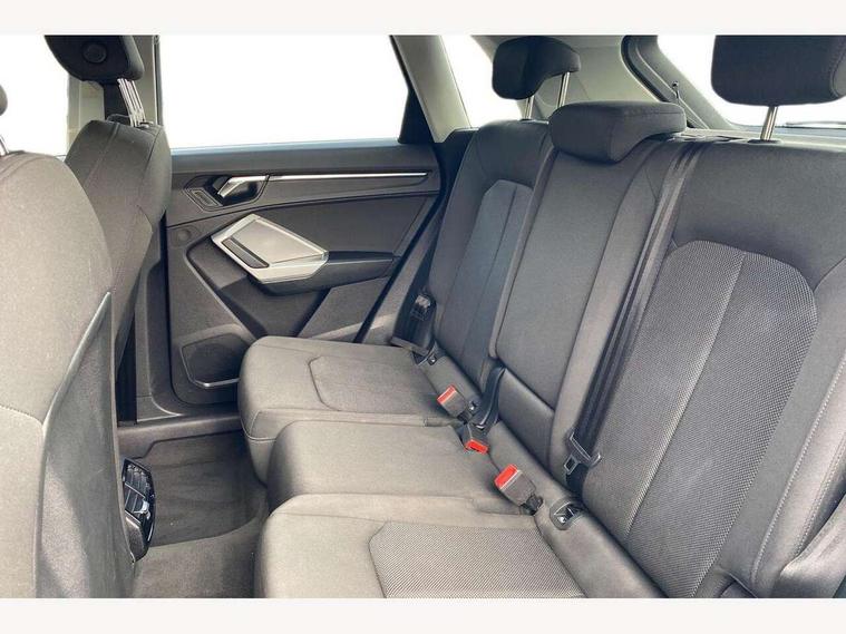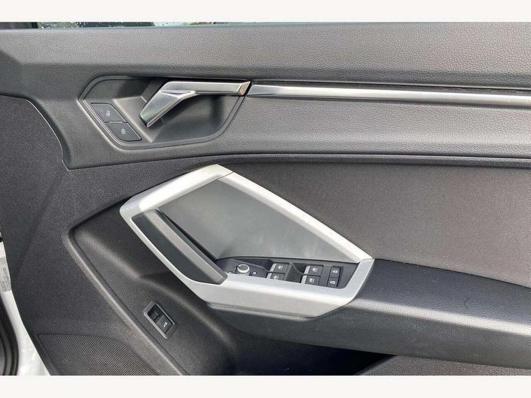 Amazon alexa Integration, Audi drive select, Audi lane departure warning, Audi Virtual Cockpit - 10.25" display, Bluetooth interface, Camera based traffic sign recognition, Cruise control + speed limiter, Legal emergency call, MMI Navigation Plus with high resolution 10.1 inch touchscreen colour display, Power operated tailgate, Progressive steering, Rear parking sensors, Service interval indicator, Smartphone interface includes wireless Apple carplay/Android Auto, Start stop system with recuperation, Voice control system with natural language interaction, Standard suspension, 2 USB-C ports with charge and data functions, 6 passive loudspeakers, DAB digital radio module, Acoustic windscreen, Aluminium roof rails, Aluminium window trim, Auto dimming frameless rear view mirror, Body coloured bumpers, Electrically folding, adjustable and heated door mirrors with integrated LED side indicators and kerb view function for passenger side, Front and rear electric windows, Front fog lights, Front side air inlets in matt selenite silver, Front spoiler in matt selenite silver, Grille vertical bars in aluminium silver/Matt, High gloss black finish B and C pillars, LED headlights with LED daytime running lights, LED rear lights, LED third brake light, Rain and light sensors, Rear diffuser strip in matt selenite silver, Rear side wing doors, Rear wiper, Titanium black radiator grille, Variable front intermittent wipers, 12V socket in rear centre console, 3 seat bench in 2nd row, 3 spoke multi-function leather steering wheel, 40:20:40 folding with manual adjustment for 60:40 forwards/backwards position and backrest angle, Door sill trims with aluminium inlay, Dual zone electronic climate control, Front and rear floor mats, Front and rear headrests, Front and rear roof module including reading lights, Front centre armrest, Glove compartment lighting, Height and reach adjustable steering wheel, ISOFIX child seat mounting for front passenger with airbag deactivation and outer rear seat including top tether attachment point for outer rear seats, Luggage compartment light, Lunar silver cloth headlining, Manual front seats with height adjustment, Single front passenger seat, Stainless steel luggage compartment sill finisher, Non smoking pack - Q3, 3x3 point rear seatbelts, 6 airbags - Driver, front passenger, curtain and side windows, Audi pre-sense front with pedestrain and cyclist recognition, Electromechanical parking brake, Electronic stabilisation control including ABS, ASR and EDL, Front seatbelt reminder, Hill descent control, Hill hold assist, Manual child lock in rear doors, Pre sense basic, Seatbelt monitoring, Tyre pressure warning, Warning triangle and first aid kit, Anti theft alarm, Anti theft wheel bolts, Immobiliser, Remote central locking, Detail dashboard around MMI touch colour display in glass look, black with surround in aluminium look, Micrometallic silver inlay,