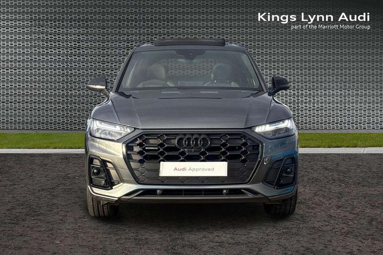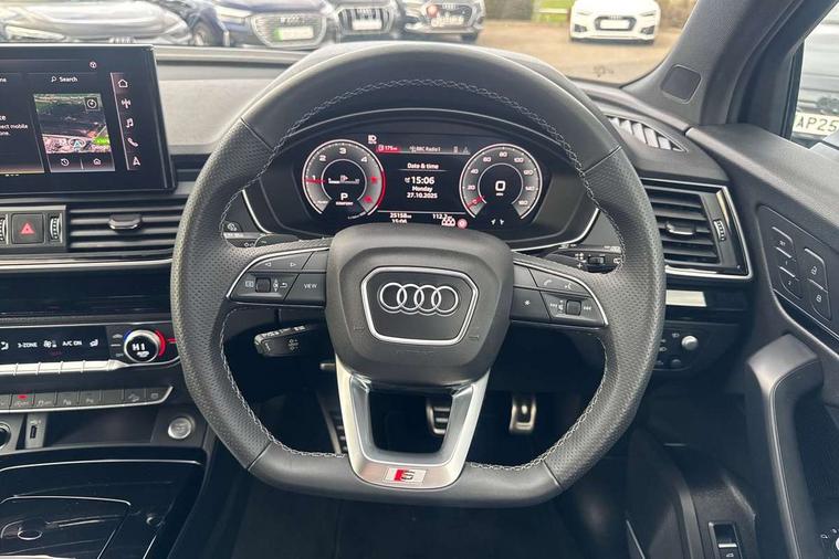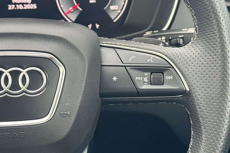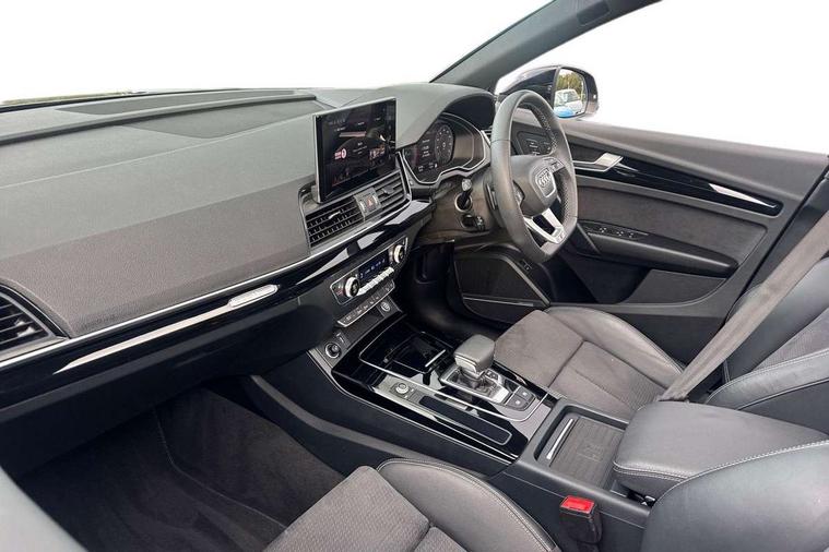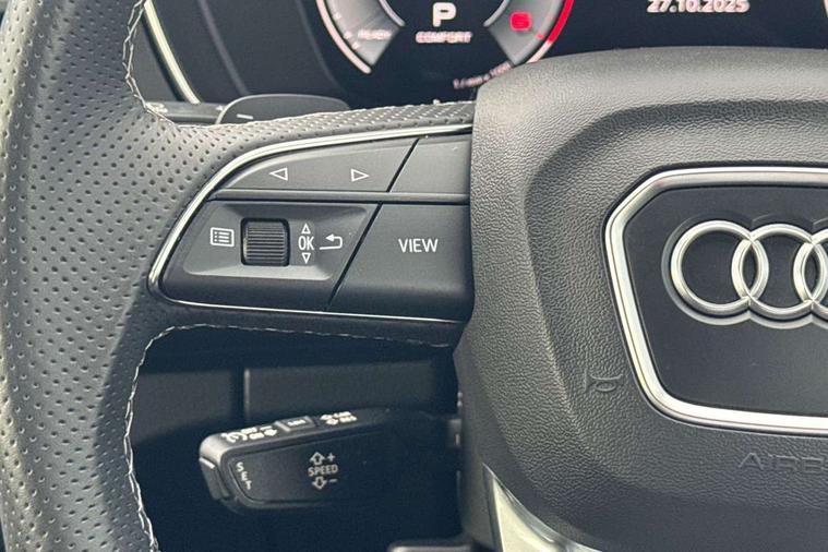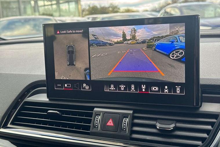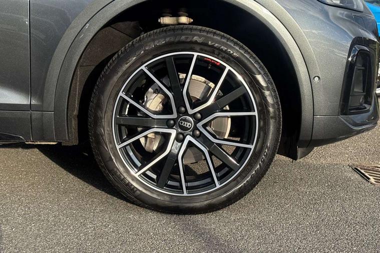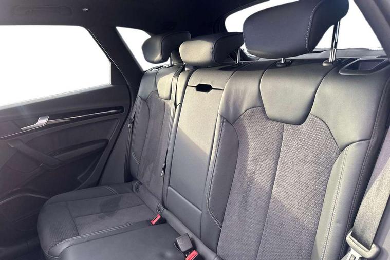 Acoustic front and rear parking sensor, Audi connect safety and service (e-call), Audi drive select, Audi virtual cockpit plus with 12.3" screen and three different layout designs, Audi wireless smartphone interface, Automatic start-stop system with coasting functionality and efficiency programme, Bluetooth interface, Camera based traffic sign recognition, Electro - mechanical power assisted steering, Lane departure warning, MMI navigation plus with 10.1" touch screen, Power tailgate, Reversing camera, Service interval indicator, Voice control system with Audi hotword activation "Hey Audi", Diesel particulate filter, Quattro on demand, S line sports suspension, 2 x USB charging port with aux input socket, 8 loudspeakers, DAB Digital radio, Acoustic windscreen, Auto dimming door mirrors, Auto dimming frameless rear view mirror, Automatic headlight adjustment, Automatic headlights and windscreen wipers, Black roof rails, Black styling with black rings, Body colour bumpers, Body colour rear diffuser with matt aluminium silver surrounds, Body colour underbody protection, Chrome plated exhaust trims, Daytime running lights, Door sills in Selenite silver, Electric adjustable/heated/folding door mirrors, Front air inlet surrounds in aluminium, Front and rear electric windows, Front radiator grille in honeycomb design, LED 3rd brake light, LED headlights and LED tail lights, Loading edge protection in stainless steel, Lower bumpers painted in contrast Manhattan grey, Rear chrome trim strip below lights, Rear privacy glass and rear side windows, Rear side wing doors, Rear wiper, Roof bars, S Line badges on the front wing panels, S Line front and rear bumpers, S Line rear spoiler, S Line side skirts, 3 rear headrests, Black cloth headlining, Comfort front centre armrest, Contrast stitching on seats, steering wheel and gear lever gaiter, Deluxe 3 zone electronic climate control, Front head restraints, Front sport seats with S embossed logo, Front/rear floor mats, Gear lever in black leather, Heated front seats, Height/reach adjustable steering column, Illuminated door sill trims with S logo, Luggage compartment cover, Manual seat adjustment with 4-way electric lumbar support, Single front passenger seat, Stainless steel pedals, Sunvisors with vanity mirrors, Top surface of the rear centre armrest in artificial leather, High gloss pack - Q5, LED interior light pack - Q5, 3 point seatbelts on all seats, 6 airbags - Driver, front passenger, curtain and side airbags, Attention and drowsiness assist, Electrically operated child locks on rear doors, Electromechanical parking brake, Electronic stabilisation control including ABS, ASR and EDL, First aid kit with warning triangle and vests, Front passenger airbag deactivation, Hill descent control, Hill hold assist, ISOFIX child seat mounting for front passenger seat and ISOFIX child seat mounting with Top Tether for outer rear seats, Multi collision brake assist, Pop-up bonnet for pedestrian protection, Pre sense city, Seatbelt monitoring, Tyre pressure warning, Anti theft alarm, Anti-theft wheel bolts, Remote central locking, Remote control key with SAFELOCK and keyless go, Air vents inserts and centre console in gloss black, Tool kit, Tyre repair kit,