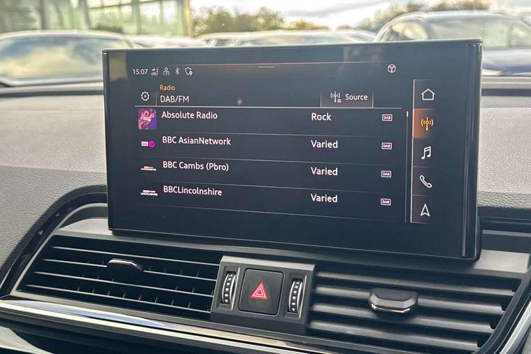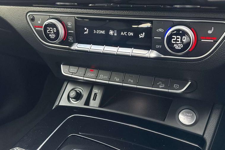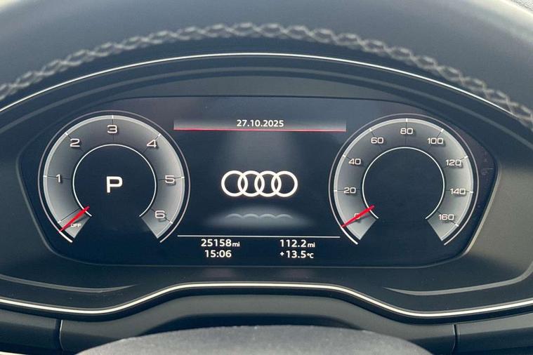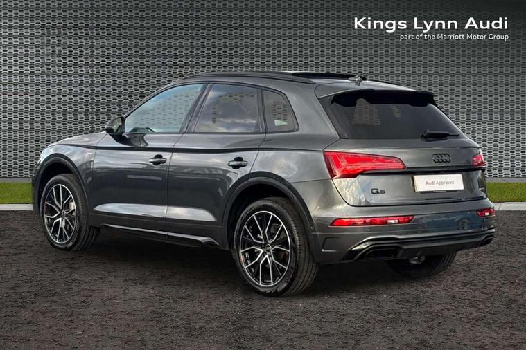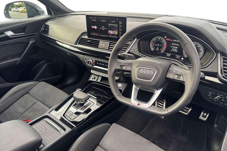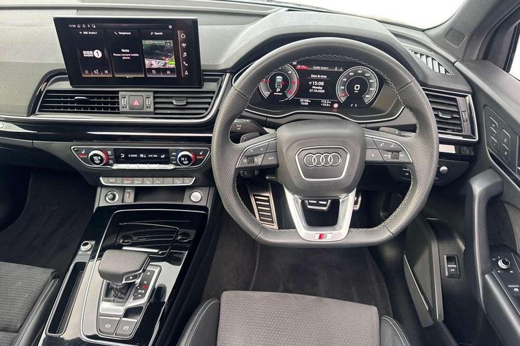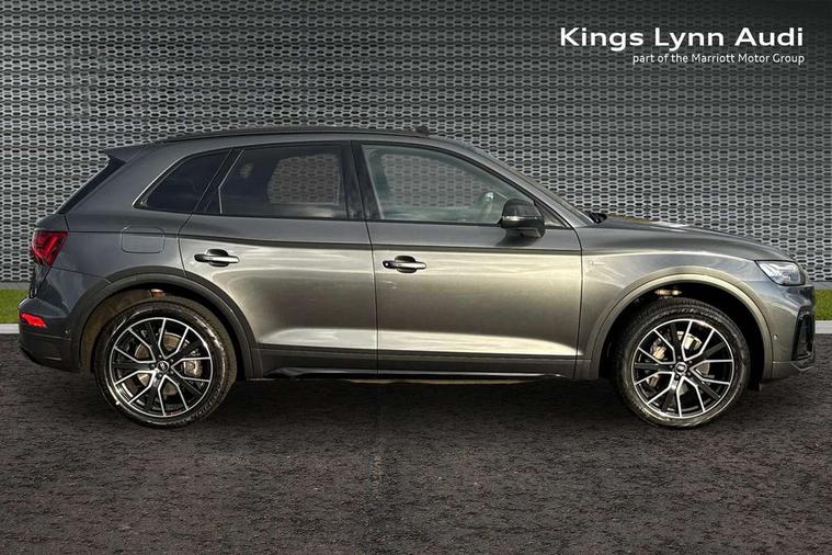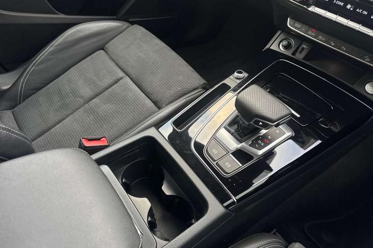Acoustic front and rear parking sensor, Audi connect safety and service (e-call), Audi drive select, Audi virtual cockpit plus with 12.3" screen and three different layout designs, Audi wireless smartphone interface, Automatic start-stop system with coasting functionality and efficiency programme, Bluetooth interface, Camera based traffic sign recognition, Electro - mechanical power assisted steering, Lane departure warning, MMI navigation plus with 10.1" touch screen, Power tailgate, Reversing camera, Service interval indicator, Voice control system with Audi hotword activation "Hey Audi", Diesel particulate filter, Quattro on demand, S line sports suspension, 2 x USB charging port with aux input socket, 8 loudspeakers, DAB Digital radio, Acoustic windscreen, Auto dimming door mirrors, Auto dimming frameless rear view mirror, Automatic headlight adjustment, Automatic headlights and windscreen wipers, Black roof rails, Black styling with black rings, Body colour bumpers, Body colour rear diffuser with matt aluminium silver surrounds, Body colour underbody protection, Chrome plated exhaust trims, Daytime running lights, Door sills in Selenite silver, Electric adjustable/heated/folding door mirrors, Front air inlet surrounds in aluminium, Front and rear electric windows, Front radiator grille in honeycomb design, LED 3rd brake light, LED headlights and LED tail lights, Loading edge protection in stainless steel, Lower bumpers painted in contrast Manhattan grey, Rear chrome trim strip below lights, Rear privacy glass and rear side windows, Rear side wing doors, Rear wiper, Roof bars, S Line badges on the front wing panels, S Line front and rear bumpers, S Line rear spoiler, S Line side skirts, 3 rear headrests, Black cloth headlining, Comfort front centre armrest, Contrast stitching on seats, steering wheel and gear lever gaiter, Deluxe 3 zone electronic climate control, Front head restraints, Front sport seats with S embossed logo, Front/rear floor mats, Gear lever in black leather, Heated front seats, Height/reach adjustable steering column, Illuminated door sill trims with S logo, Luggage compartment cover, Manual seat adjustment with 4-way electric lumbar support, Single front passenger seat, Stainless steel pedals, Sunvisors with vanity mirrors, Top surface of the rear centre armrest in artificial leather, High gloss pack - Q5, LED interior light pack - Q5, 3 point seatbelts on all seats, 6 airbags - Driver, front passenger, curtain and side airbags, Attention and drowsiness assist, Electrically operated child locks on rear doors, Electromechanical parking brake, Electronic stabilisation control including ABS, ASR and EDL, First aid kit with warning triangle and vests, Front passenger airbag deactivation, Hill descent control, Hill hold assist, ISOFIX child seat mounting for front passenger seat and ISOFIX child seat mounting with Top Tether for outer rear seats, Multi collision brake assist, Pop-up bonnet for pedestrian protection, Pre sense city, Seatbelt monitoring, Tyre pressure warning, Anti theft alarm, Anti-theft wheel bolts, Remote central locking, Remote control key with SAFELOCK and keyless go, Air vents inserts and centre console in gloss black, Tool kit, Tyre repair kit,