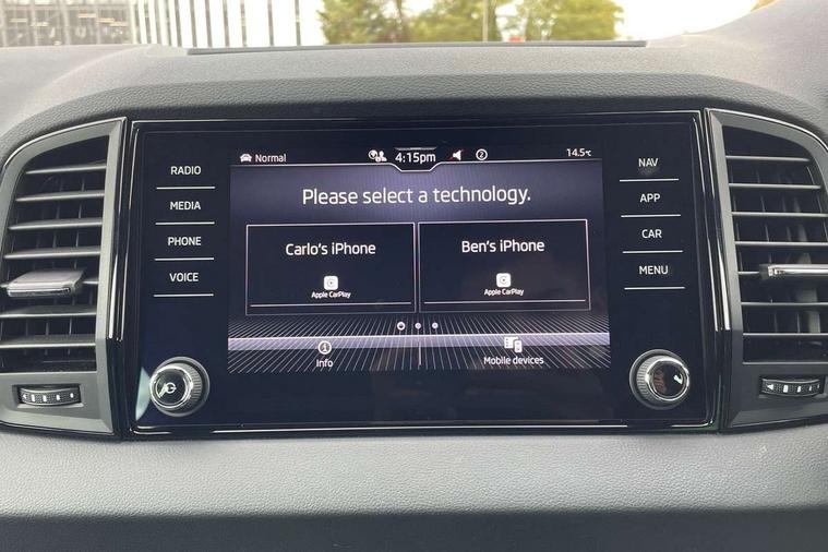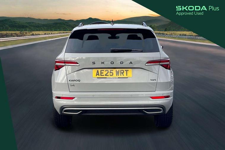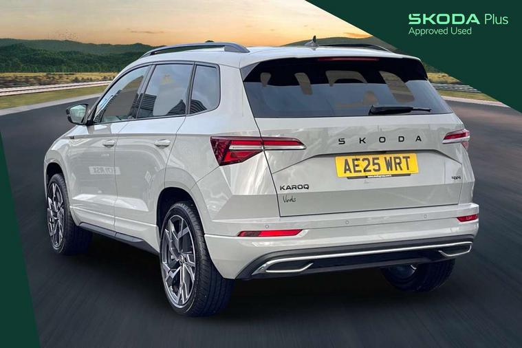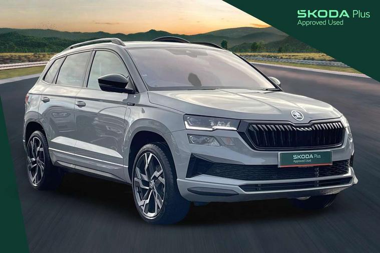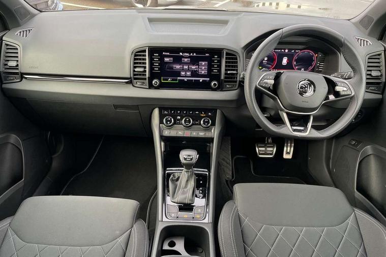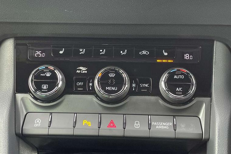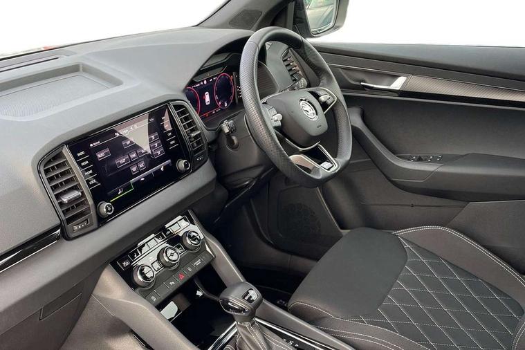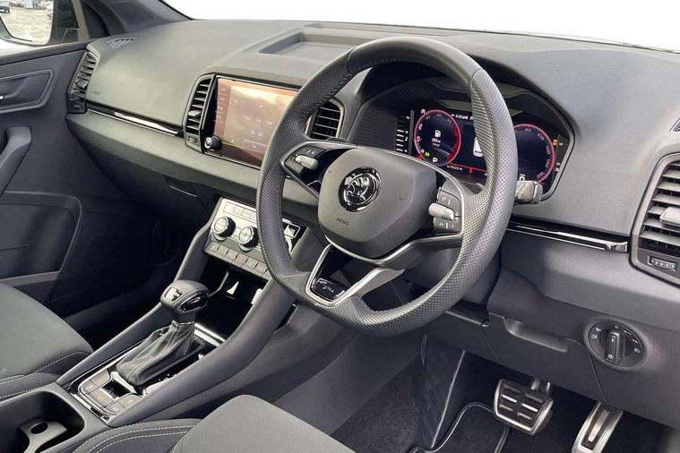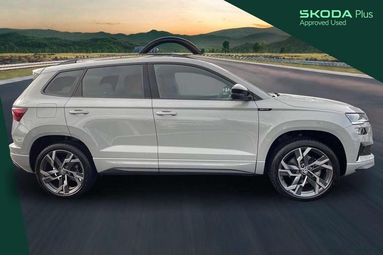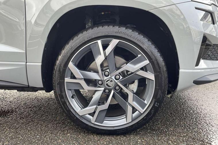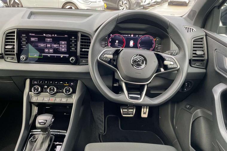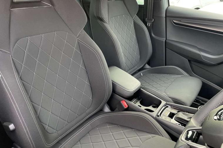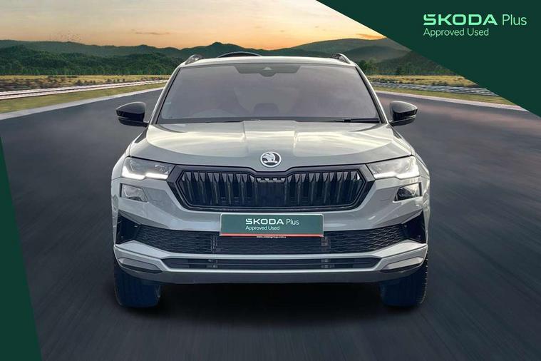 8" Digital display, Advanced driver attention and drowsiness monitor, Emergency services call system, Outside temperature gauge, Sensor for driver assistance systems, Service interval indicator, SmartLink wireless for Apple and wired for Android, Start/stop system with regenerative braking, USB C Port x 2 in front centre console, Virtual Cockpit - 10.25" digital display, Virtual pedal with electrically operated boot door, Wireless smartphone charging, Diesel particulate filter, DAB radio with Bluetooth, USB connection, Acoustic glass, Aero front windscreen wipers with intermittent function, Auto dimming rear view mirror with light and rain sensors, Black door mirrors, Black electric window control buttons, Black radiator grille, Black roof rails, Body colour door handles, Electric front and rear windows with child proof lock, Front door steps with SportLine logo, Heated rear windscreen, LED daytime running lights, LED rear lights with high functionality welcome effect and dynamic indicators, Light assistant (coming/leaving home/tunnel light), Panoramic sliding sunroof, Plastic scuff plates in door apertures, Privacy glass, Protective door side sills in body colour, Rear diffuser, Rear side wing doors, Rear spoiler, Rear window wiper with washer system and intermittent control, Safety reflectors on front doors, Skoda lettering on tailgate in black, Sportline badge on front fender, Sportline decorative inserts with badging, Sports front and rear bumpers, Third brake light, 1.5 litre bottle holders in driver and front passenger door panels, 12V socket in boot, 12v socket in front centre armrest with storage compartment and rear air vents, 2 x Tablet holder, 3 rear height adjustable headrests, 3 seat bench in 2nd row, 3 spoke sports leather heated multifunction steering wheel with DSG paddles, 4 foldable roof handles with rear coat hooks, Black floor carpet, Black roof headlining, Chrome inner door handles, Foldable hooks in the boot, Front head restraints, Height adjustable front three point seats belts with tensioners, Height/reach adjust steering wheel, Ice scraper, Illuminated glovebox, Illuminated luggage compartment, Isofix child seat preparation for front passenger seat, Isofix child seat preparation outer rear, Manual lumbar support for front seats, Pen holder, Pollen filter, Rear boot cover, Rear reading lights, Rear seats fixed folding and divided 60:40, Rubbish bin door, Safety vest holder, Single front passenger seat, Storage box in upper central dashboard closed, Sunvisors with illuminated vanity mirrors, Textile floor mats, Ticket holder, Titan black interior ceiling, Umbrella under passenger seat, Under passenger seat storage compartment, LED Interior lighting pack with Skoda welcome logo - Karoq, Light Pack - Karoq, Non Smokers pack, Automatic door unlocking in case of crash, Automatic fuel cut off in case of crash, Driver airbag, Electronic parking brake with auto hold function, Emergency rear braking signal, ESC (incl. ABS+MSR+ASR+EDS+HBA+DSR+RBS+MKB), Front side airbags, Head airbags, Hill hold control, Knee airbags, Passenger airbag with switch-off function, Pedestrian monitor, Seatbelt reminder signalisation and pretensioner for all seats, Three point seatbelts rear, Two tone horn, Tyre pressure monitor, Alarm with interior monitoring, back up horn and tilt sensor with safe function, Electronic engine immobiliser, Keyless entry and start/stop, Remote central locking with 2 remote folding keys, Black air vent surround, Black centre console, carbon door decor, Satin black dashboard, Satin black door trim, 19" Sagittarius anthracite alloy wheels, Anti-theft wheel bolts protection, Breakdown and tool kit,