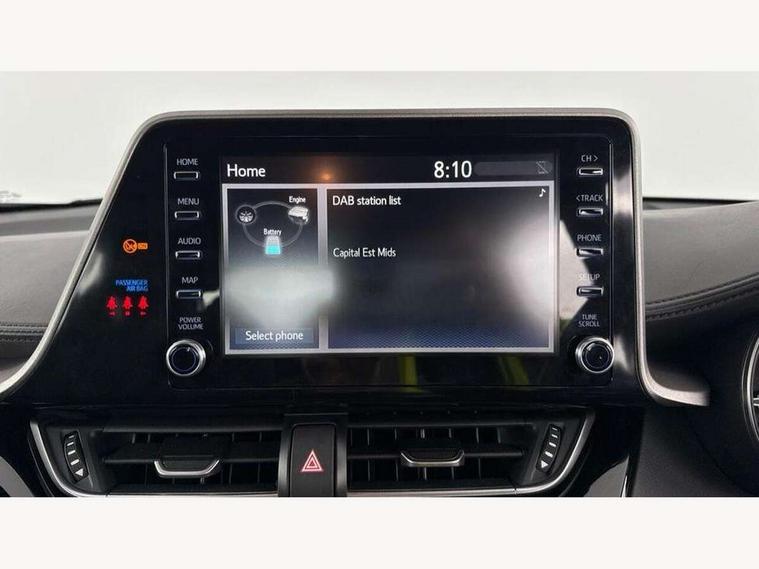 4.2" coloured TFT screen for multi-information display, Adaptive cruise control, Bluetooth connectivity, E-call, Electric power steering, Hybrid system indicator, Lane departure alert with steering control, Remote boot door release in cabin, Remote boot door release in key, Reversing camera, Road sign assist - RSA, Trip computer, Voice recognition, Vehicle Stability Control (VSC), 6 speakers, AM/FM radio, DAB Radio (Digital Audio Broadcasting), Toyota touch 2 multimedia system with 8" display, USB connector, Wi-fi connectivity, Anti-jam protection on power windows, Auto high beam, Auto up and down function on all power windows, Automatic headlights, Automatic headlights cut-off, Black and body coloured rear bumper, Black upper front grille, Body colour door handles, Body colour door mirrors, Body colour front spoiler lip, Body coloured front bumper, Boot door release with push button, Electric heated door mirrors, Follow me home headlights, Front and rear power windows, Front fog lights, Honeycomb lower front grille, LED daytime running lights, LED front light guide, LED High mounted stop light, LED rear brake lights, LED rear combination lights, Manual headlight levelling, Manually retractable door mirrors, Noise reduction layer on front windows and windscreen, Power adjustable door mirrors, Rain sensor, Rear side wing doors, Rear spoiler, Rear tailgate, Rear window defogger, Rear window wiper, Reflective LED headlights, Shark fin antenna, UV-filter on driver and passenger windows, UV-filter on rear windows, 12v power outlet - front, 3 rear headrests, 3 seat bench in 2nd row, 3 spoke leather steering wheel, 60/40 split folding rear seat, Adjustable rear headrests, Adjustable speed limiter switch on steering wheel, Assist grips front and centre pillar, Audio and telephone switches on steering wheel, Black front door assist grips, Boot light, Chrome interior door handles, Cloth upholstery, Driver and front passenger personal light, Driver and front passenger Whiplash Injury Lessening seats, Dual zone automatic air conditioning, Floor mats, Front cupholders, Front head restraints, Front sports seats, Glovebox with internal light, Hard tonneau cover, Hooks for luggage holding net, Humidifying Nanoe air purifier, Illuminated entry system, Isofix attachments on rear seats, Leather gearshift, Light on driver sun visor, Light on passenger sun visor, Manual telescopic steering wheel, Manual tilt steering wheel, Manually adjustable lumbar support on driver seat, Manually height adjustable driver seat, Manually height adjustable front passenger seat, Manually reclining driver seat, Manually reclining front passenger seat, Manually sliding driver seat, Manually sliding front passenger seat, Microphone on front personal light, Mirror on driver sun visor, Mirror on passenger sun visor, Multimedia switches on steering wheel, Pollen filter, Shopping bag hooks, Single front passenger seat, Slow opening on lower glovebox, Voice recognition switch on steering wheel, 16 Disk front wheel brake, 3x3 point rear seatbelts, ABS+EBD+Brake assist, Electronic parking brake, Front and rear seatbelt reminder, Front passenger airbag on/off switch, Hill start assist control (HAC), Pre collision system with pedestrian detection, Pre-tensioners and force limiters, Rear door child safety locks, SRS Airbags - Driver + Front passenger, front side, front and rear curtain and driver's knee airbags, Toyota safety sense, Tyre pressure monitoring system, Acoustic vehicle alert system (AVAS), Glass-breaking alarm sensors, Immobiliser, Intrusion alarm, Intrusion sensor, Motion sensor alarm, Power door locks, Power passenger window lock, Remote central locking, Black lower dashboard, Black upper dashboard, Grey deco line on upper dashboard, Matte black centre console, Tyre repair kit,