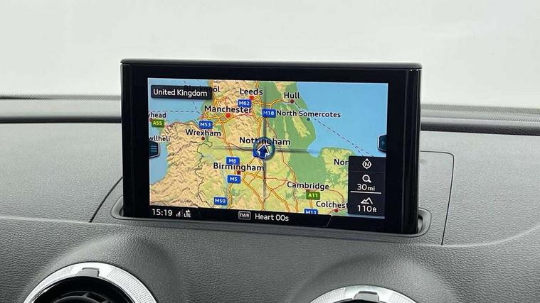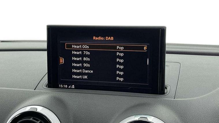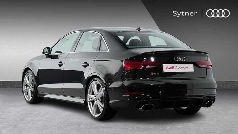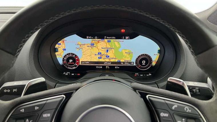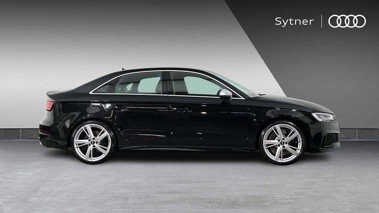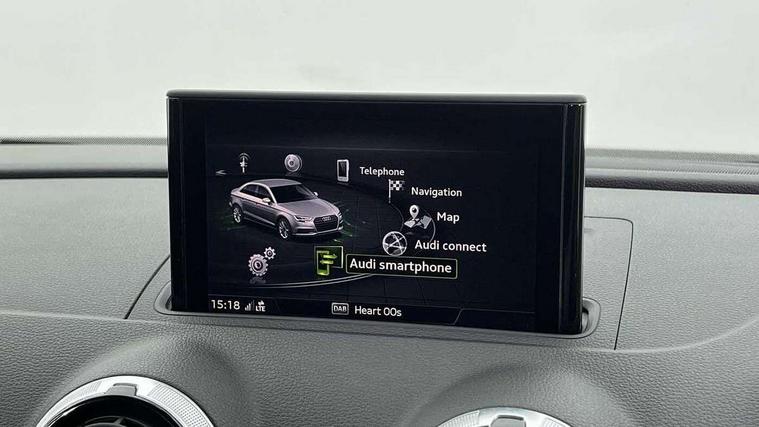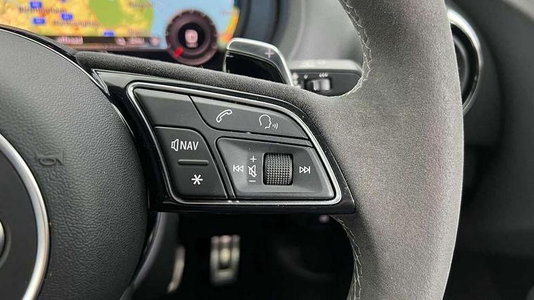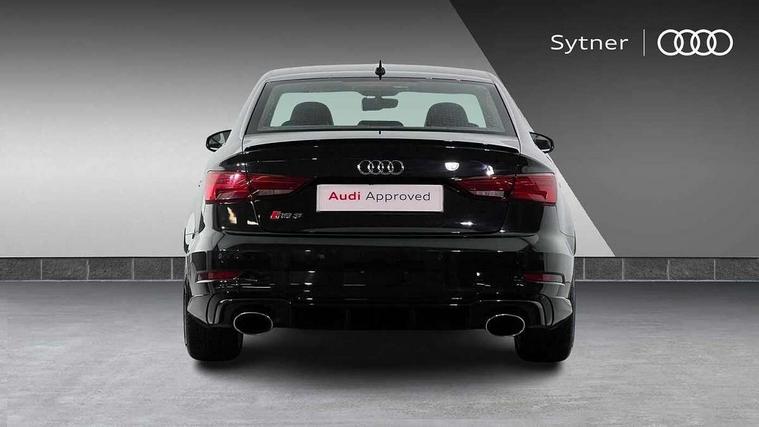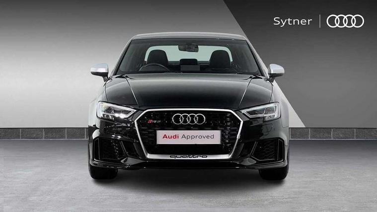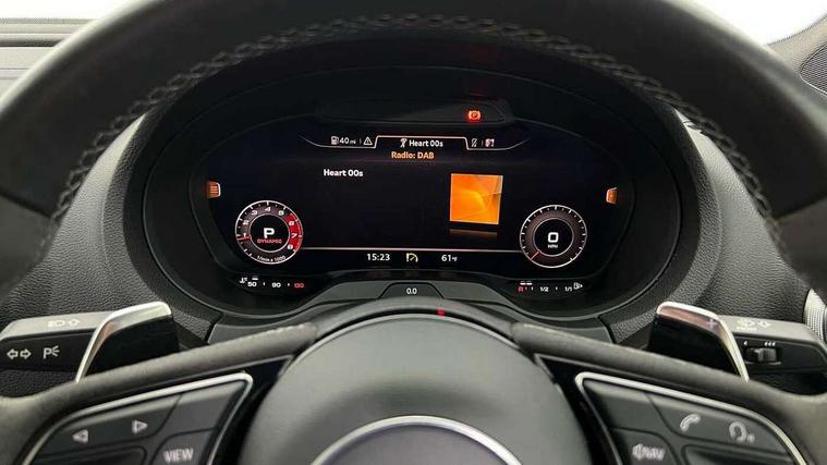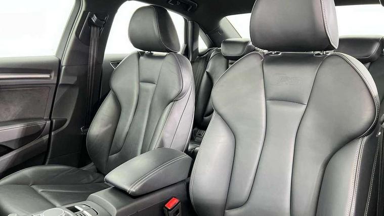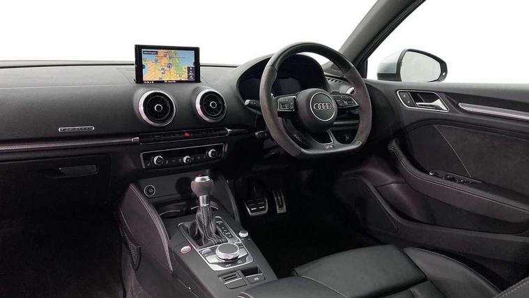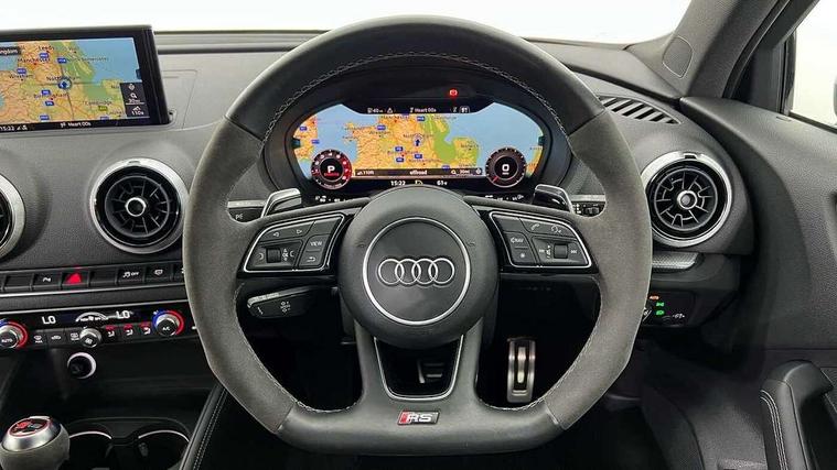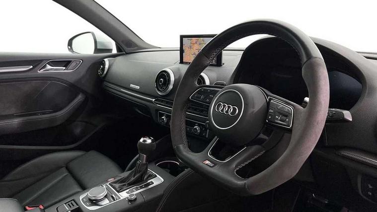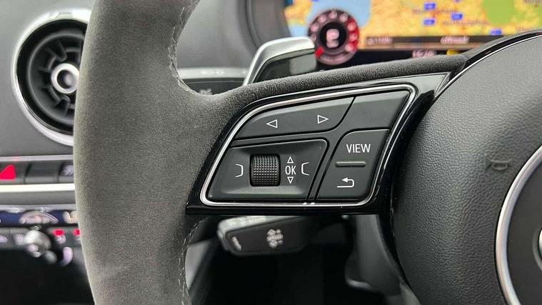 Audi connect, Audi drive select, Audi smartphone interface, Audi virtual cockpit - 12.3" high-resolution LCD display with fully customisable instrument cluster, Bluetooth interface, MMI navigation plus with MMI touch, Progressive power assisted steering, Service interval indicator, Trip computer, Voice control system, RS sports suspension, 10 GB hard disk, 2 USB ports, Audi music interface, Aux-in socket, CD player, DAB Digital radio, MMI radio plus with 7" colour MMI screen and MMI controller, Two SDXC card slots, Audi Beam uses LEDs to project the Audi Sport logo, Auto dimming rear view mirror with light and rain sensors, Automatic lights and wipers, Black high gloss front air inlet, Body coloured side sills, Electric operated/heated door mirrors, Front and rear electric windows, Headlight washers, Heated rear window, Heated windscreen washer jets, High gloss black rear diffuser, LED daytime running lights, RS design body styling, 3 adjustable rear headrests, 3 spoke flat bottomed sports multifunctional leather steering wheel with aluminium look gearshift paddles, 4 lashing points to secure luggage, 60/40 split folding rear seat, Adjustable front armrest, Alcantara gear knob gaiter, Cloth headlining, Dual zone electronic climate control, Front and rear interior lights with delay, Front head restraints, Heated front seats, Height/depth adjustable steering column, Illuminated door sills, Illuminated glovebox, ISOFIX child seat preparation+airbag deactivation, Jack and tool kit, Stainless steel pedals, Storage compartment in centre console, Storage compartments in doors, Storage under driver's seat, LED interior light pack - A3/RS3, Non smoking pack - RS3, Storage and luggage pack - A3/RS3, 3 point seatbelts on all seats, ABS/EBD, ASR, Curtain airbags, Driver and passenger side airbags, Driver/Front Passenger airbags, Drivers knee airbag, EDL, Electromechanical parking brake, ESC - Electronic Stability Control + traction control, Seatbelt warning, Tyre pressure warning, Warning triangle and first aid kit, Anti theft alarm, Anti-theft wheel bolts, Immobiliser, Remote control central locking, Aluminium trim elements, Tyre repair kit,